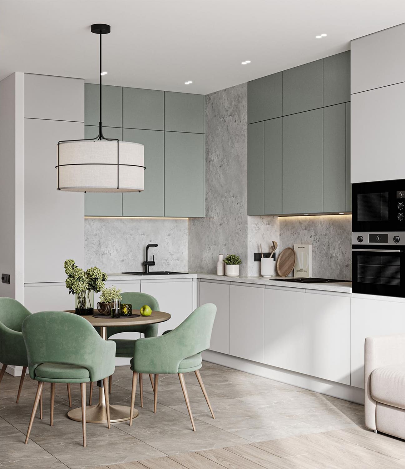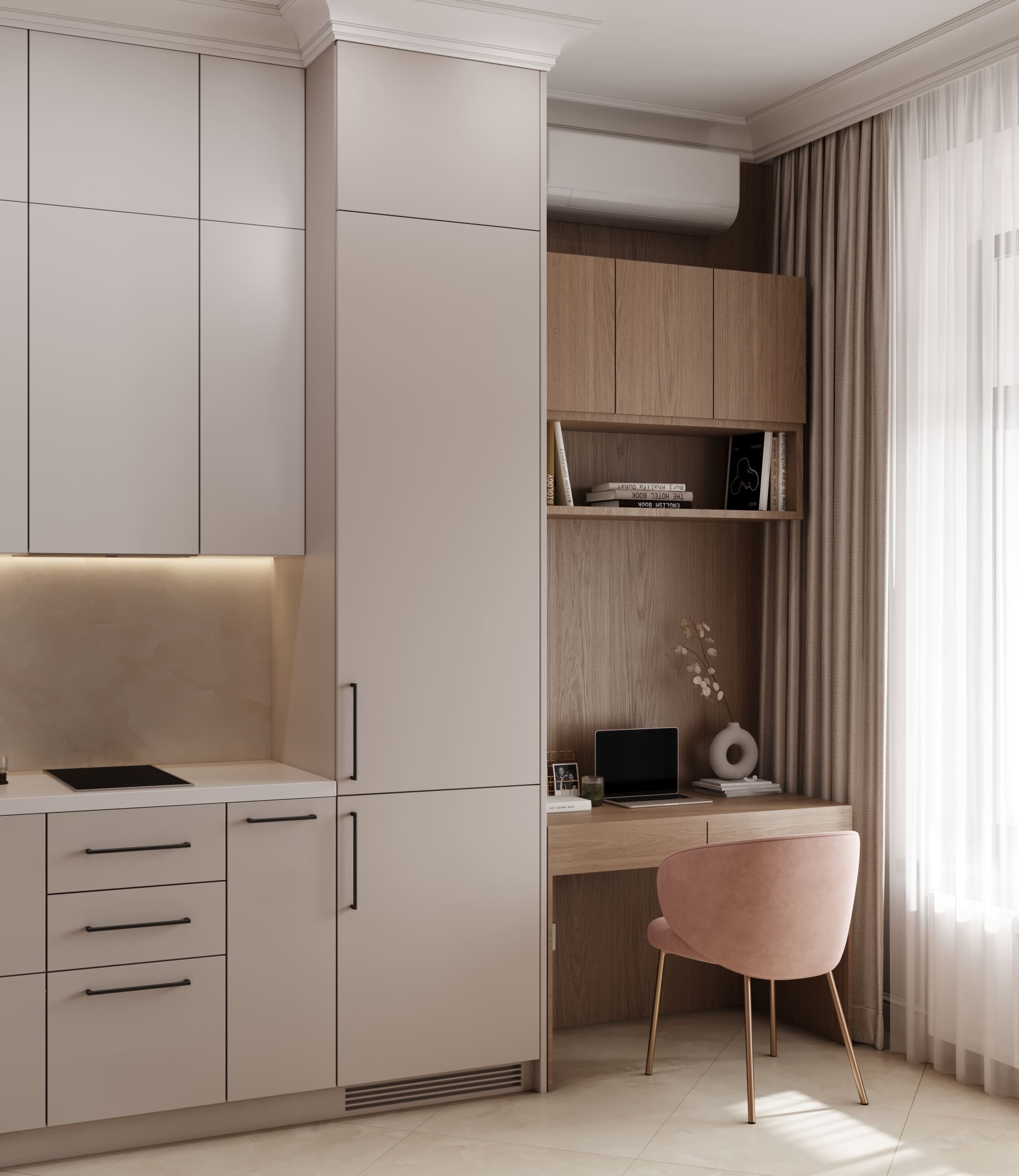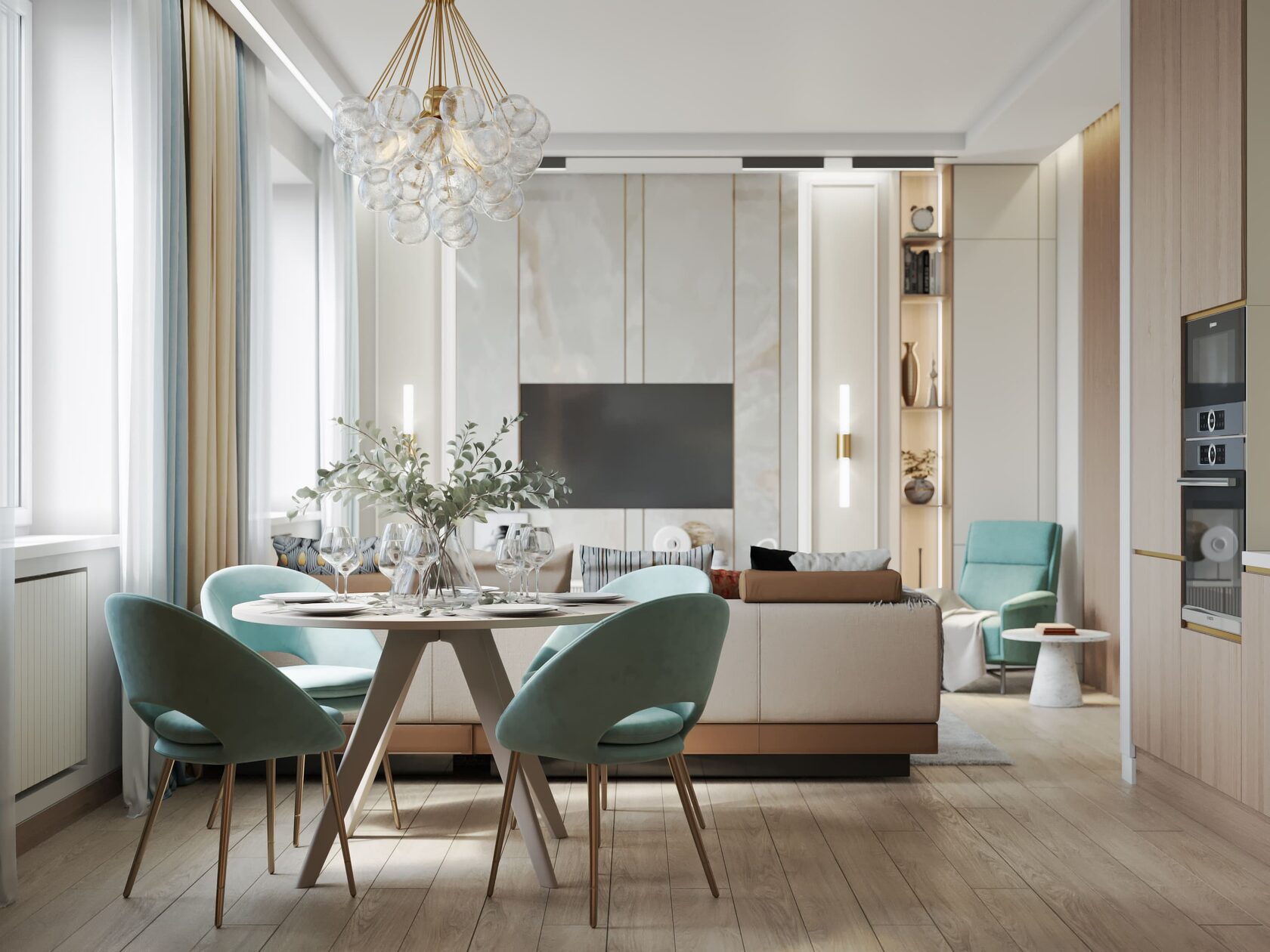 Проект в ЖК RiverSky в трендовых нежных и экологичных тонах, хозяйка этой квартиры любит простые и лаконичные решения простые в реализации. Москва. 100 кв.м.