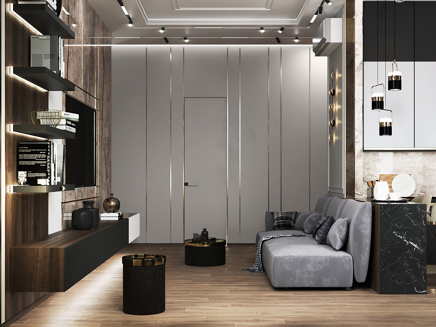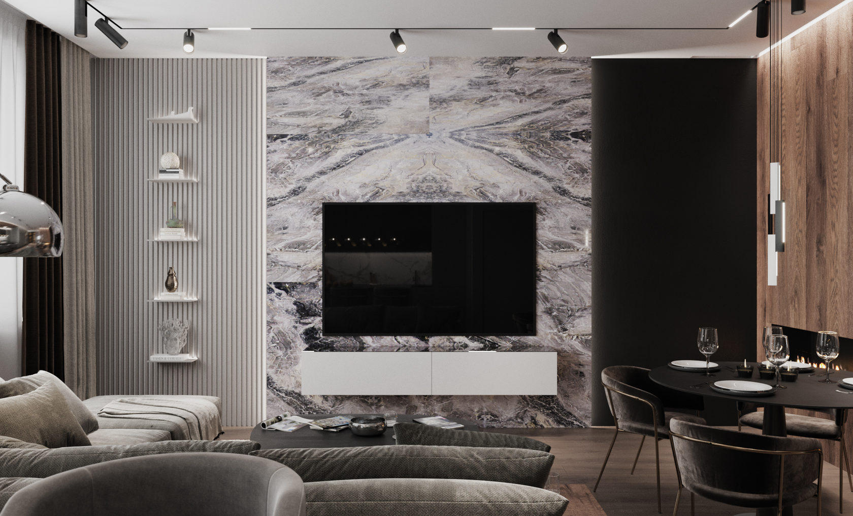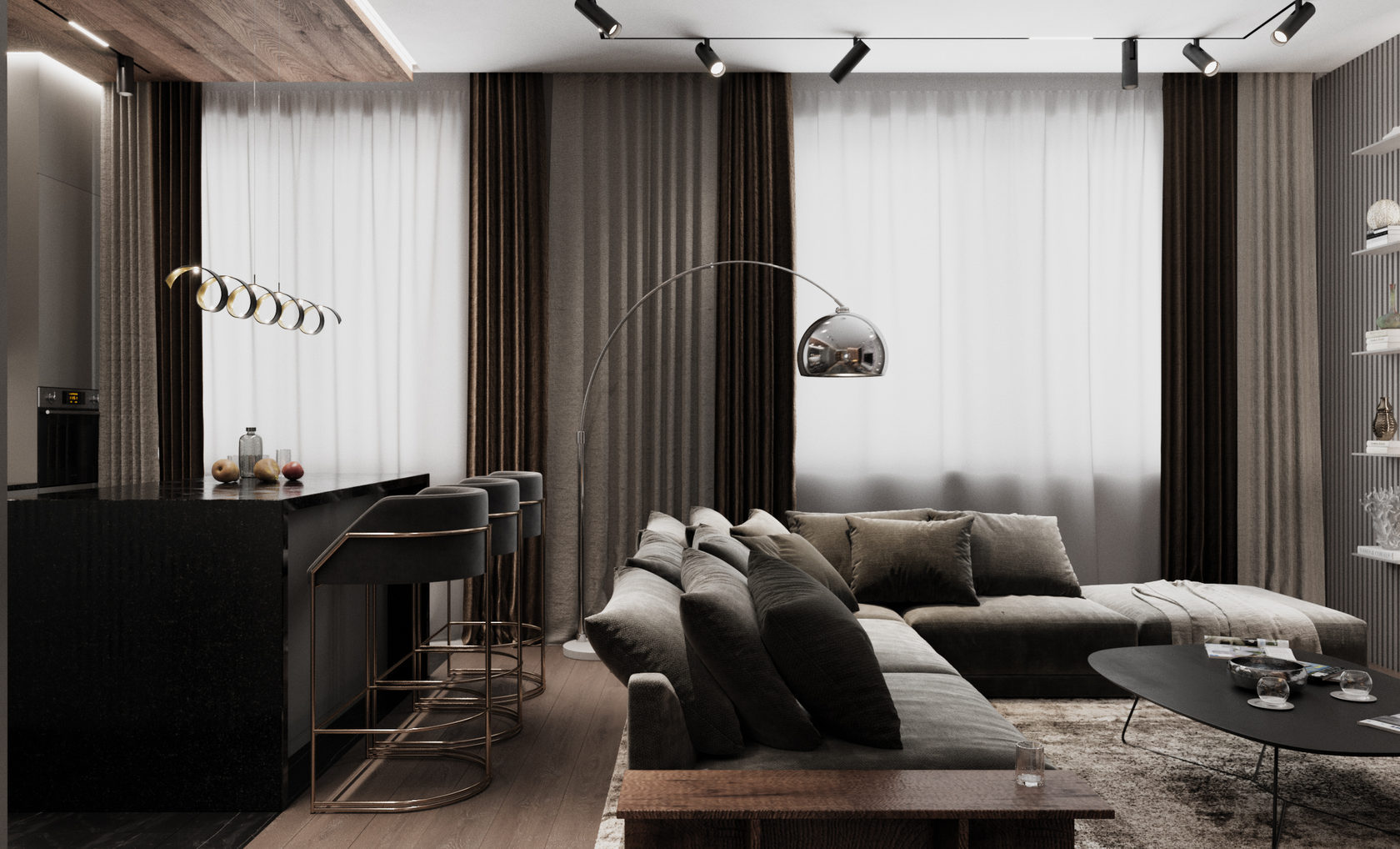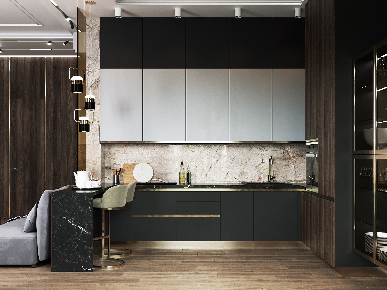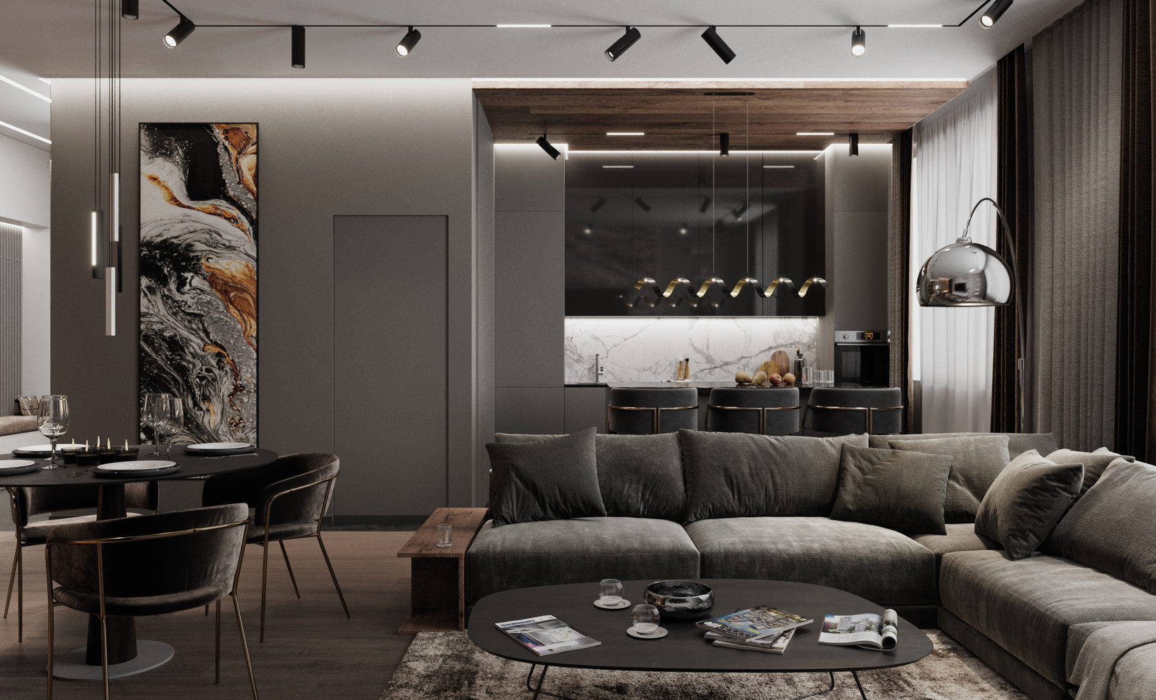 Роскошная «шоколадная» квартира-шкатулка. Сочетает в интерьере серые оттенки, блестящие аксессуары из латуни и меди, а также графитовые мотивы в мебели с мрамором nero marquina. Москва. 105 кв.м.
