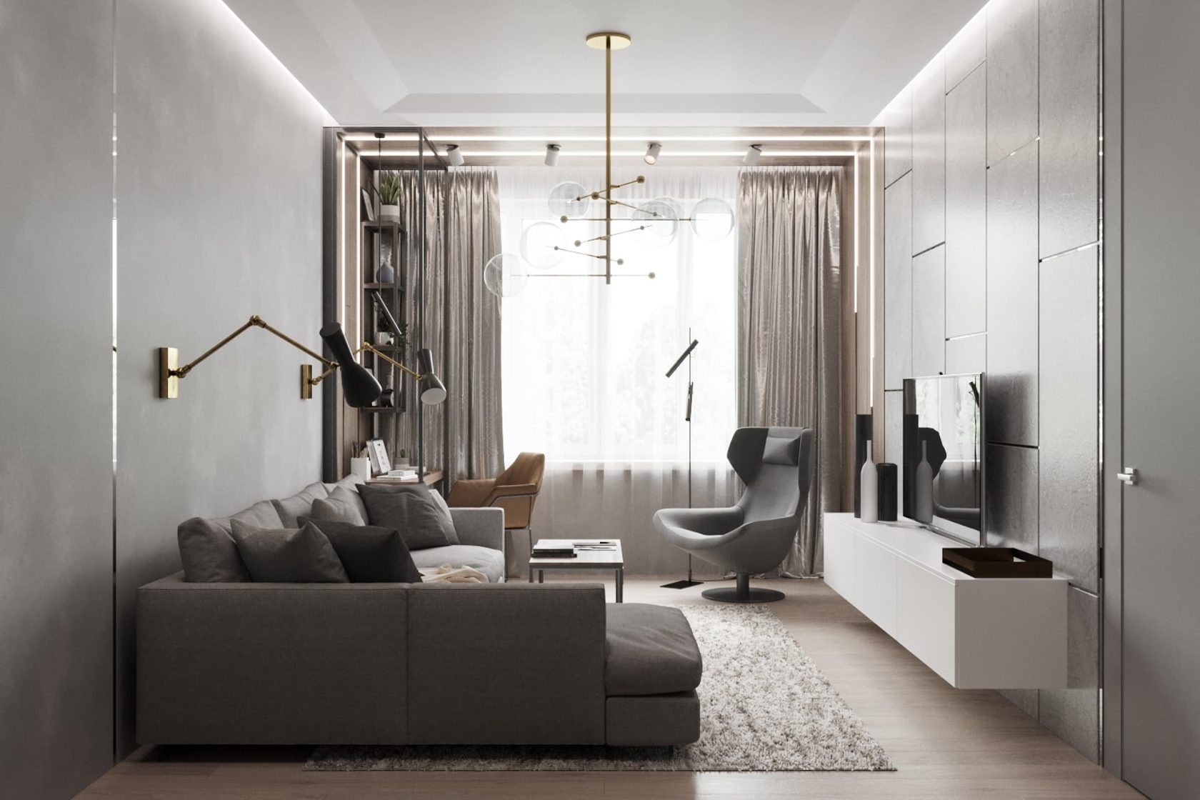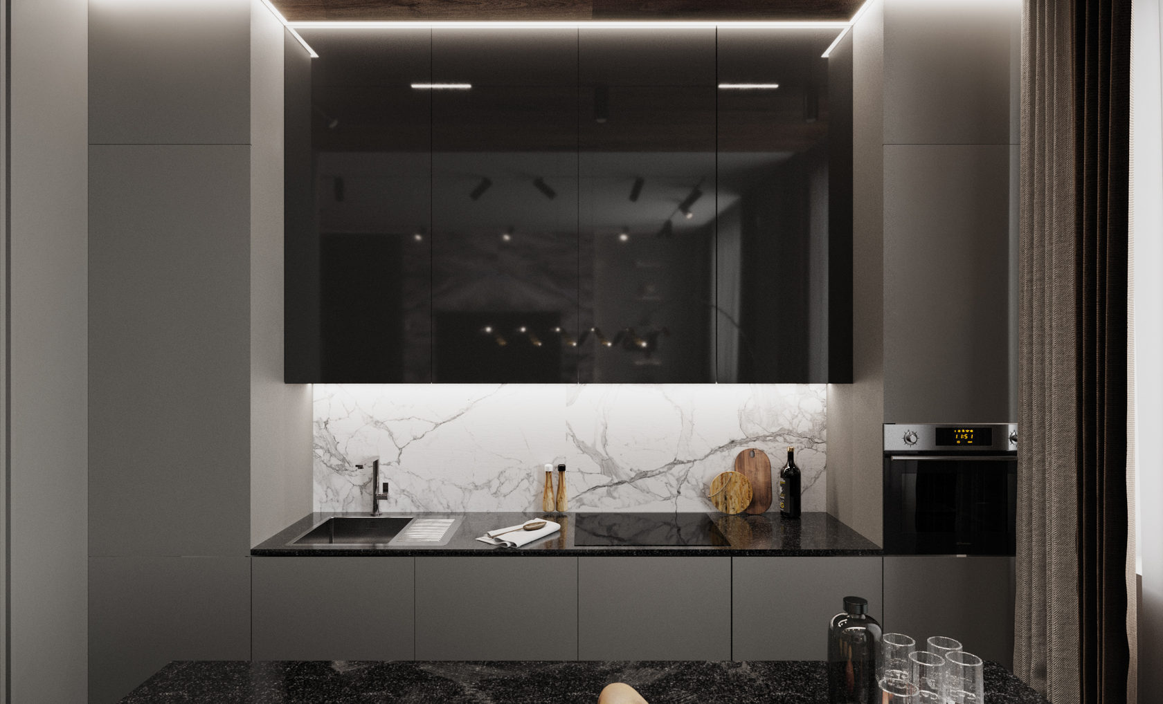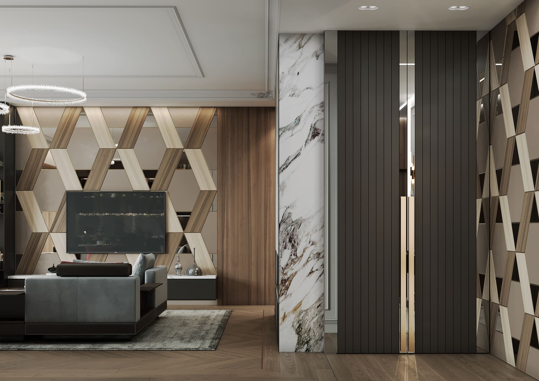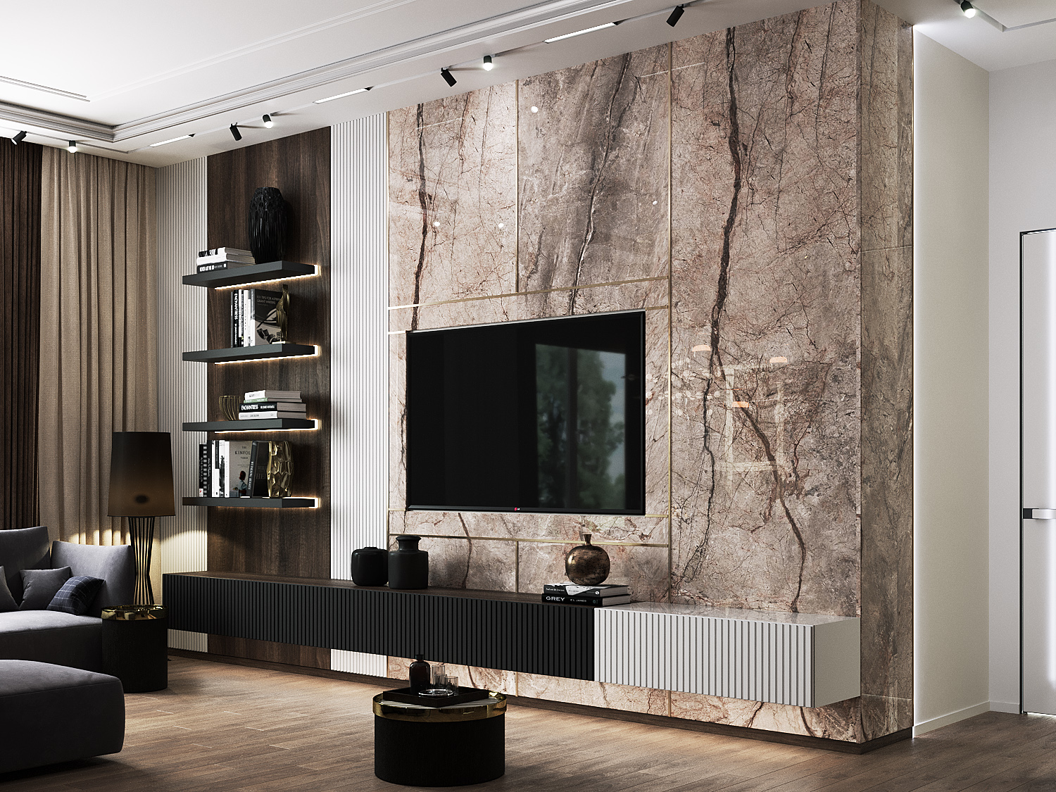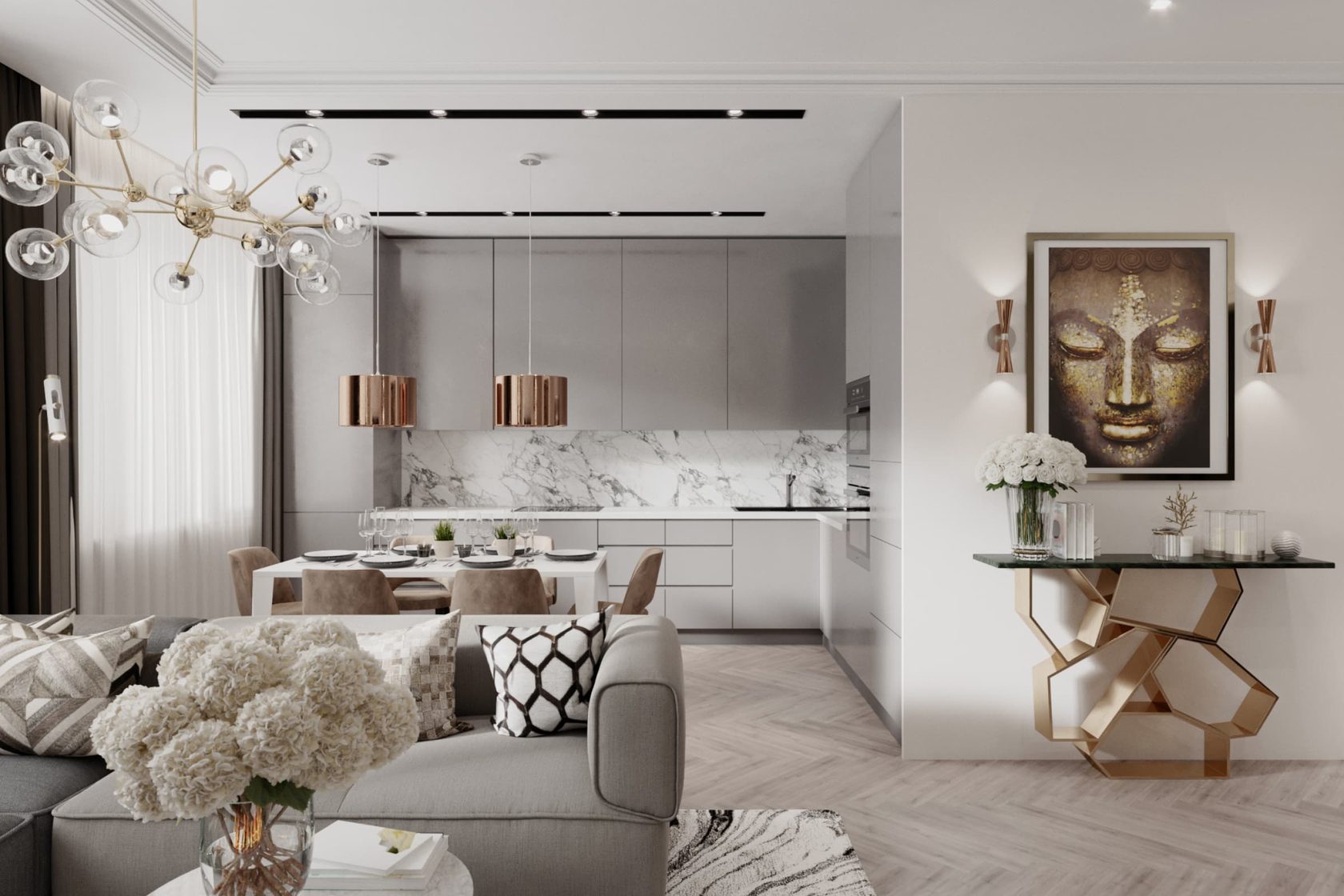 Роскошная «шоколадная» квартира-шкатулка. Сочетает в интерьере серые оттенки, блестящие аксессуары из латуни и меди, а также графитовые мотивы в мебели с мрамором nero marquina. Москва. 105 кв.м.