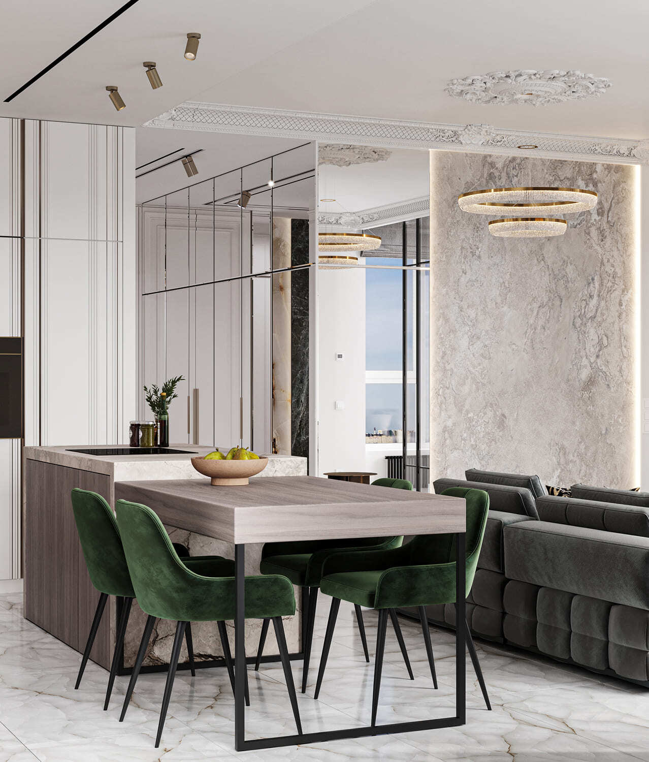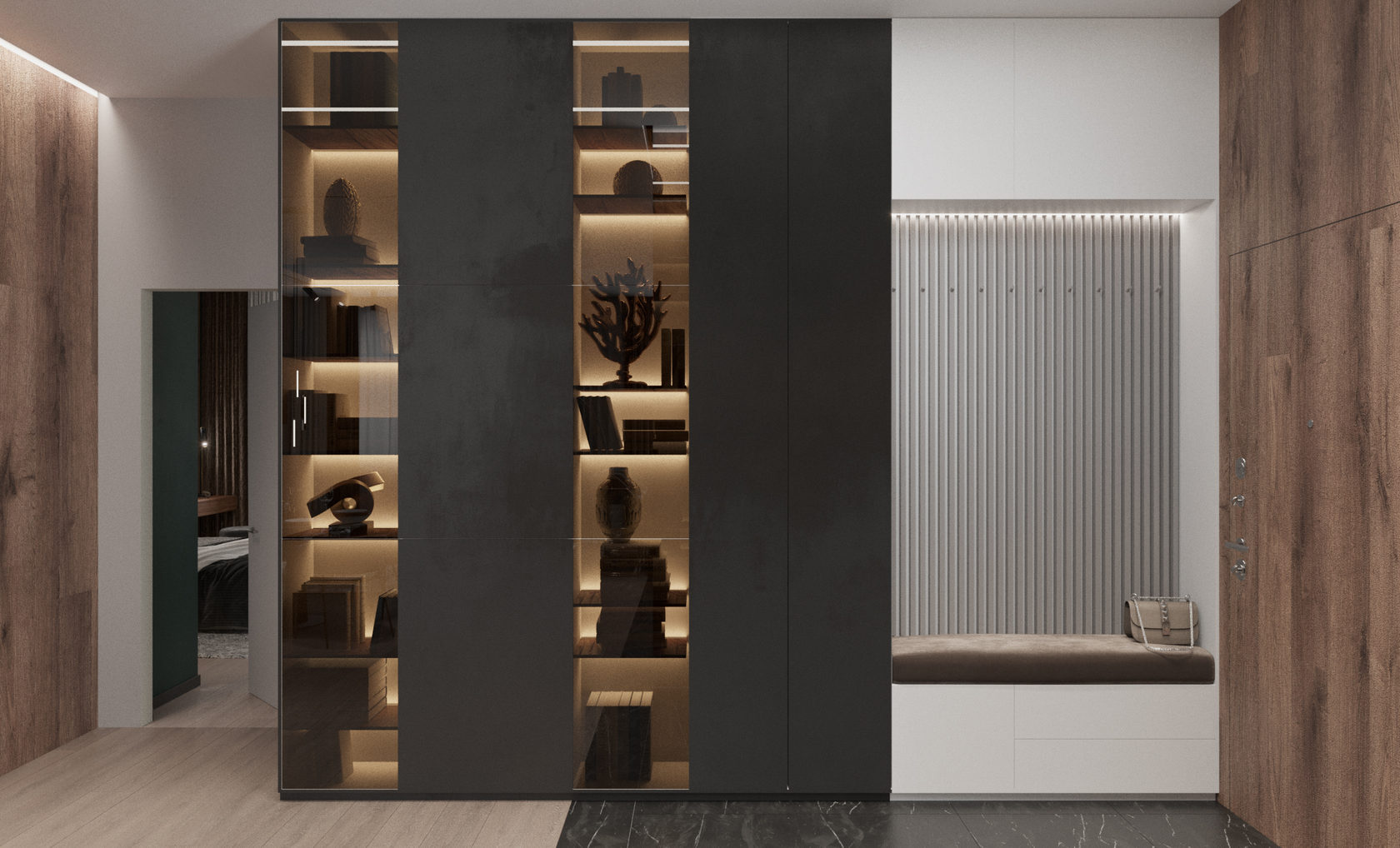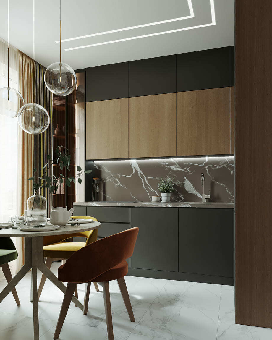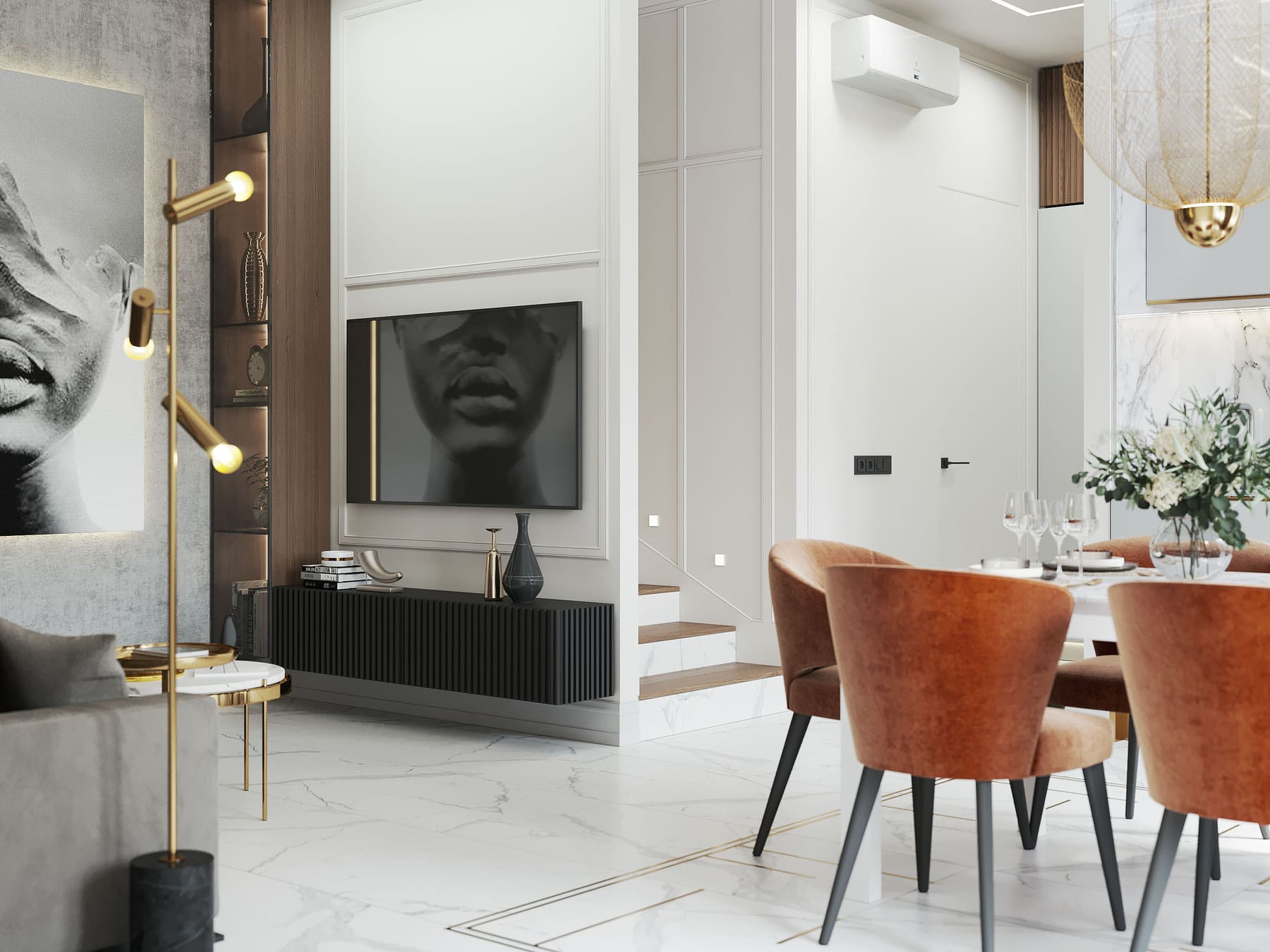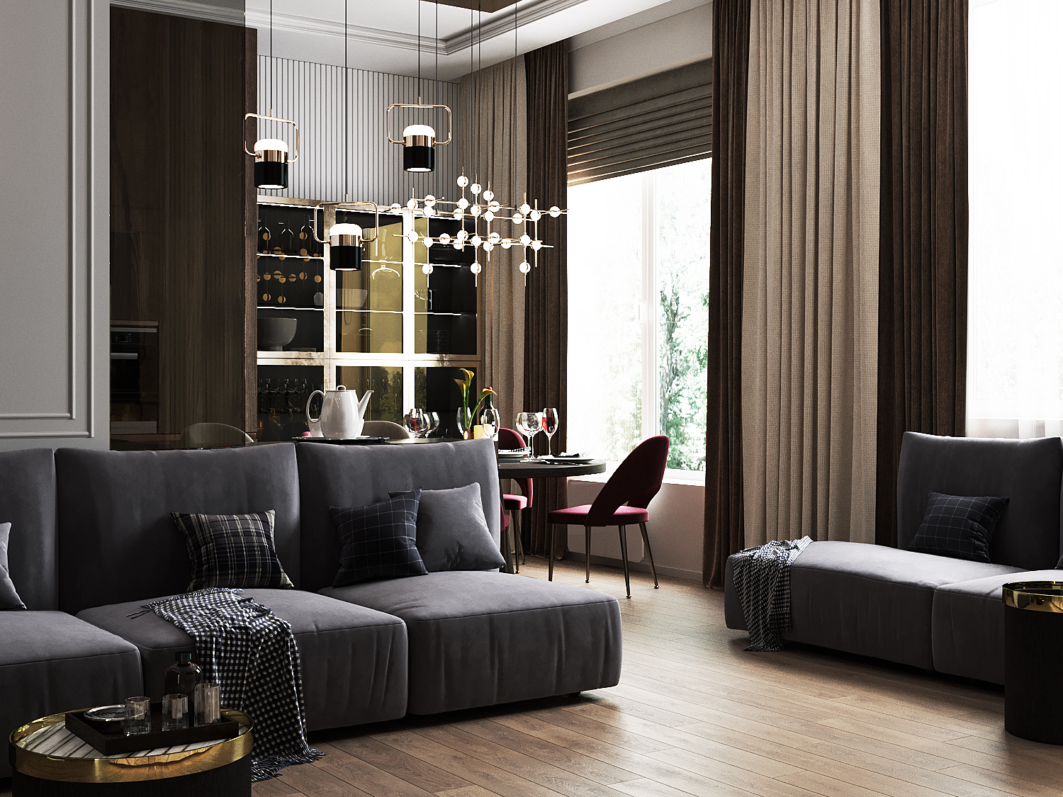 Роскошная «шоколадная» квартира-шкатулка. Сочетает в интерьере серые оттенки, блестящие аксессуары из латуни и меди, а также графитовые мотивы в мебели с мрамором nero marquina. Москва. 105 кв.м.