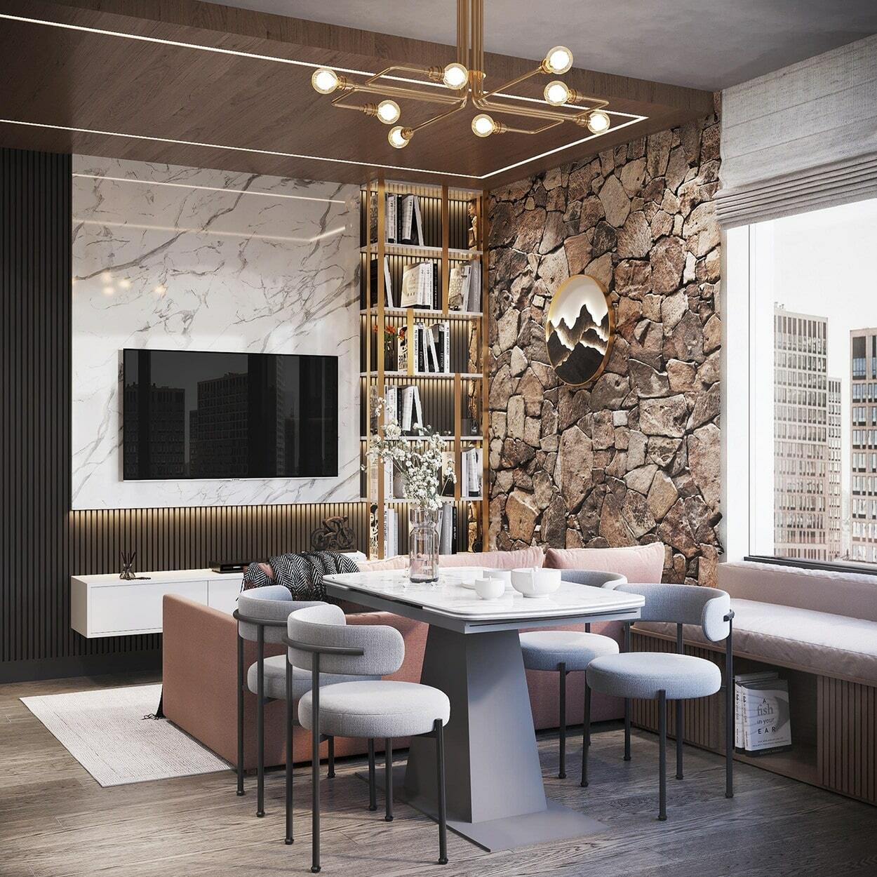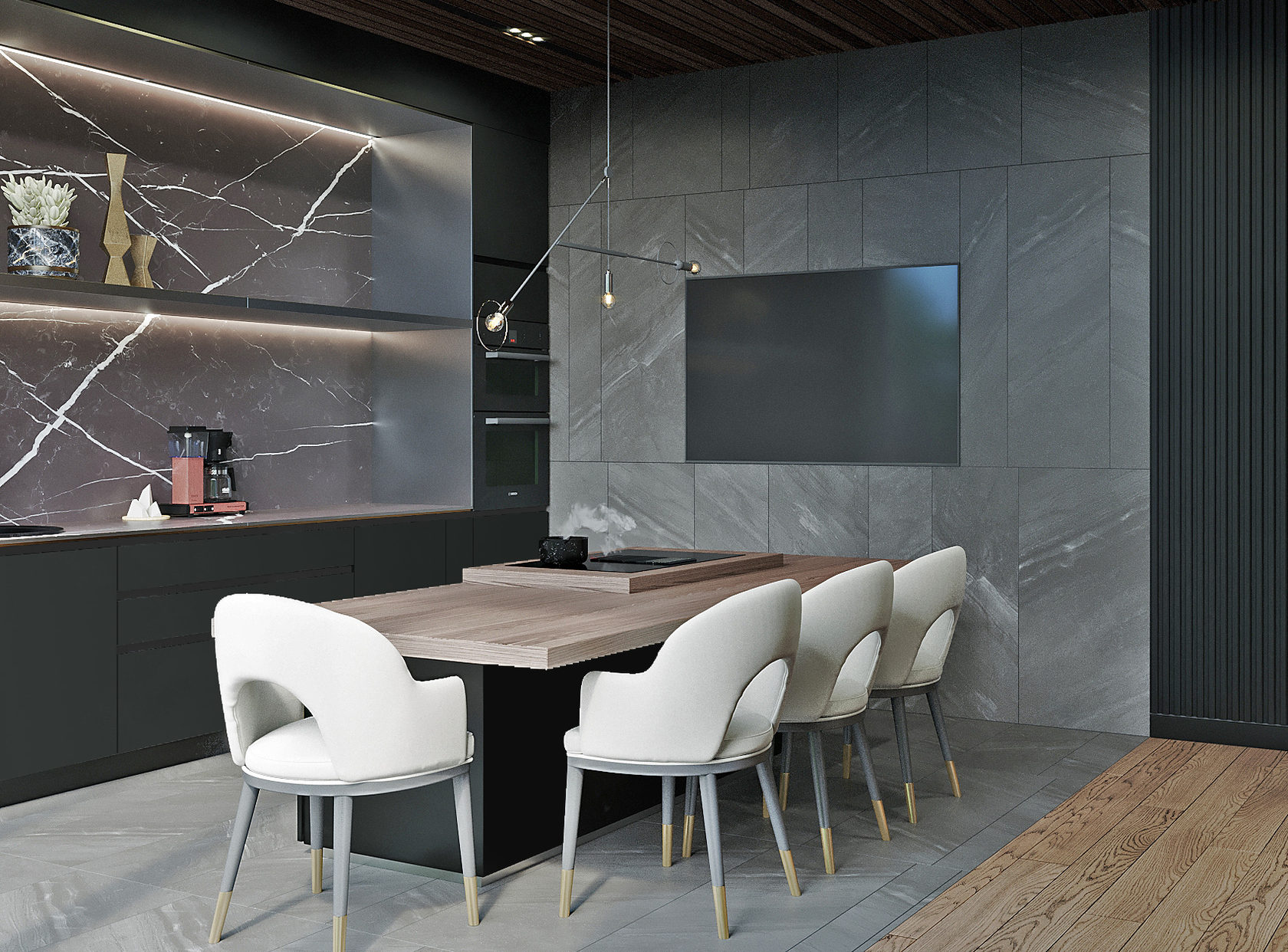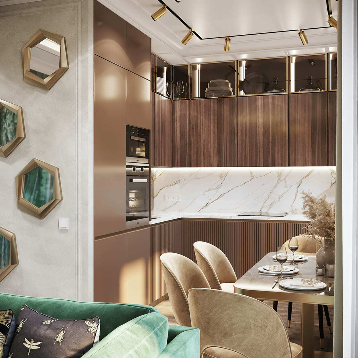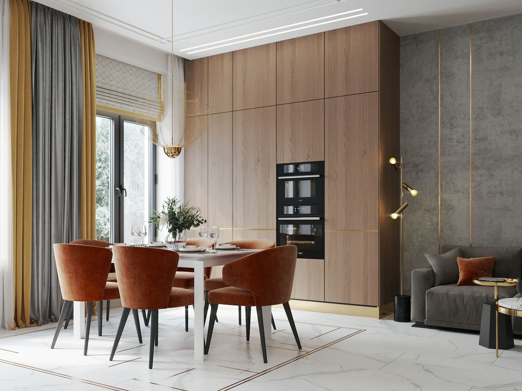Роскошная «шоколадная» квартира-шкатулка. Сочетает в интерьере серые оттенки, блестящие аксессуары из латуни и меди, а также графитовые мотивы в мебели с мрамором nero marquina. Москва. 105 кв.м.