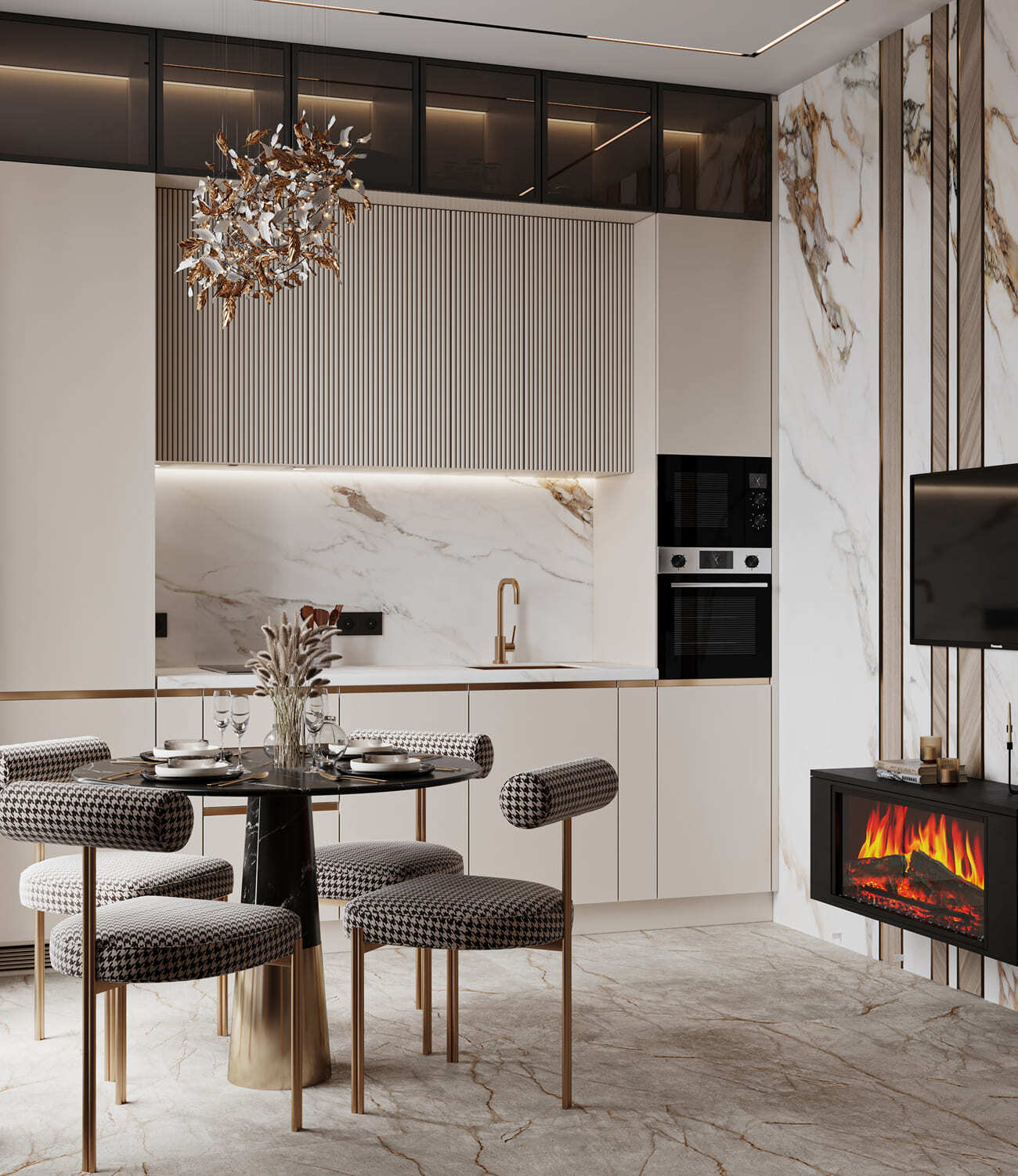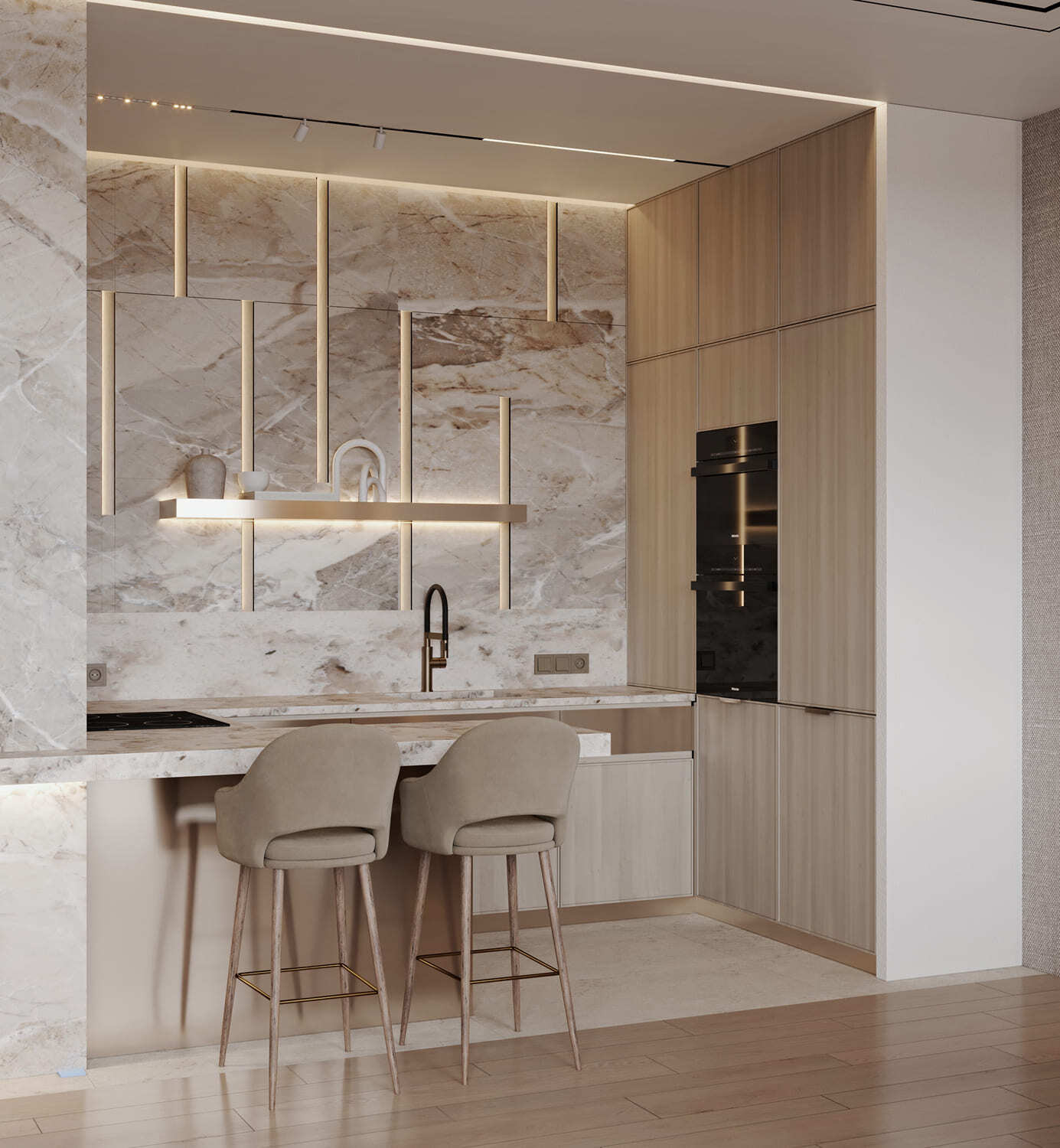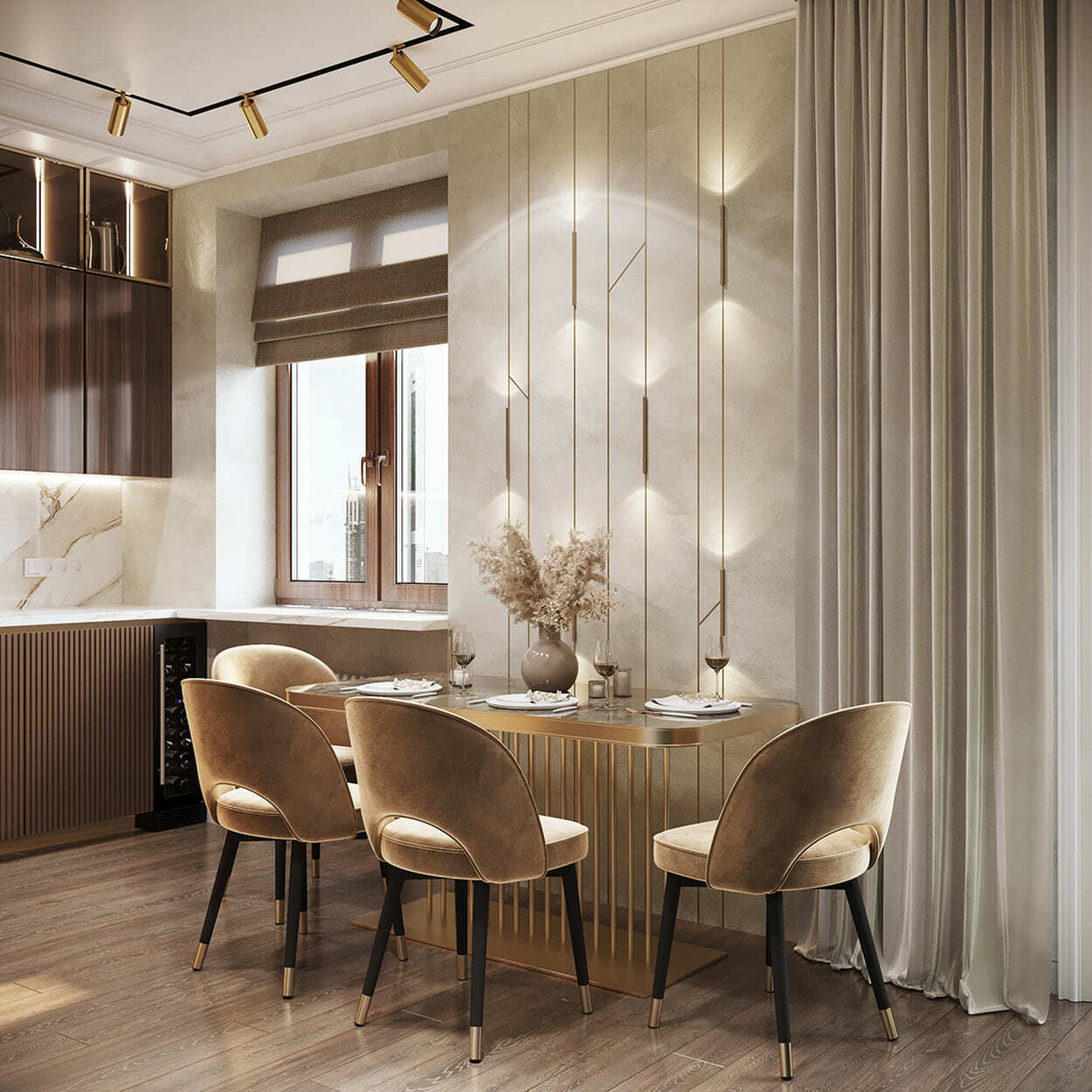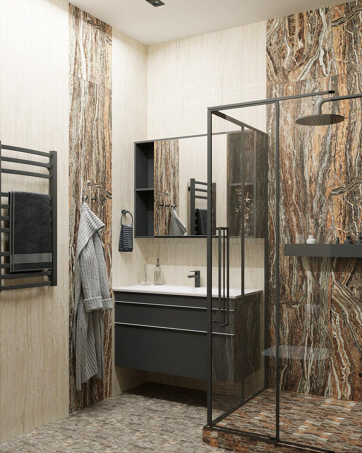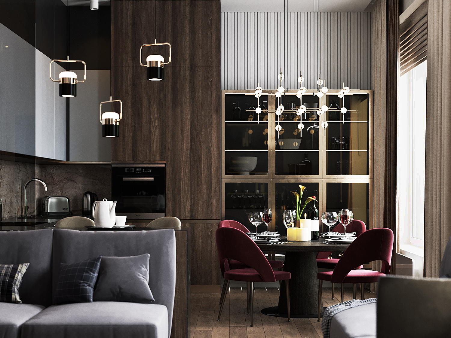 Роскошная «шоколадная» квартира-шкатулка. Сочетает в интерьере серые оттенки, блестящие аксессуары из латуни и меди, а также графитовые мотивы в мебели с мрамором nero marquina. Москва. 105 кв.м.