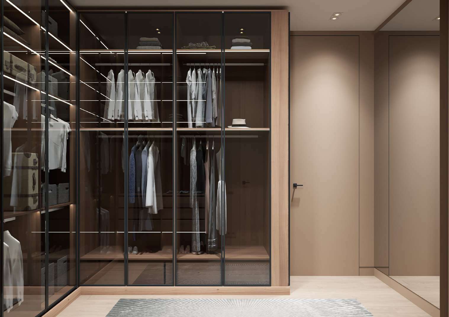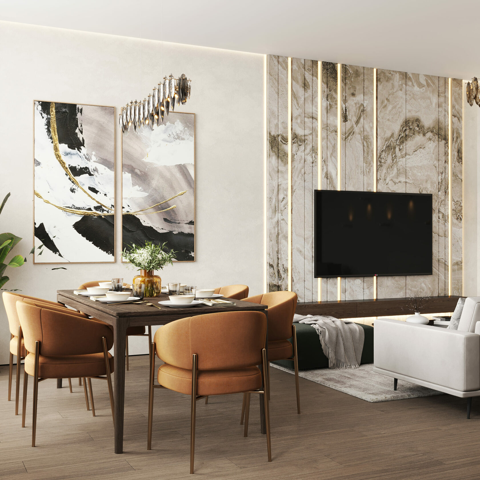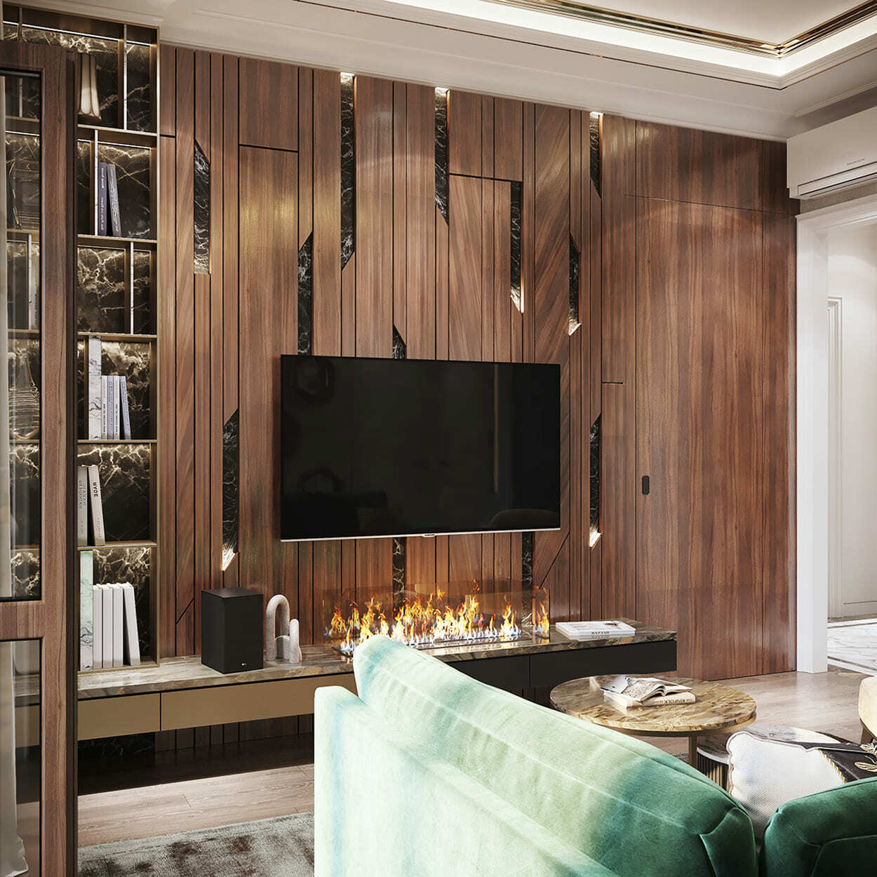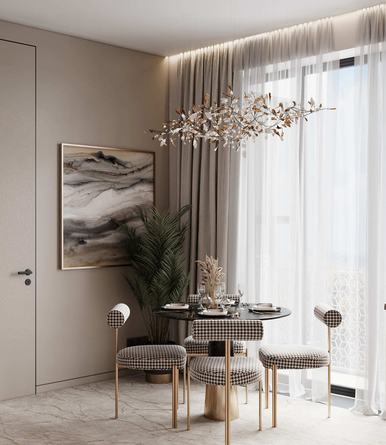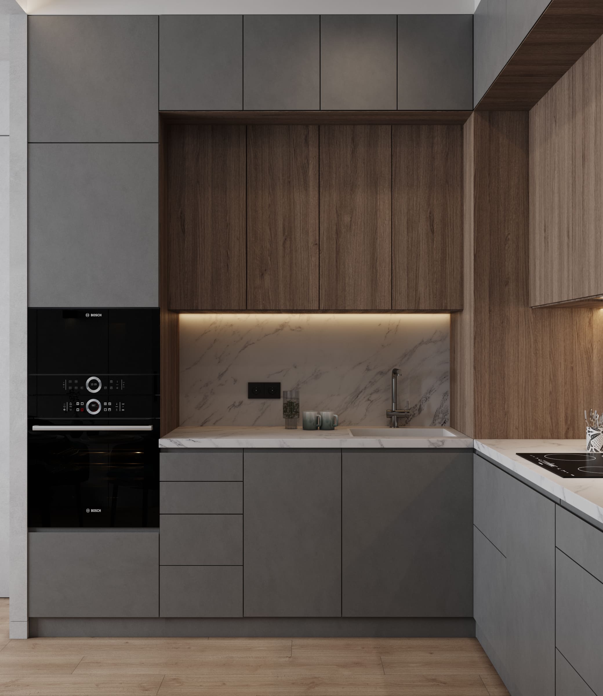 Роскошная «шоколадная» квартира-шкатулка. Сочетает в интерьере серые оттенки, блестящие аксессуары из латуни и меди, а также графитовые мотивы в мебели с мрамором nero marquina. Москва. 105 кв.м.