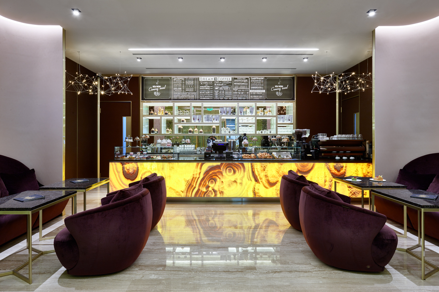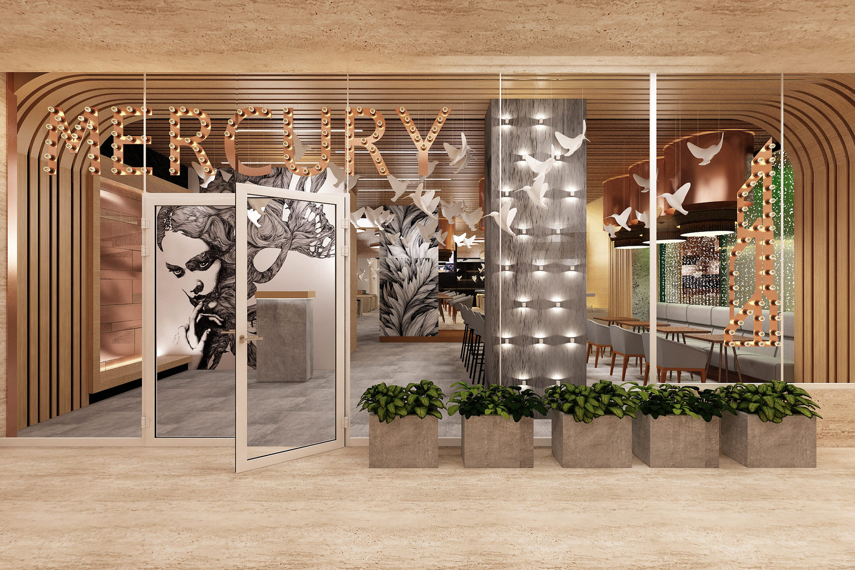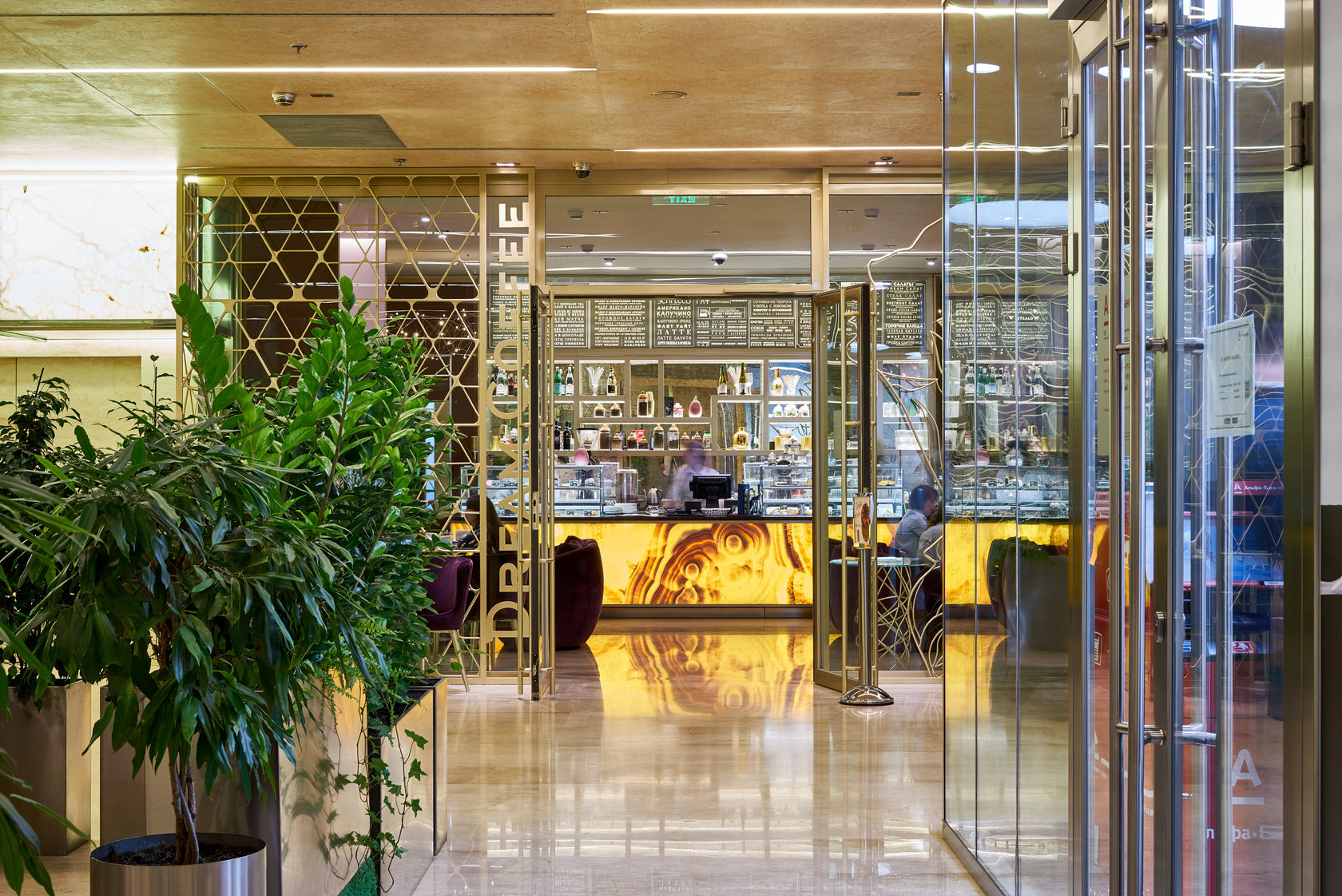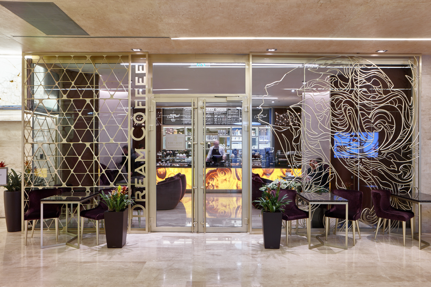 Кованое панно с женским образом в стиле Ар Нуво золотого цвета, кожаными панелями на стенах. Бар из оникса карамельного цвета в холле башни Меркурий. Москва. 210 кв.м.