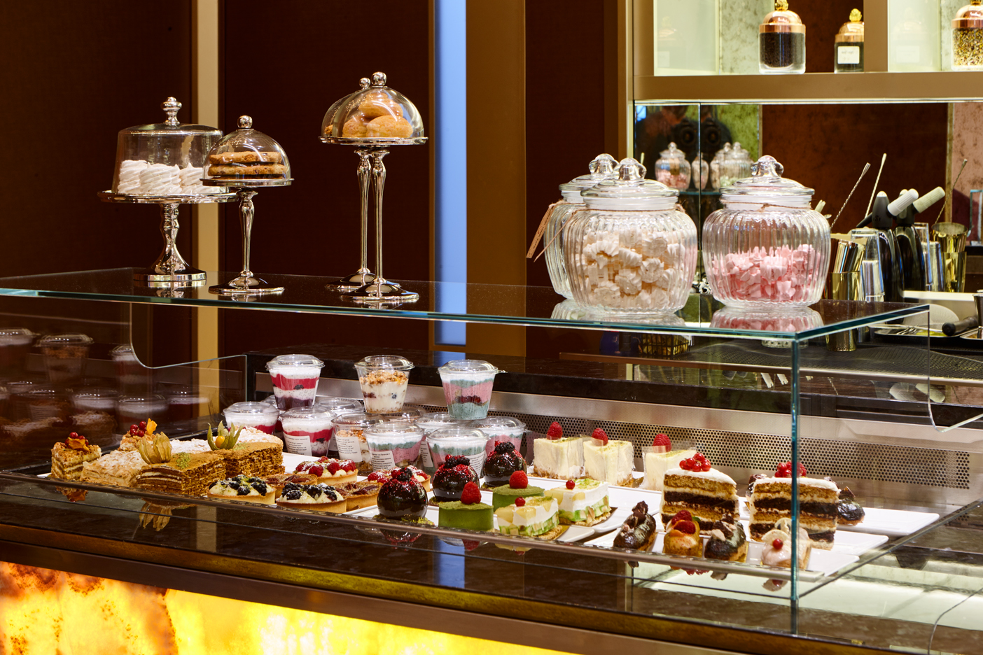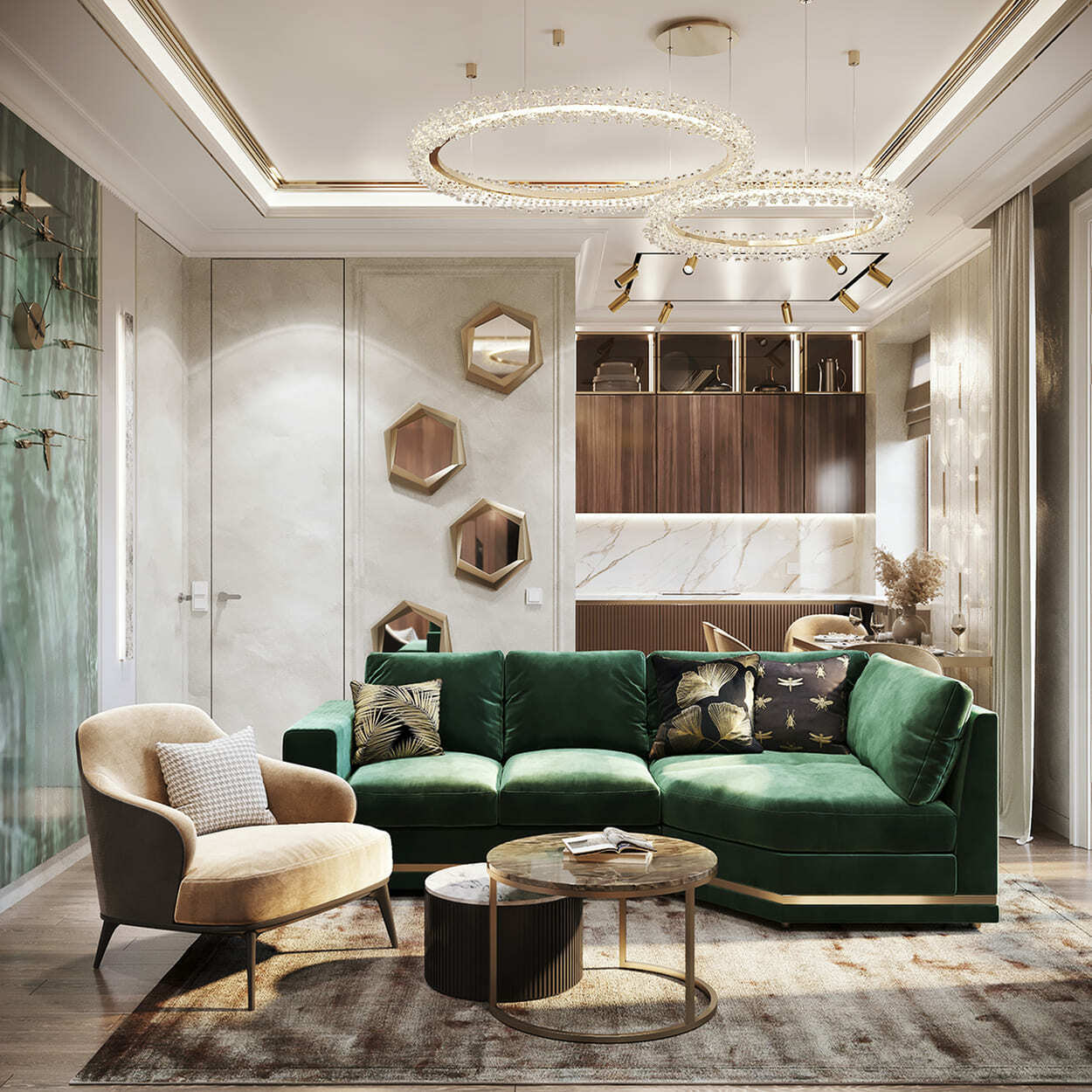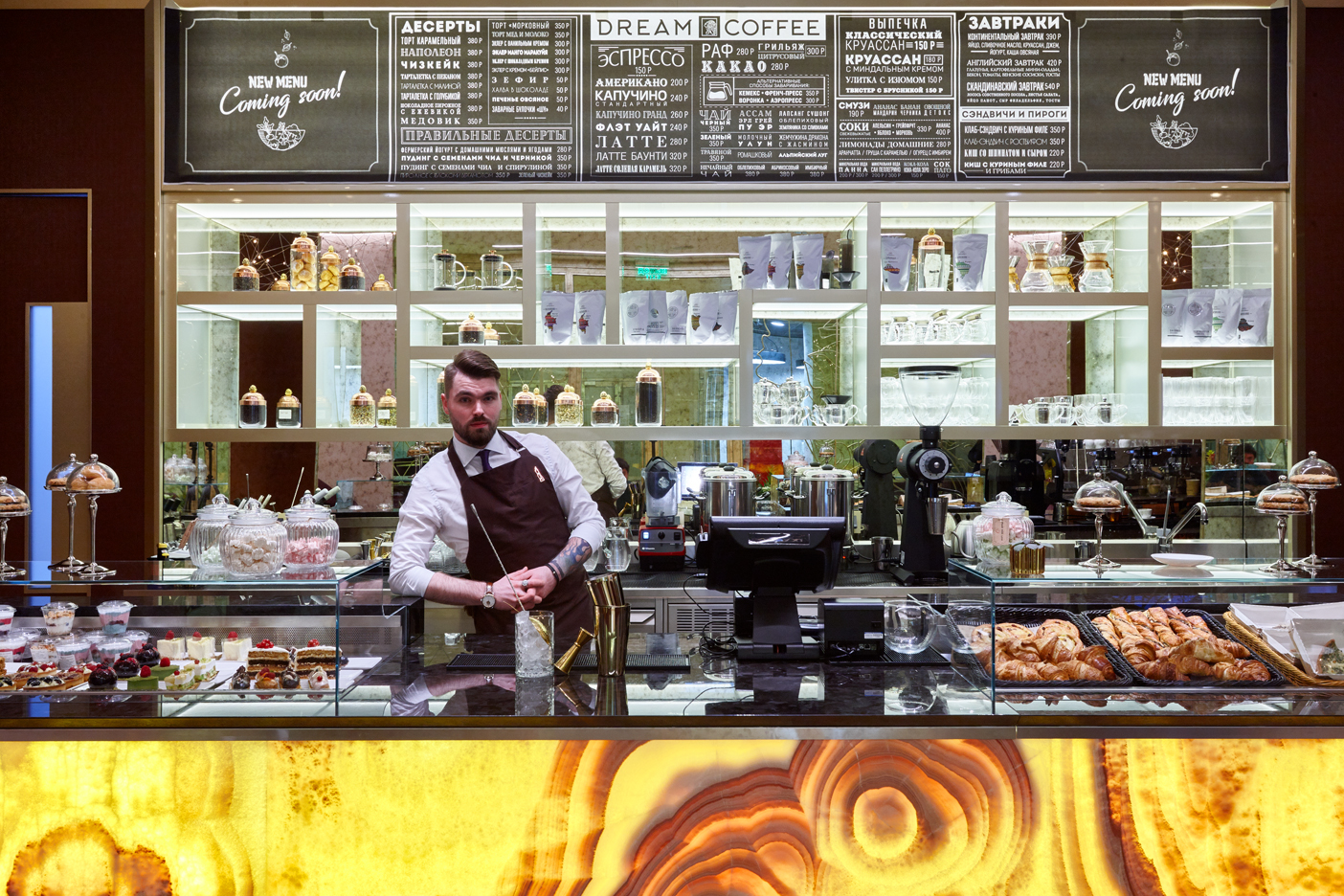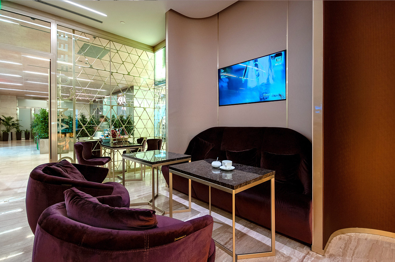 Кованое панно с женским образом в стиле Ар Нуво золотого цвета, кожаными панелями на стенах. Бар из оникса карамельного цвета в холле башни Меркурий. Москва. 210 кв.м.