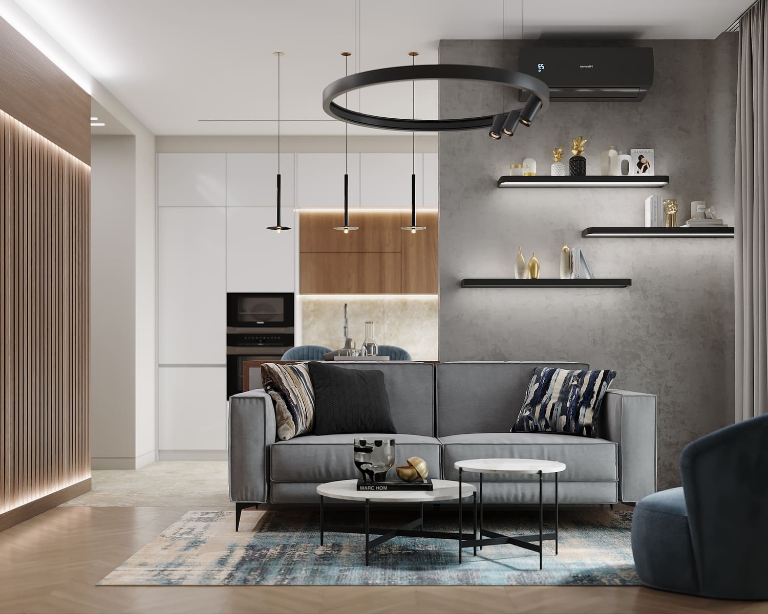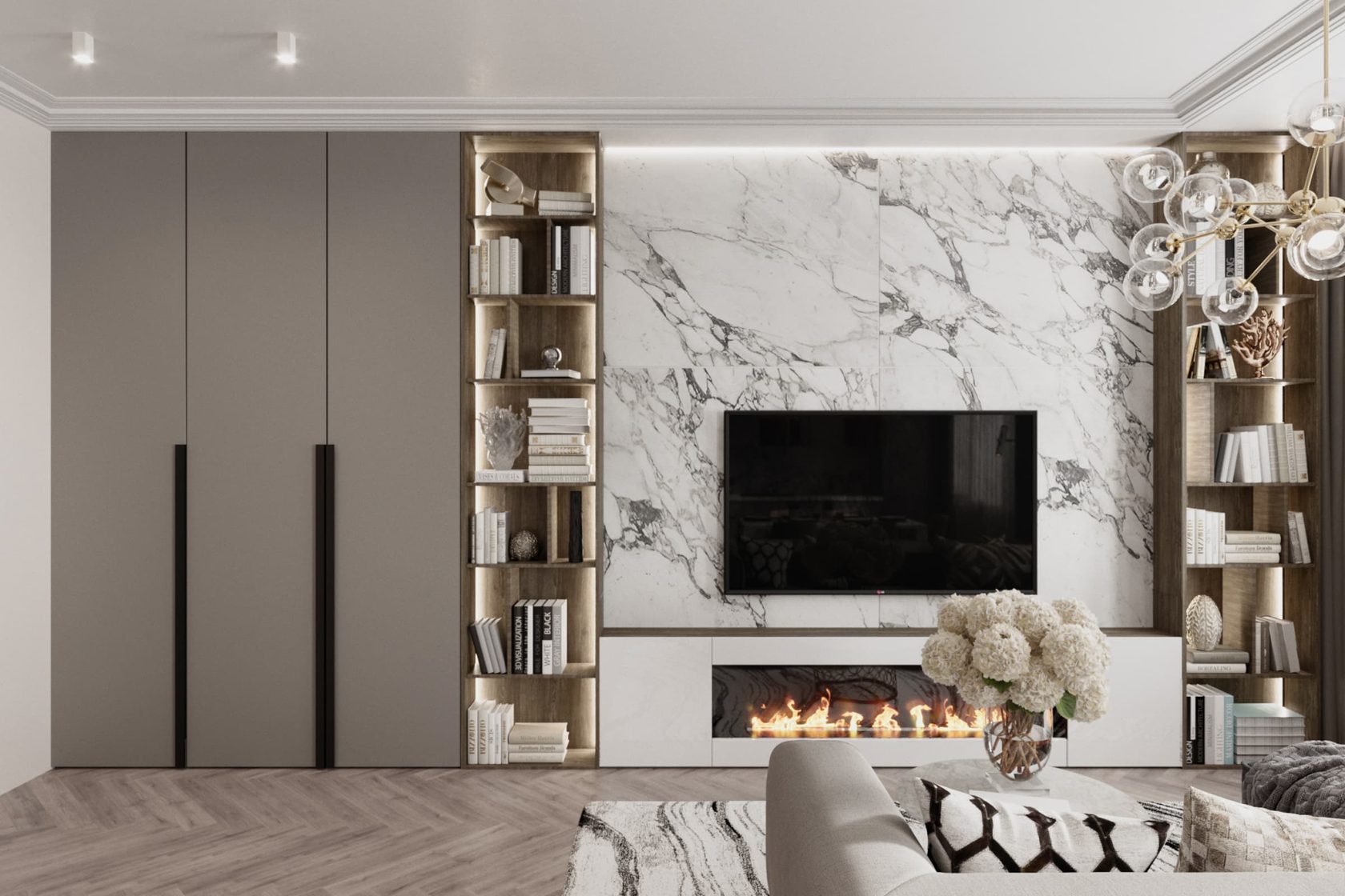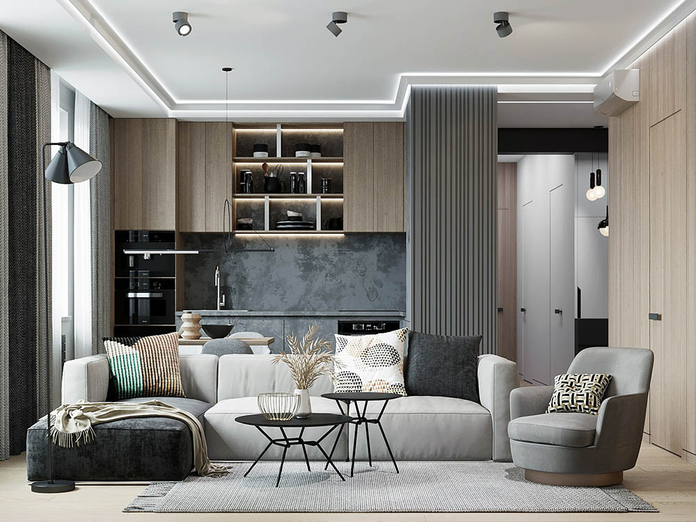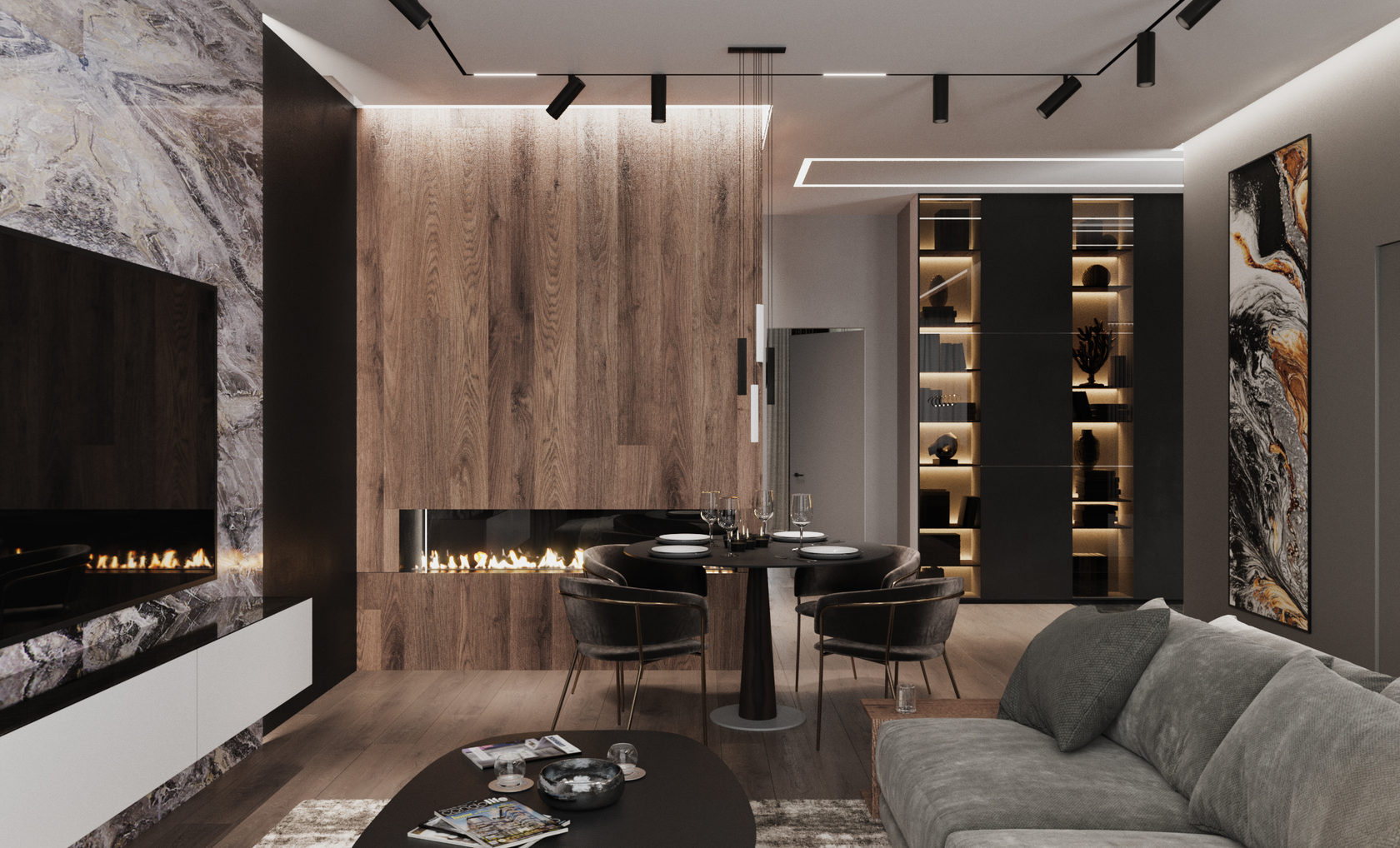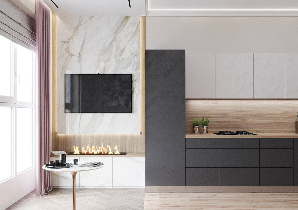 Оригинальная квартира для молодой пары на берегу Москва реки в монохромной гамме, с обволакивающей атмосферой и притягательным пламенем в семейном очаге. Москва. 82 кв.м.
