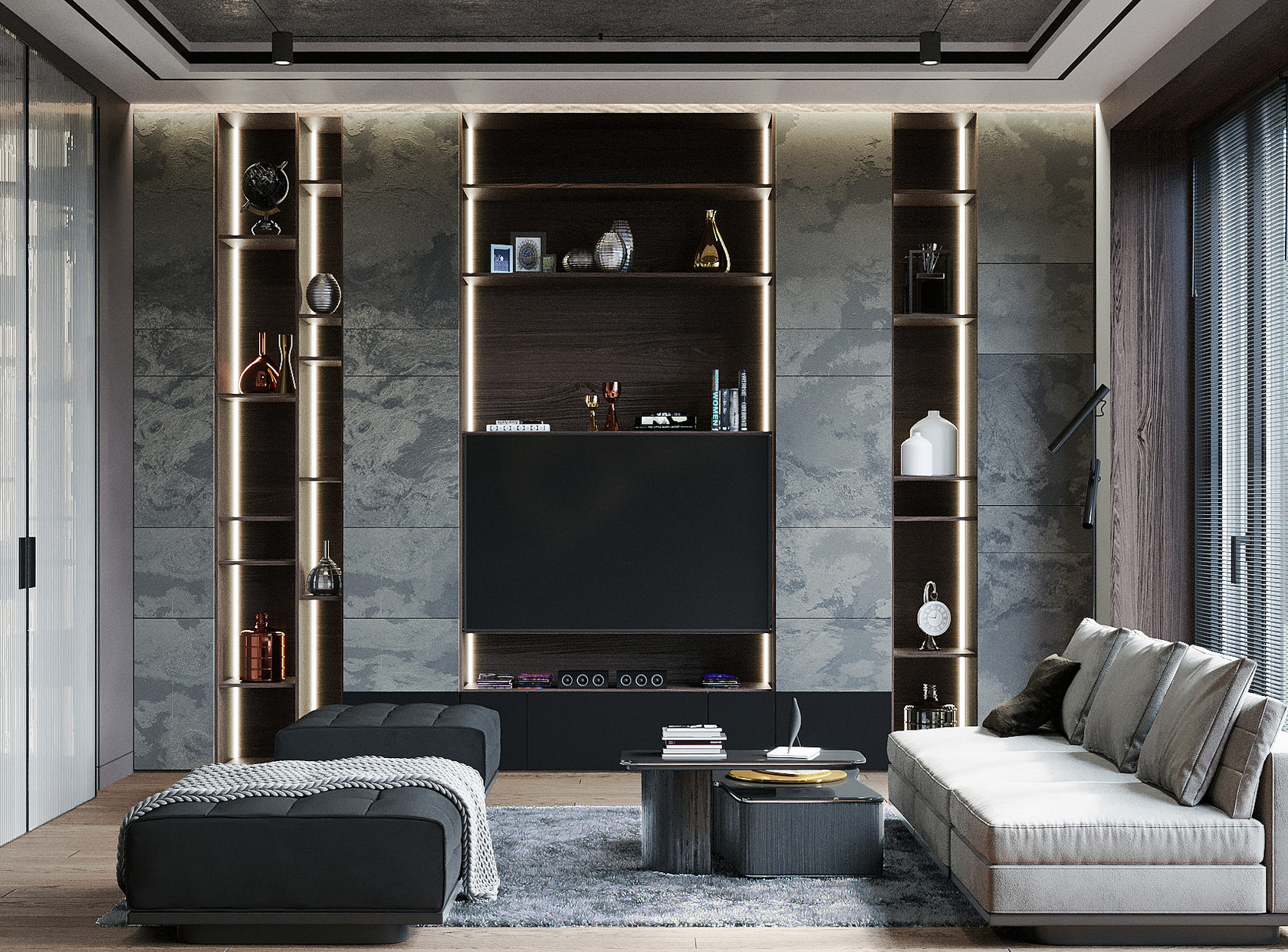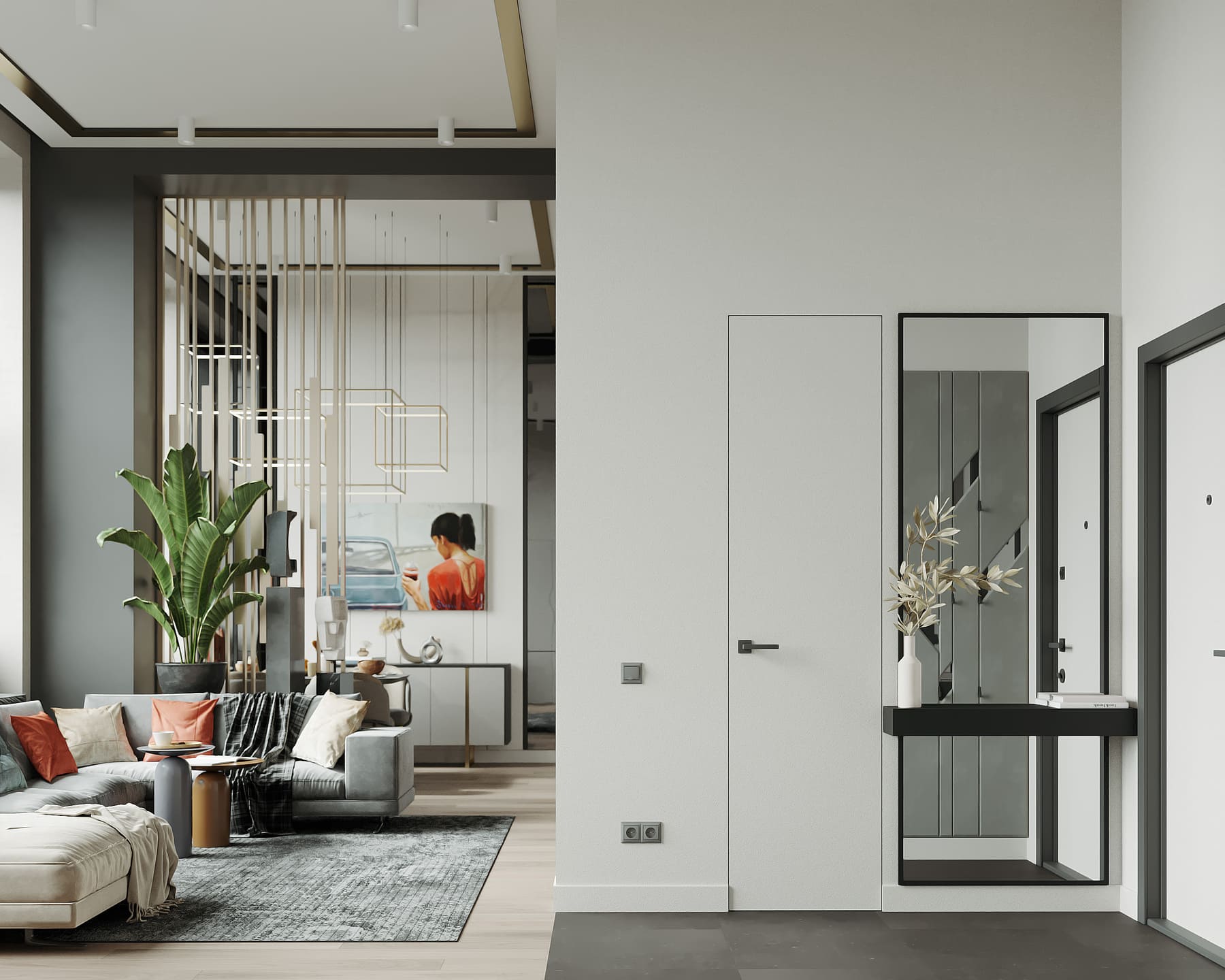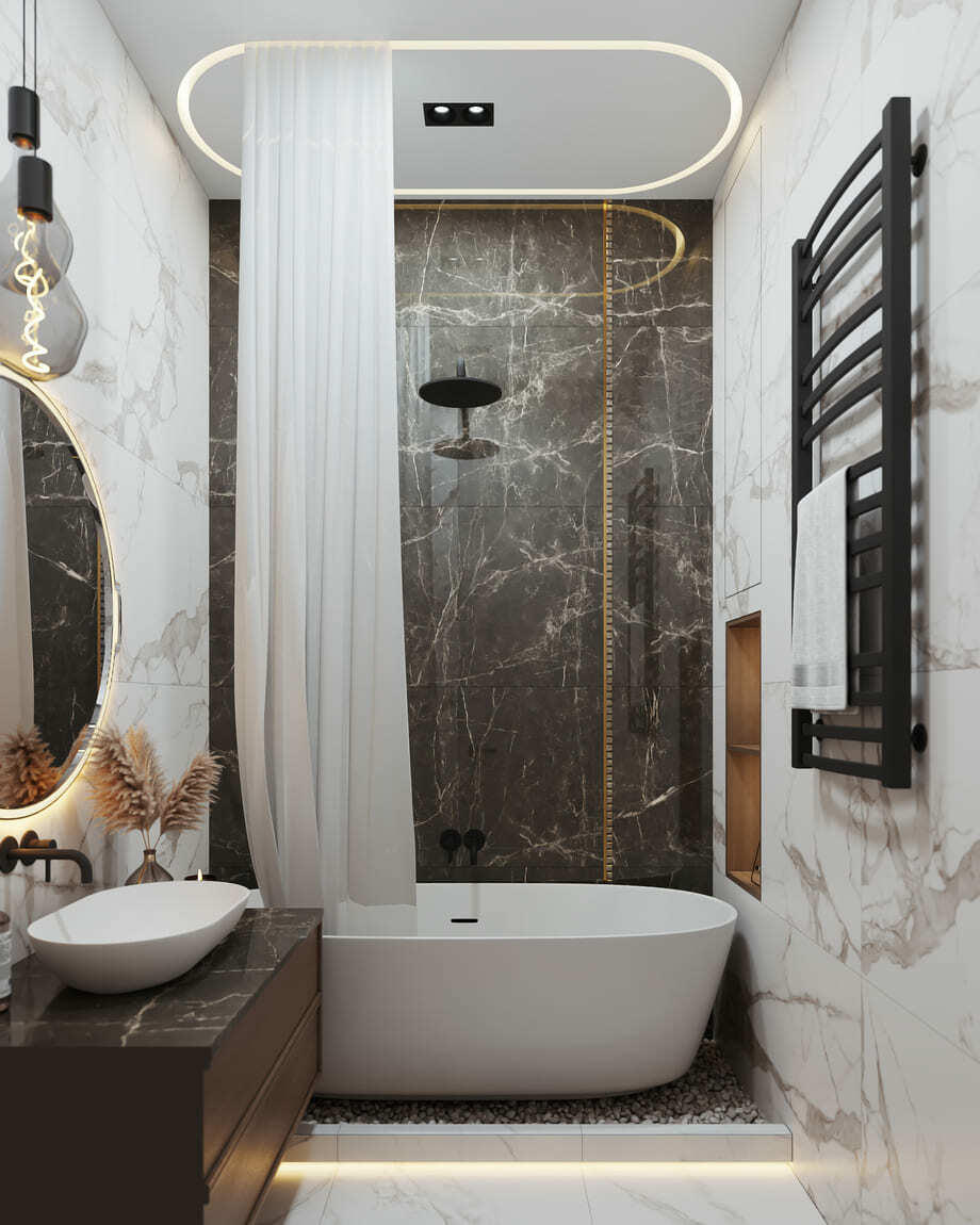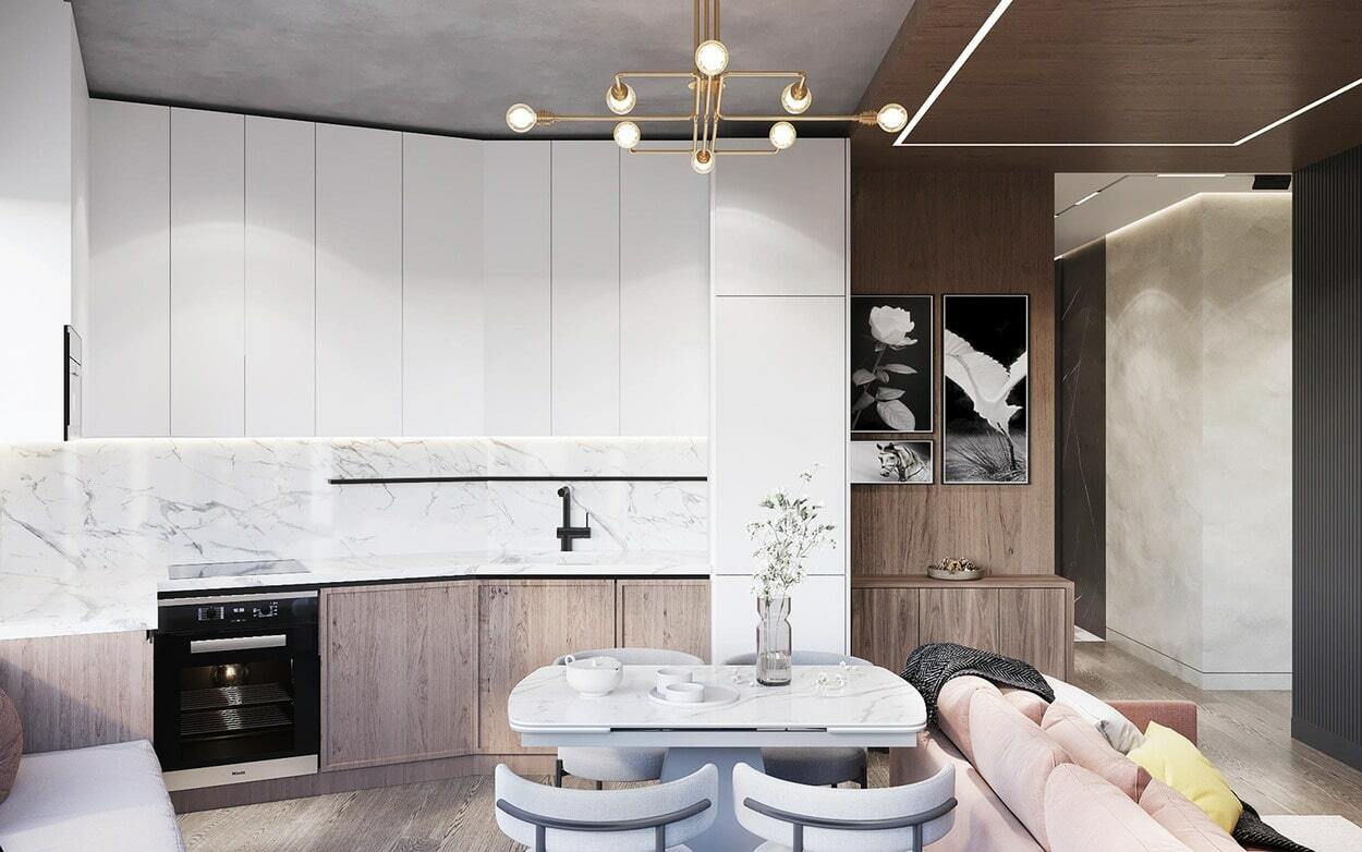Оригинальная квартира для молодой пары на берегу Москва реки в монохромной гамме, с обволакивающей атмосферой и притягательным пламенем в семейном очаге. Москва. 82 кв.м.