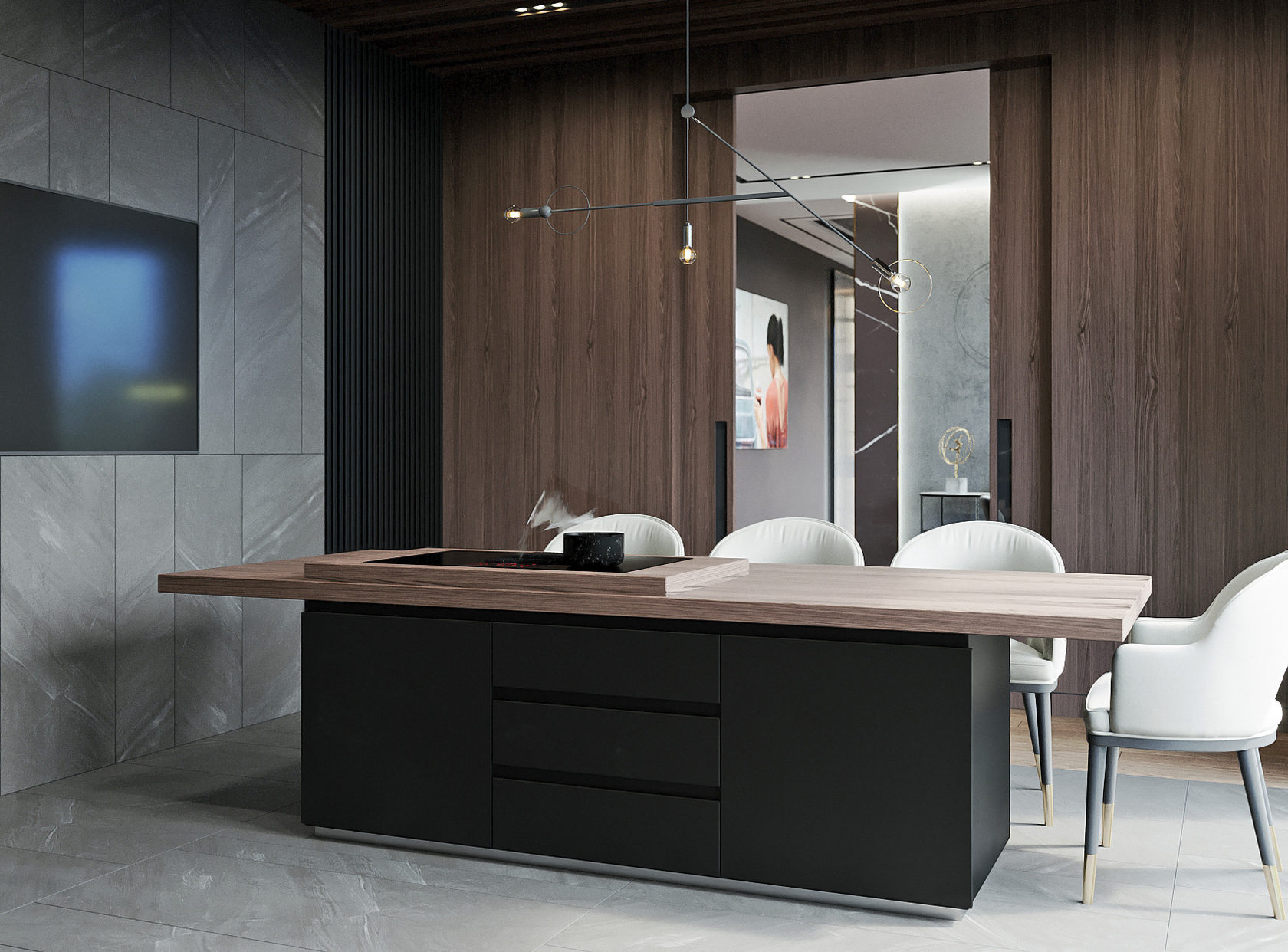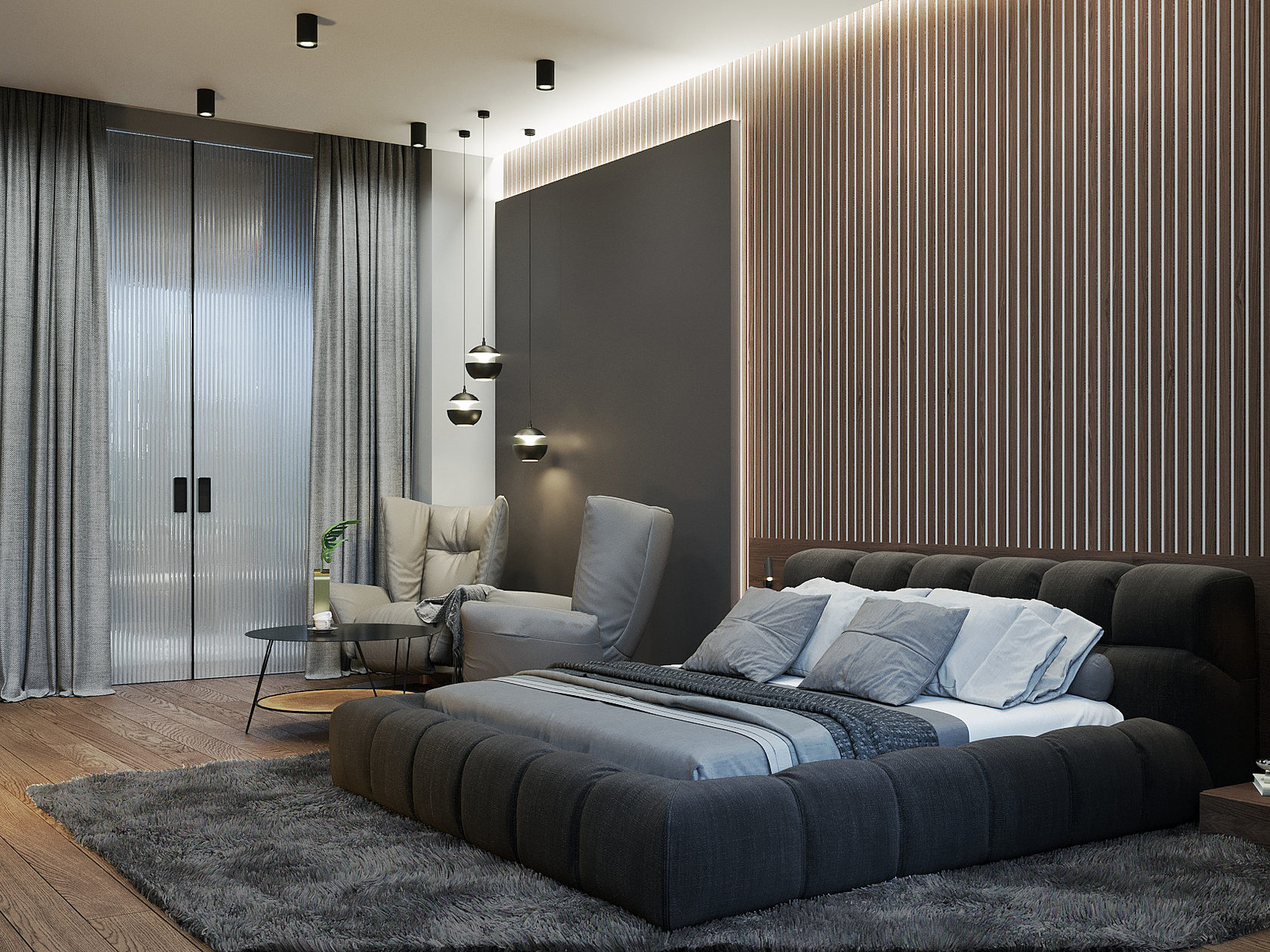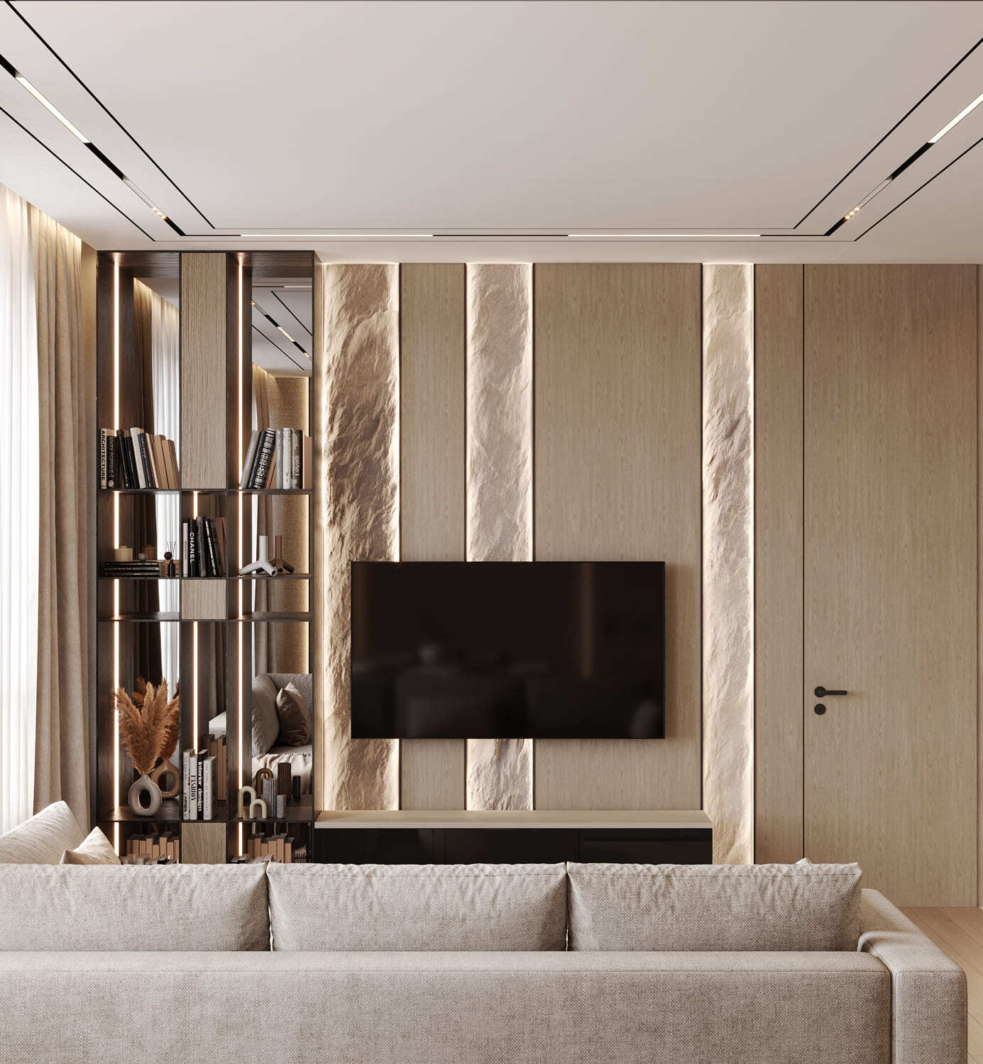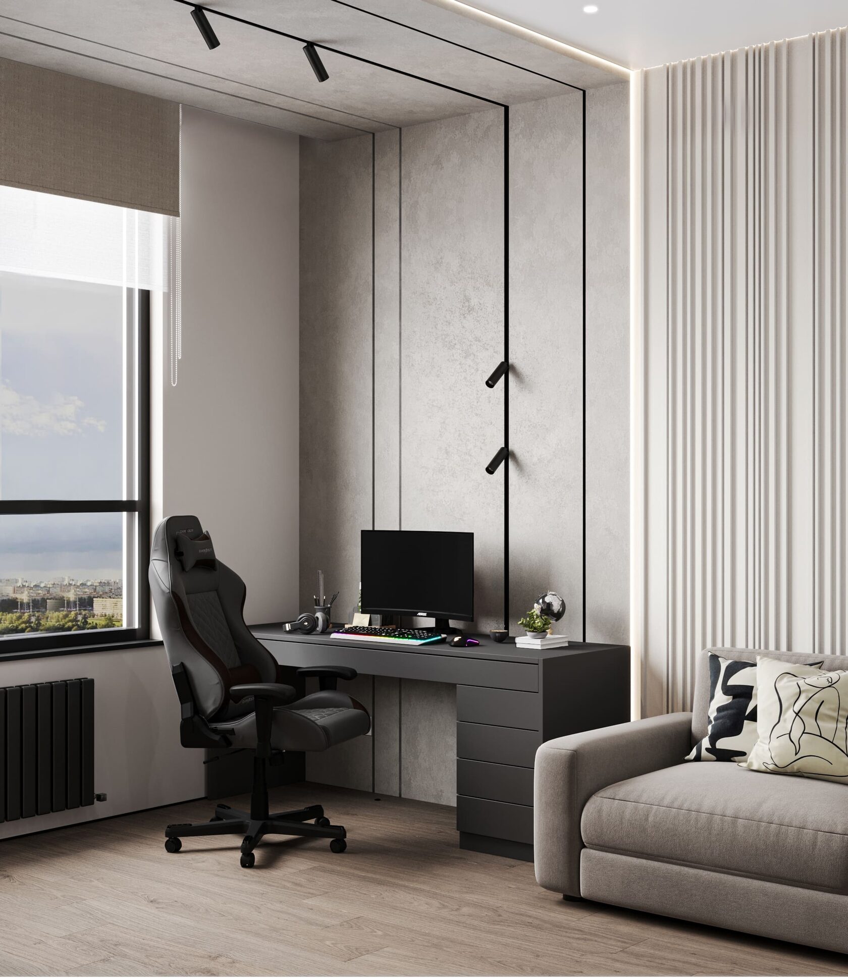 Оригинальная квартира для молодой пары на берегу Москва реки в монохромной гамме, с обволакивающей атмосферой и притягательным пламенем в семейном очаге. Москва. 82 кв.м.