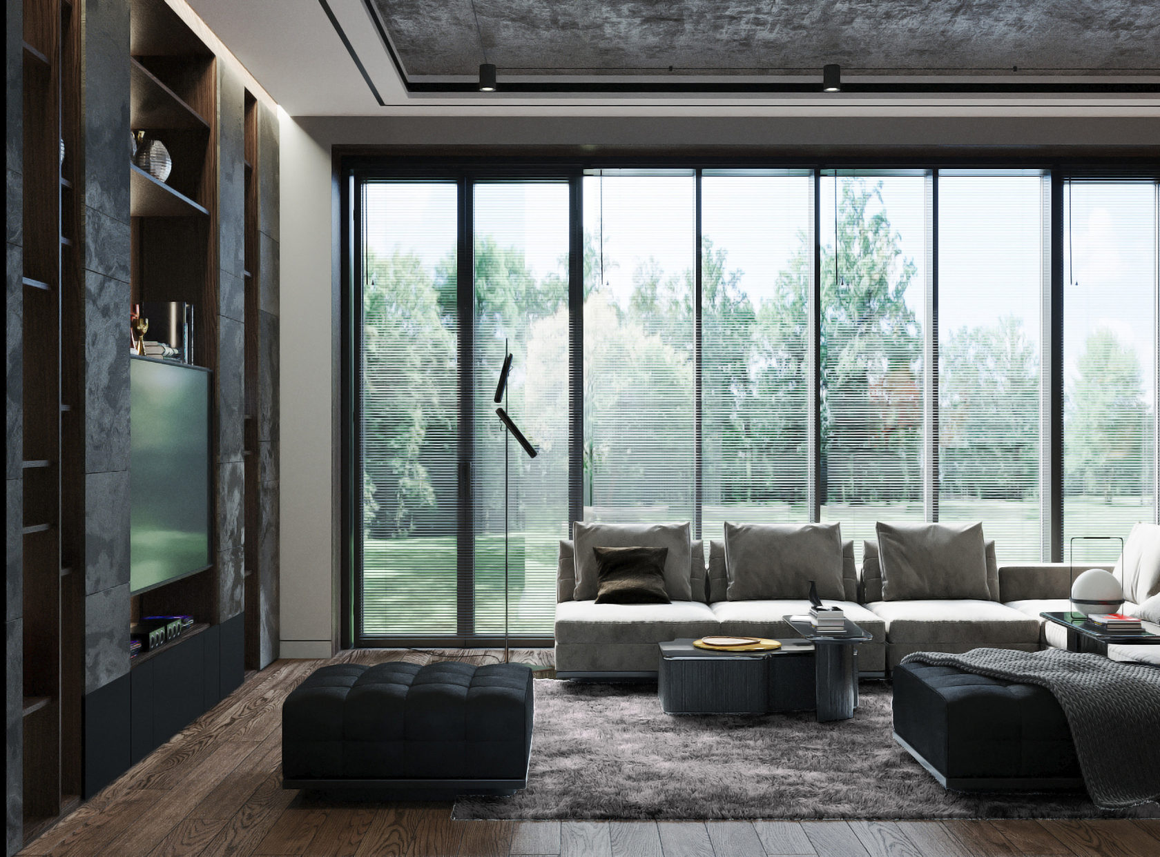 Лаконичный и при этом изысканный дизайн загородного дома в минималистичных тонах. В проекте была разработана реконструкция фасада для устройства панорамного вида на живописный лес. Московская область. Пирогово. 115 кв.м. 1 этаж
