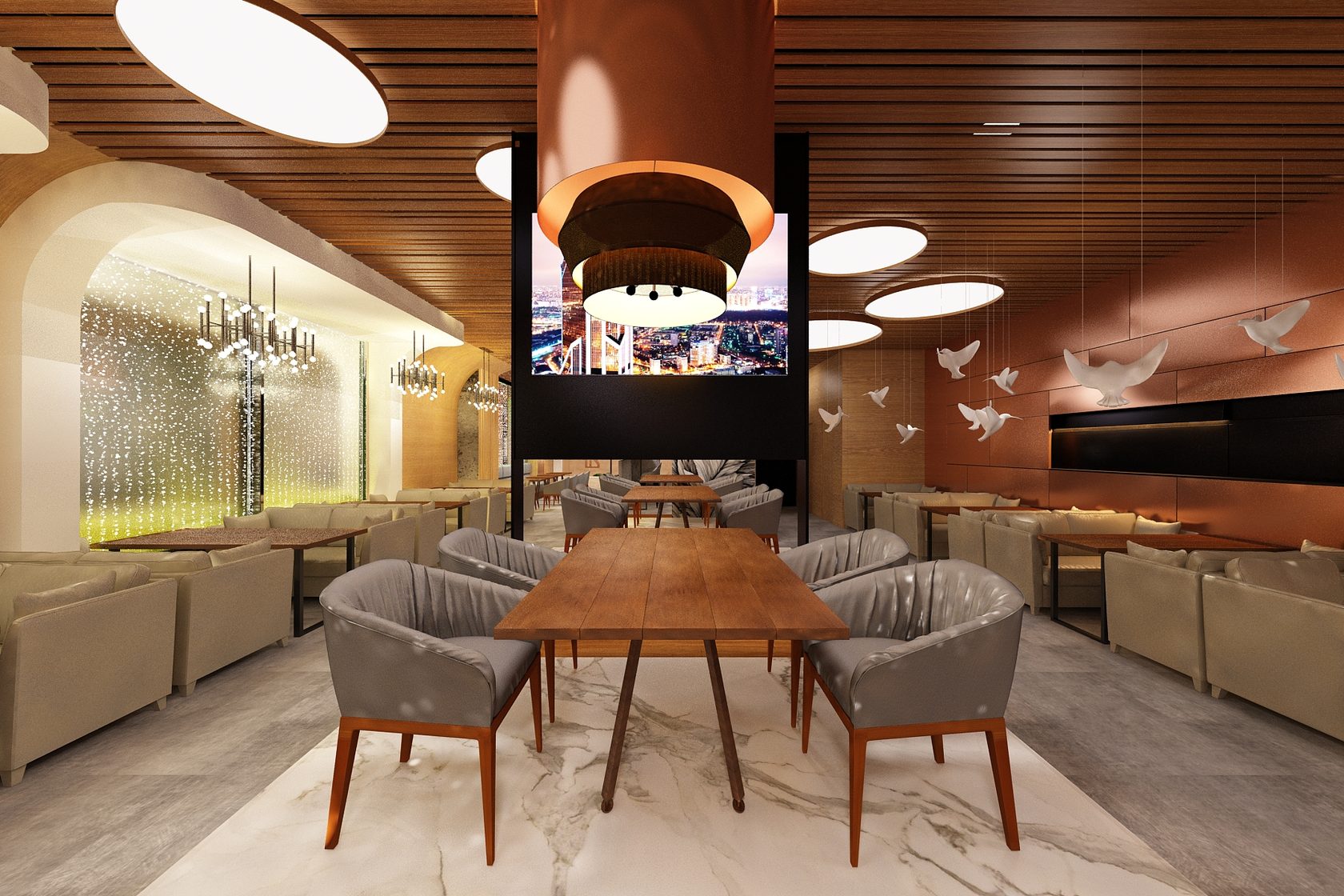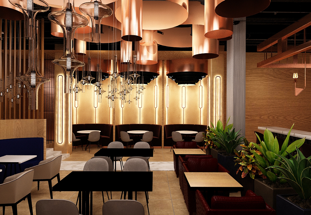 Ресторан европейской и японской кухни в стиле лофт с крафтовыми светильниками в виде медных сосудов, а также с парящими птицами и живописным панно. Москва. 1000 Кв. м.