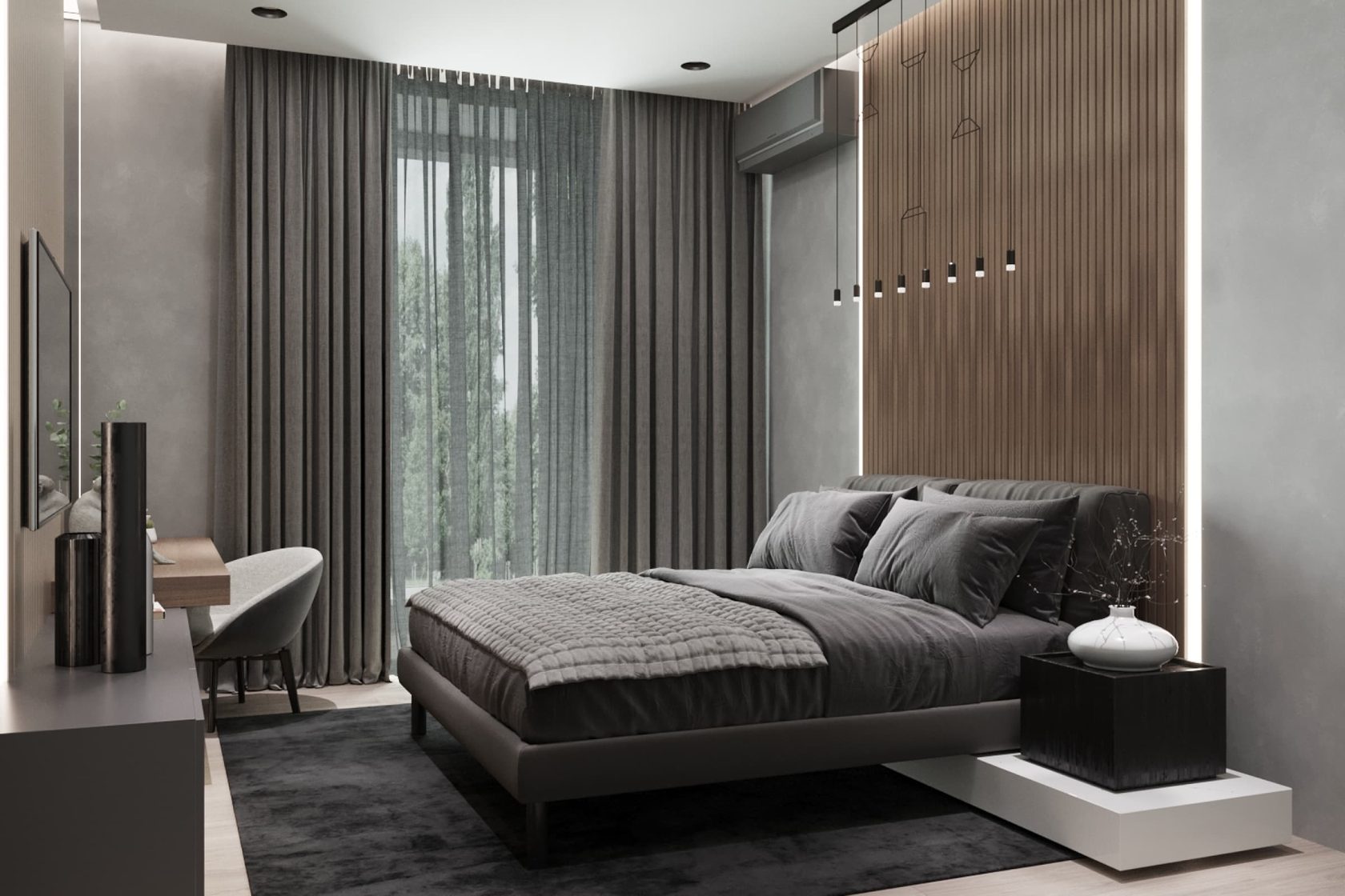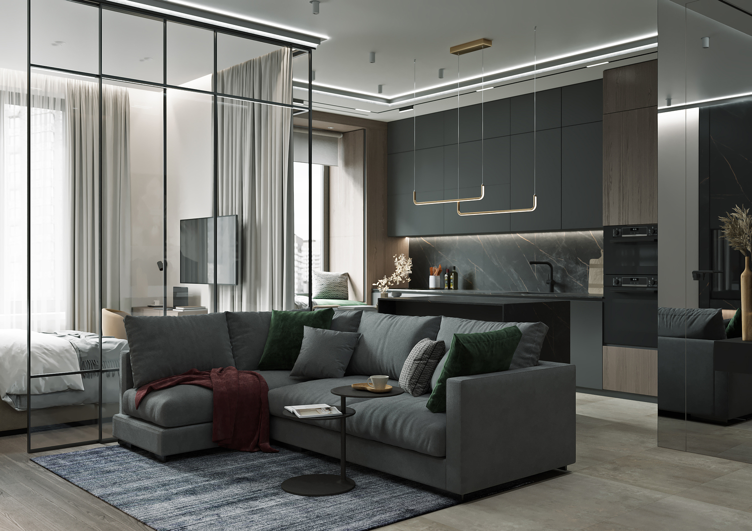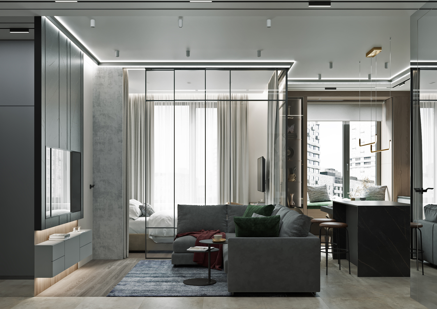Двухкомнатная квартира с великолепным видом на Очаковский парк. Из однокомнатной мы сделали двухкомнатную, разделив зону спальни раздвижной стеклянной перегородкой. Москва. 44 кв. м