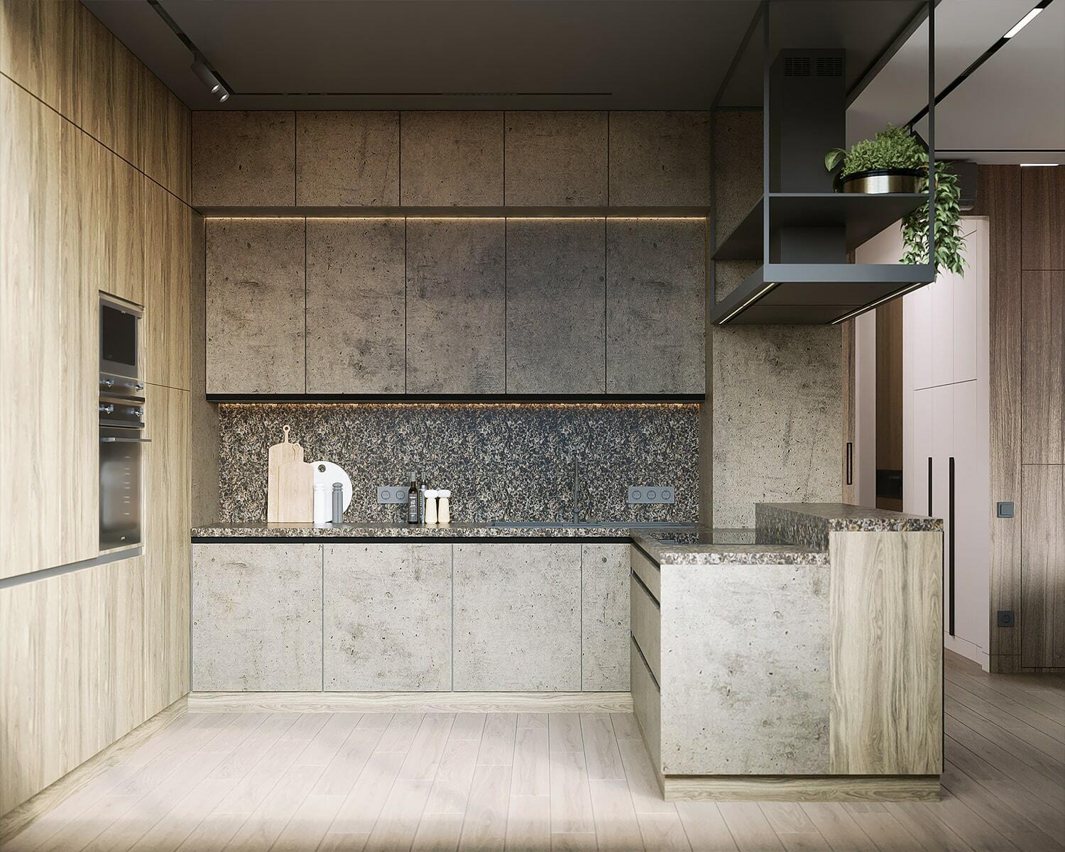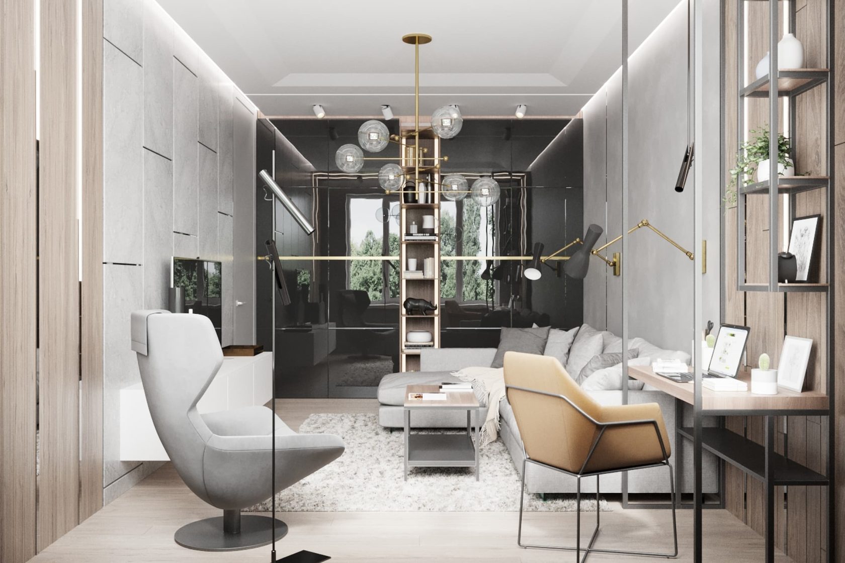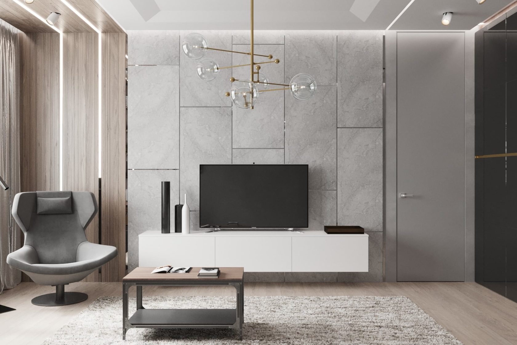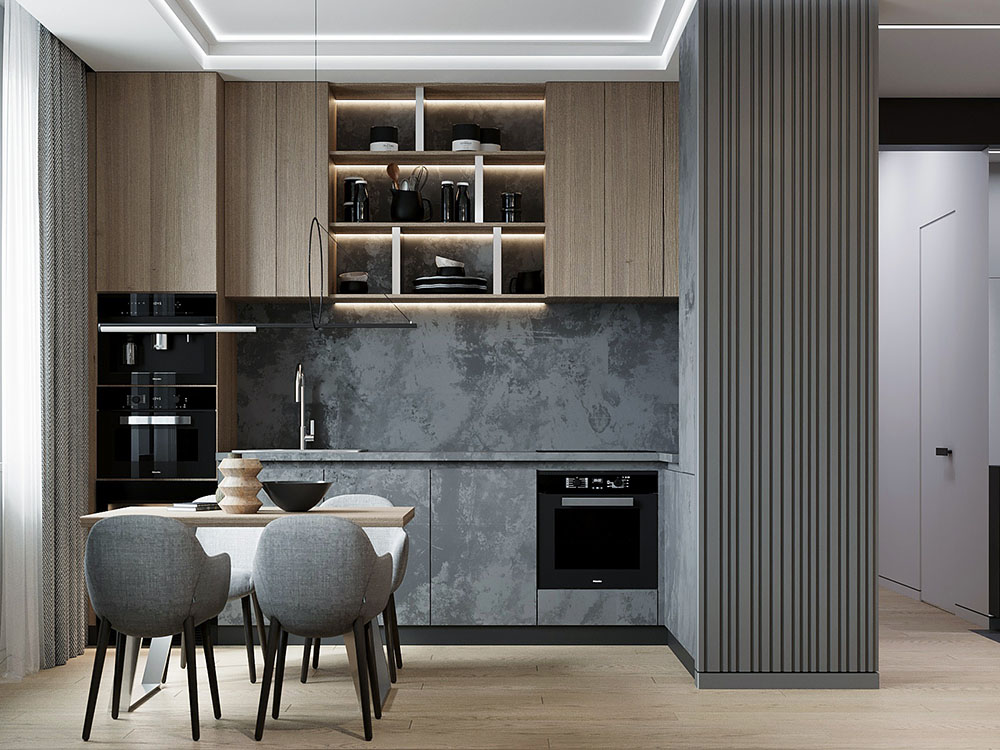 Уникальная квартира в стиле «Современный лофт» для молодого и целеустремленного холостяка. Цветовая гамма в стилистике 50 оттенков серого с утонченными элементами из редкого черного мрамора. Москва. 74 кв. м.