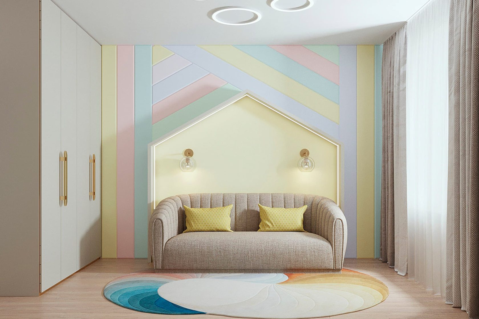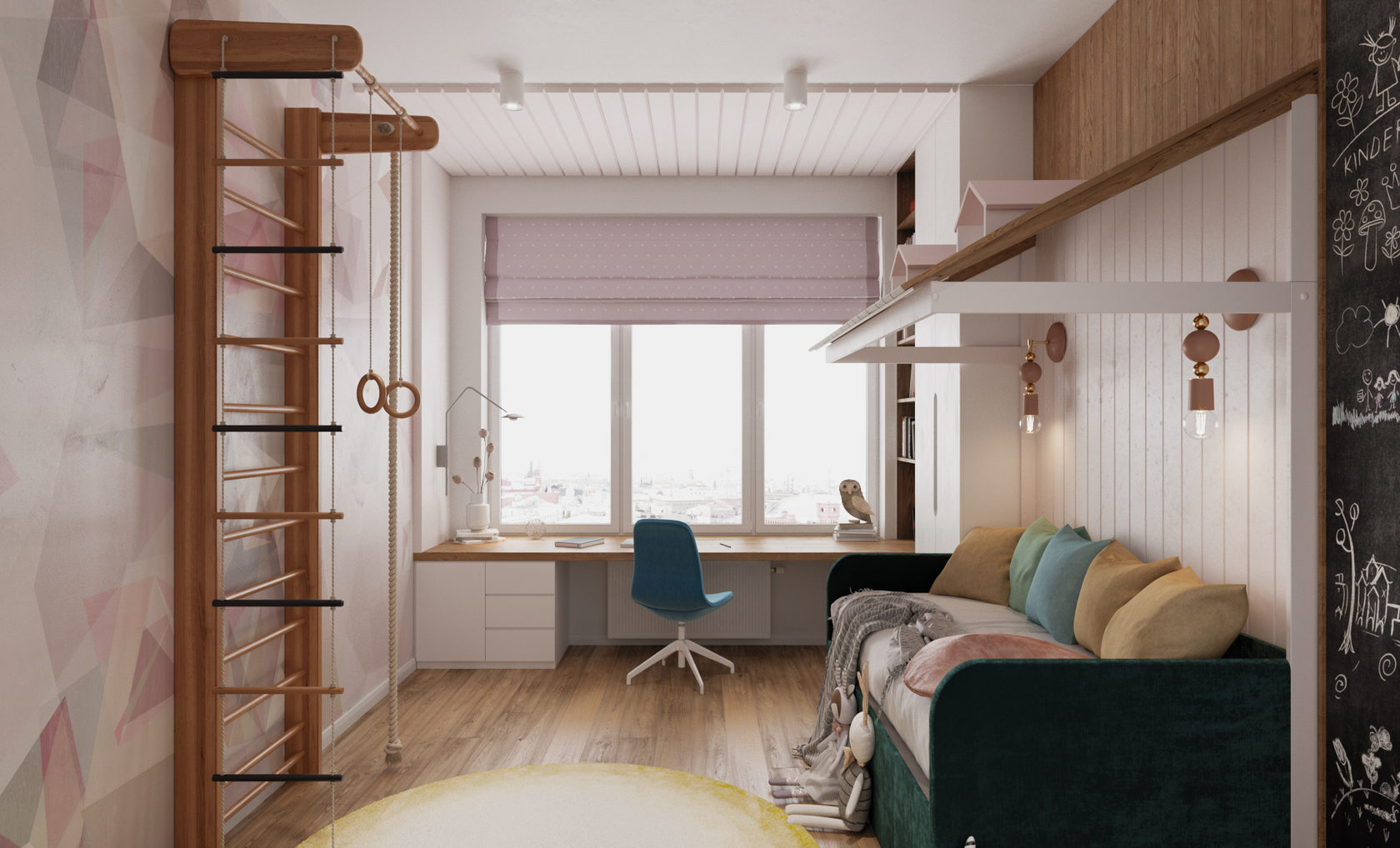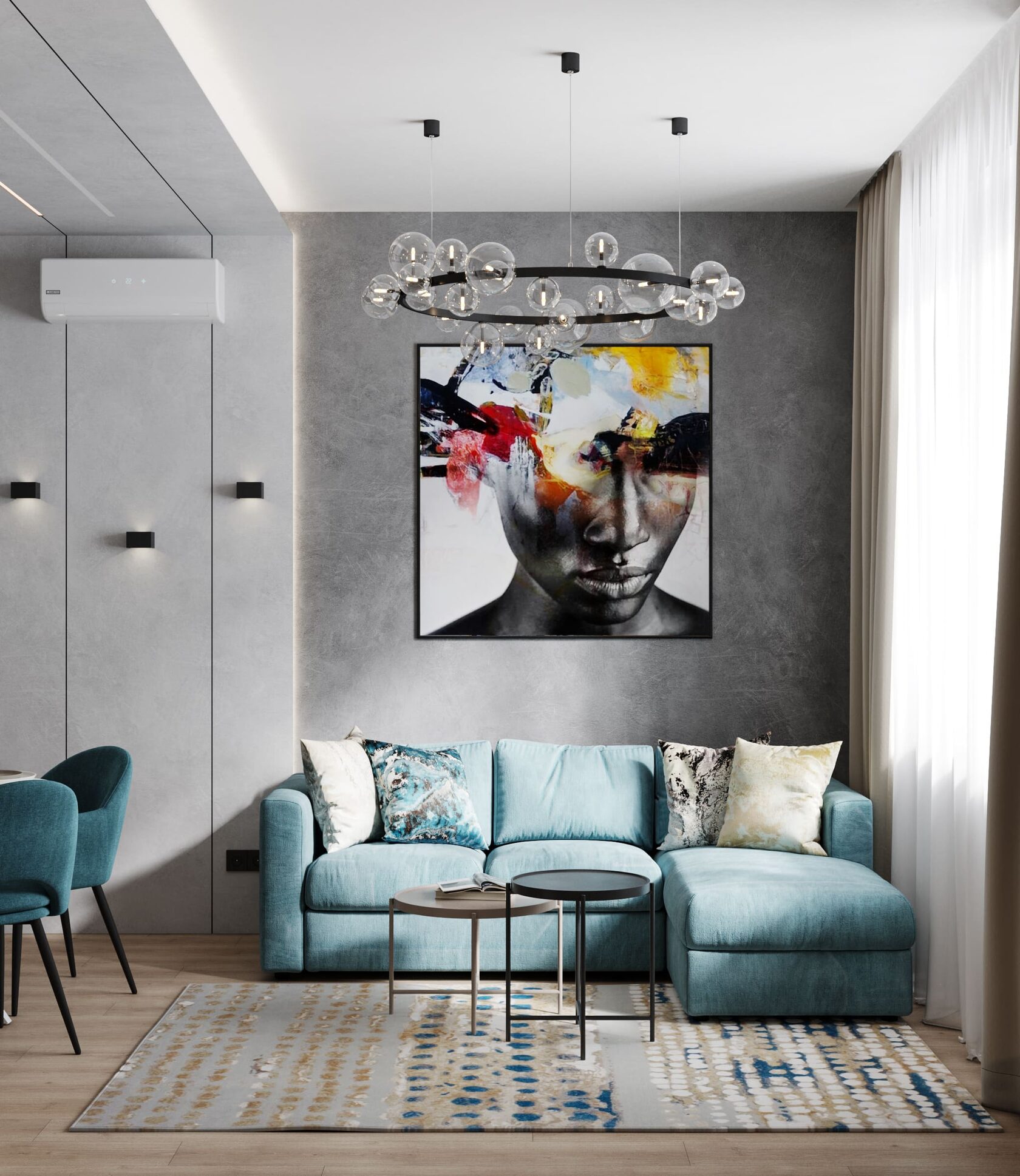 Яркая, идеально геометрически выверенная квартира для семьи из двух взрослых и двух дочерей с оригинальной дизайнерской люстрой и собственной «тропической» ванной комнатой. Москва. 100 кв. м