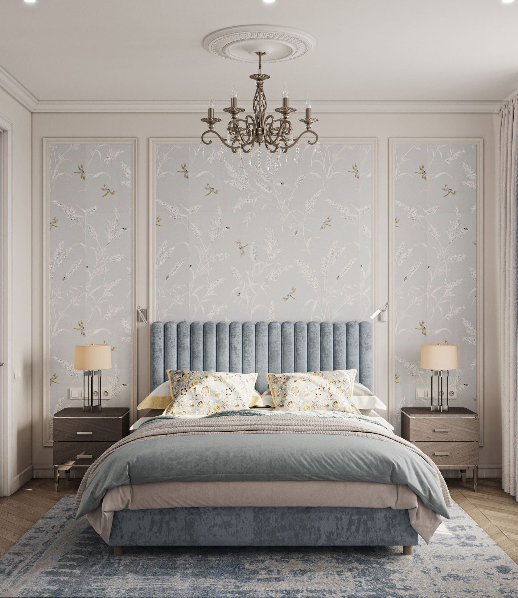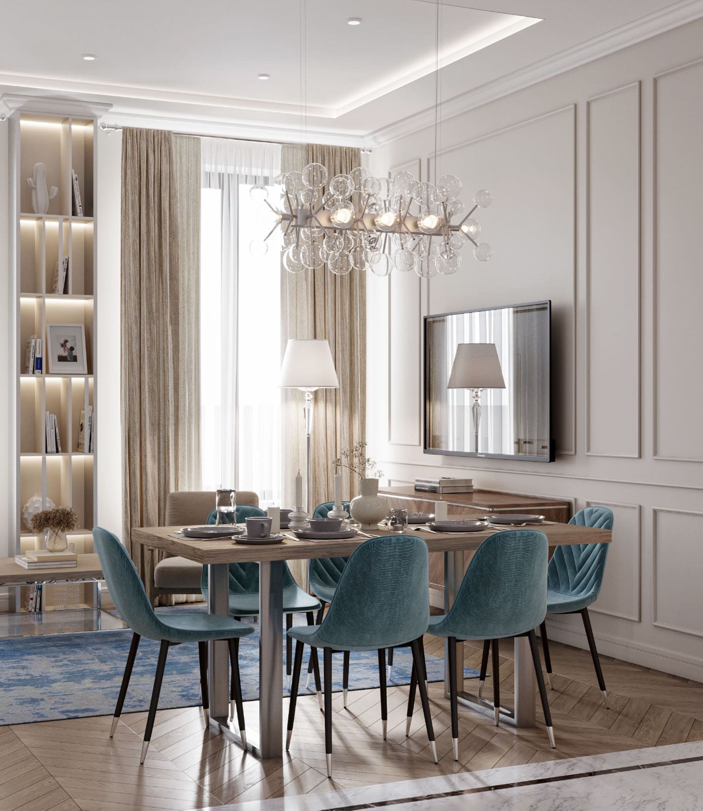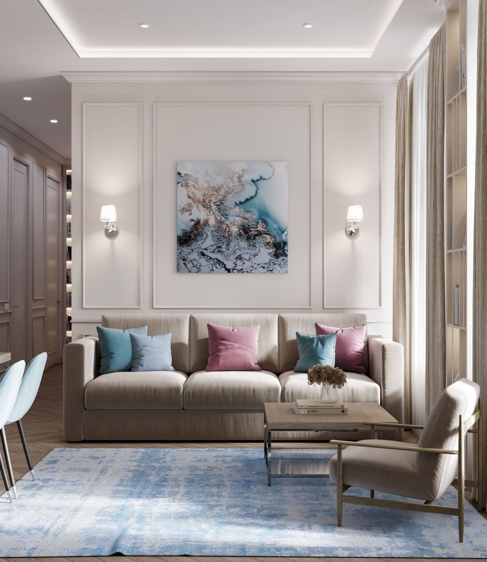 Воздушный, спокойный, пастельный интерьер трёхкомнатной квартиры, выдержанной в стиле неоклассика. Холодные оттенки голубого и синего грамотно сочетаются с кремовым и бежевым цветом в кухне и гостиной. Москва. 92 кв. м.
