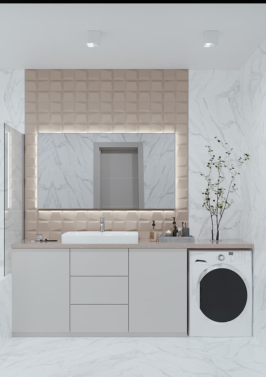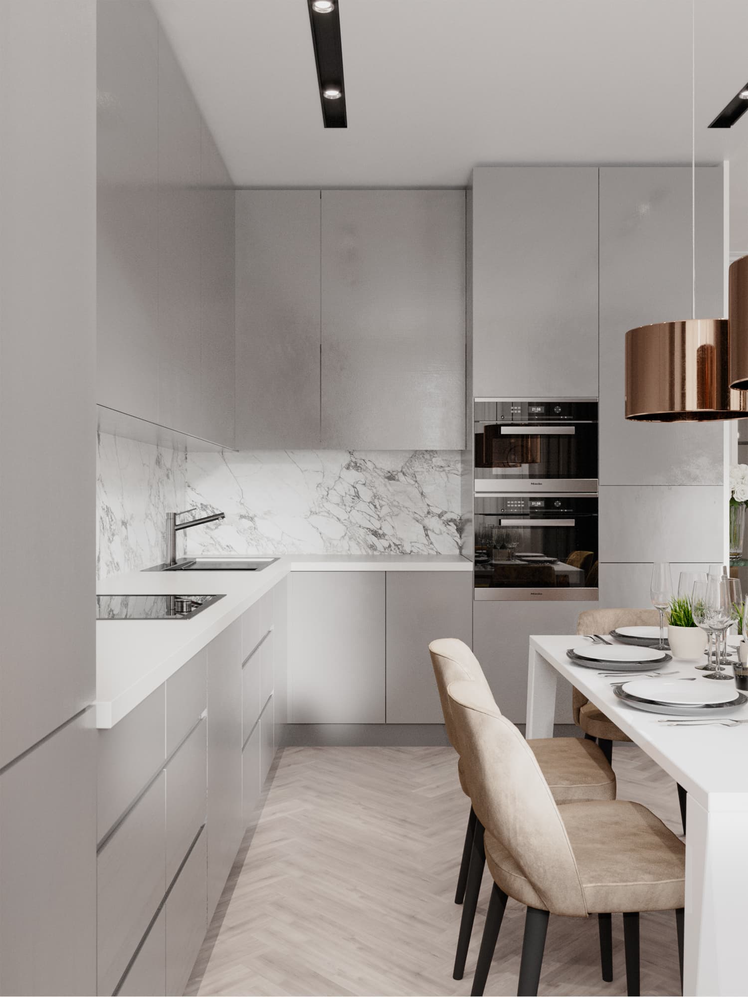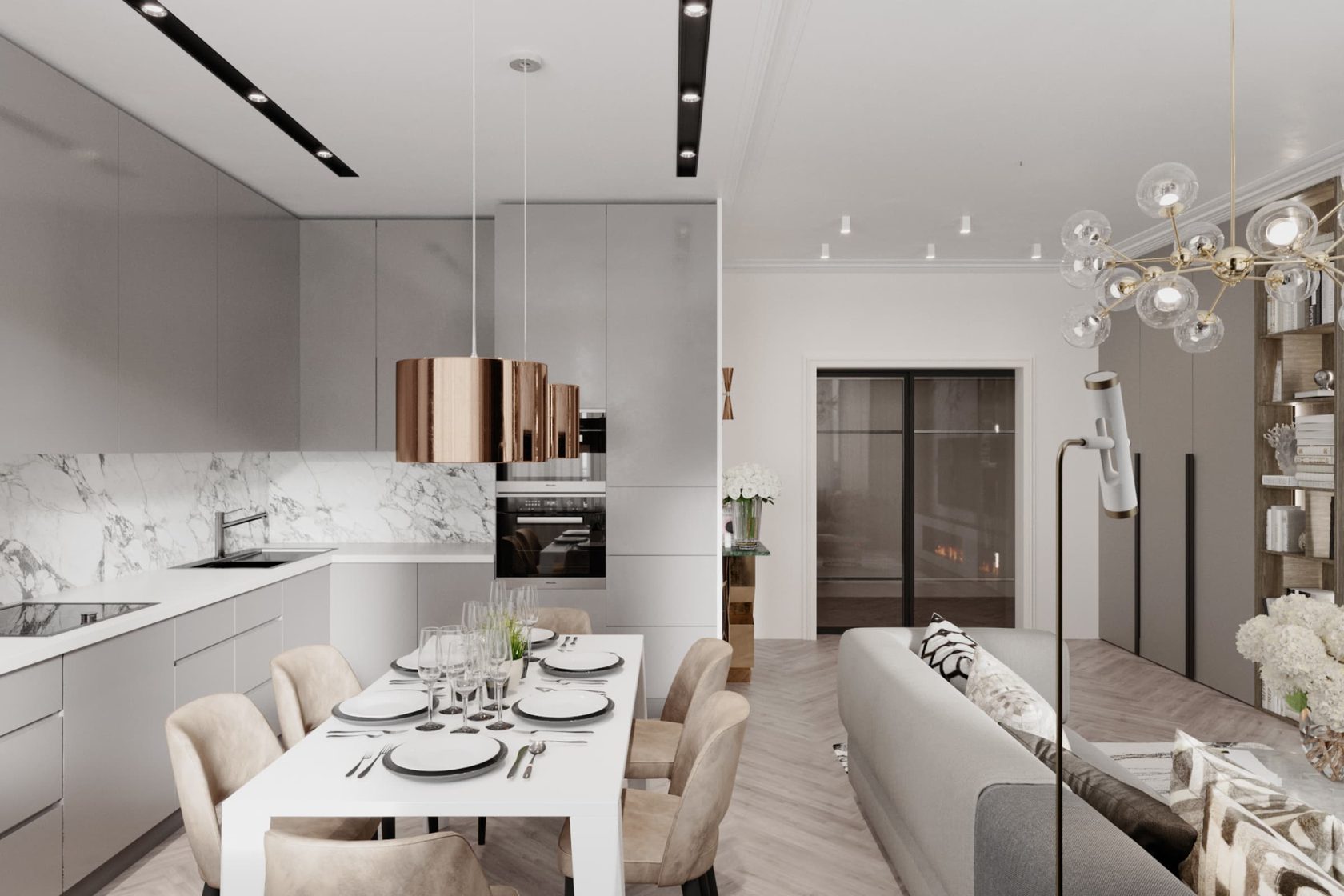 Особенностью данной квартиры были низкие потолки. Именно поэтому за счёт грамотных дизайнерских приёмов нам удалось визуально расширить общее пространство.
