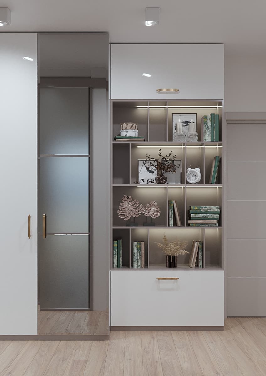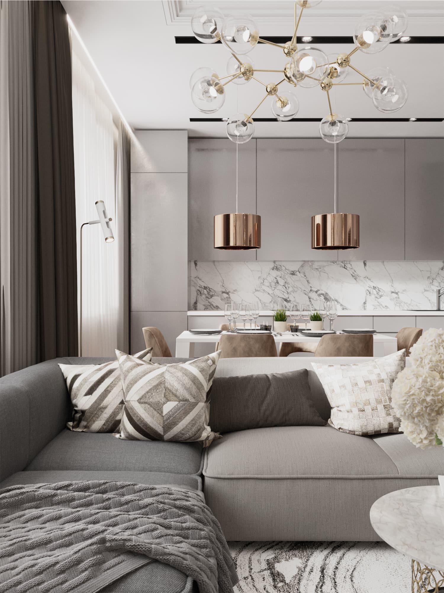 В гостиной с помощью белой цветовой гаммы, зеркальных вставок, оригинального освещения, направленного в том числе на потолок, удалось добавить «воздуха». Блестящие (во всех смыслах) медные светильники, золотистые оттенки в элементах декора, фактурные ткани для мебели и штор, светлые стеллажи с теплой подсветкой — всё это привносит ощущение внутренней теплоты, уюта и комфорта, так необходимое для достаточно сурового северного климата.