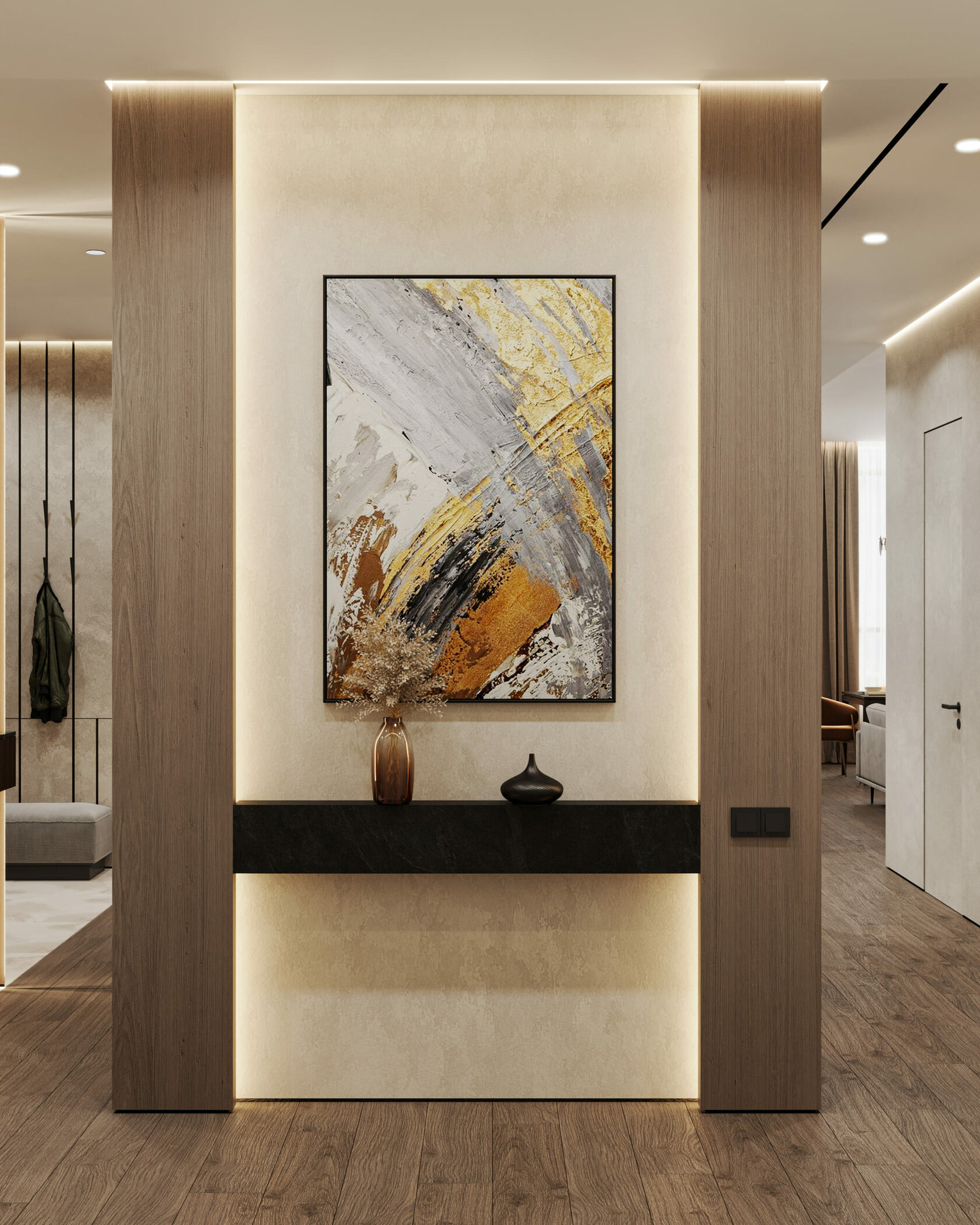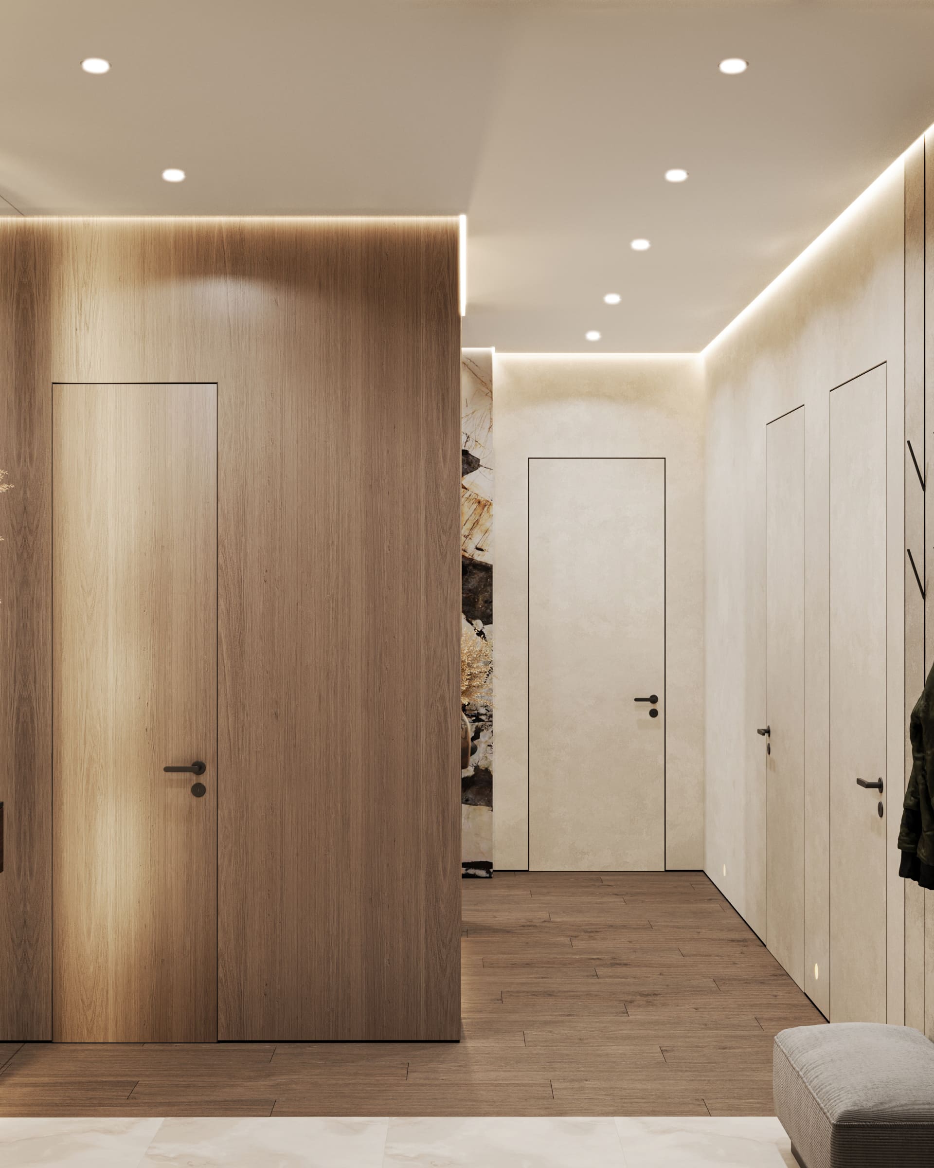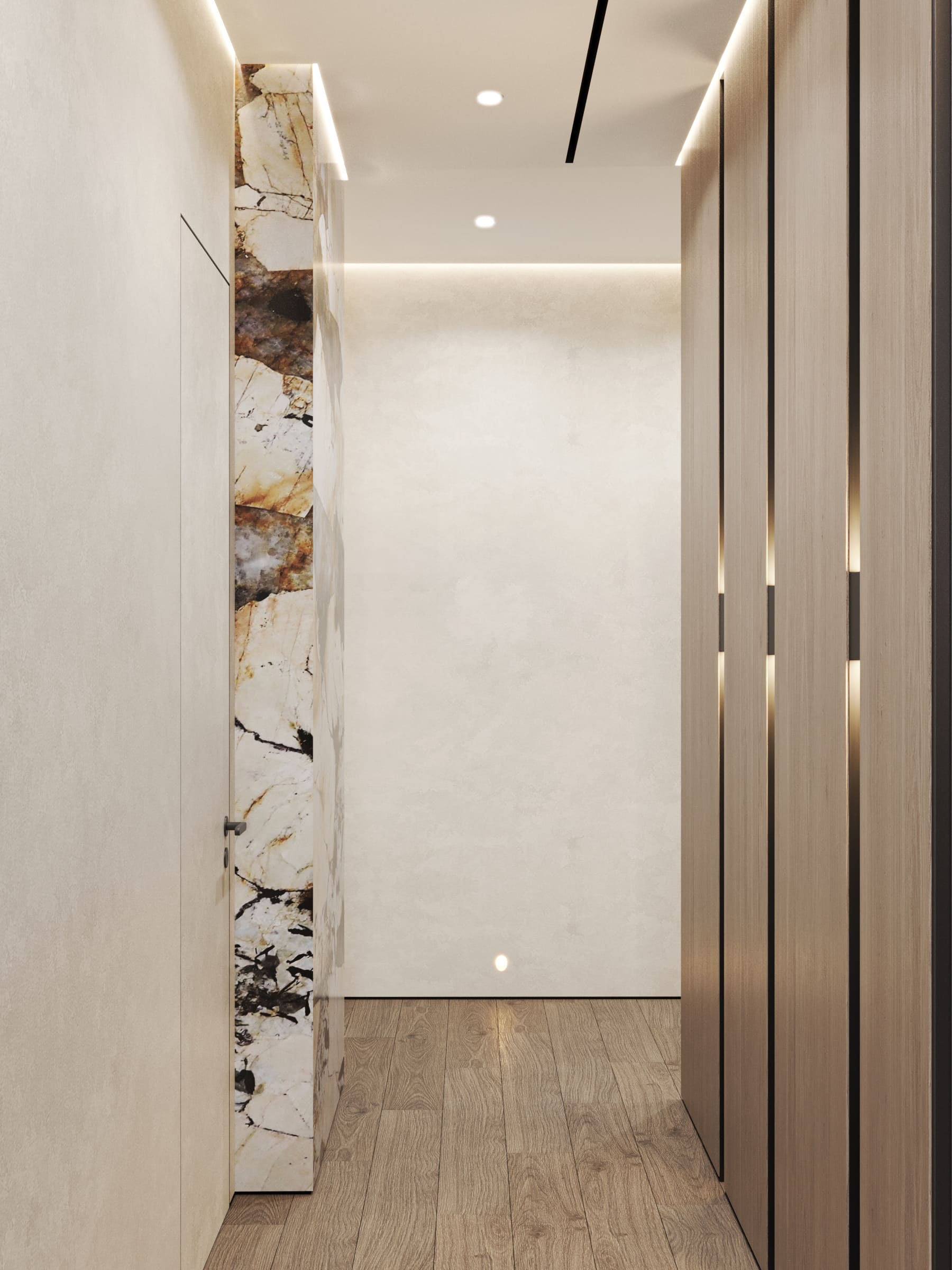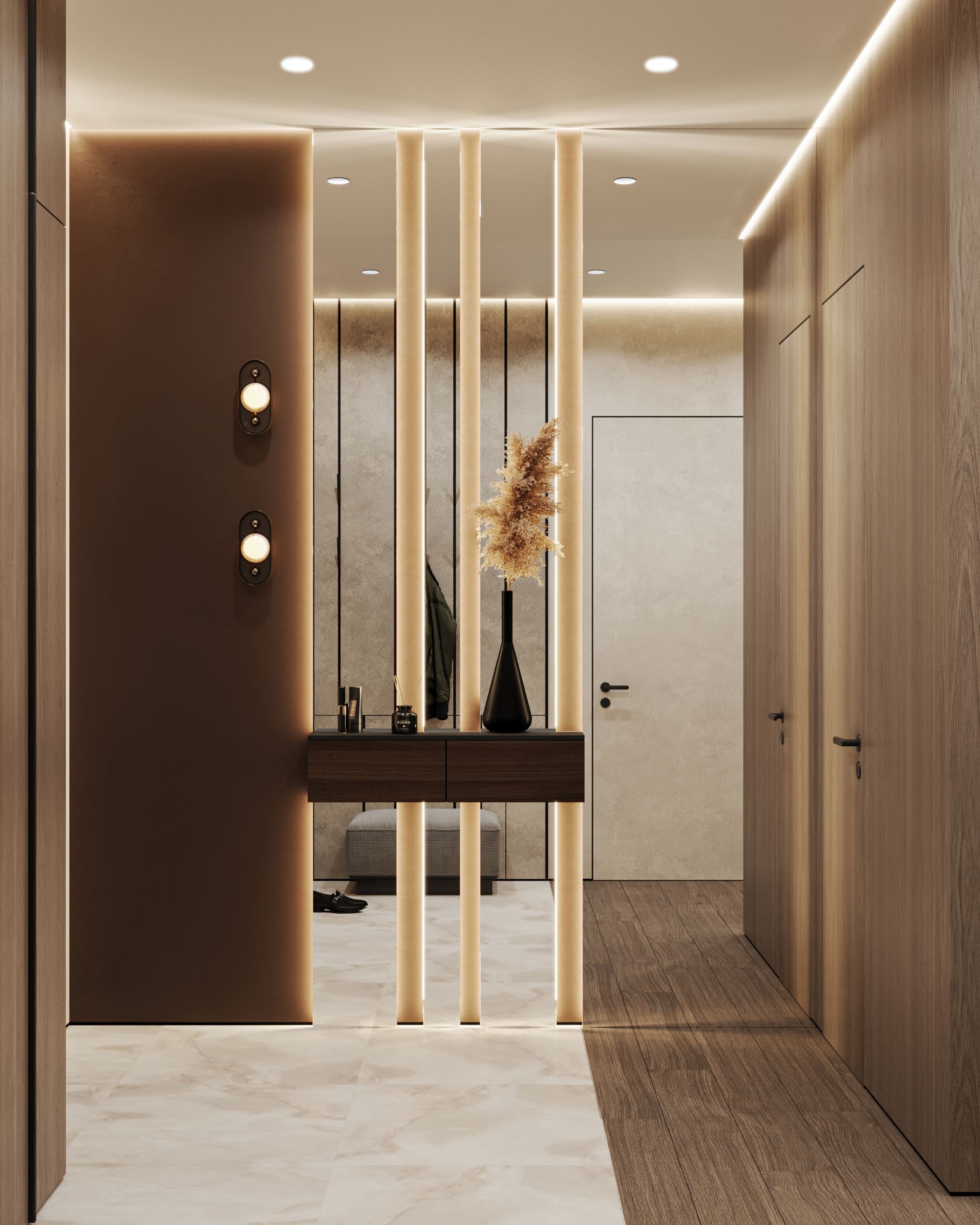В коридоре мы сделали нашу инновацию с нишами для архитектурных светильников бра. Комбинация материалов и рельефов придает особый шарм коридору и визуально присоединяет к смежным большим пространствам.
