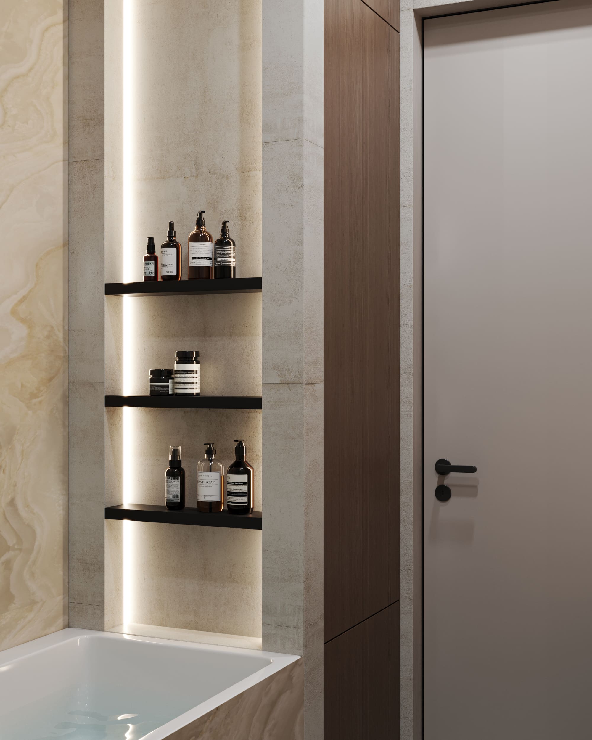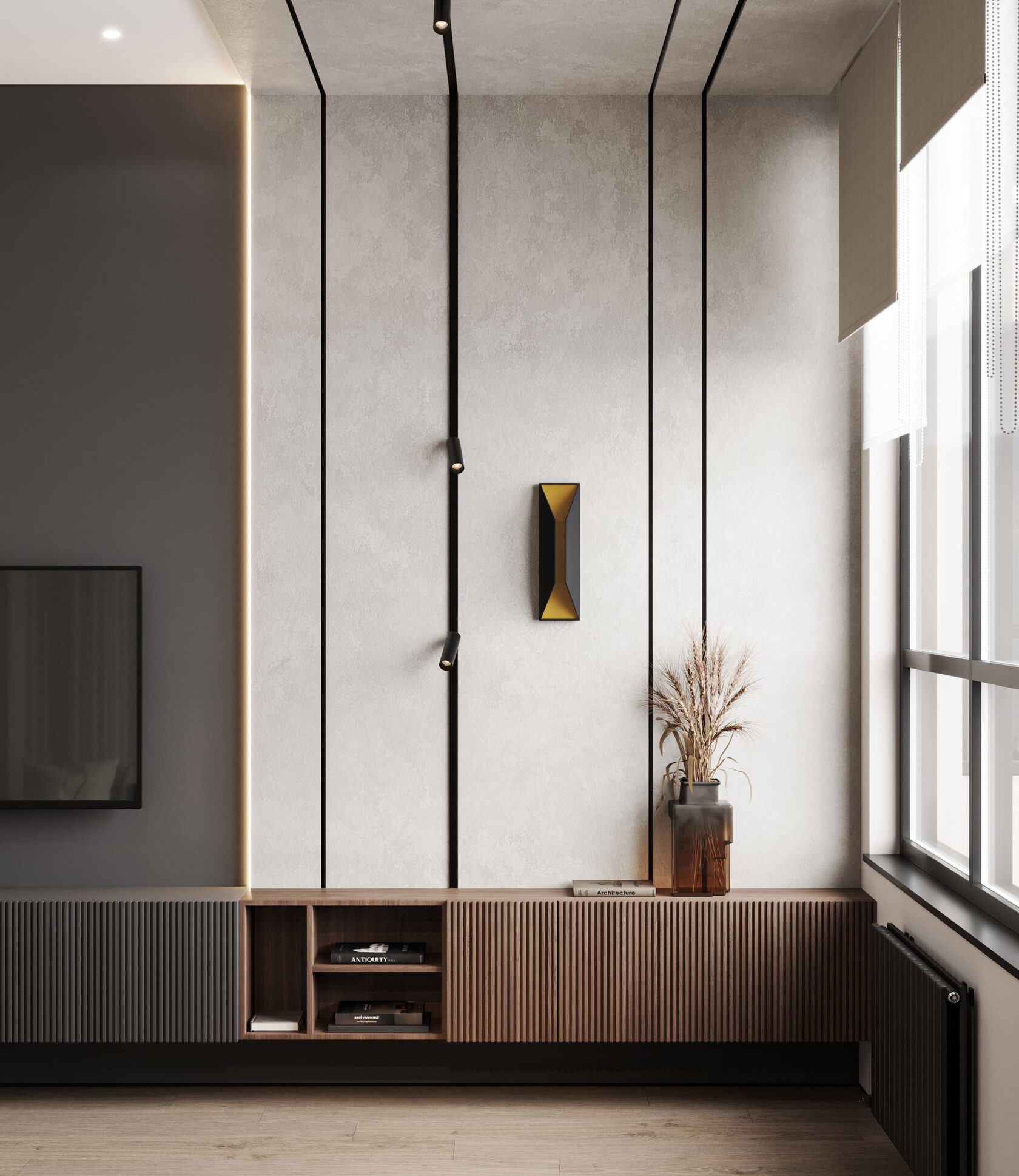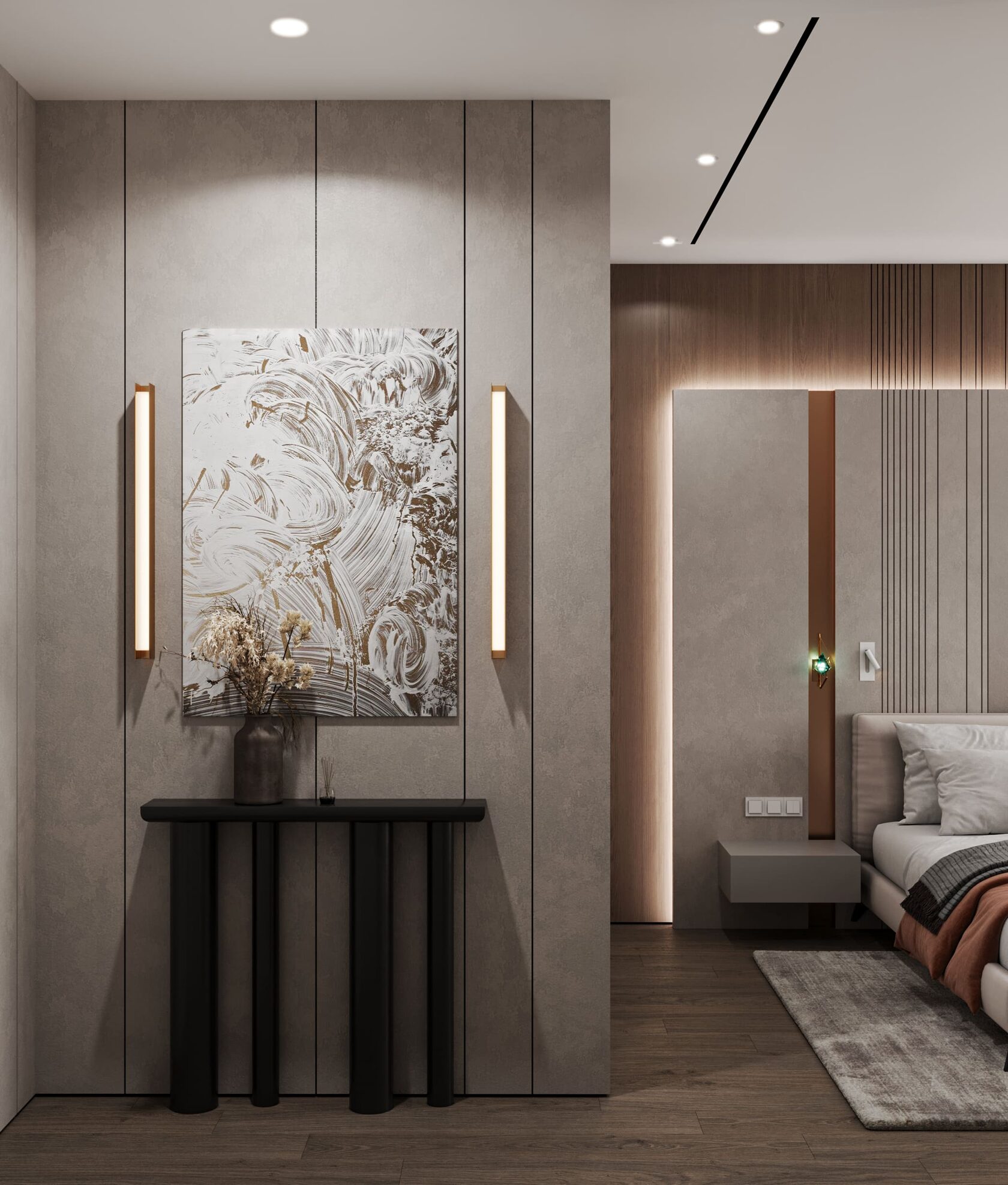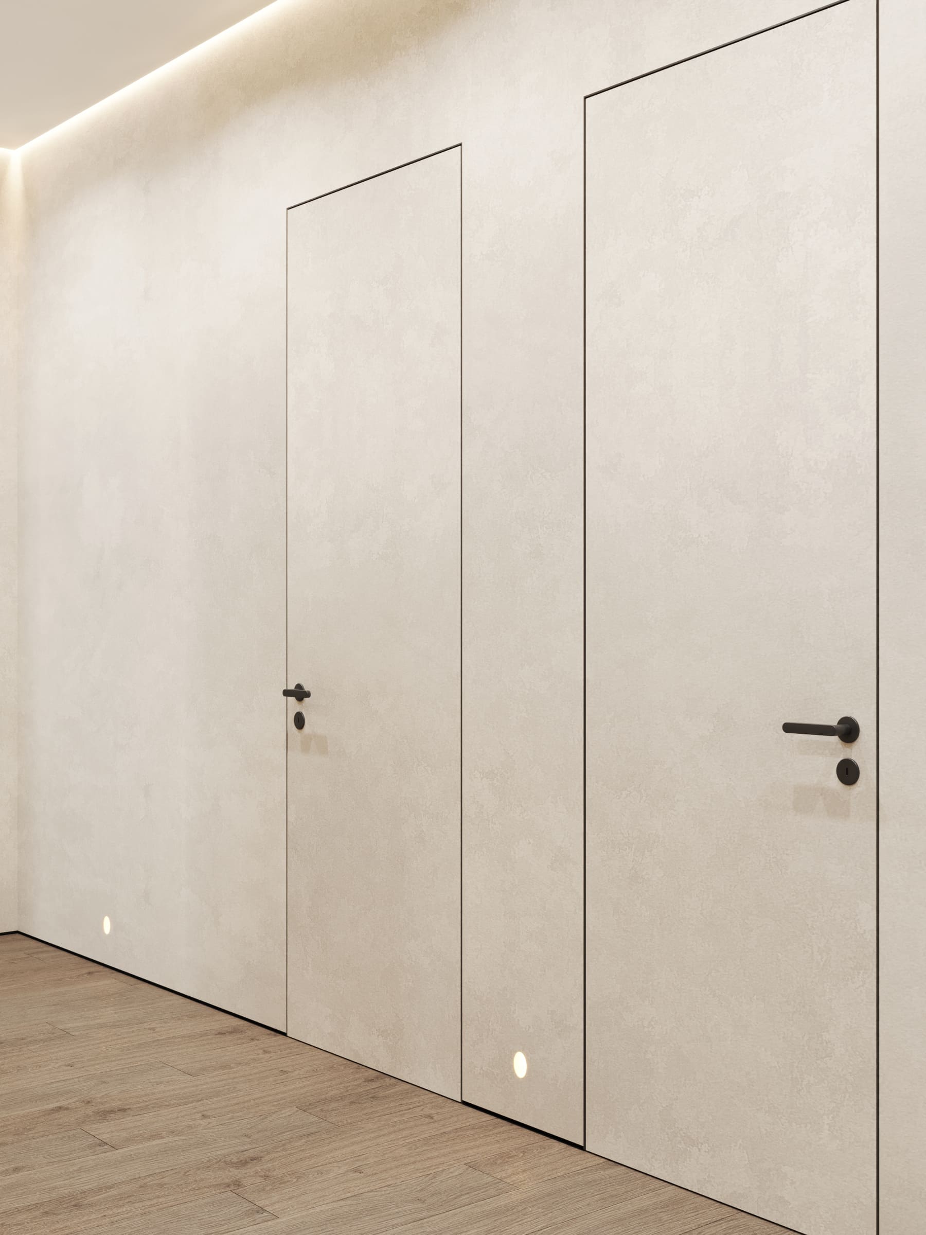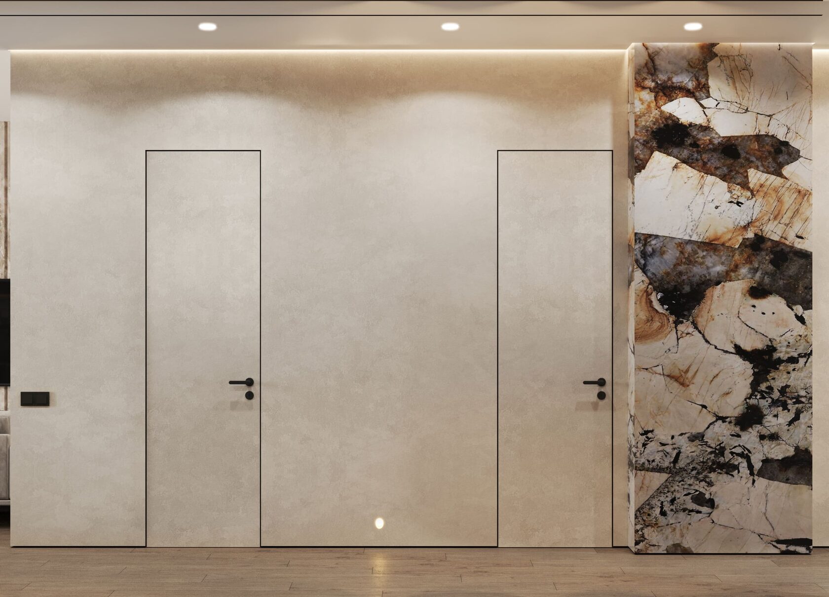 В коридоре мы сделали нашу инновацию с нишами для архитектурных светильников бра. Комбинация материалов и рельефов придает особый шарм коридору и визуально присоединяет к смежным большим пространствам.