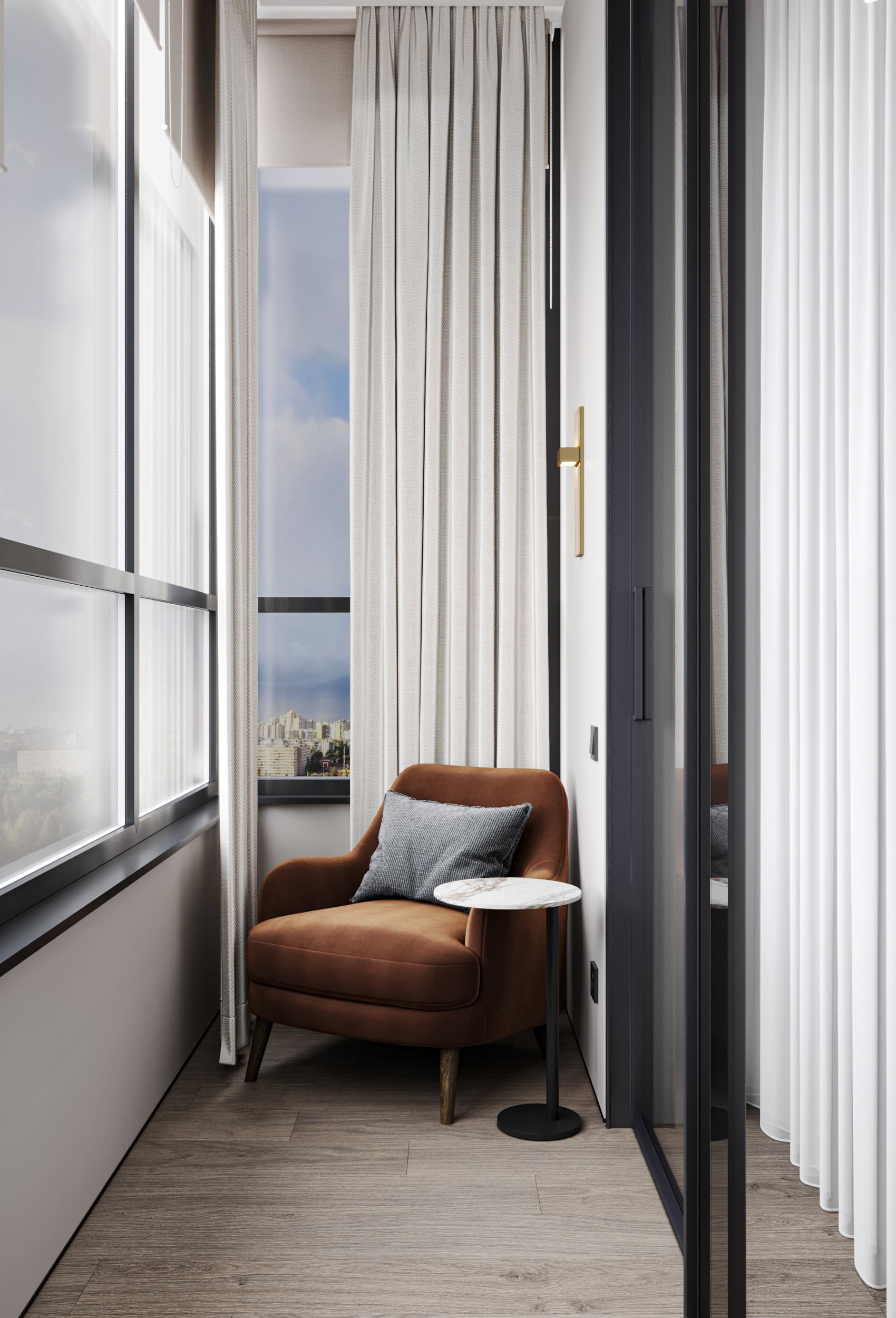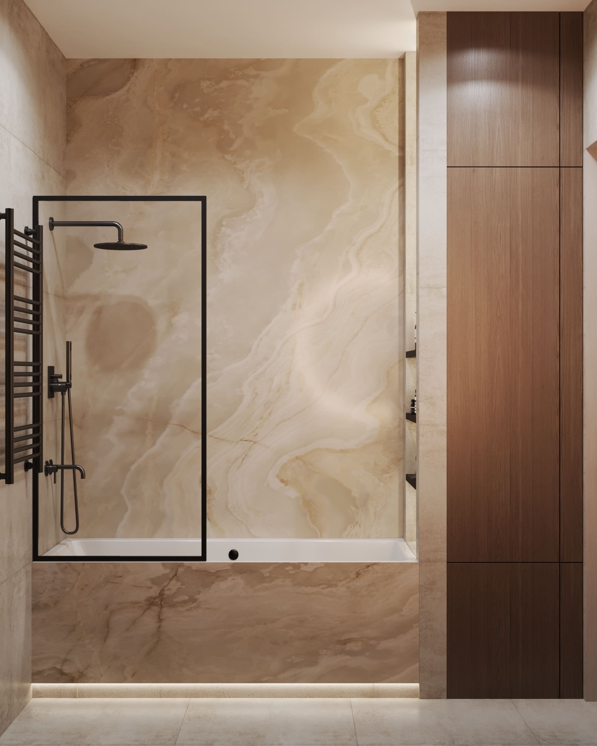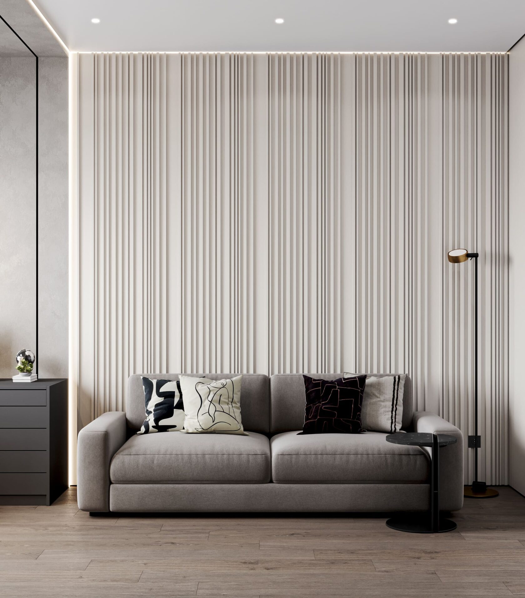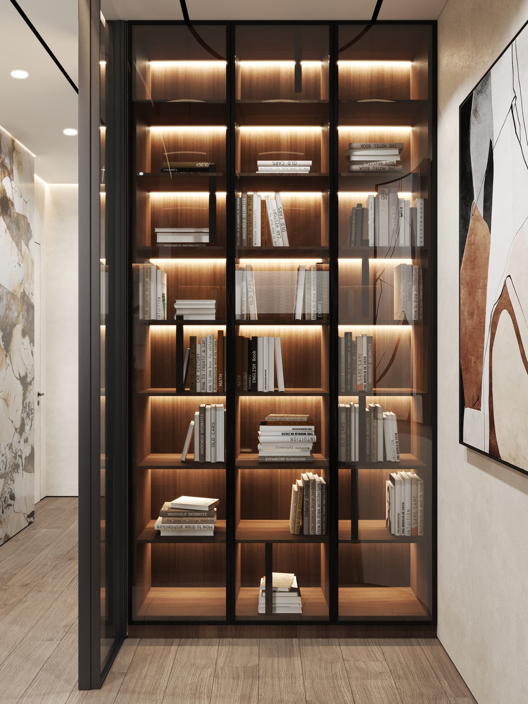 В коридоре мы сделали нашу инновацию с нишами для архитектурных светильников бра. Комбинация материалов и рельефов придает особый шарм коридору и визуально присоединяет к смежным большим пространствам.