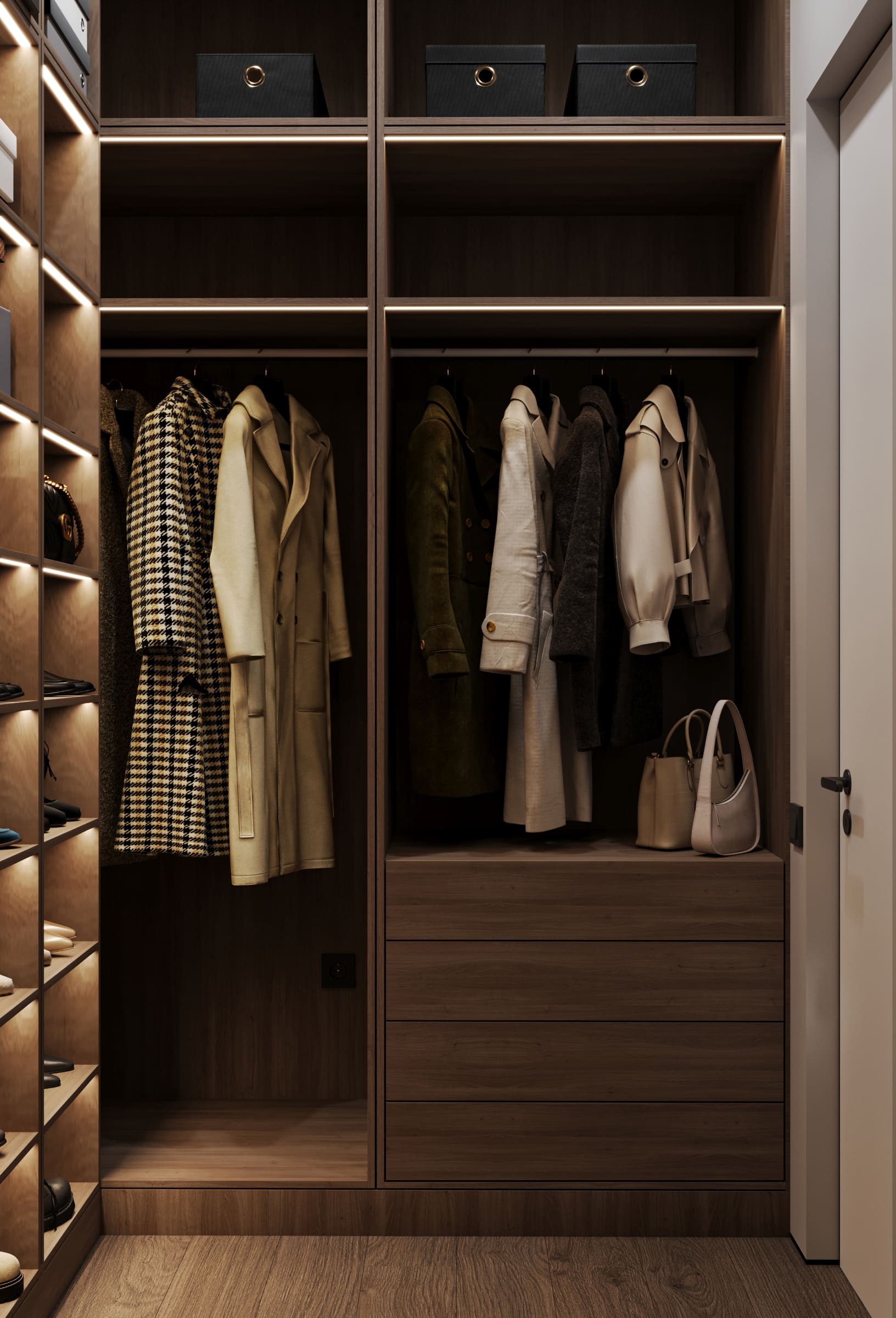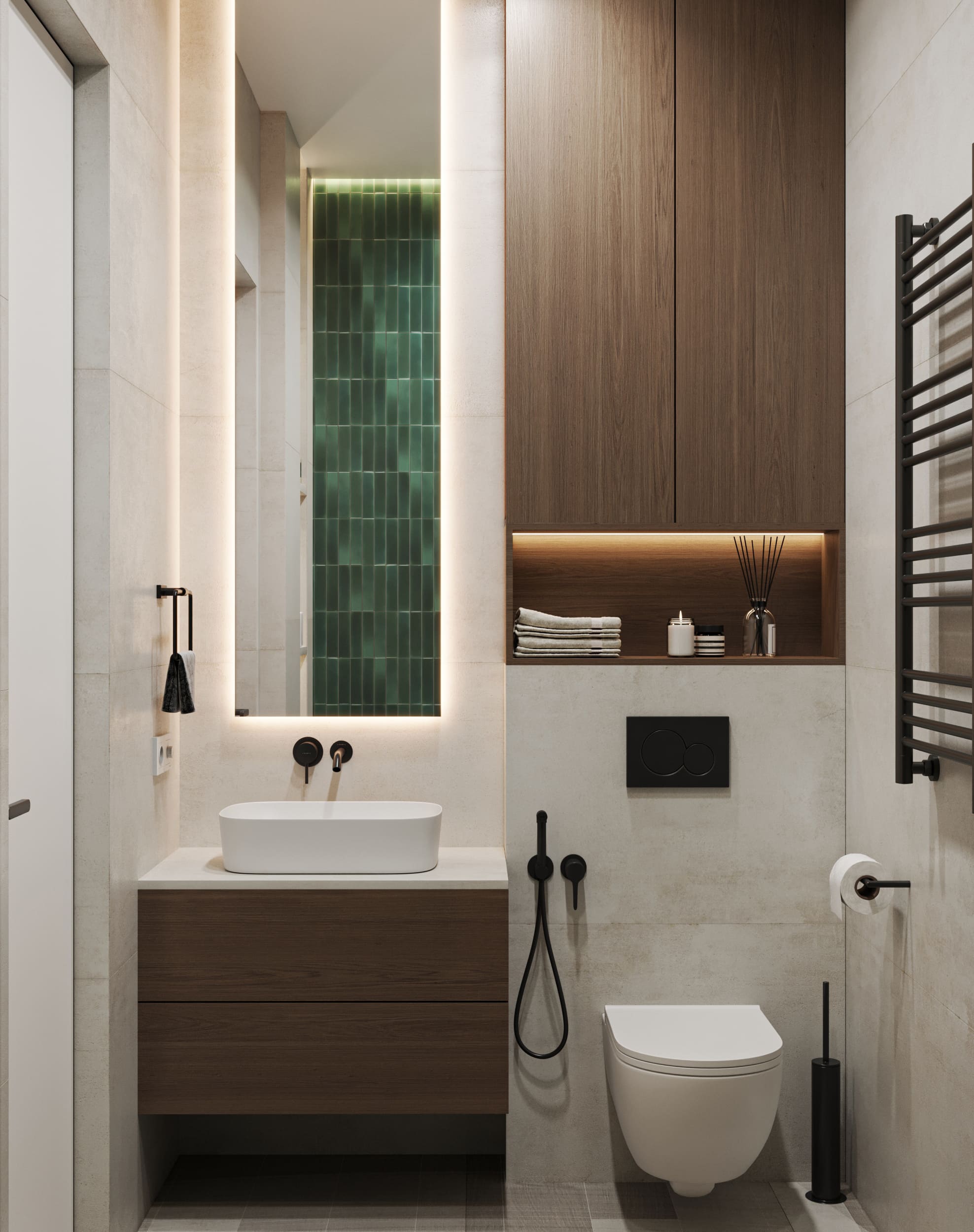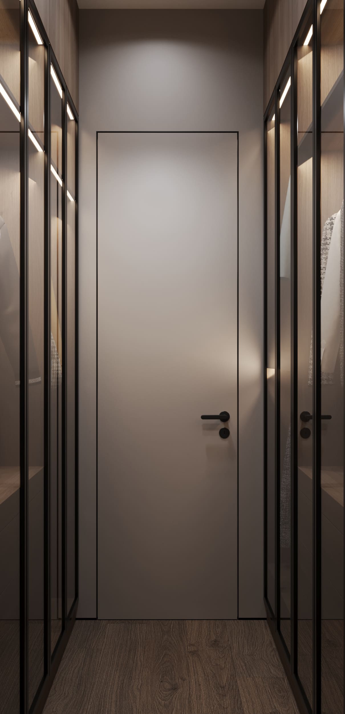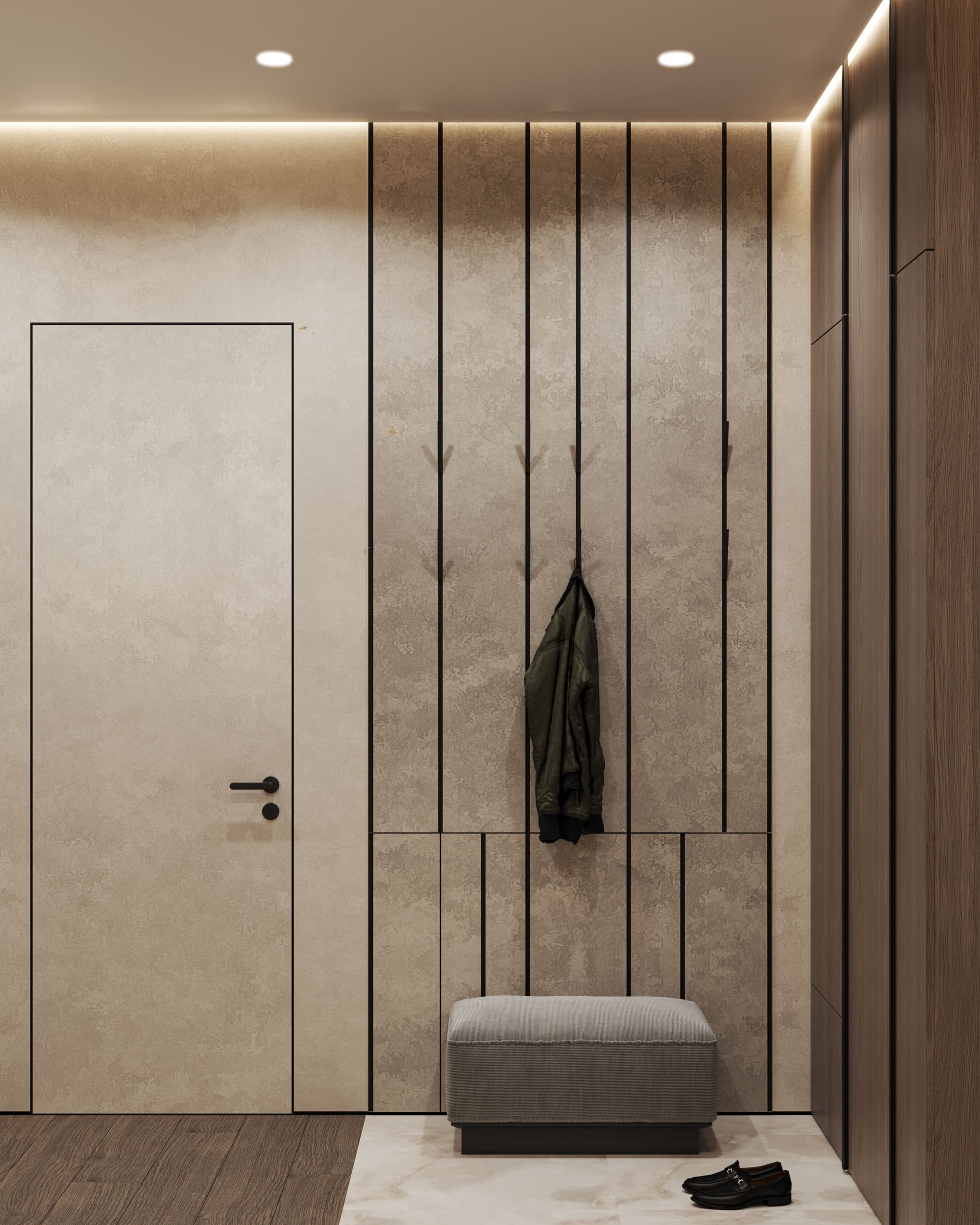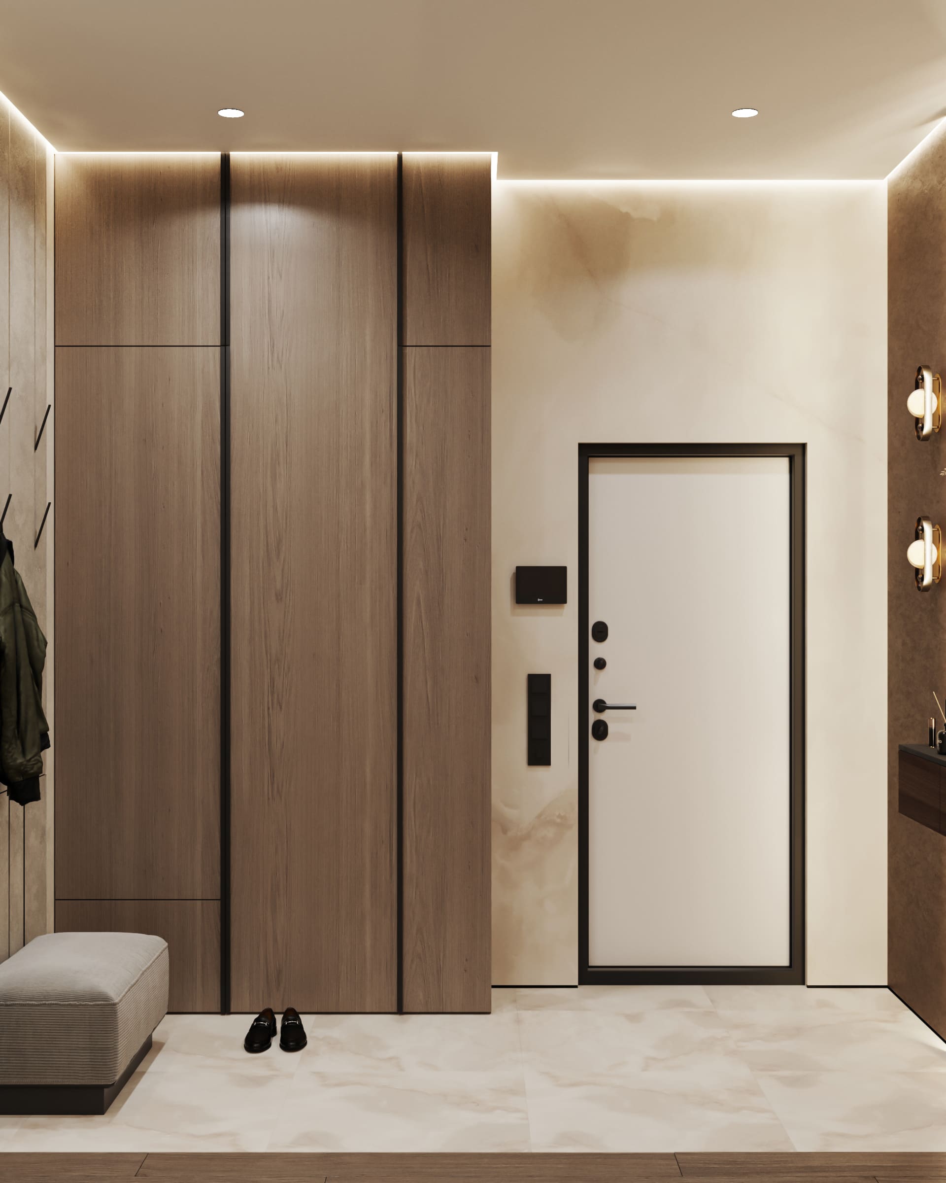 Мы модернизировали планировку от застройщика с узкой прихожей, переместив санузел. Благодаря этому в прихожей появилась вместительная гардеробная, а трубы коммуникаций мы закрыли встроенным шкафом. Простое в исполнении и очень эффектное решение в прихожей с подсветкой за зеркалами еще более значительно расширило это пространство.