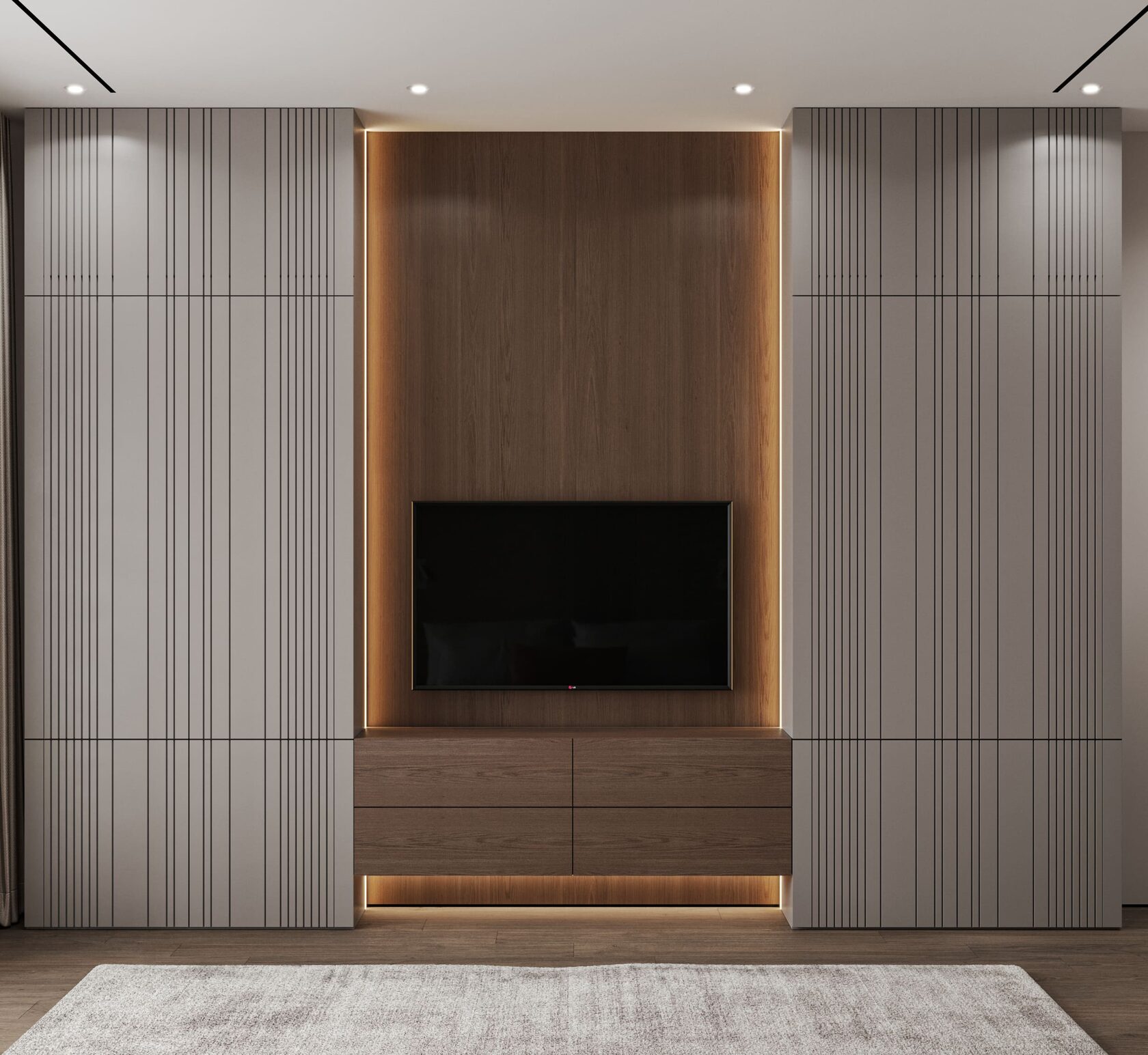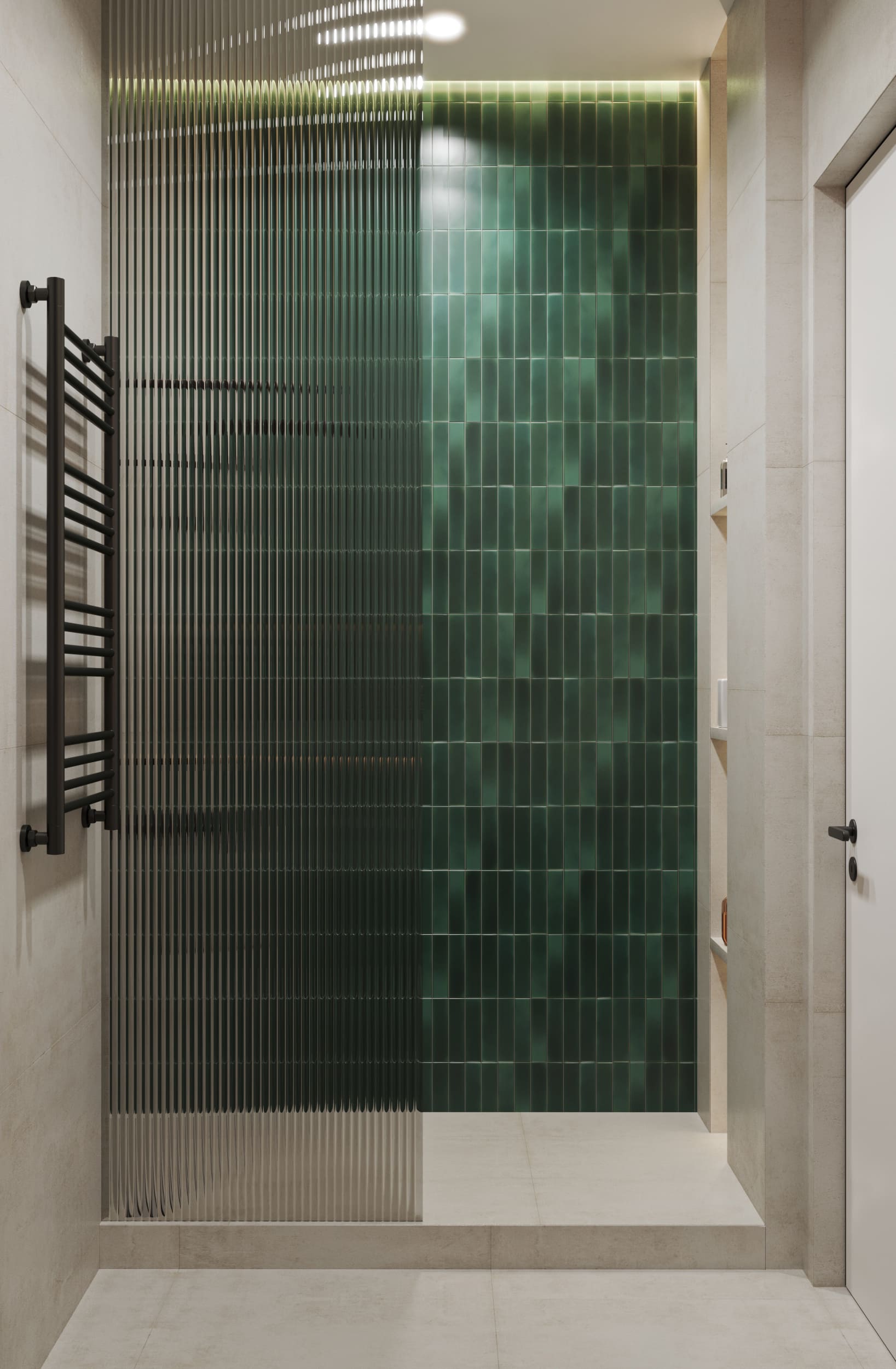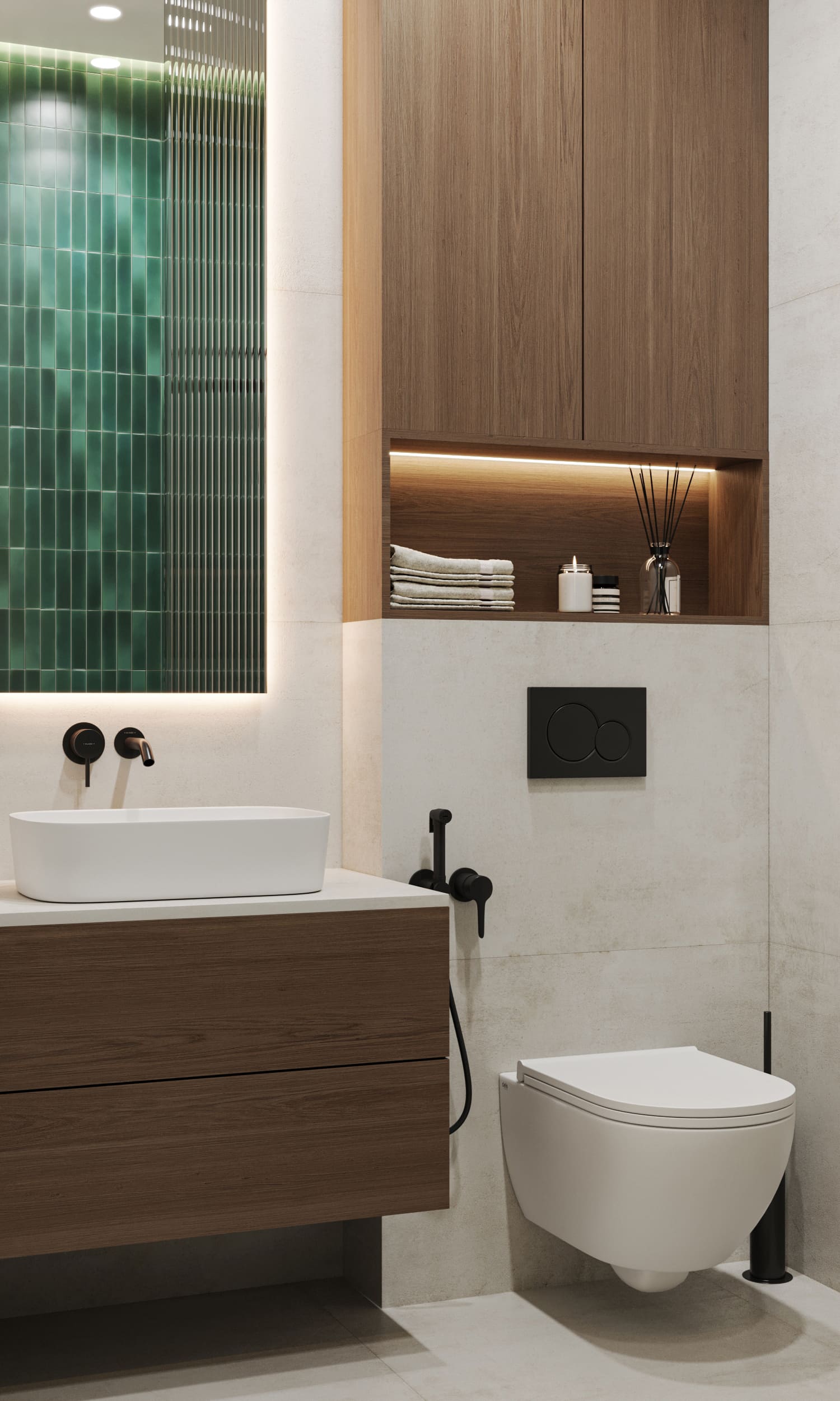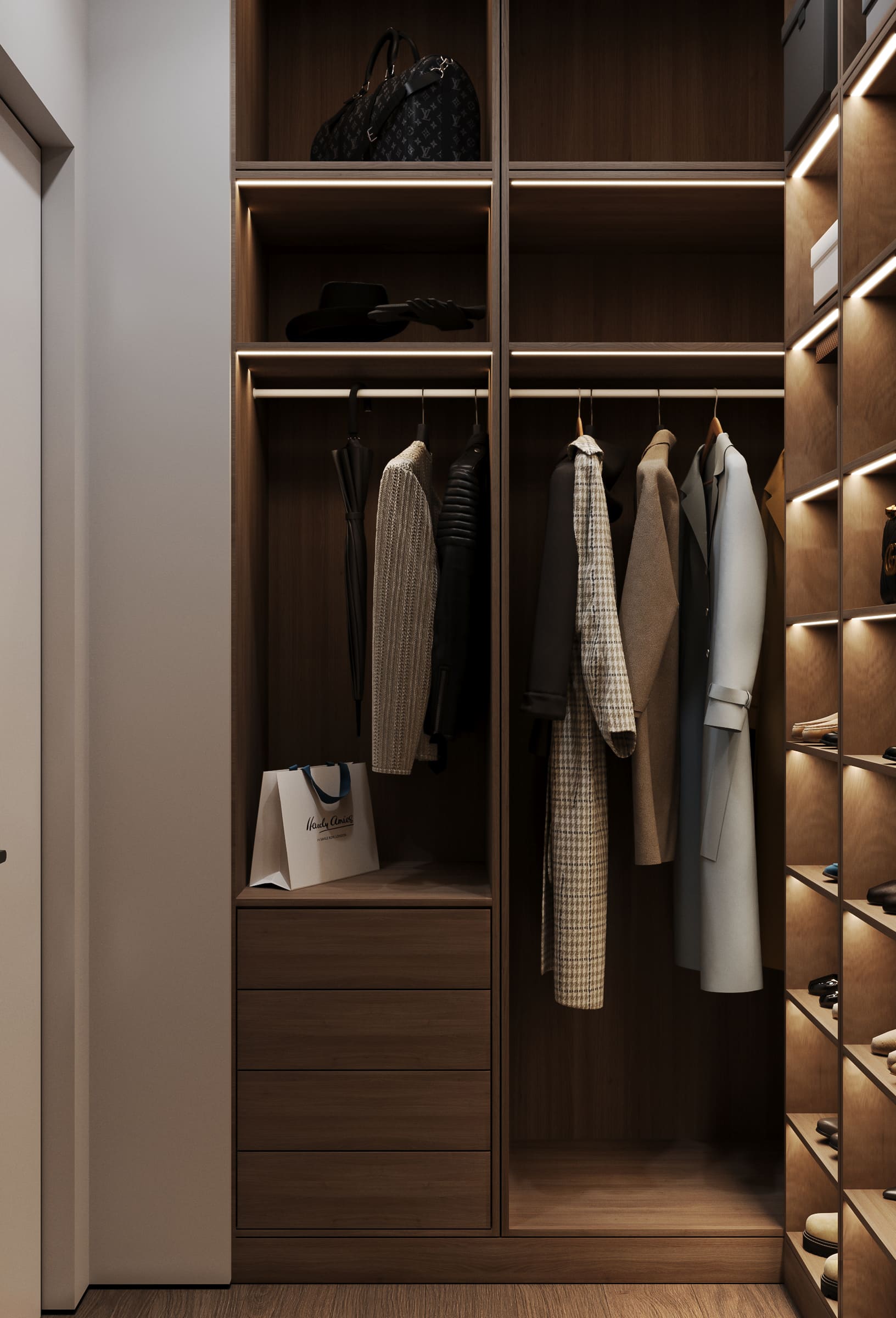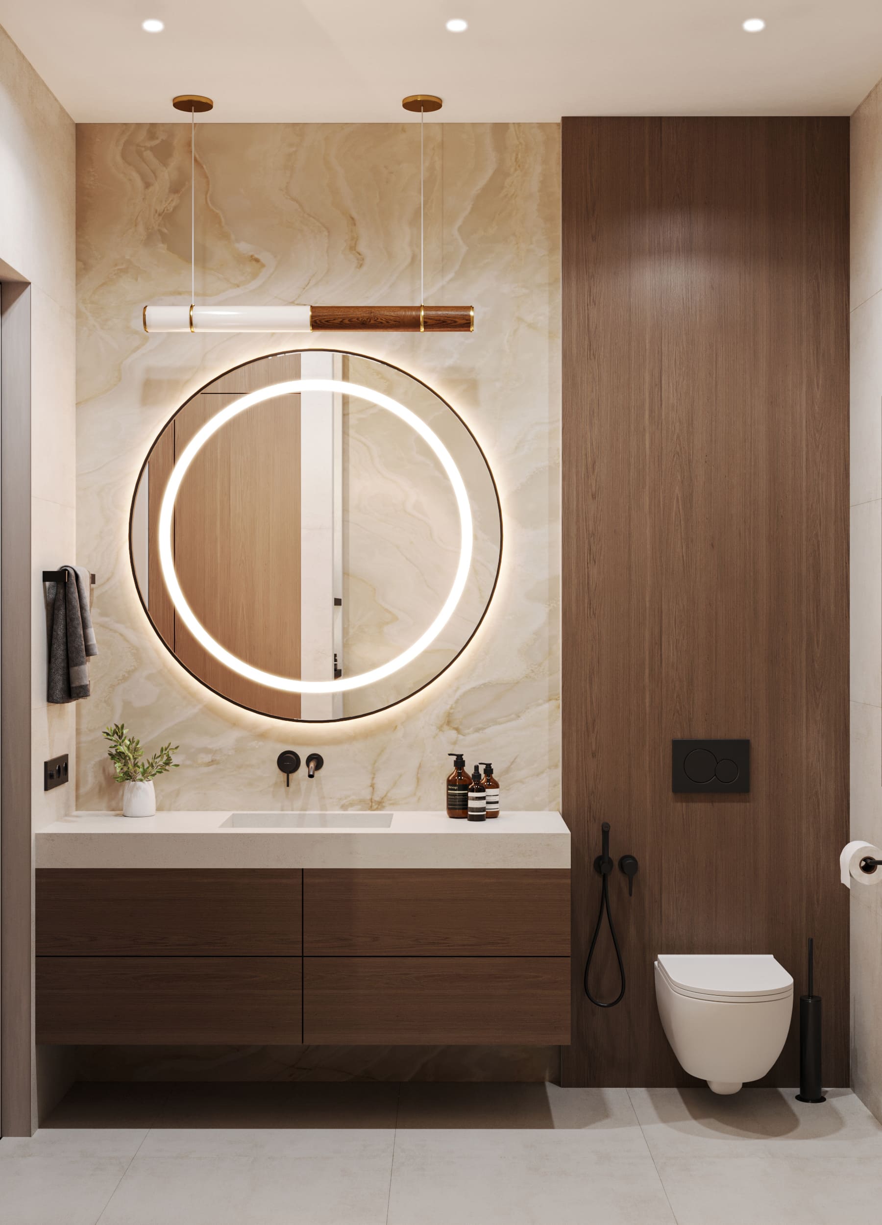 Мы модернизировали планировку от застройщика с узкой прихожей, переместив санузел. Благодаря этому в прихожей появилась вместительная гардеробная, а трубы коммуникаций мы закрыли встроенным шкафом. Простое в исполнении и очень эффектное решение в прихожей с подсветкой за зеркалами еще более значительно расширило это пространство.