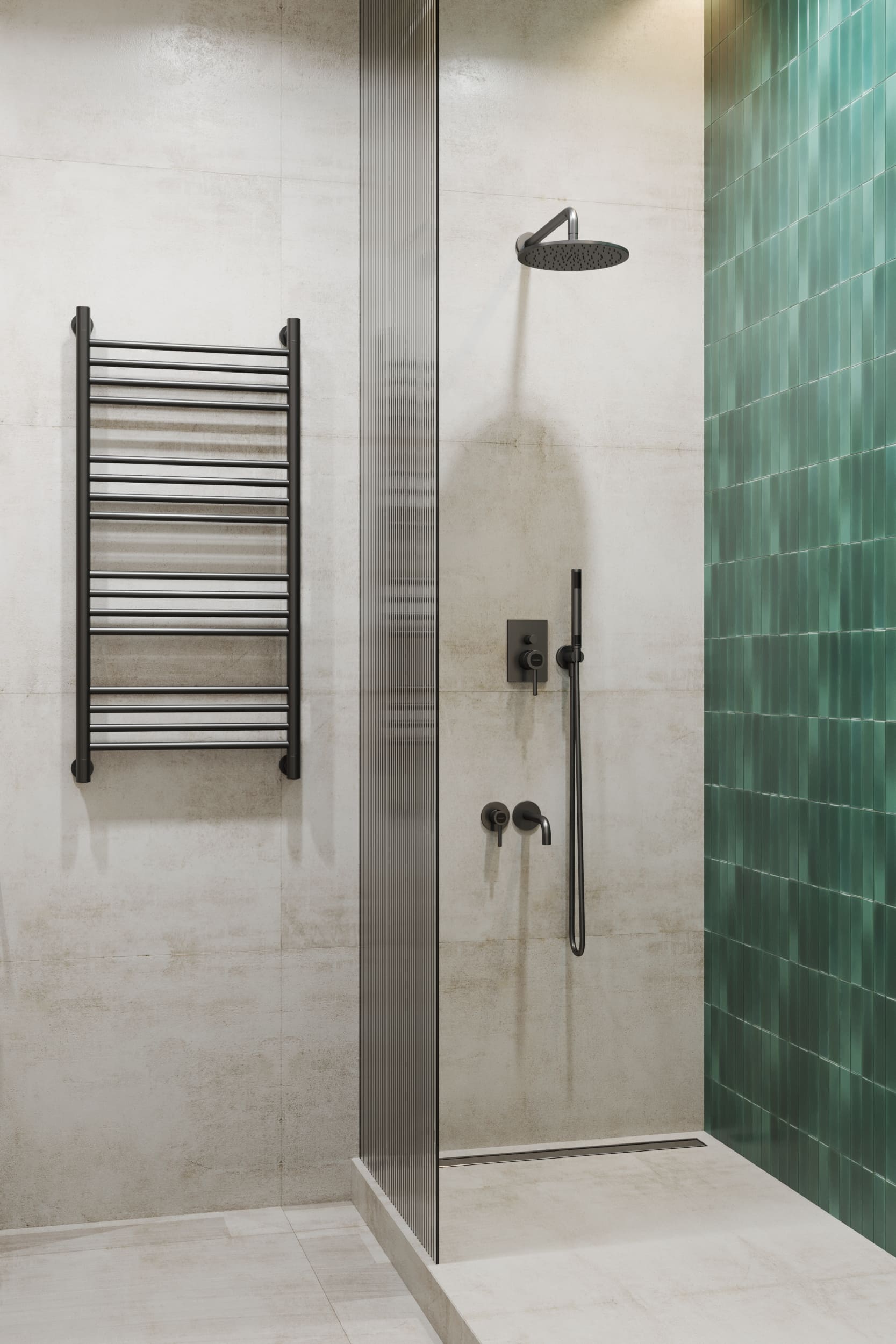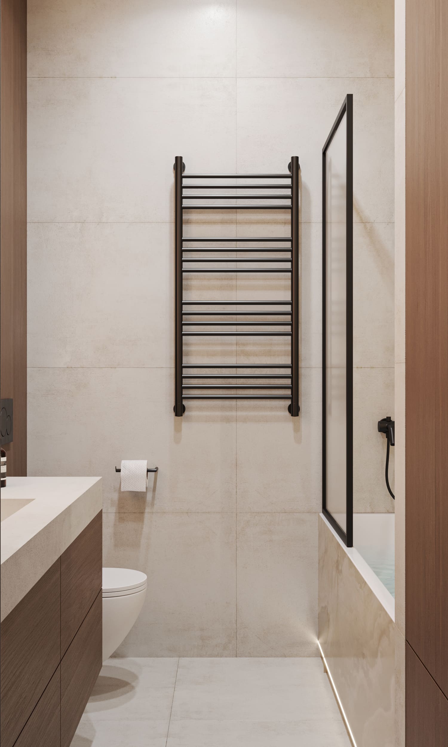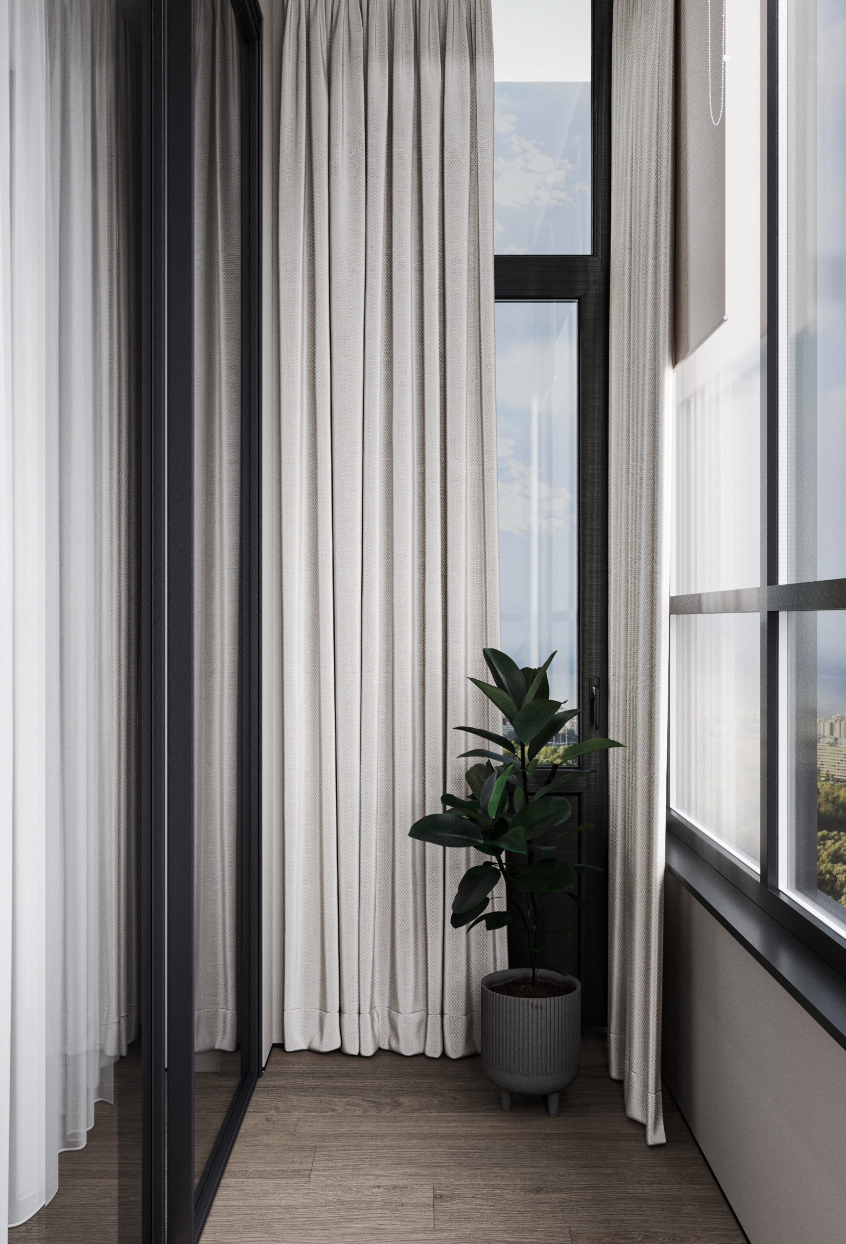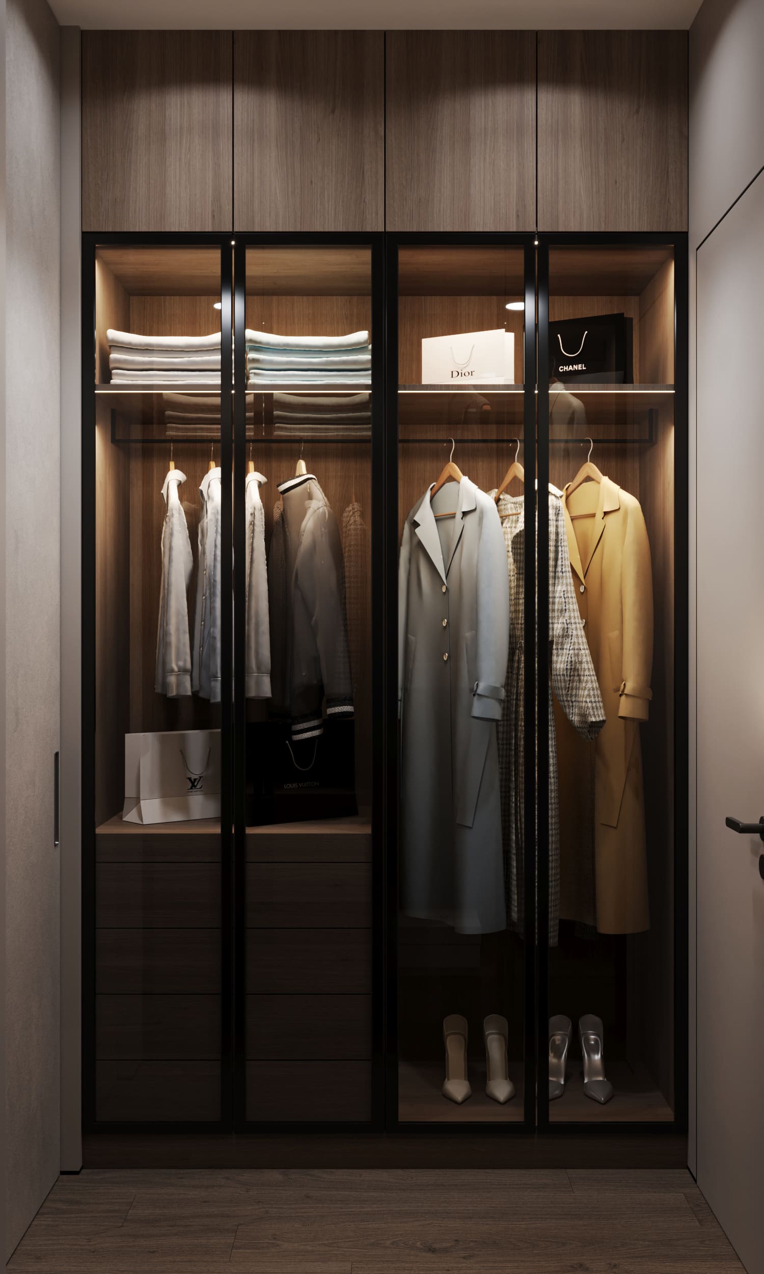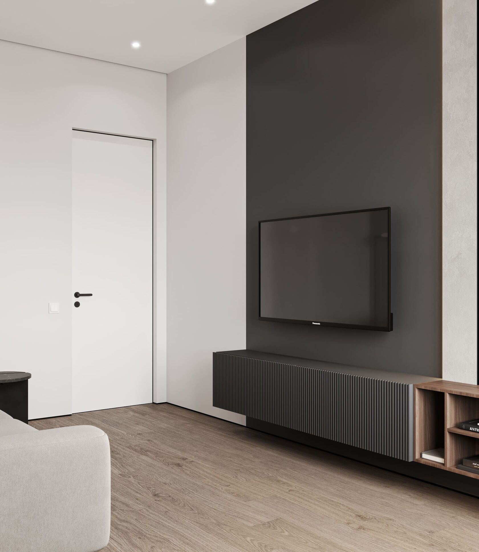 Мы модернизировали планировку от застройщика с узкой прихожей, переместив санузел. Благодаря этому в прихожей появилась вместительная гардеробная, а трубы коммуникаций мы закрыли встроенным шкафом. Простое в исполнении и очень эффектное решение в прихожей с подсветкой за зеркалами еще более значительно расширило это пространство.