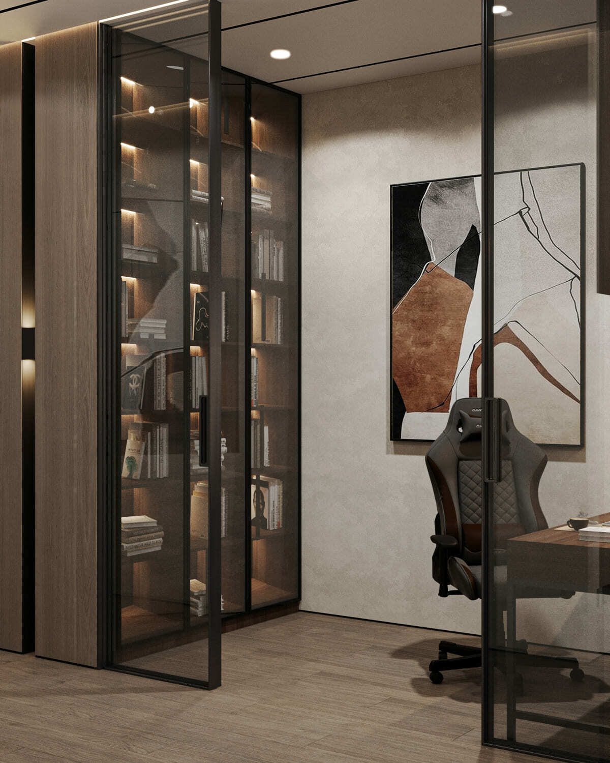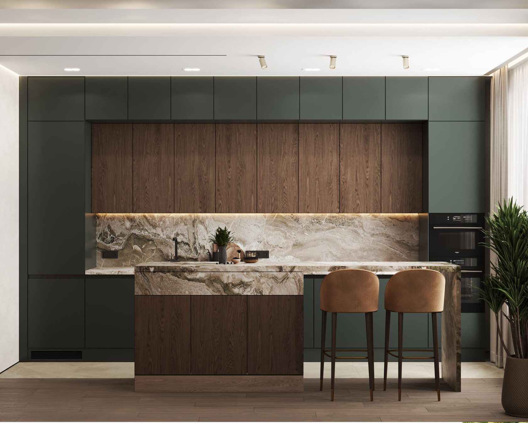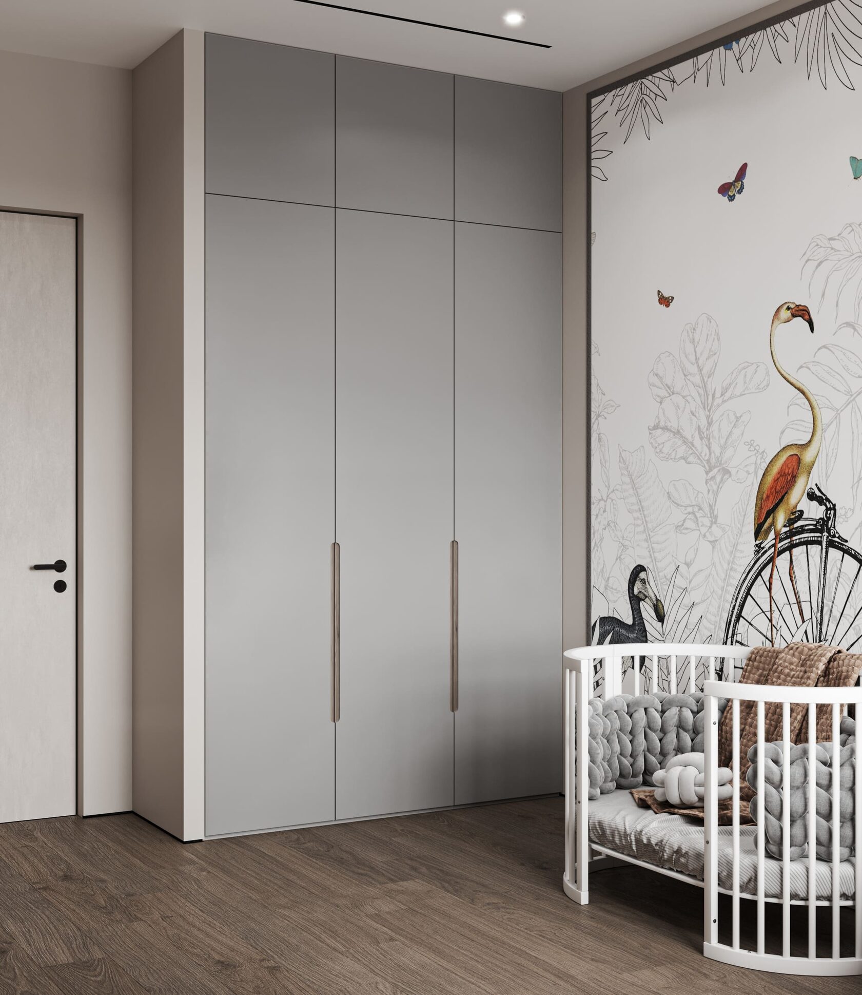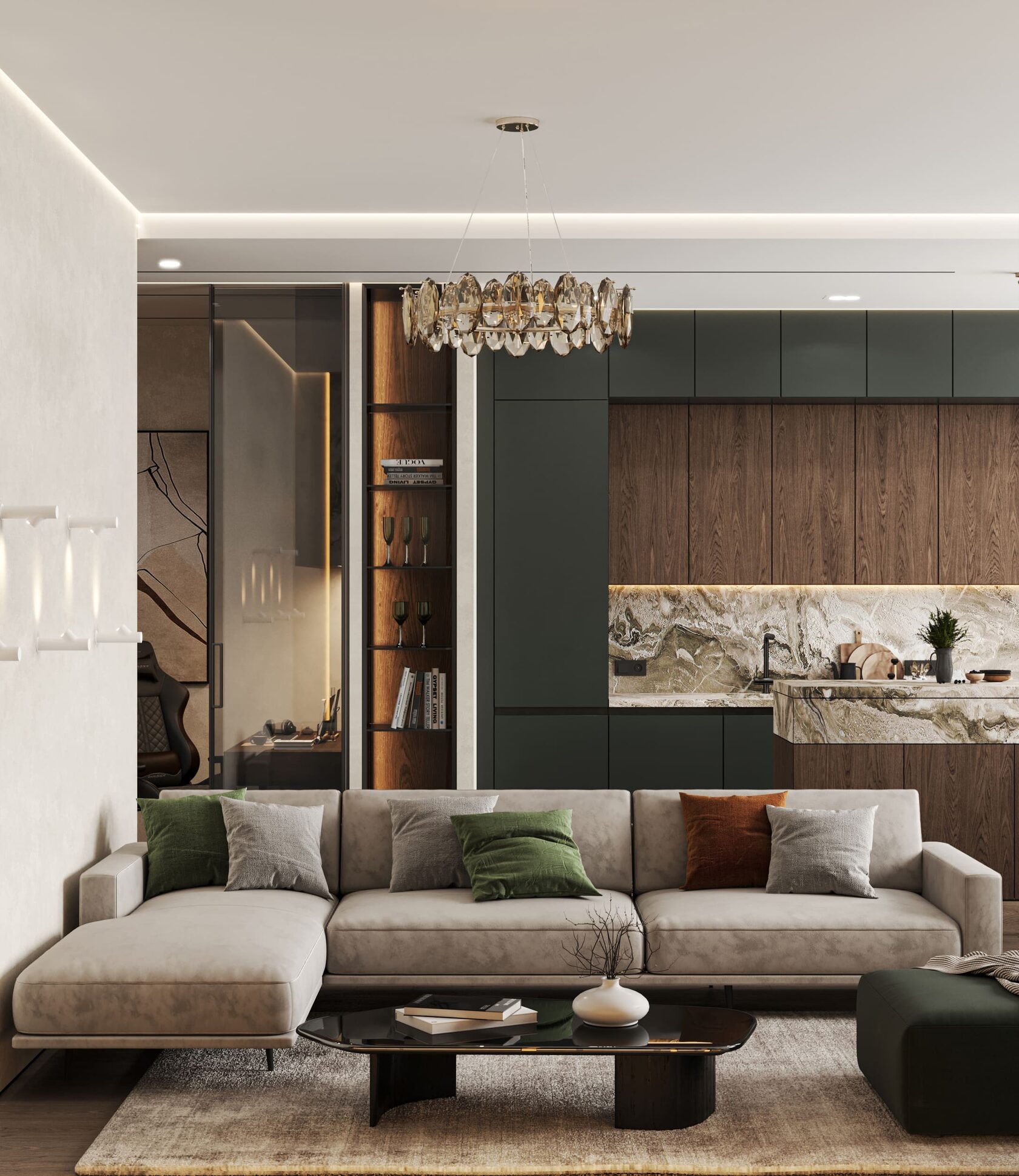 Проект для молодой семьи, он — IT-специалист, она — финансовый аналитик. В квартире есть 2 кабинета, спальня, детская, 3 гардеробные, прачечная, ванная комната, санузел и большая кухня-гостиная.