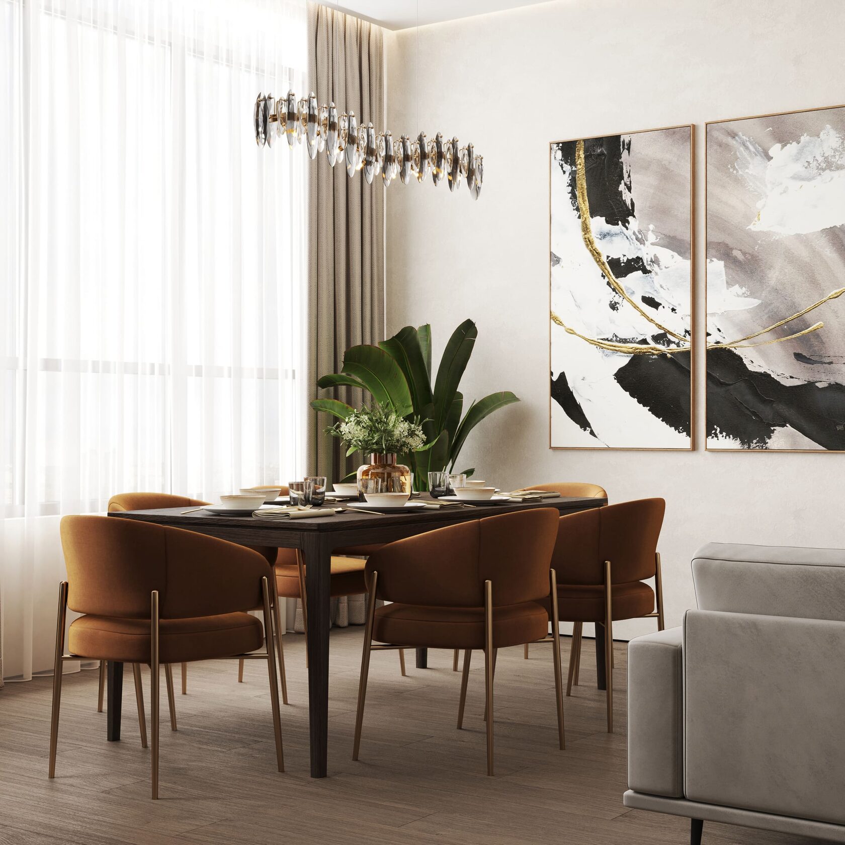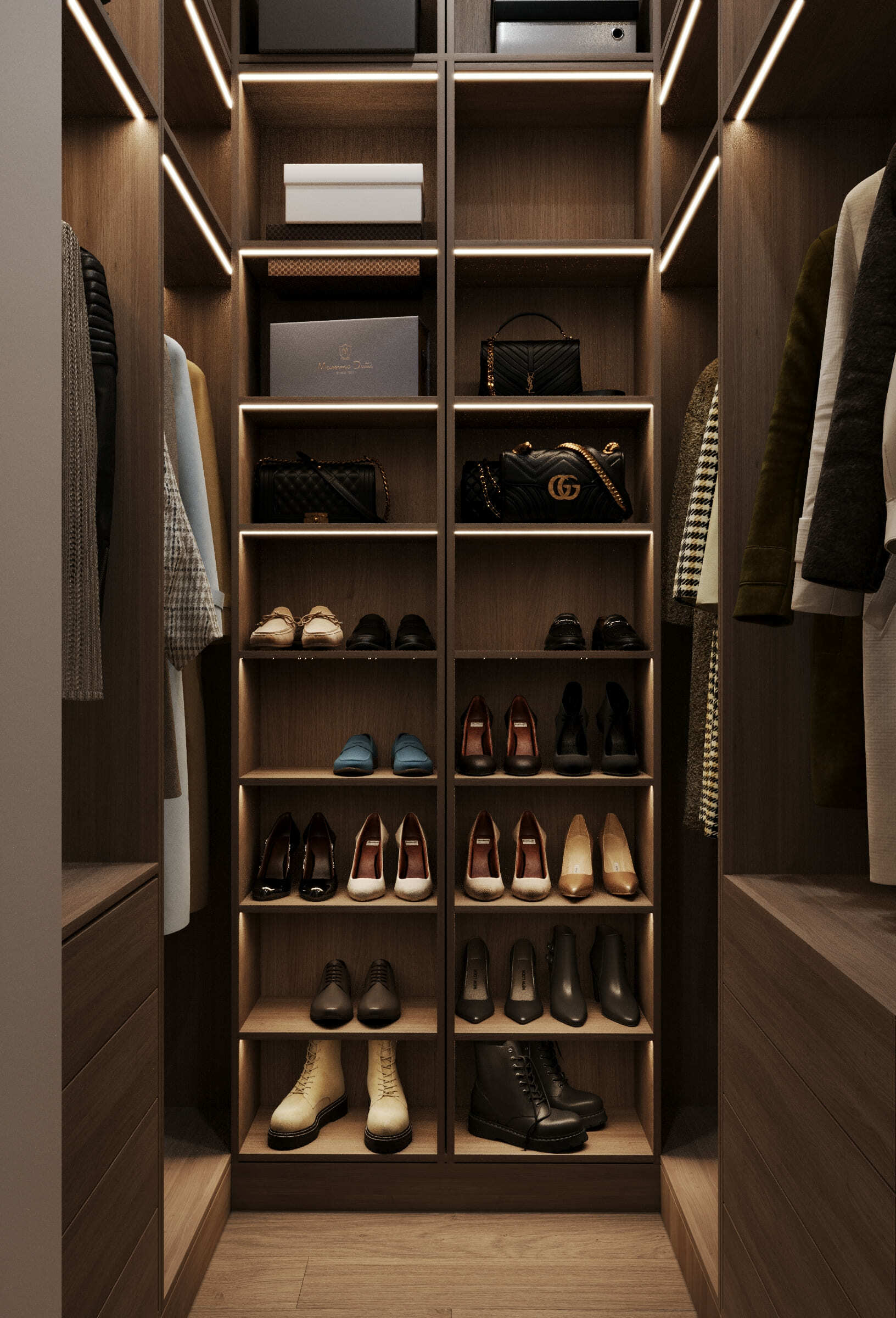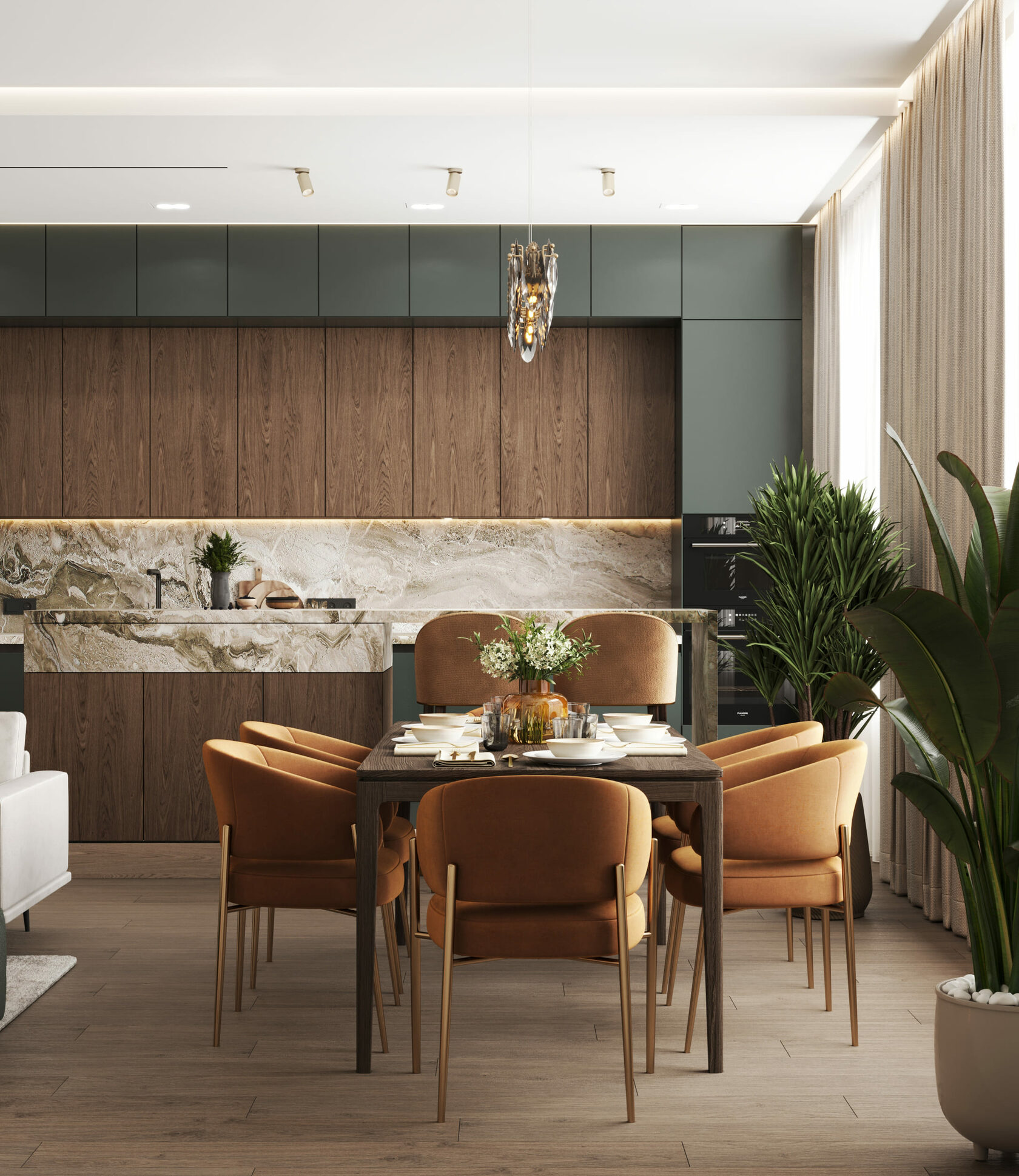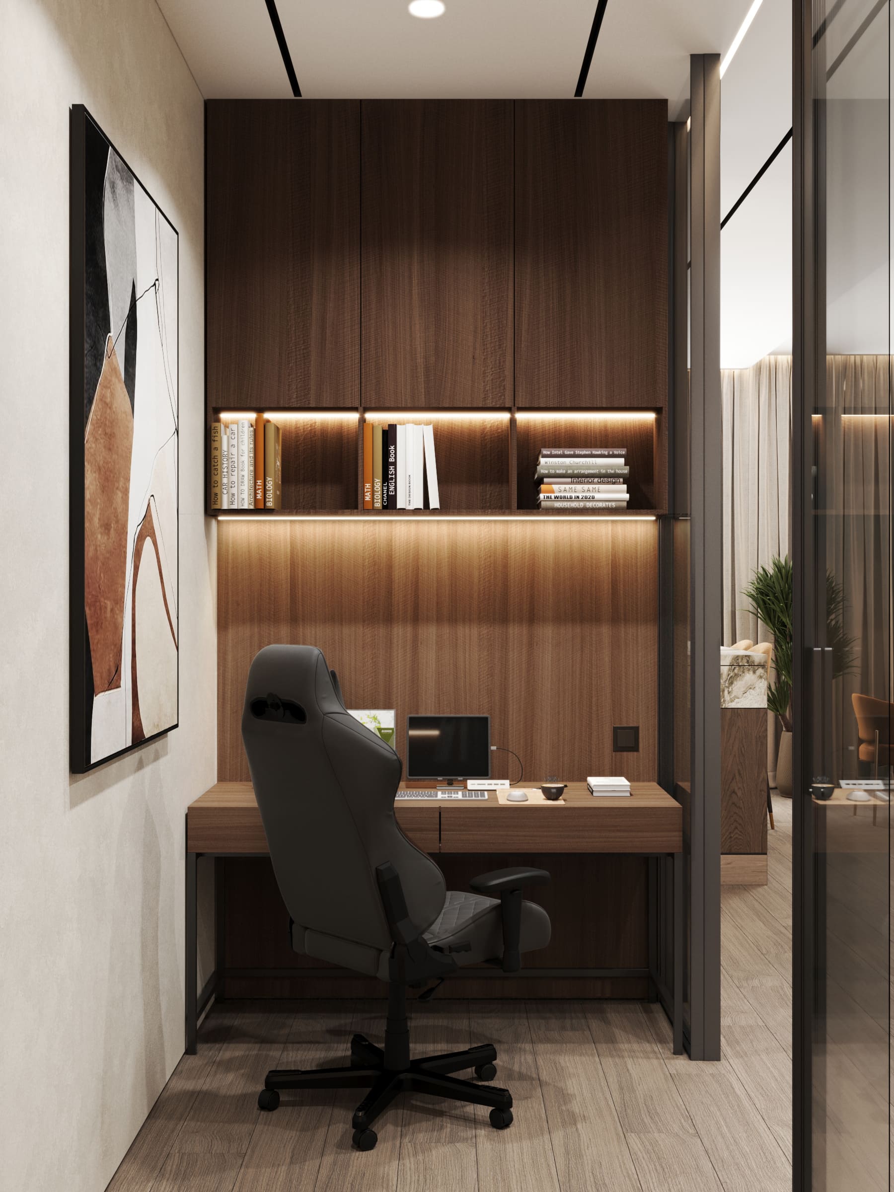 Проект для молодой семьи, он — IT-специалист, она — финансовый аналитик. В квартире есть 2 кабинета, спальня, детская, 3 гардеробные, прачечная, ванная комната, санузел и большая кухня-гостиная.