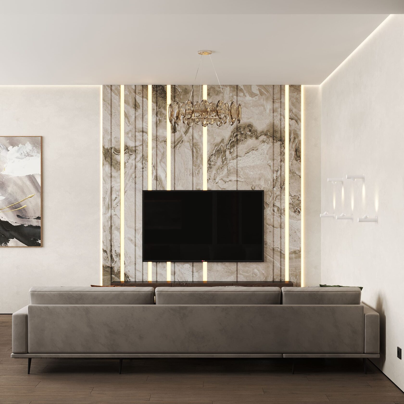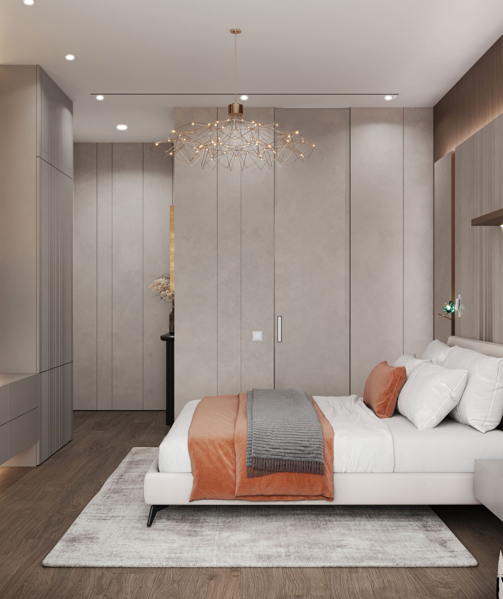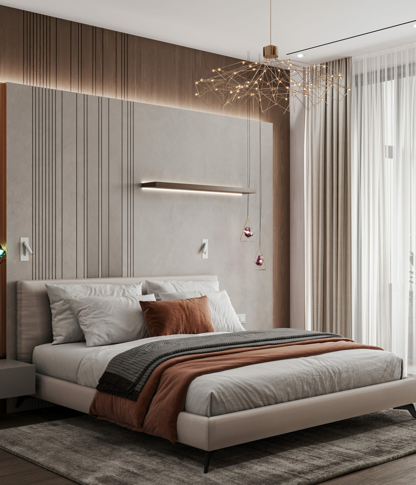 В спальне один из наших любимых приемов скрытой подсветки с управлением мощности света с пульта придает этому месту множество возможностей для игры светом под настроение. На потолке и над тумбами изящные светильники с минералами со светодиодами, которые дают свечение звезды.