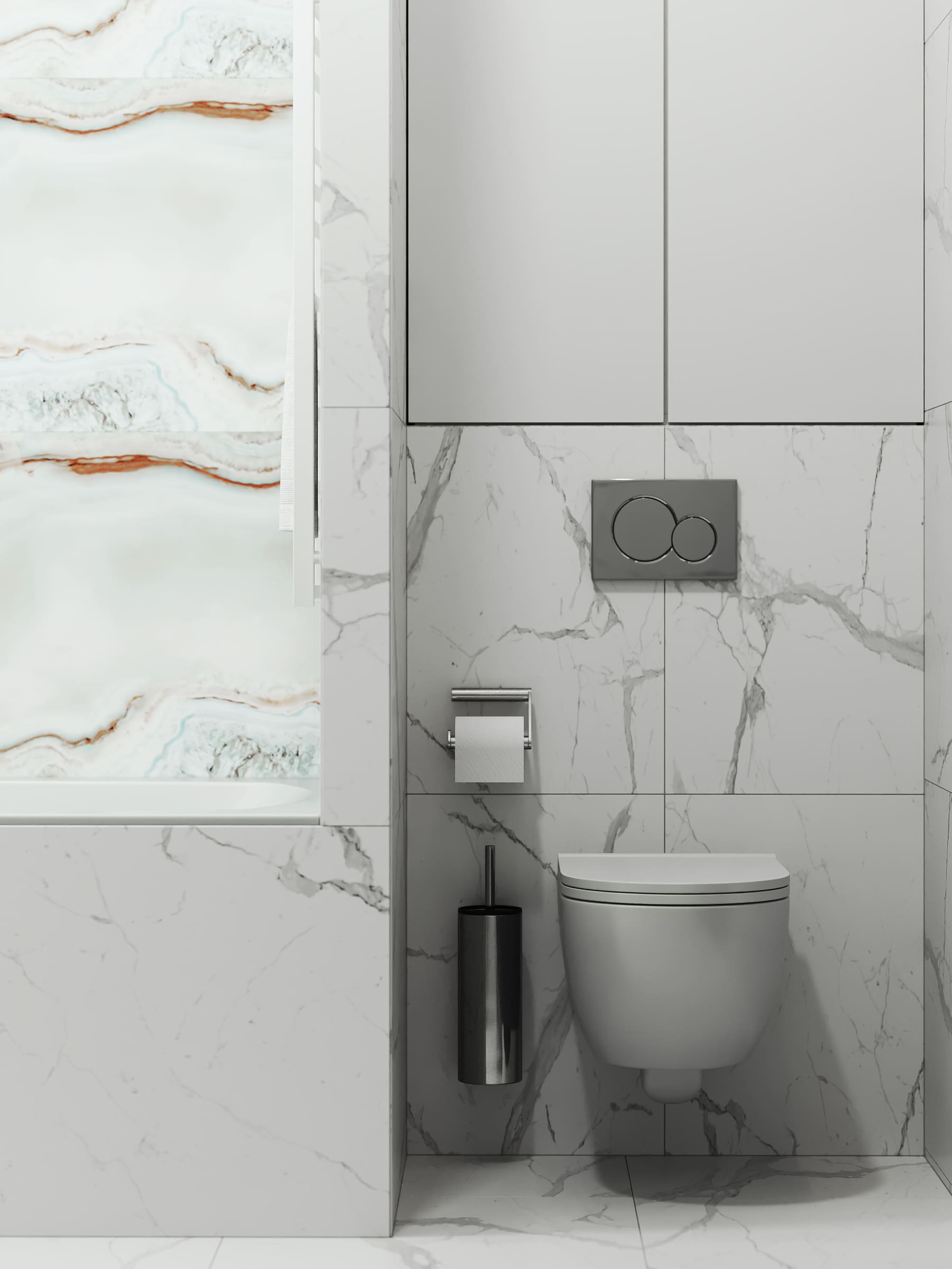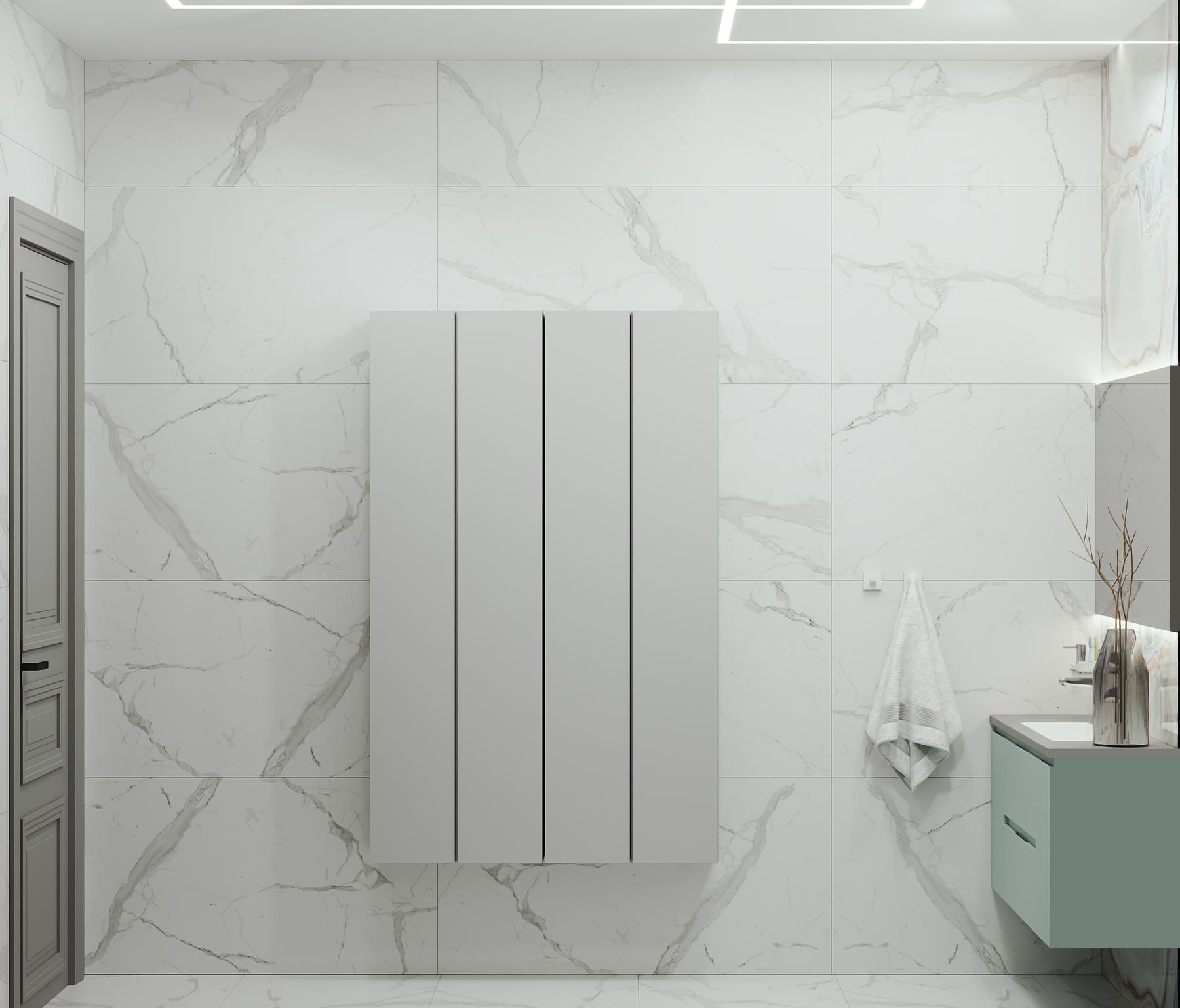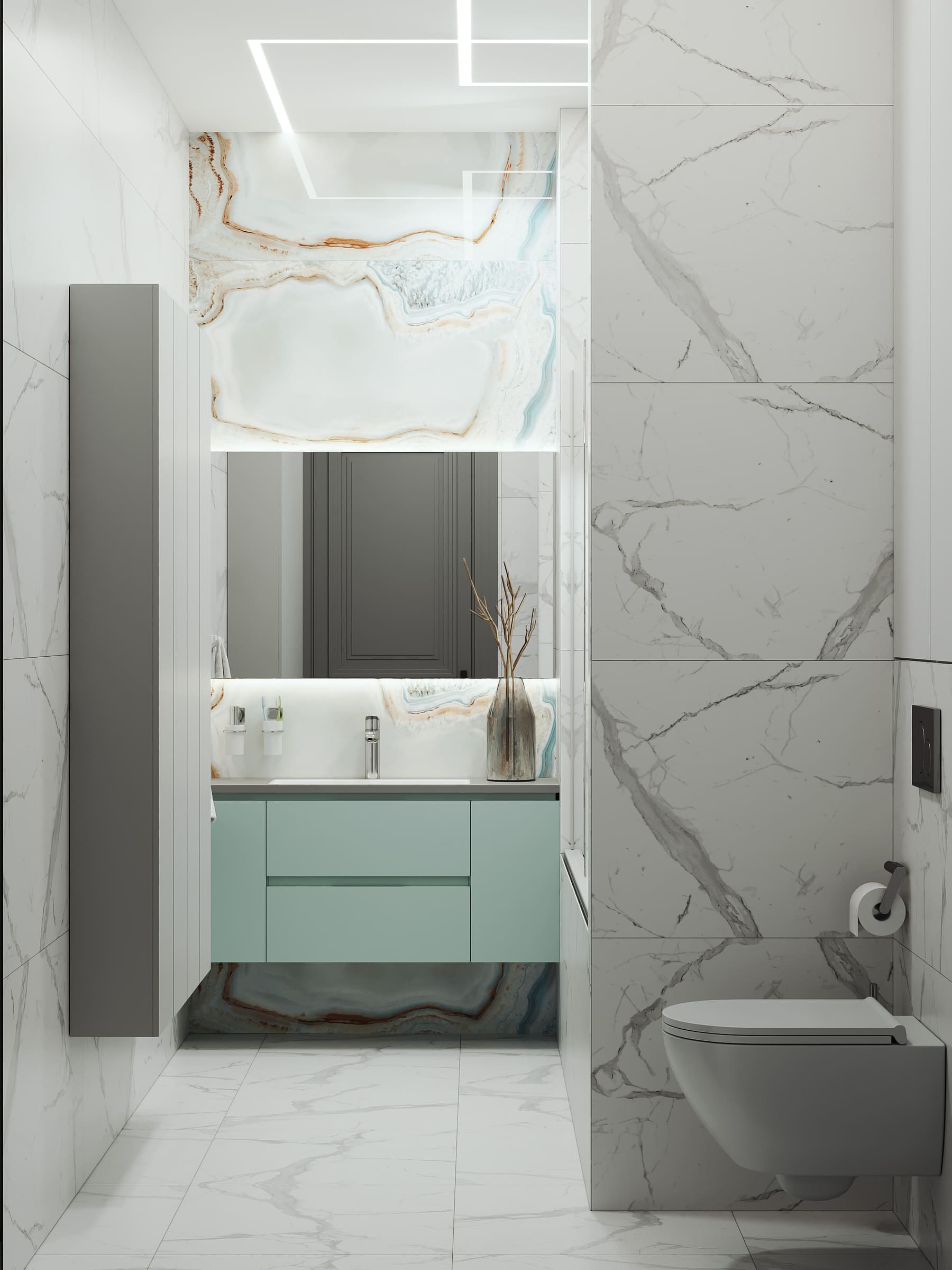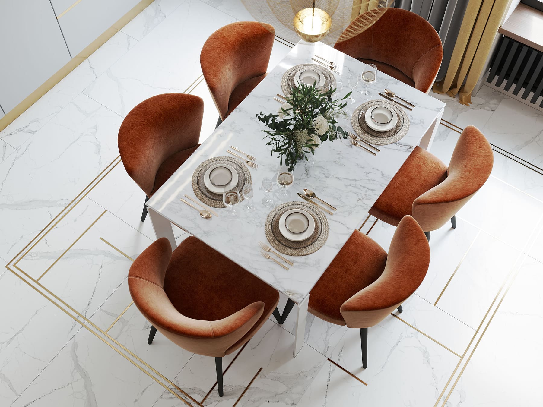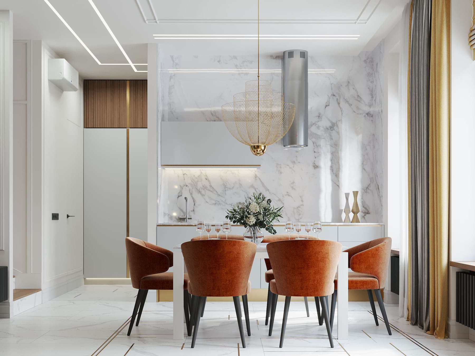 В интерьере гостиной были специально сделаны сочные, золотистые акценты, которые ещё четче очерчивали общую нежную стилистику, свойственную скорее неоклассике. Латунь, как материал, символизирующий гармонию, компромисс и умиротворение, активно использовался в отделке лестничного марша и во вставках в мраморе.