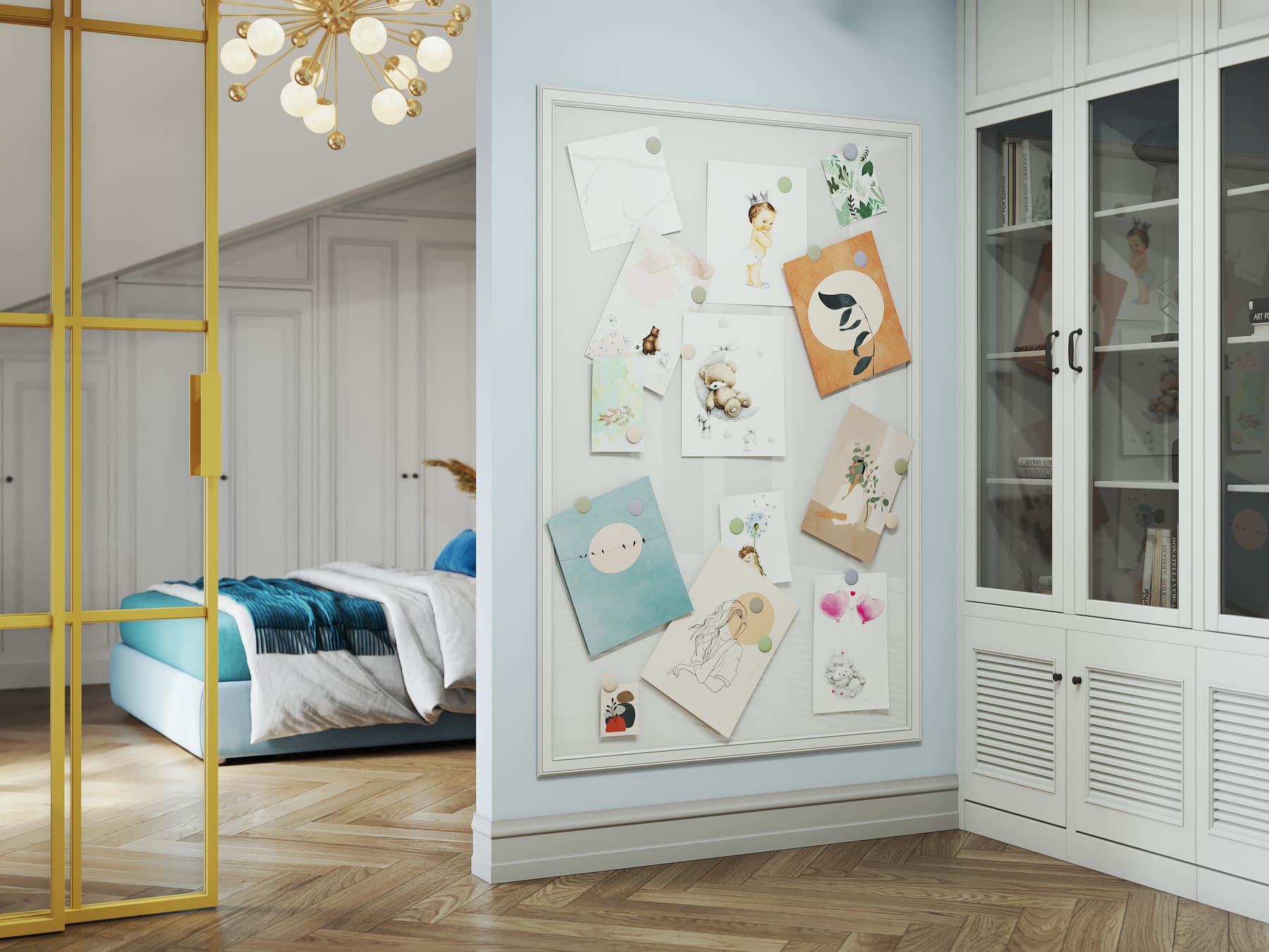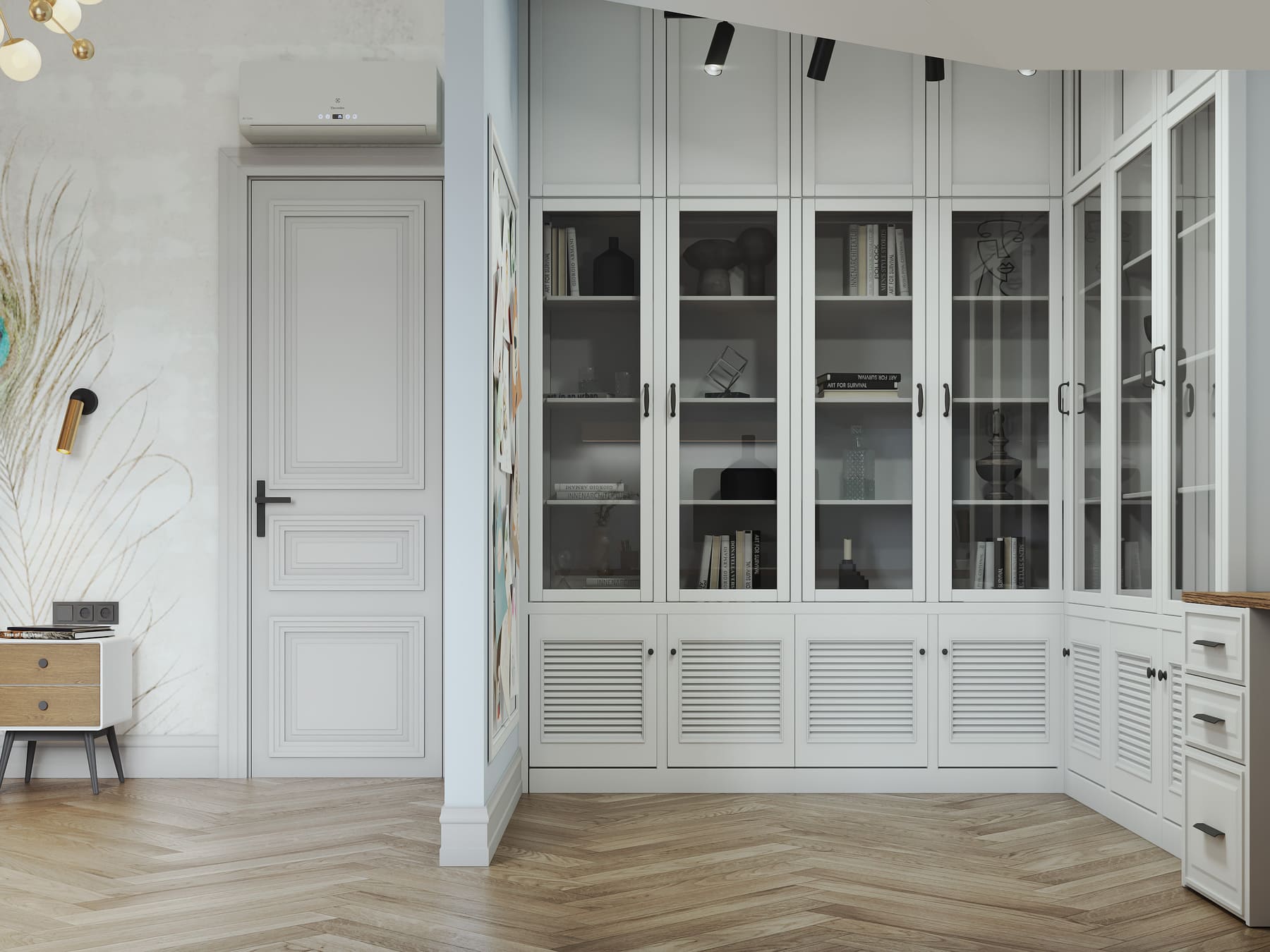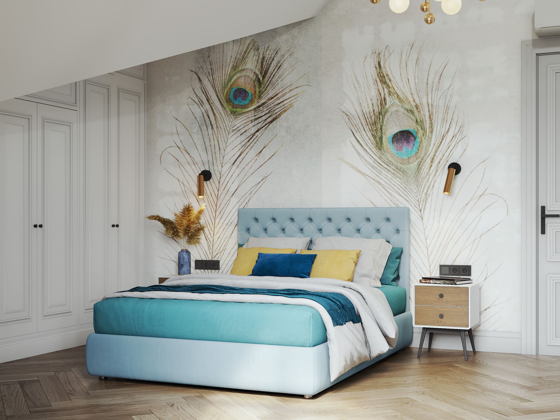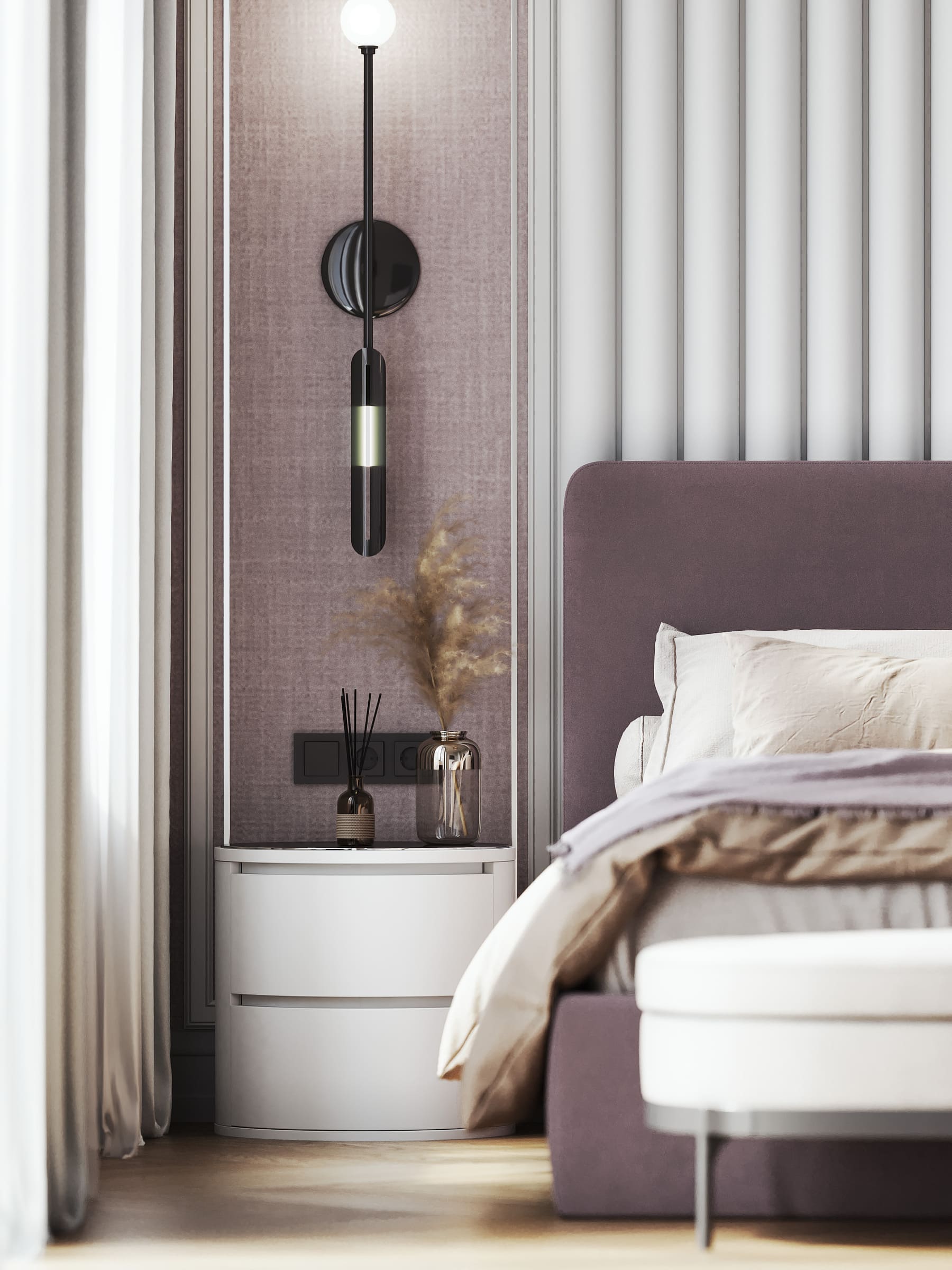 Интерьер спальни с рельефными панелями у изголовья также транслирует воздушное, «лилейное» настроение. Наша разработка — широкий плинтус в стиле американской классики по длине всего лестничного марша.
