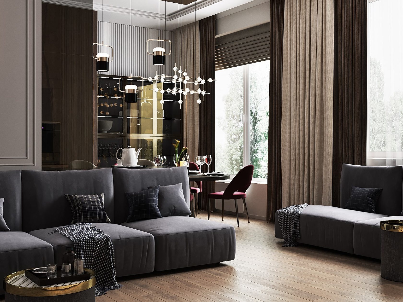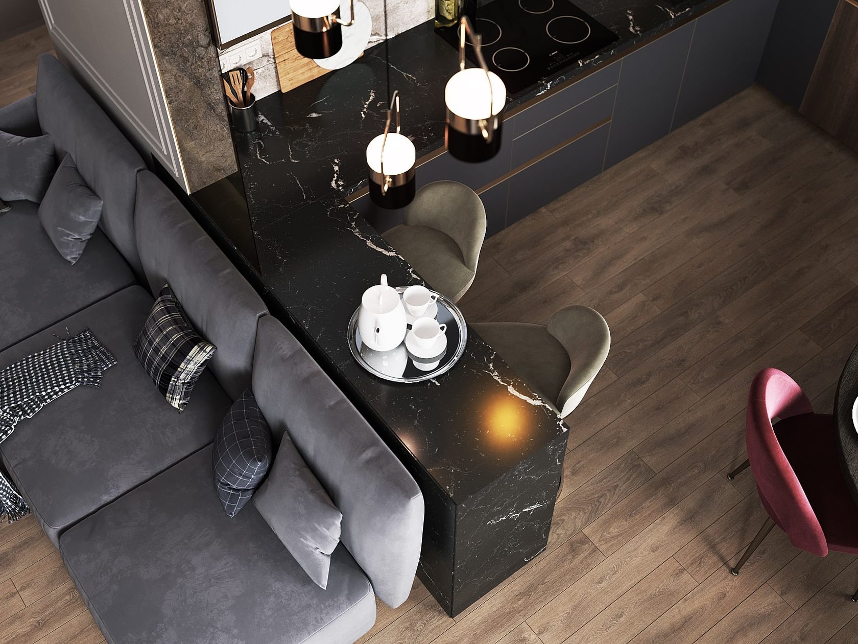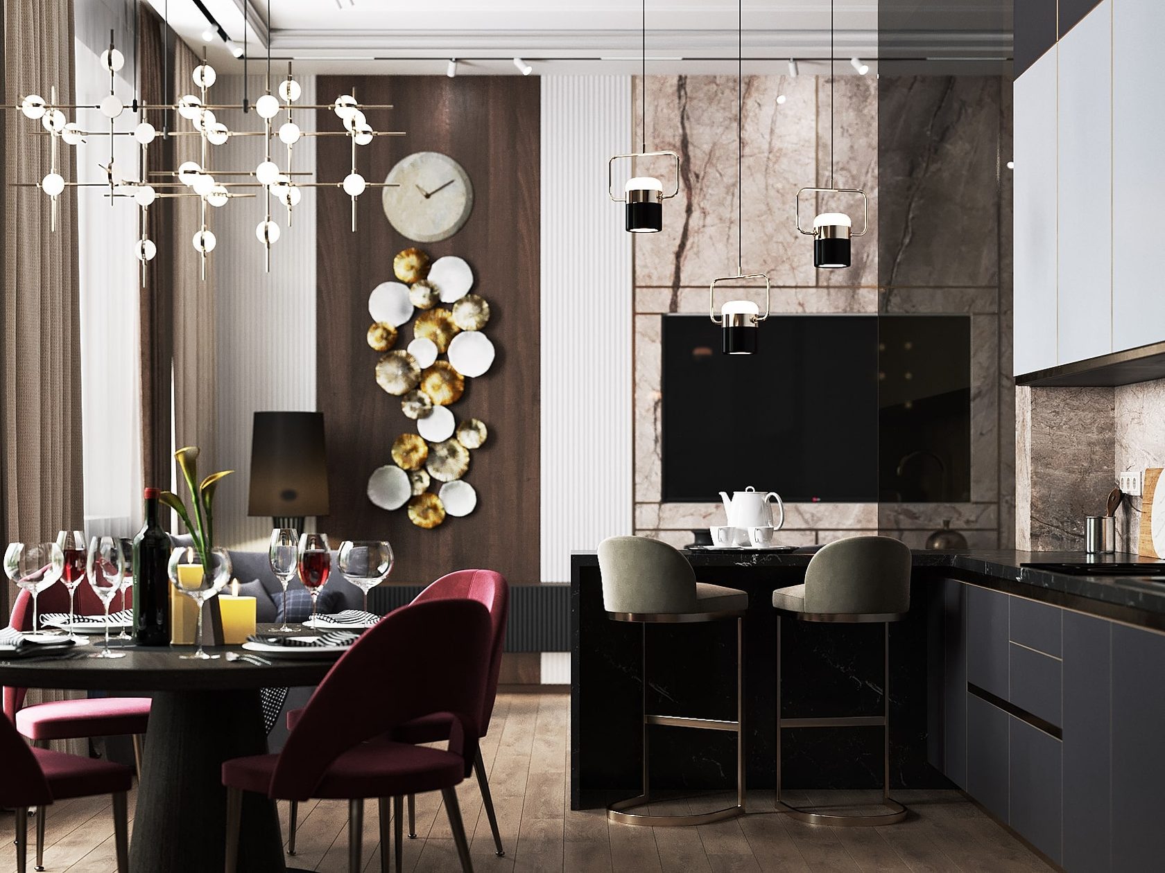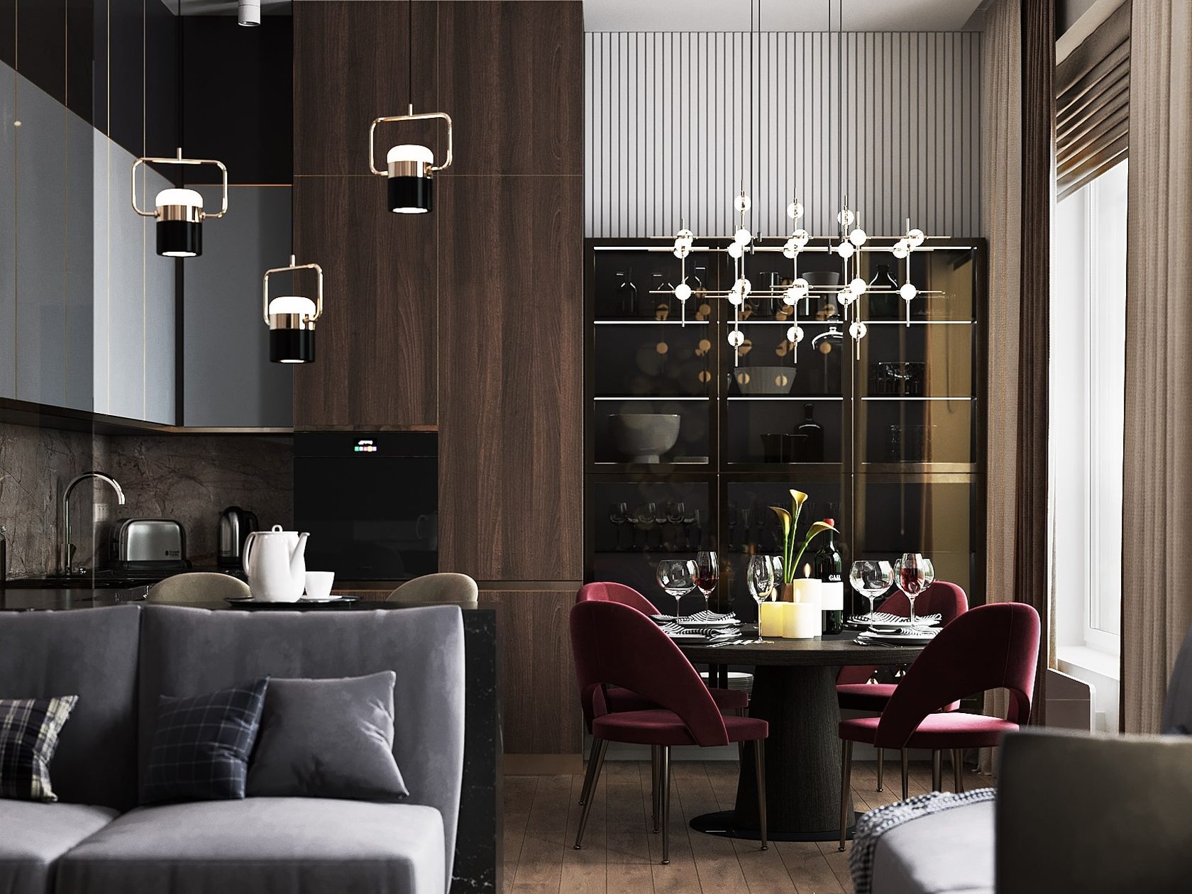 Стилистика квартиры изобилует глубокими оттенками графитового, молочного и шоколадного. Например, кухня — это шоколад горький, немного терпкий. Серый текстиль диванной группы, мрамор nero marquina и дорогие породы темно-коричневого дерева в оформлении кухни — всё это дарит приятное ощущение таинственности. При этом «оживляет» пространство текстиль из бежевого и винного цвета, а также оригинальные светильники.
