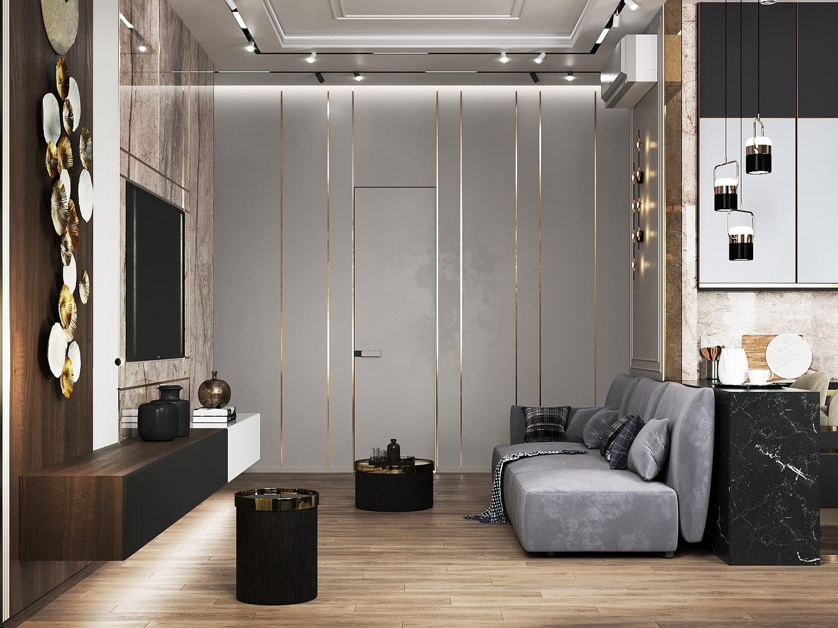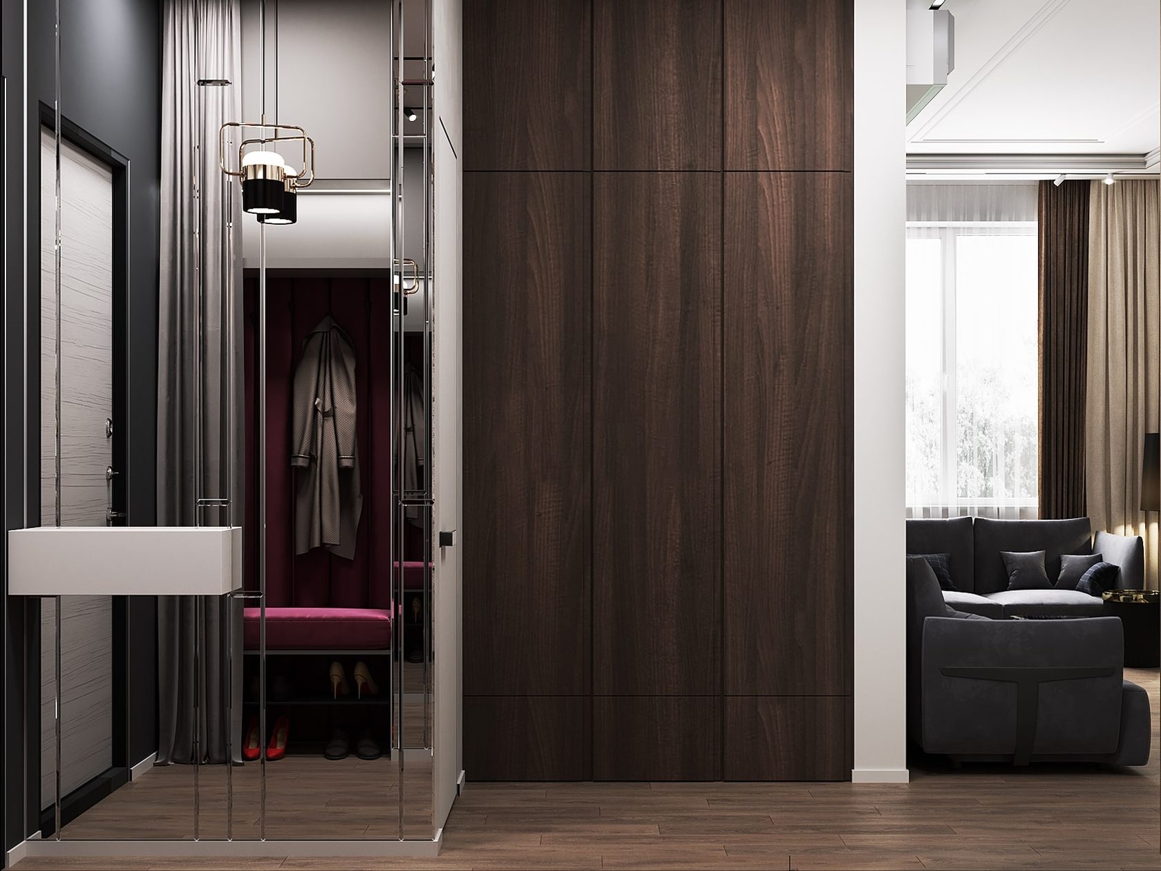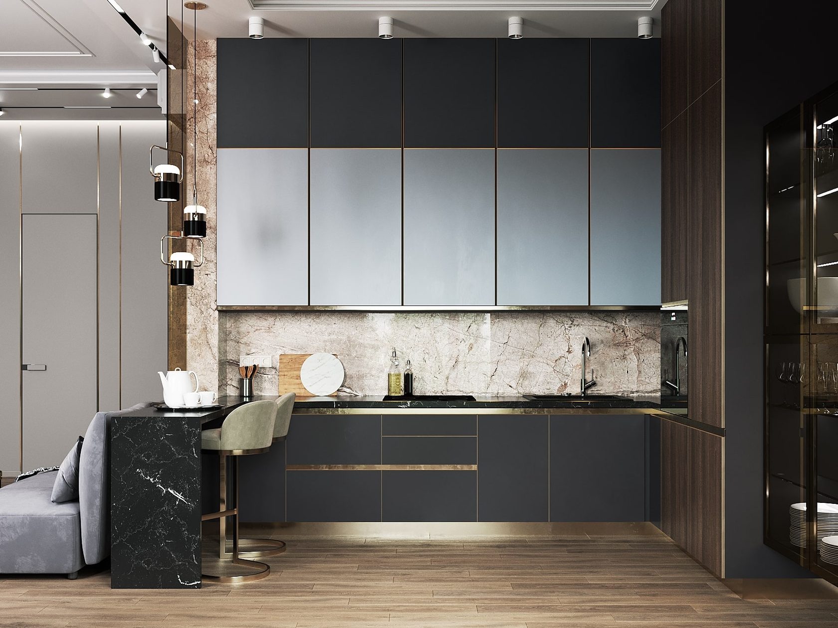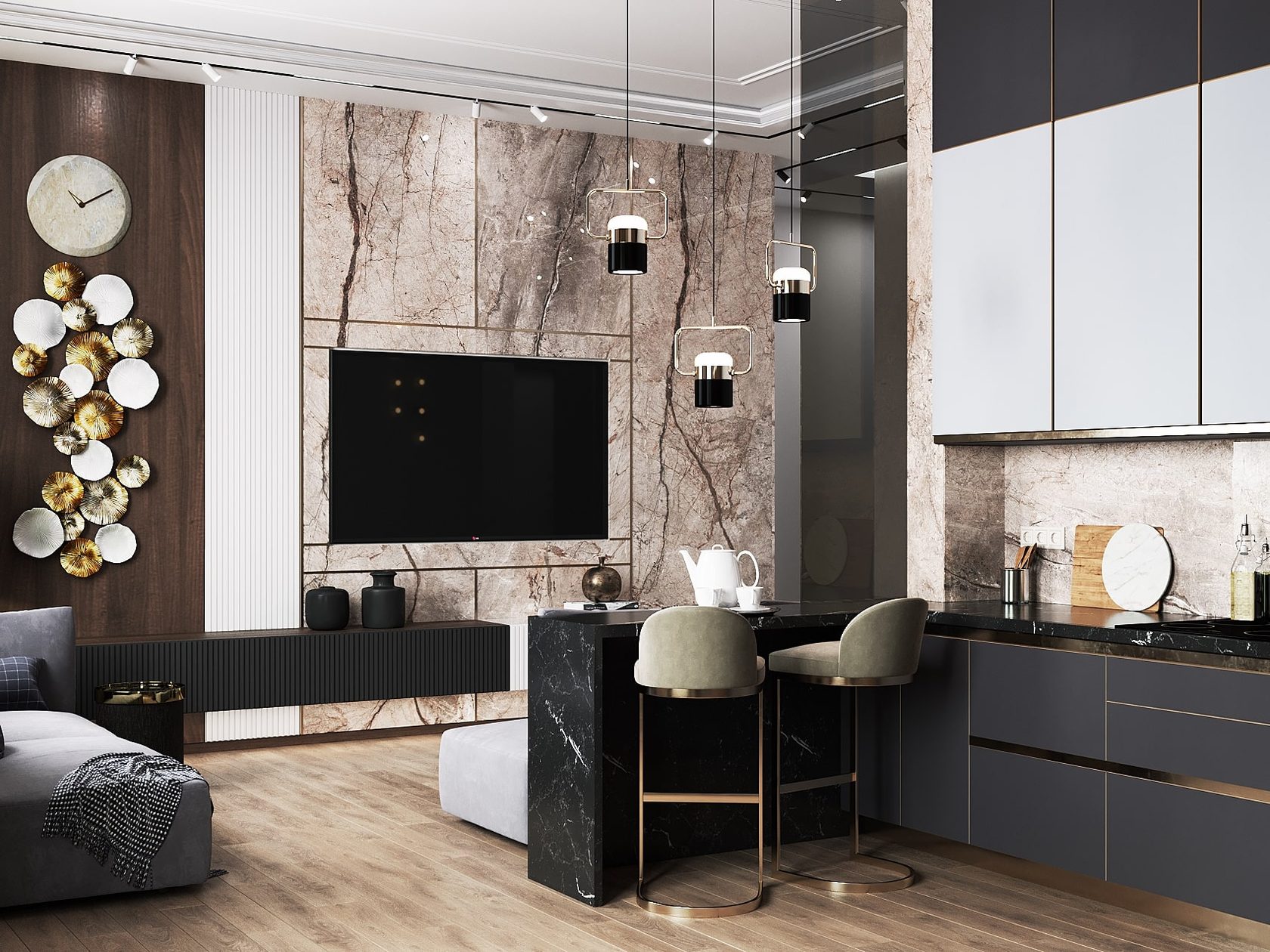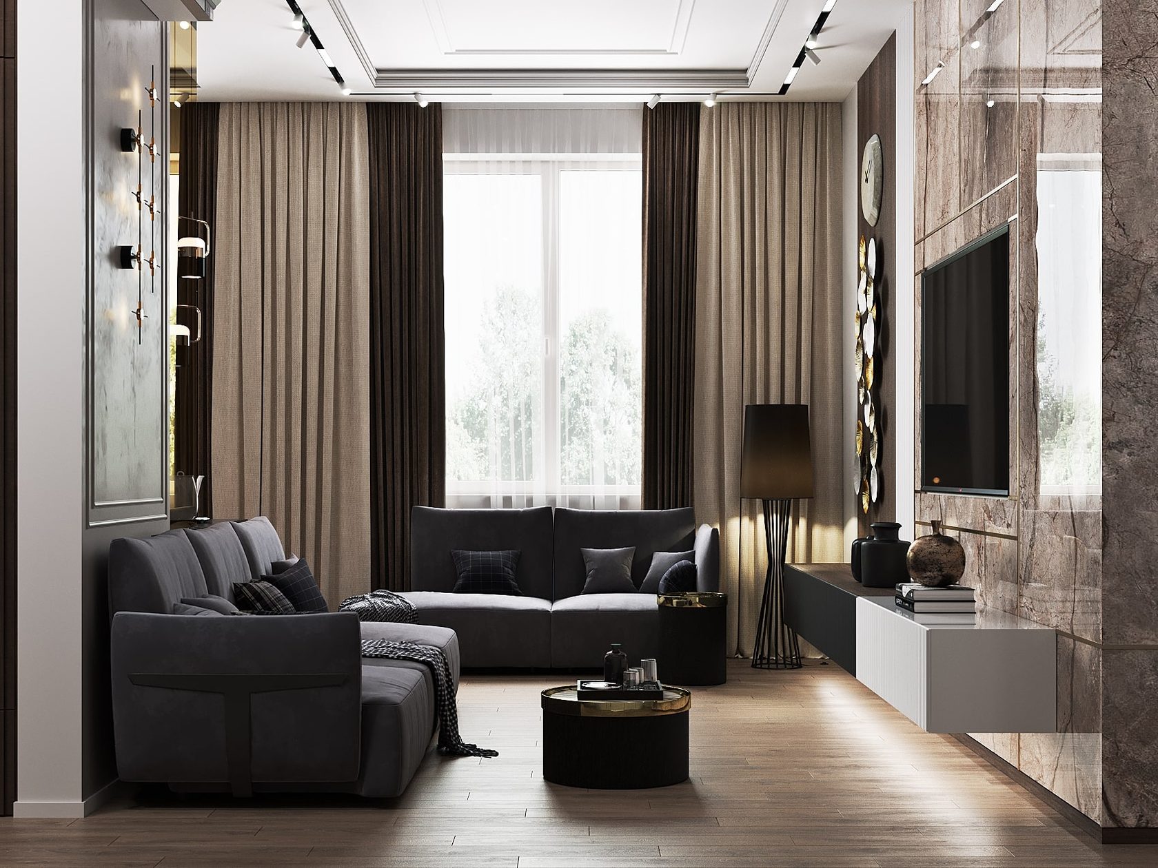 Стилистика квартиры изобилует глубокими оттенками графитового, молочного и шоколадного. Например, кухня — это шоколад горький, немного терпкий. Серый текстиль диванной группы, мрамор nero marquina и дорогие породы темно-коричневого дерева в оформлении кухни — всё это дарит приятное ощущение таинственности. При этом «оживляет» пространство текстиль из бежевого и винного цвета, а также оригинальные светильники.