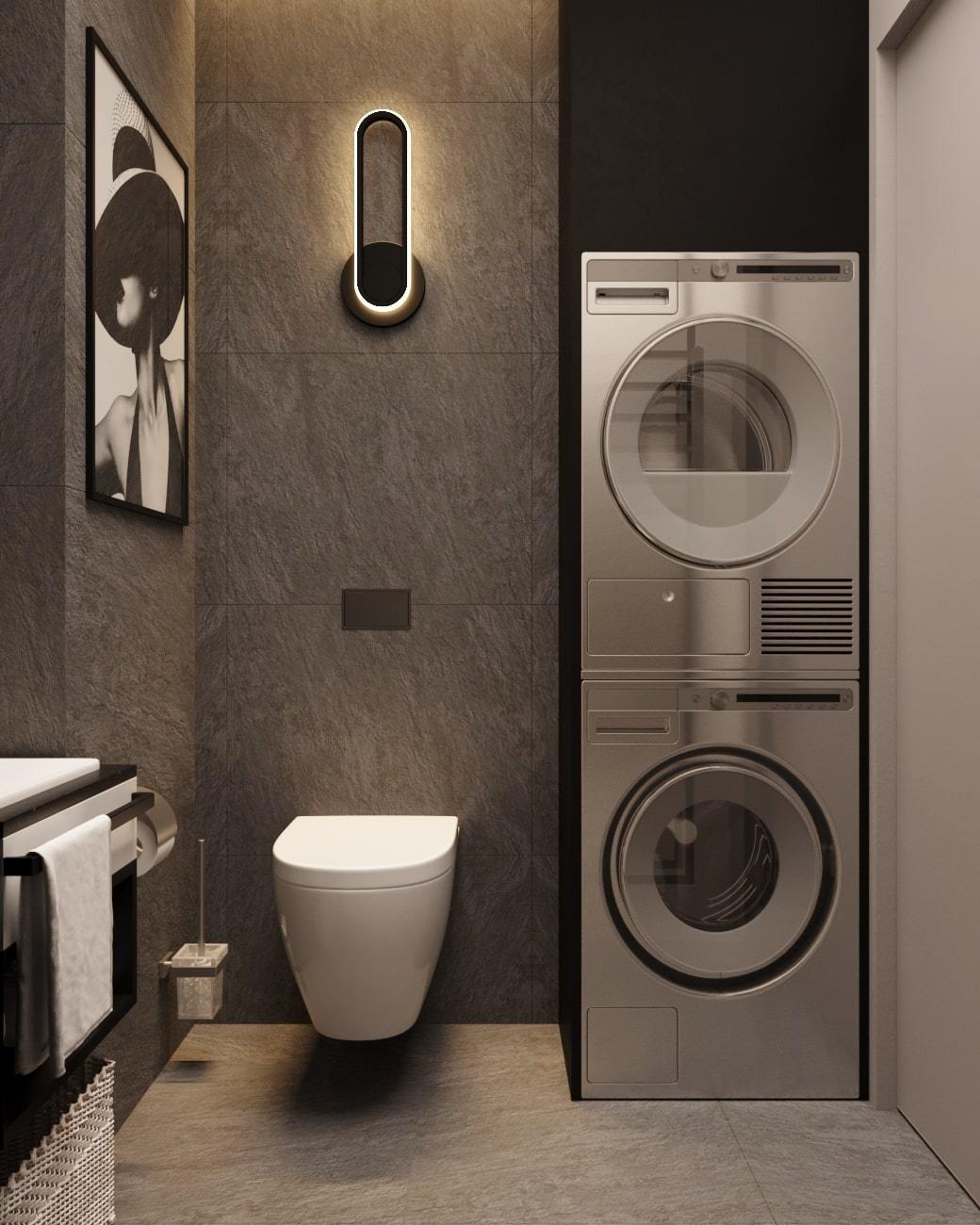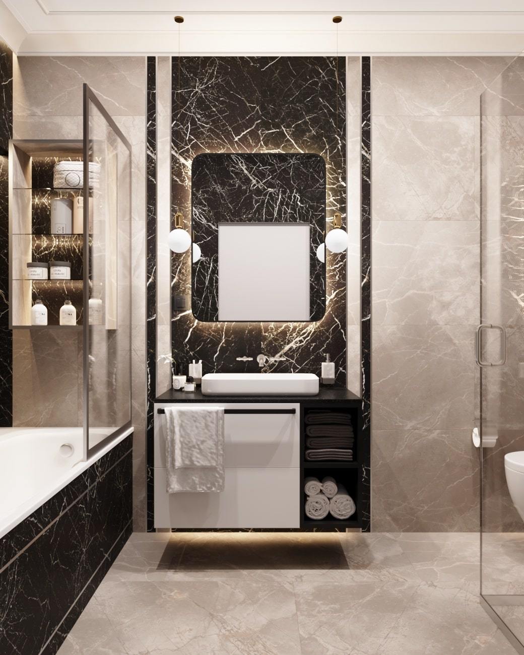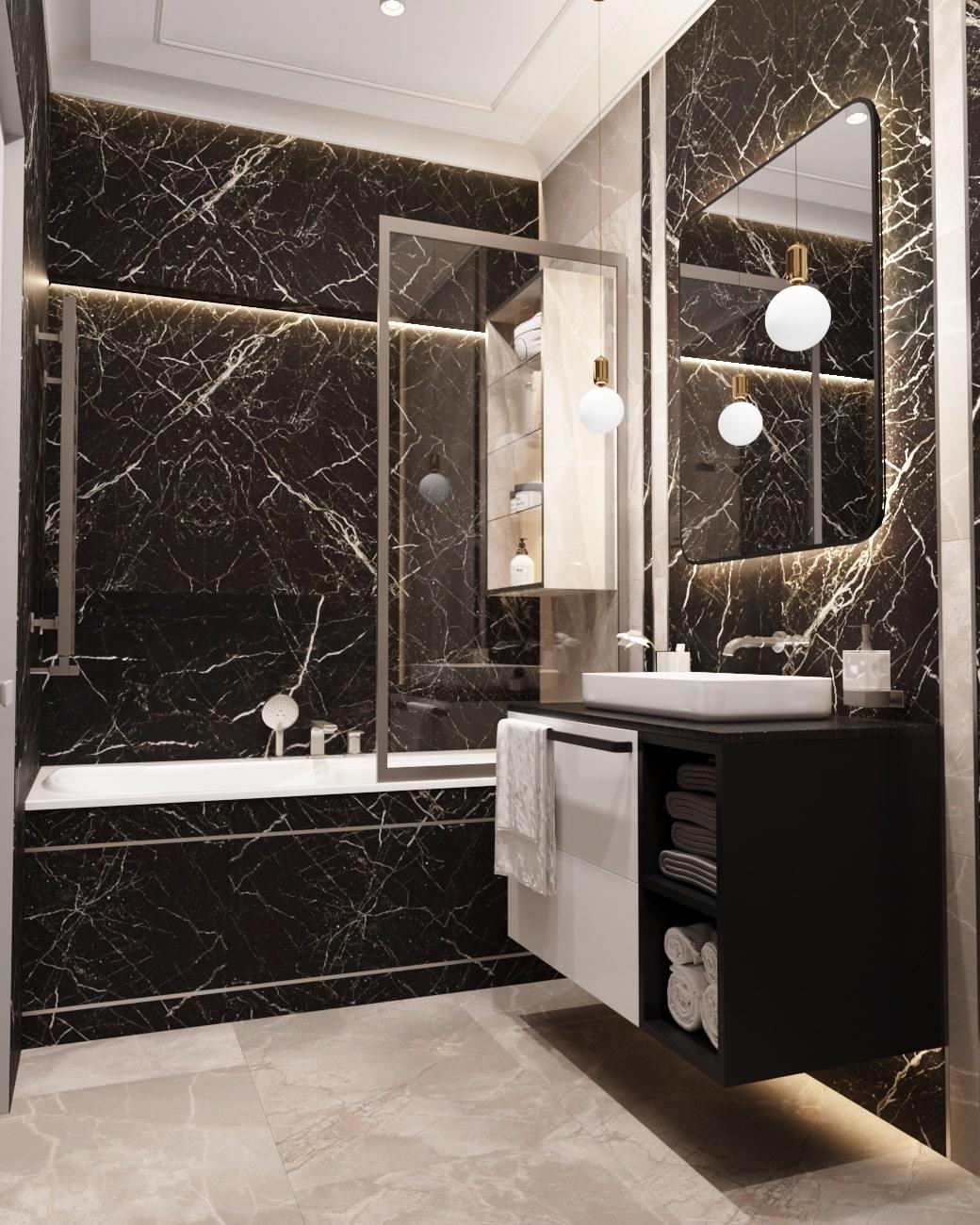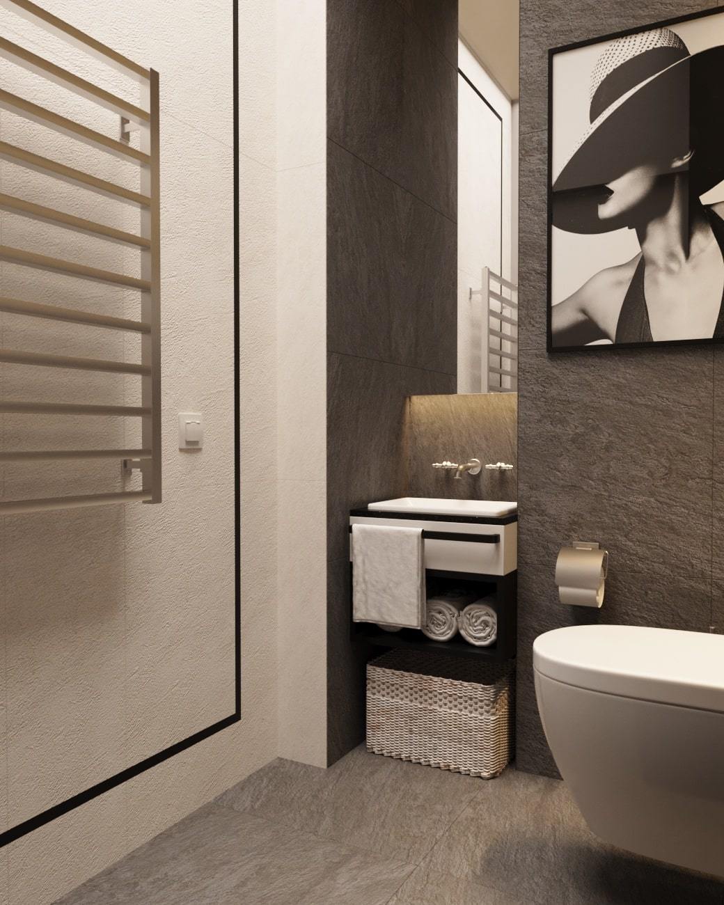 Стилистика квартиры изобилует глубокими оттенками графитового, молочного и шоколадного. Например, кухня — это шоколад горький, немного терпкий. Серый текстиль диванной группы, мрамор nero marquina и дорогие породы темно-коричневого дерева в оформлении кухни — всё это дарит приятное ощущение таинственности. При этом «оживляет» пространство текстиль из бежевого и винного цвета, а также оригинальные светильники.