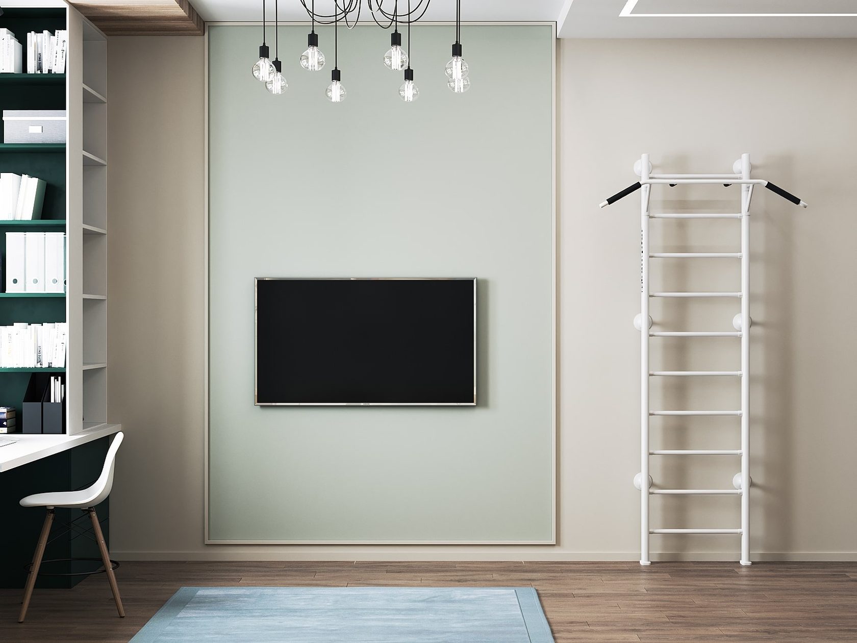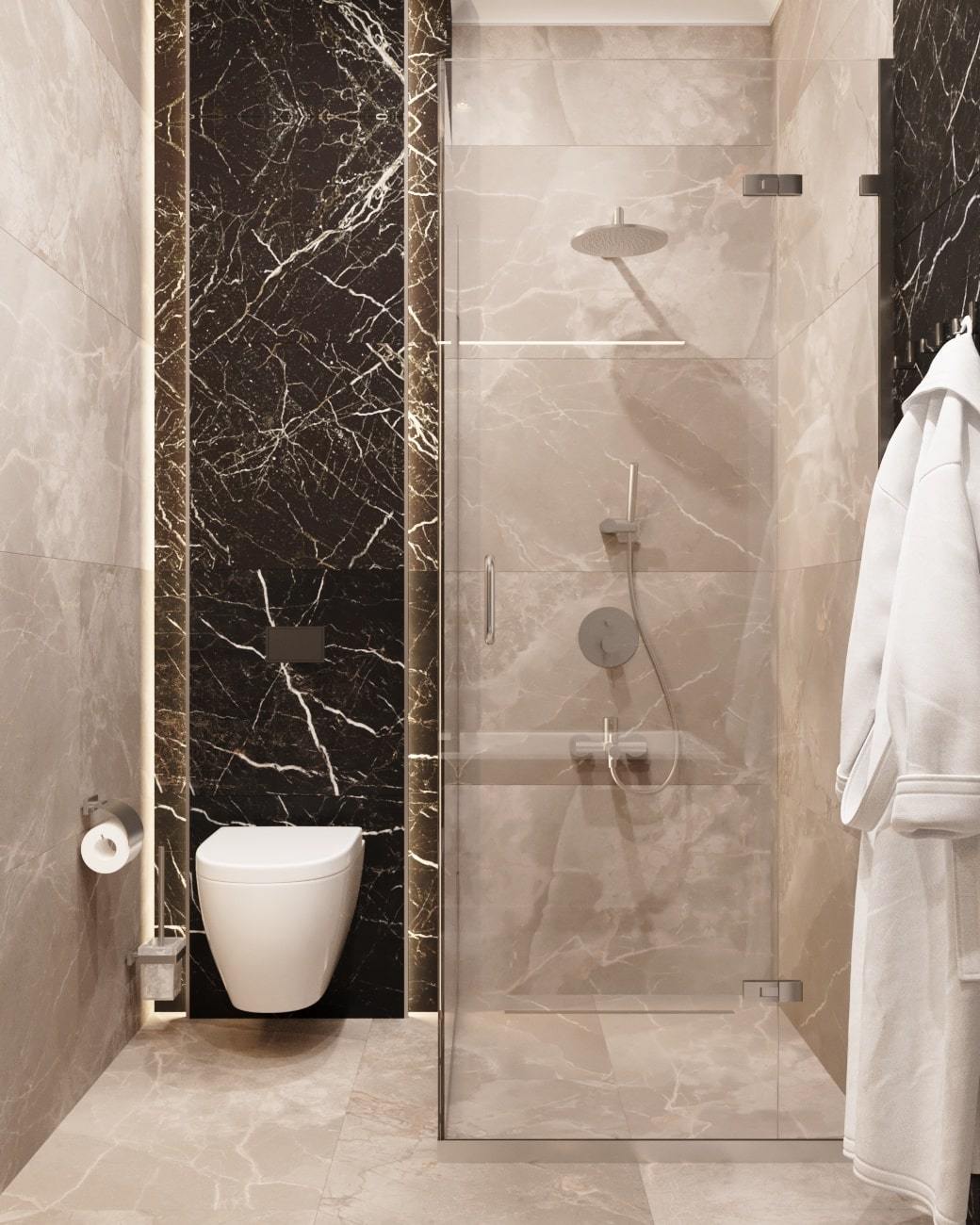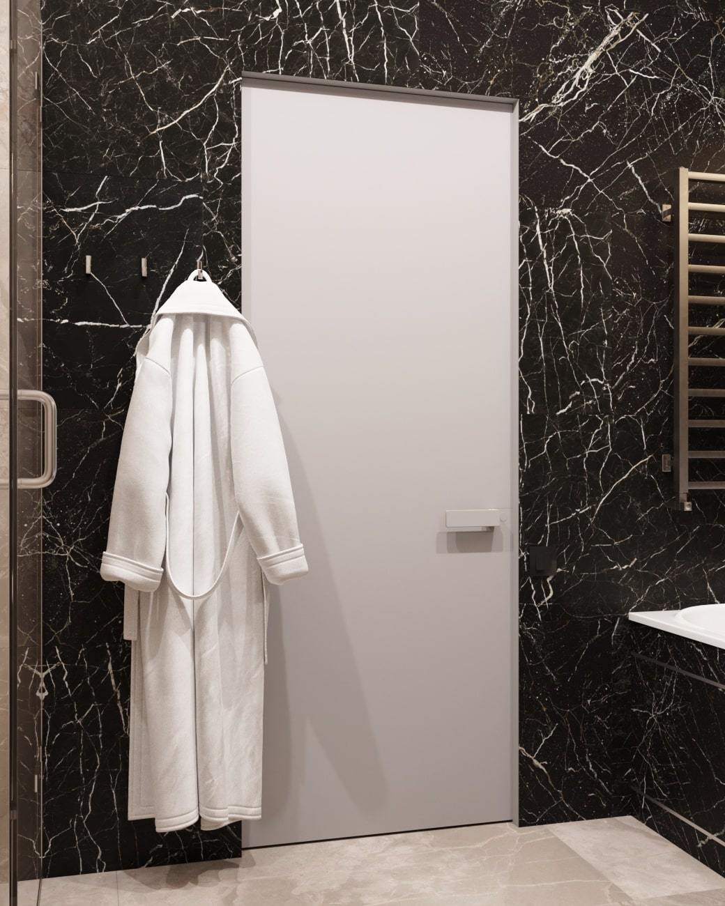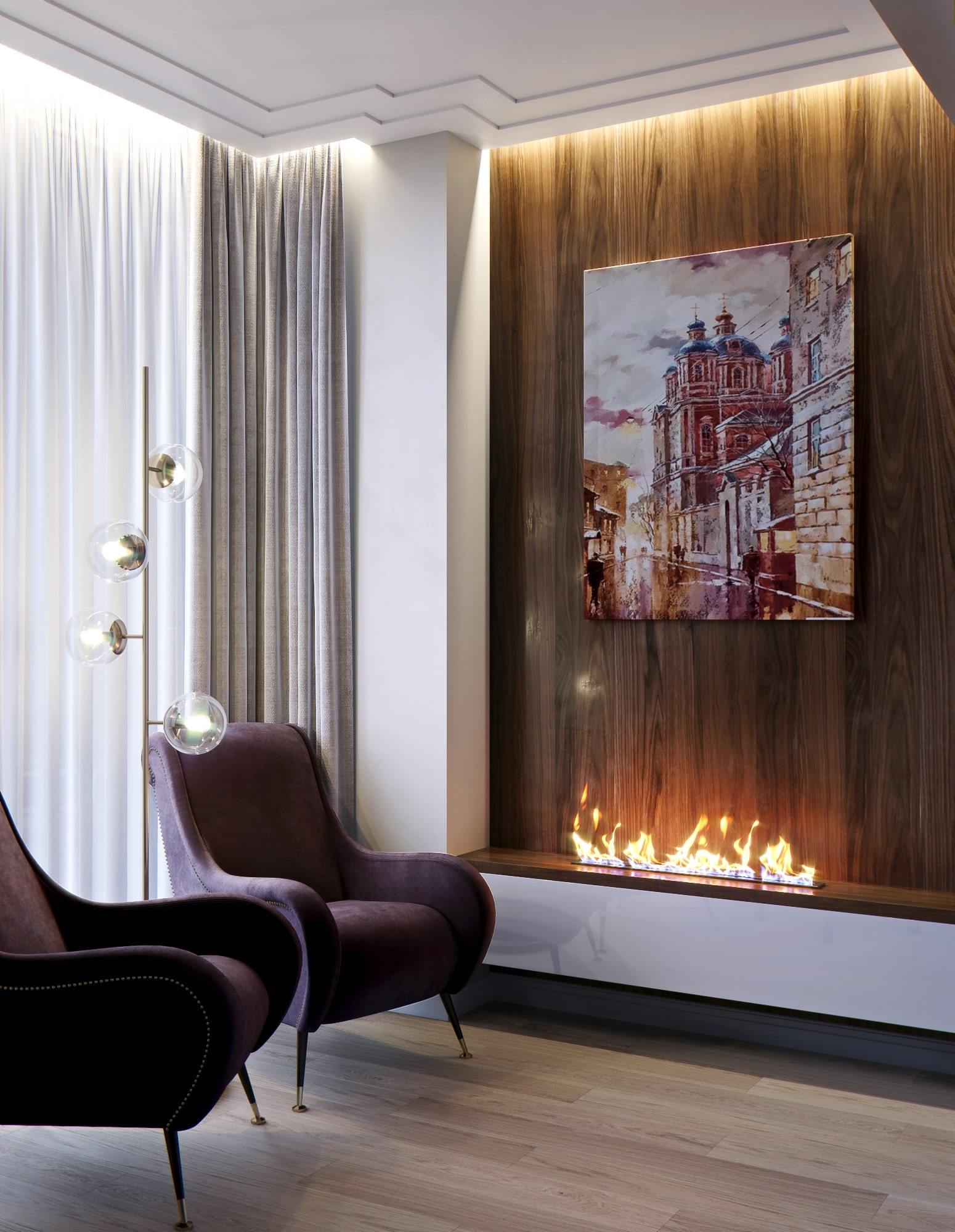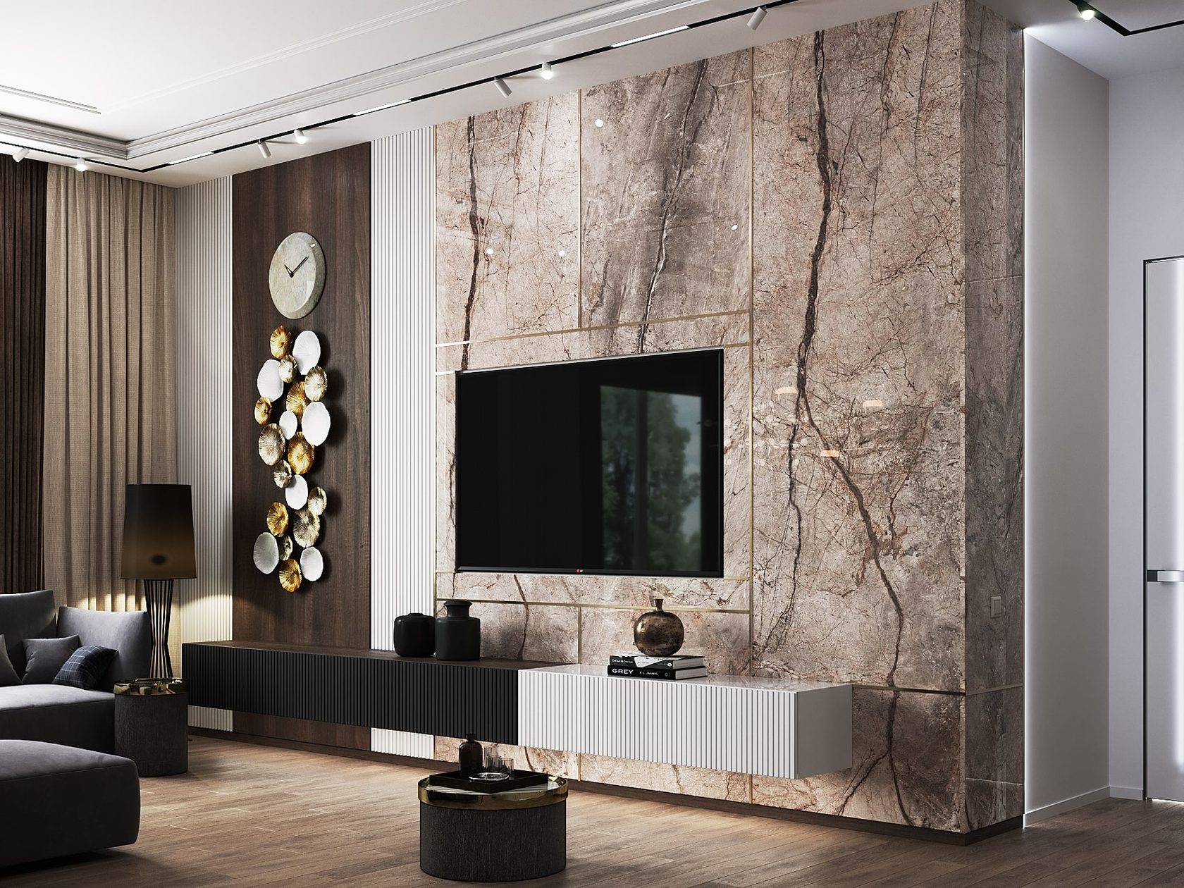 Отдельного внимания заслуживает ТВ стена, собранная от пола до потолка из эксклюзивного широкоформатного керамогранита, а также шпонированных и гипсовых рельефных панелей. Внутри данной конструкции — ниша для телевизора по размерам экрана. Сделана это было для того, чтобы не бросались в глаза функциональные элементы — кронштейны, провода и крепления со стороны коридора.