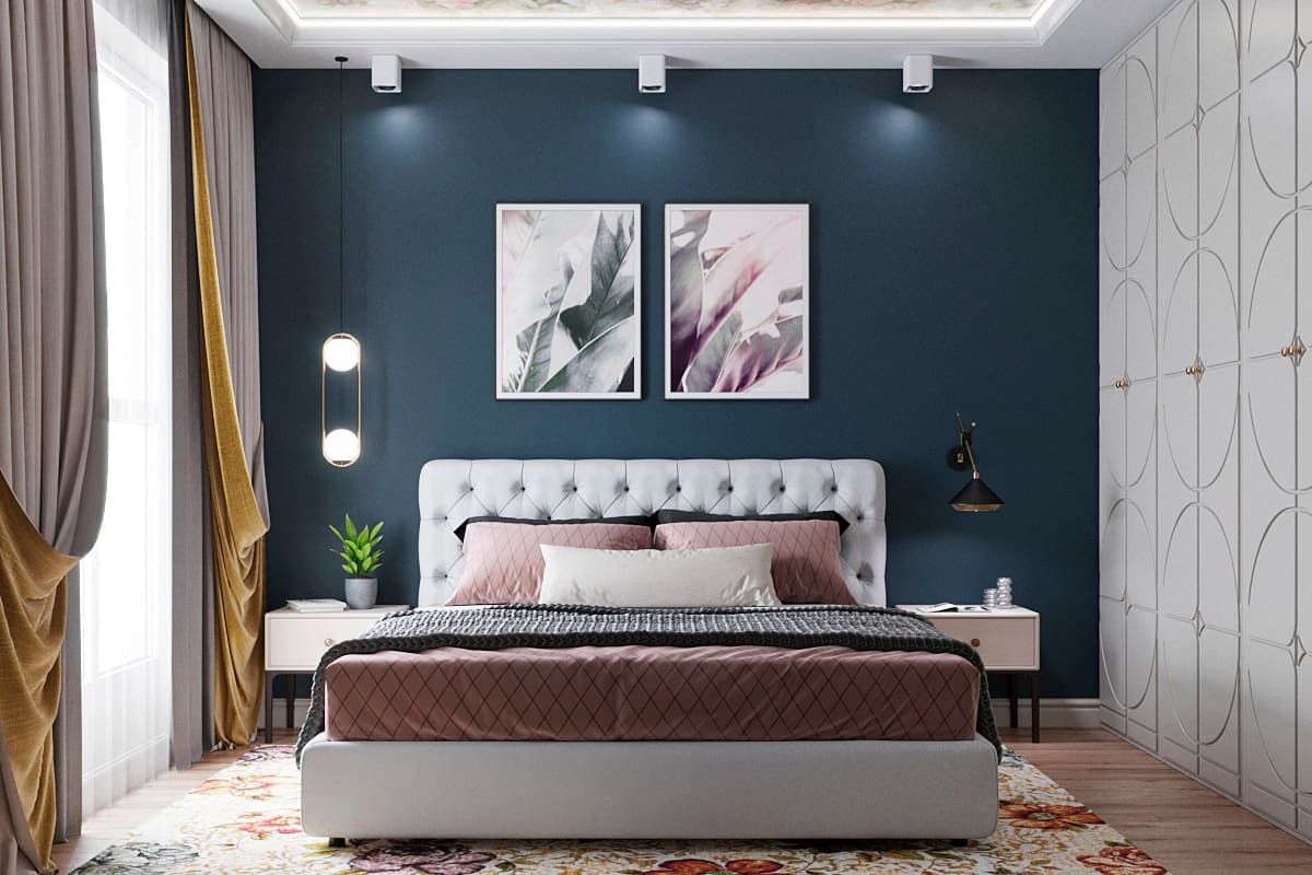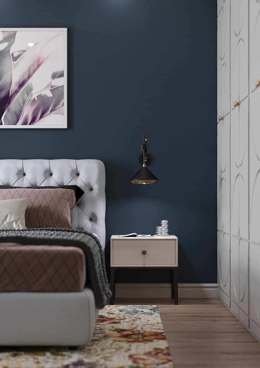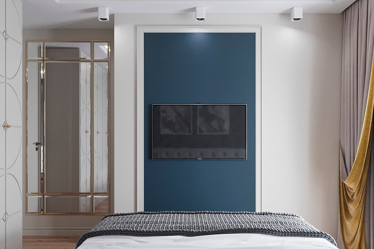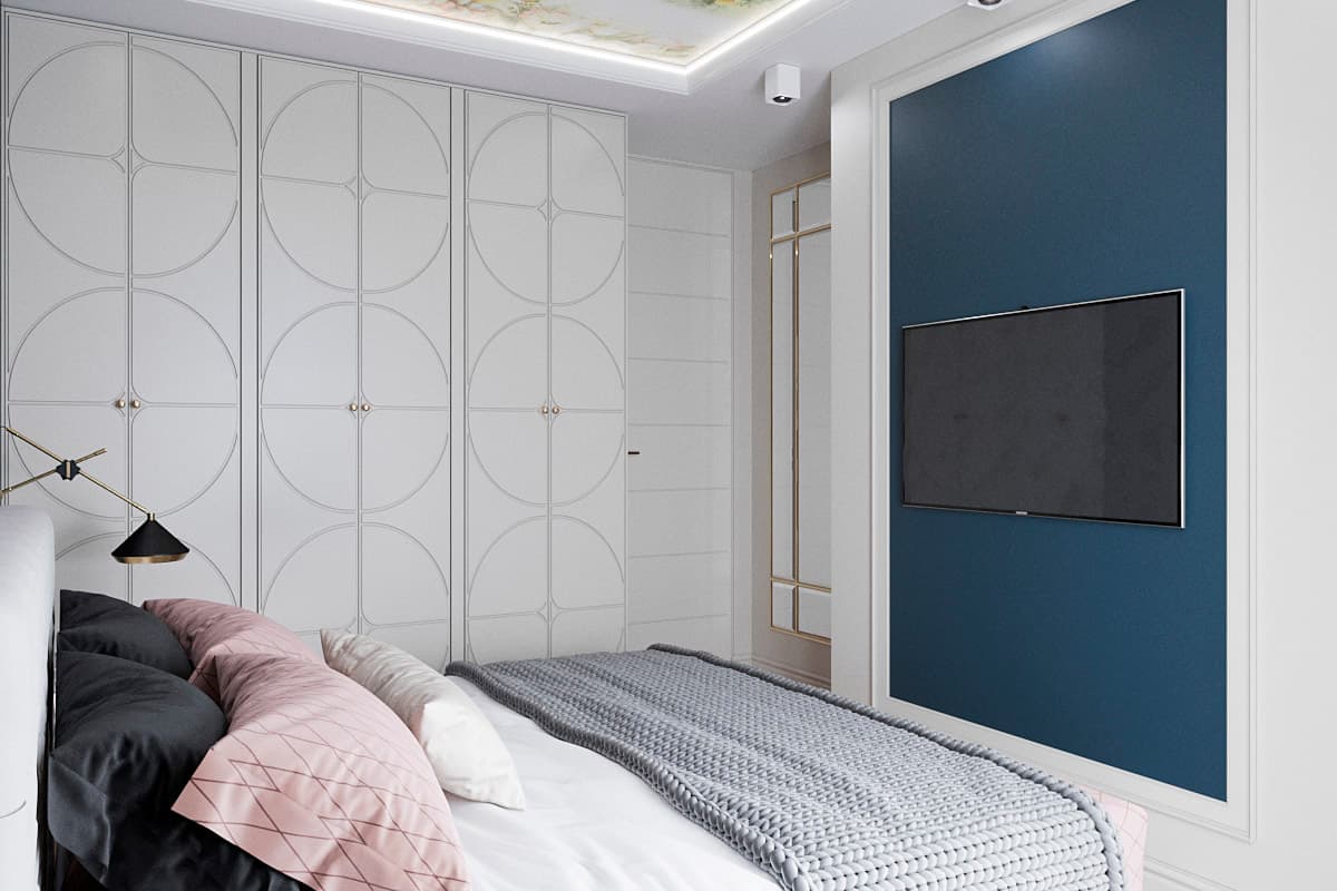 Отдельного внимания заслуживает спальня. Лазурно-синие, перламутровые и белые тона добавляют свежести пространству, придают ощущения легкого морского бриза. А симметричные, строго очерченные орнаменты на мебельной группе отсылают к той мудрости и гармоничности в природе, о которой и упоминал в своё время Да Винчи.