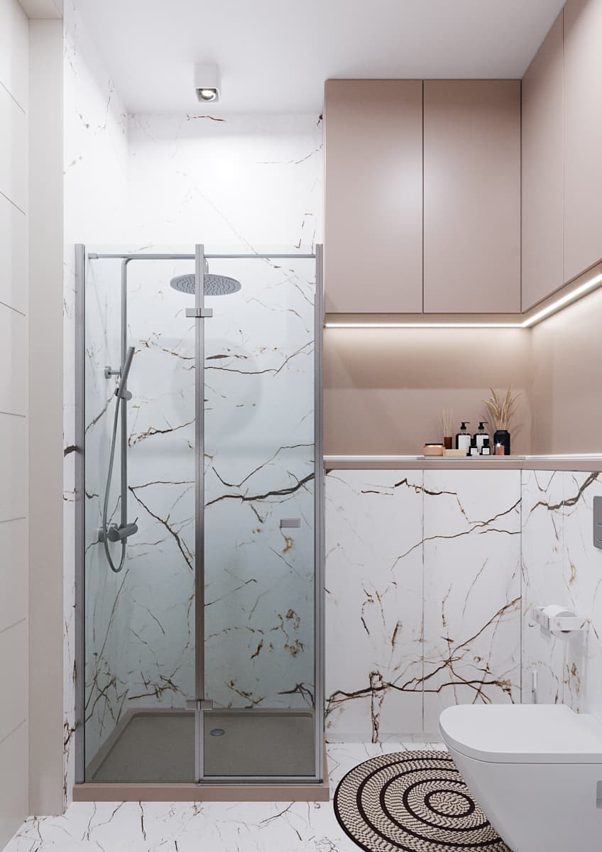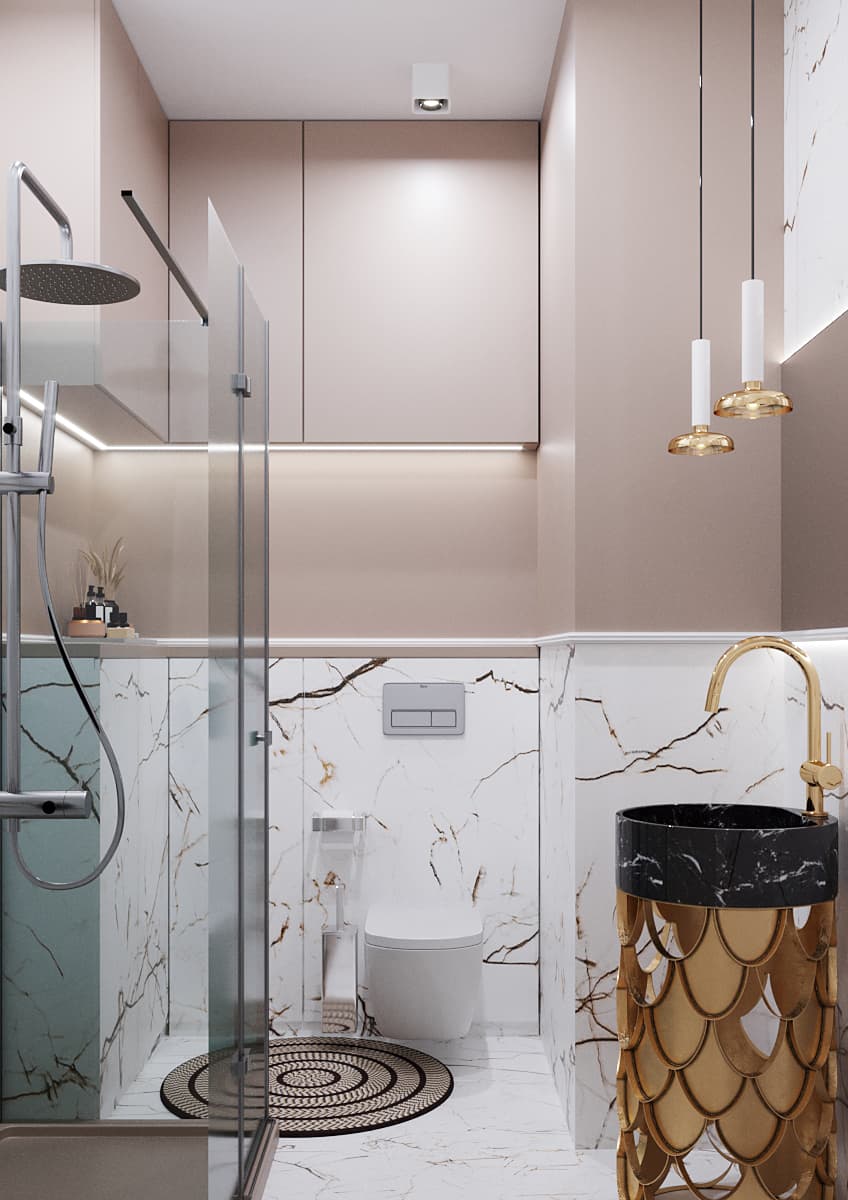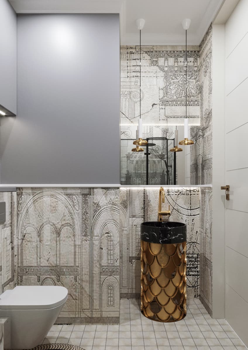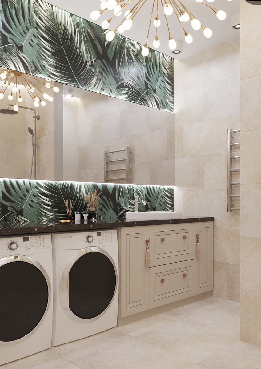 Отдельного внимания заслуживает спальня. Лазурно-синие, перламутровые и белые тона добавляют свежести пространству, придают ощущения легкого морского бриза. А симметричные, строго очерченные орнаменты на мебельной группе отсылают к той мудрости и гармоничности в природе, о которой и упоминал в своё время Да Винчи.