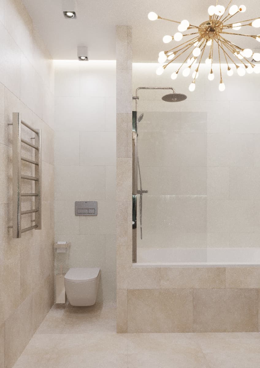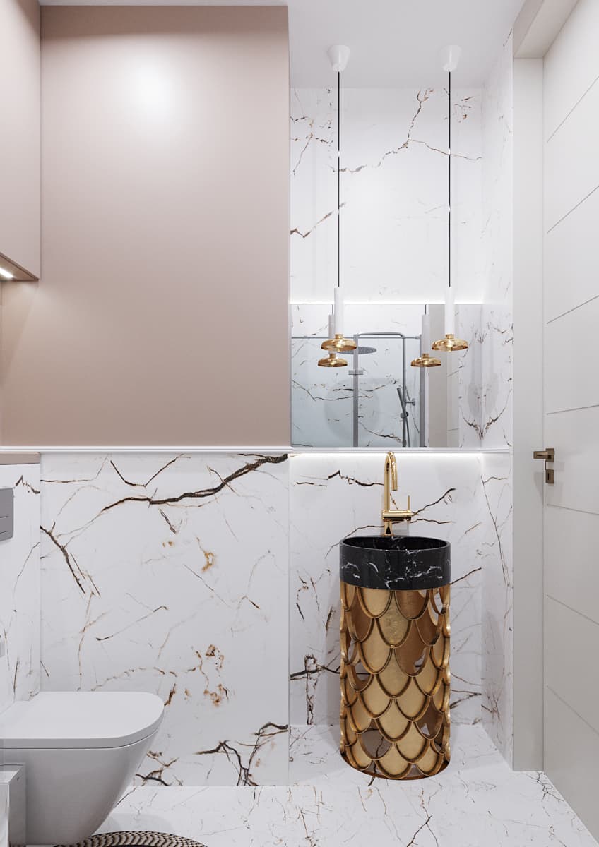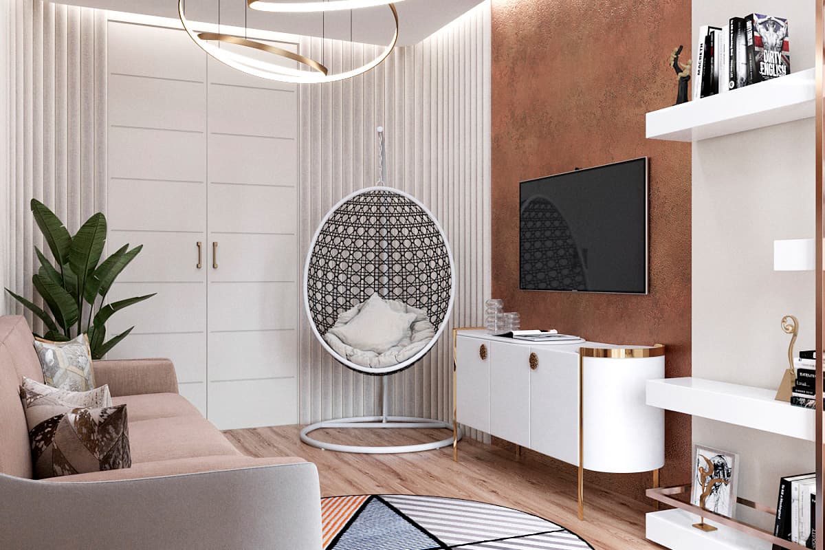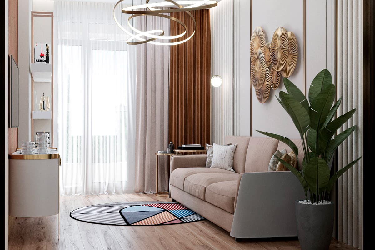 Так, в гостиной были использованы успокаивающие и теплые белые, песочные и бежевые тона. Оригинальность пространству добавила необычная комбинация из разных фактурных материалов для стен — медная декоративная штукатурка, мягкие велюровые панели и МДФ с вставками под сатинированное золото.