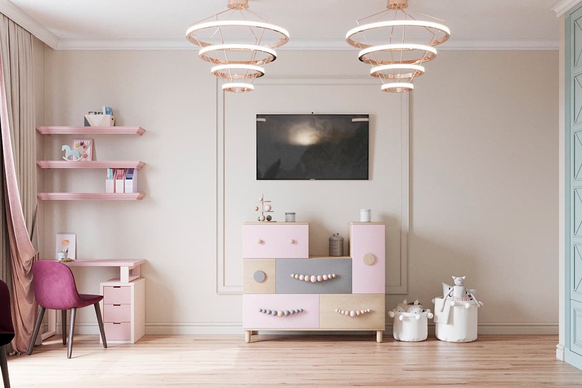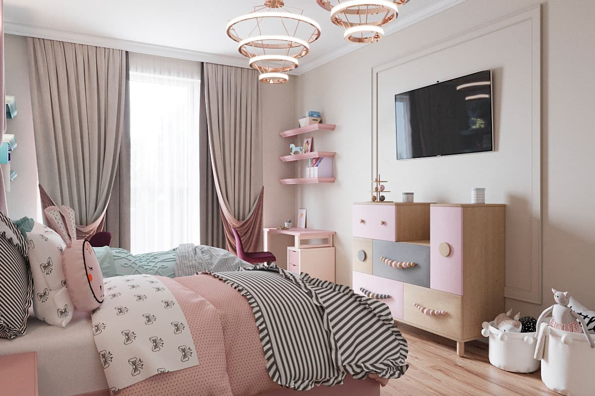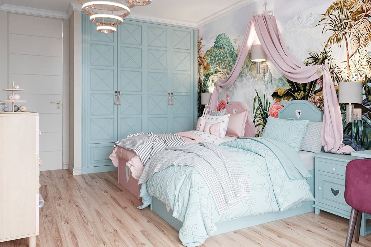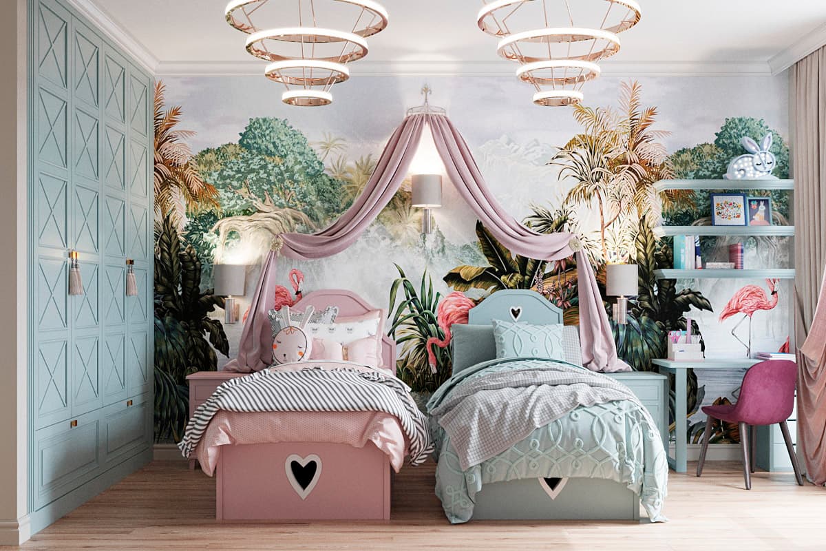 Яркая и элегантная спальня для детей (две девочки) в розово-алых, светло-бирюзовых тонах погружена в «игрушечную», сказочную атмосферу. Атмосферу, с которой так приятно ассоциировать беззаботное детство.