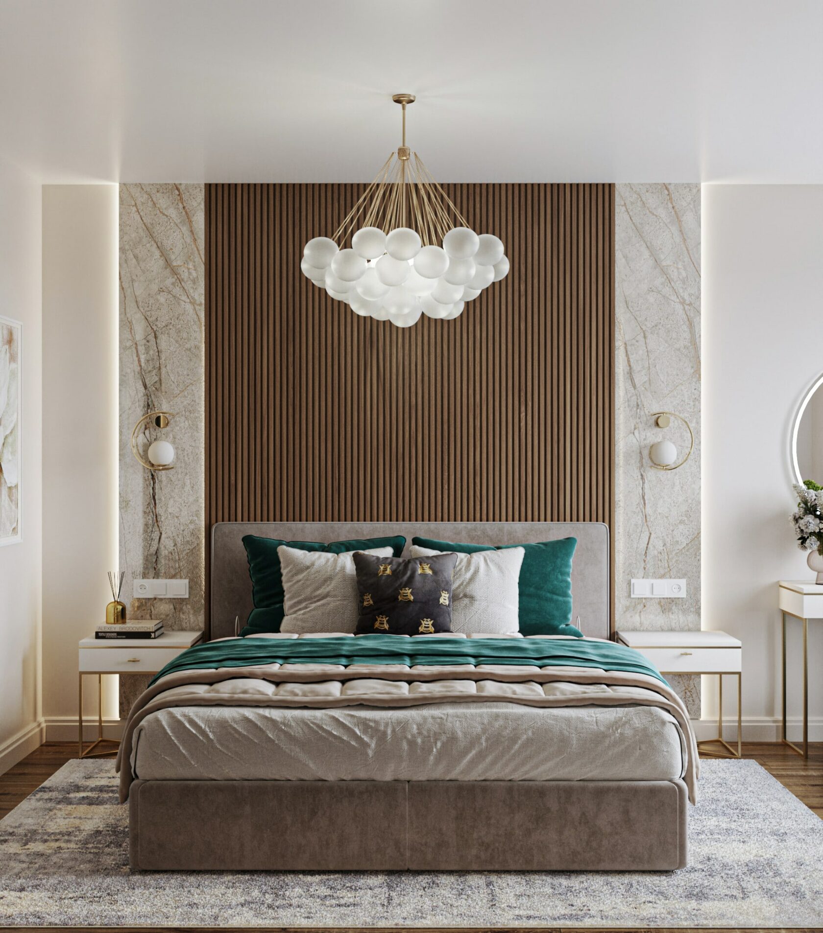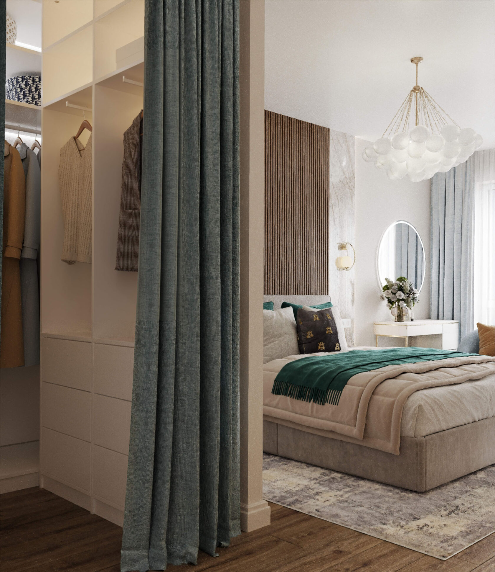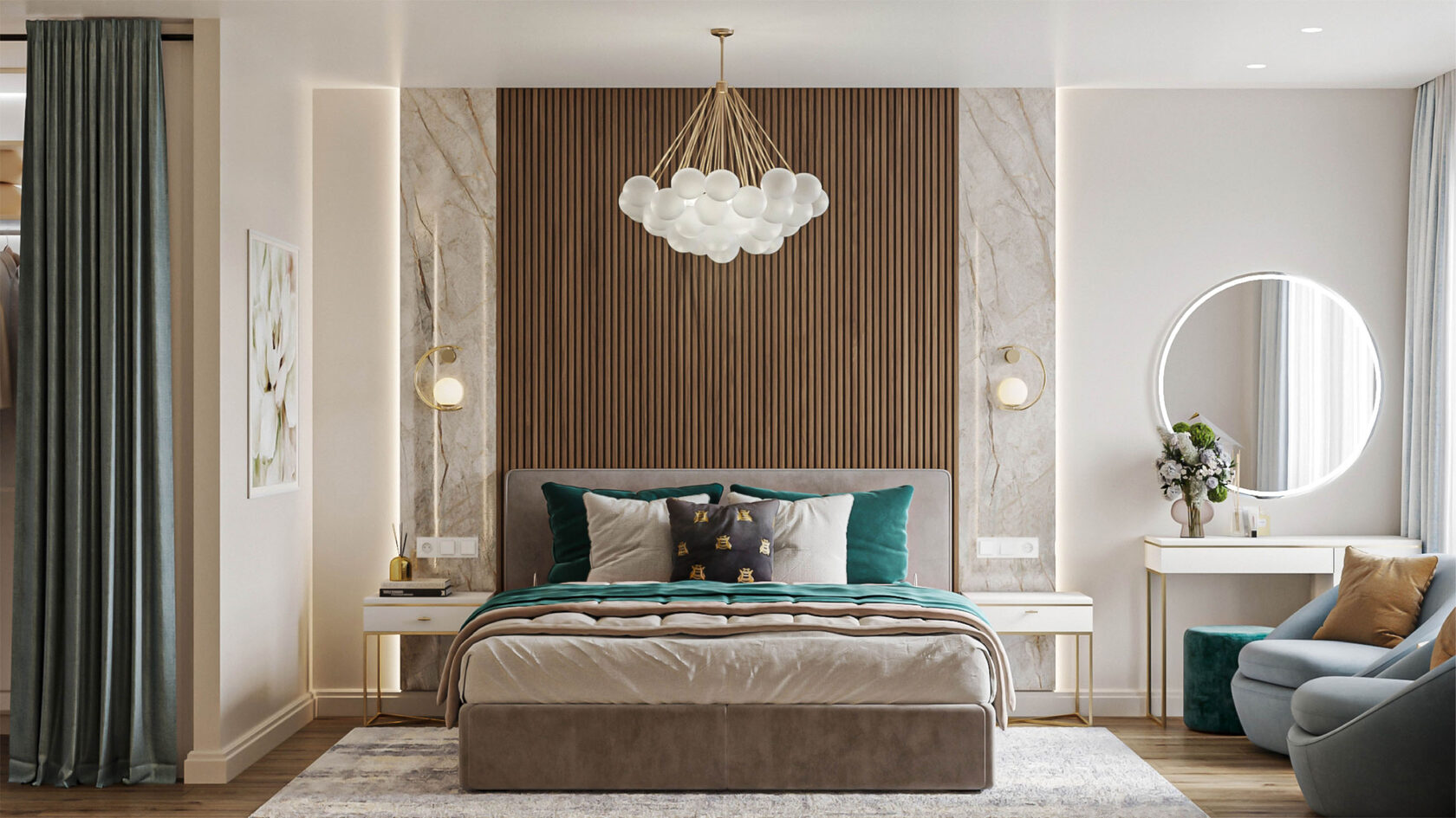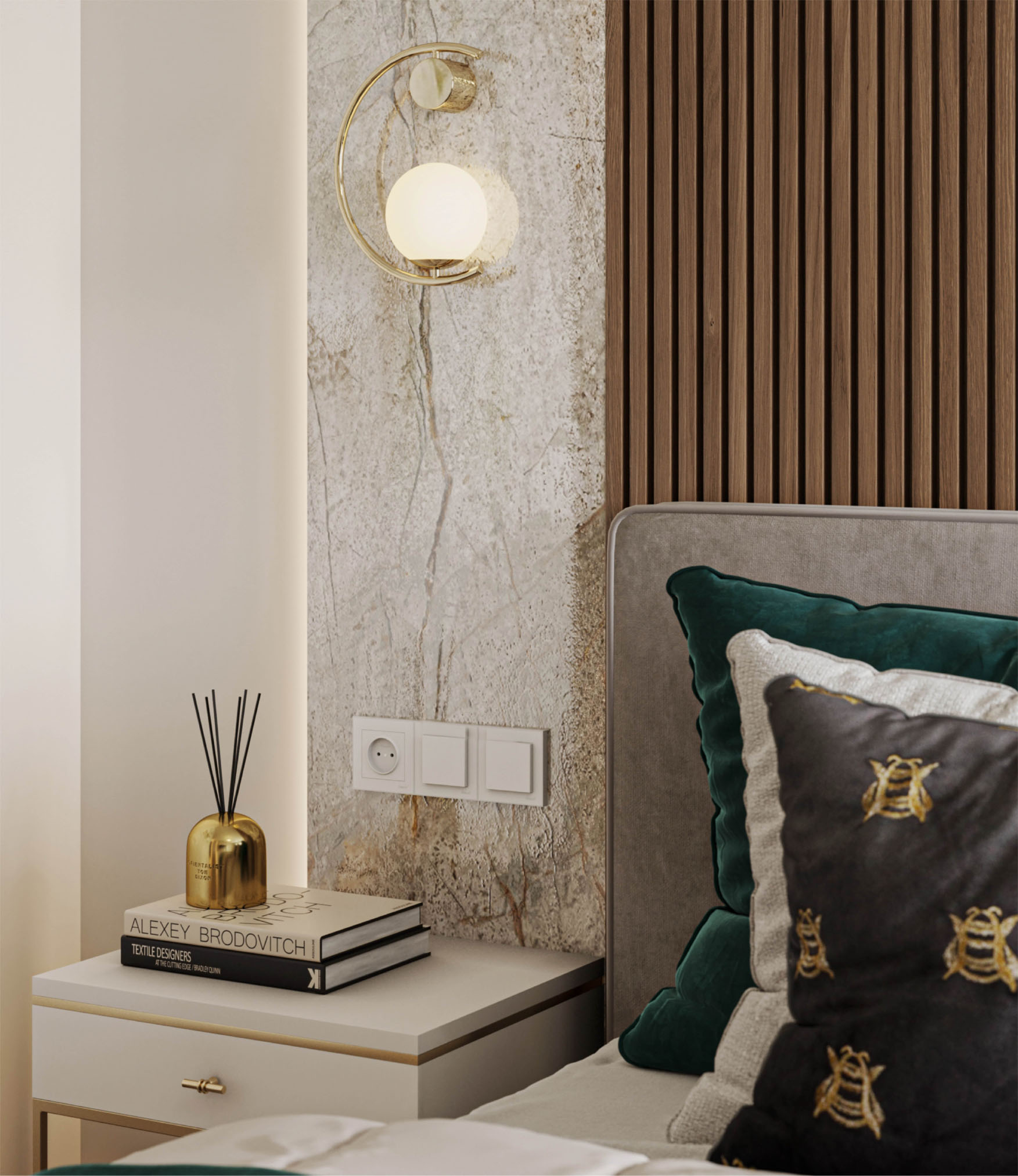 Интересная стояла задача задекорировать интерьер с отделкой от застройщика ПИК, на полу лежал керамогранит и ламинат, выполнена электрика, сантехника. Интерьер был безликим и пустым. Мы подобрали такую отделку, которая бы дополняла существующую и украшала интерьер, добавили изящные особенные акценты в интерьер, расставили дополнительное освещение и розетки с учетом существующих точек подключения, задекорировали крафтовыми панелями стены с изголовьем кровати, все это гармонирует с особенностями стен и функциональной расстановкой.