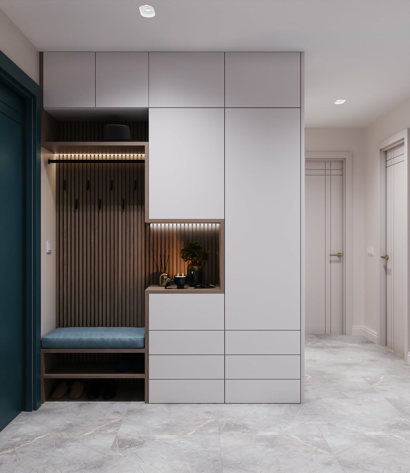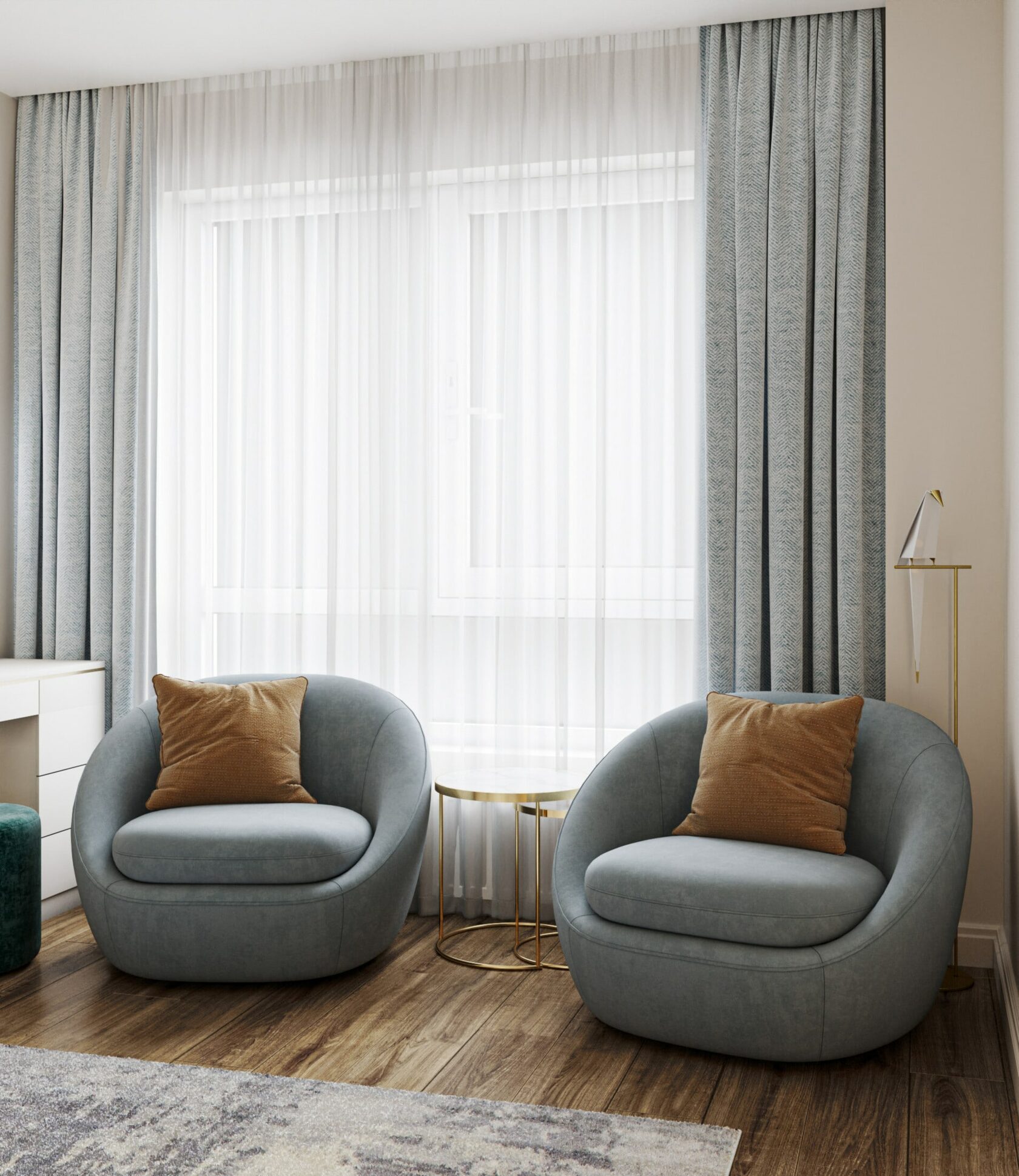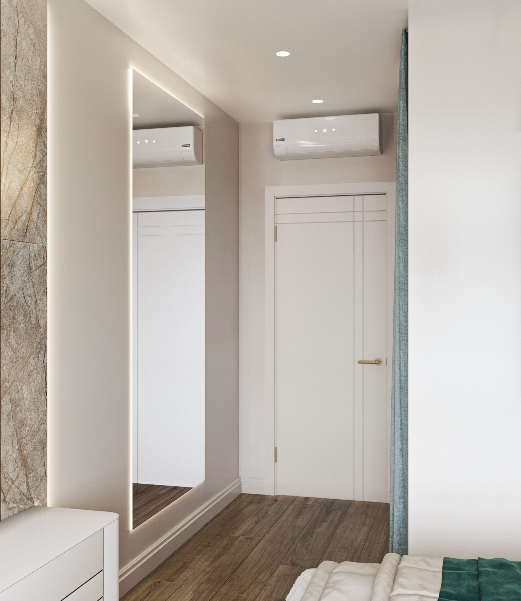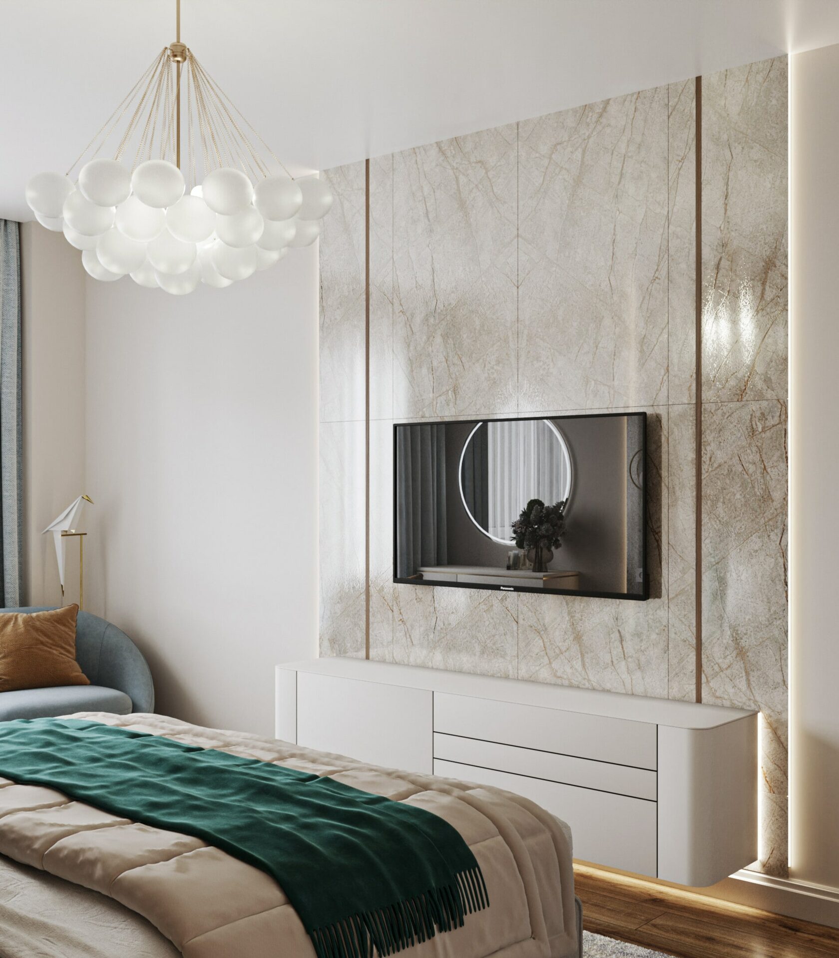 Интересная стояла задача задекорировать интерьер с отделкой от застройщика ПИК, на полу лежал керамогранит и ламинат, выполнена электрика, сантехника. Интерьер был безликим и пустым. Мы подобрали такую отделку, которая бы дополняла существующую и украшала интерьер, добавили изящные особенные акценты в интерьер, расставили дополнительное освещение и розетки с учетом существующих точек подключения, задекорировали крафтовыми панелями стены с изголовьем кровати, все это гармонирует с особенностями стен и функциональной расстановкой.