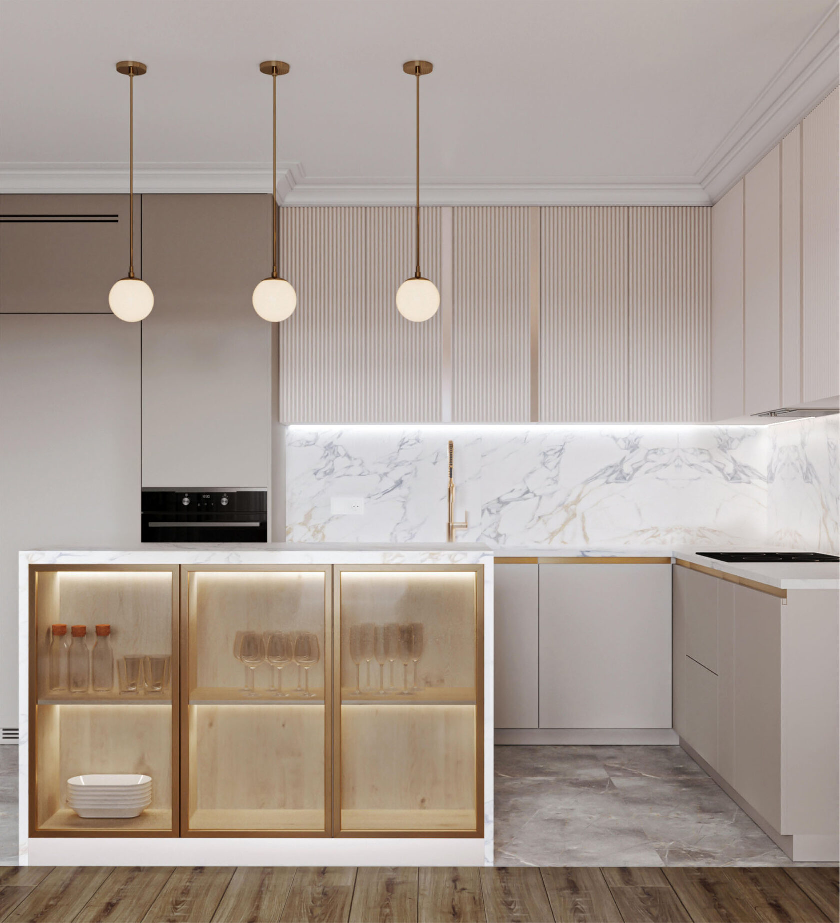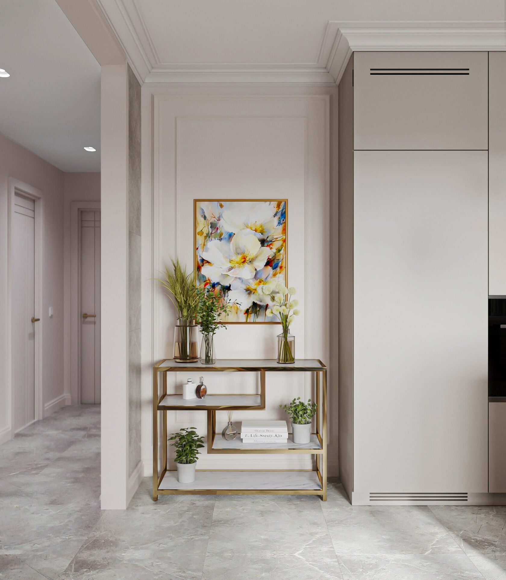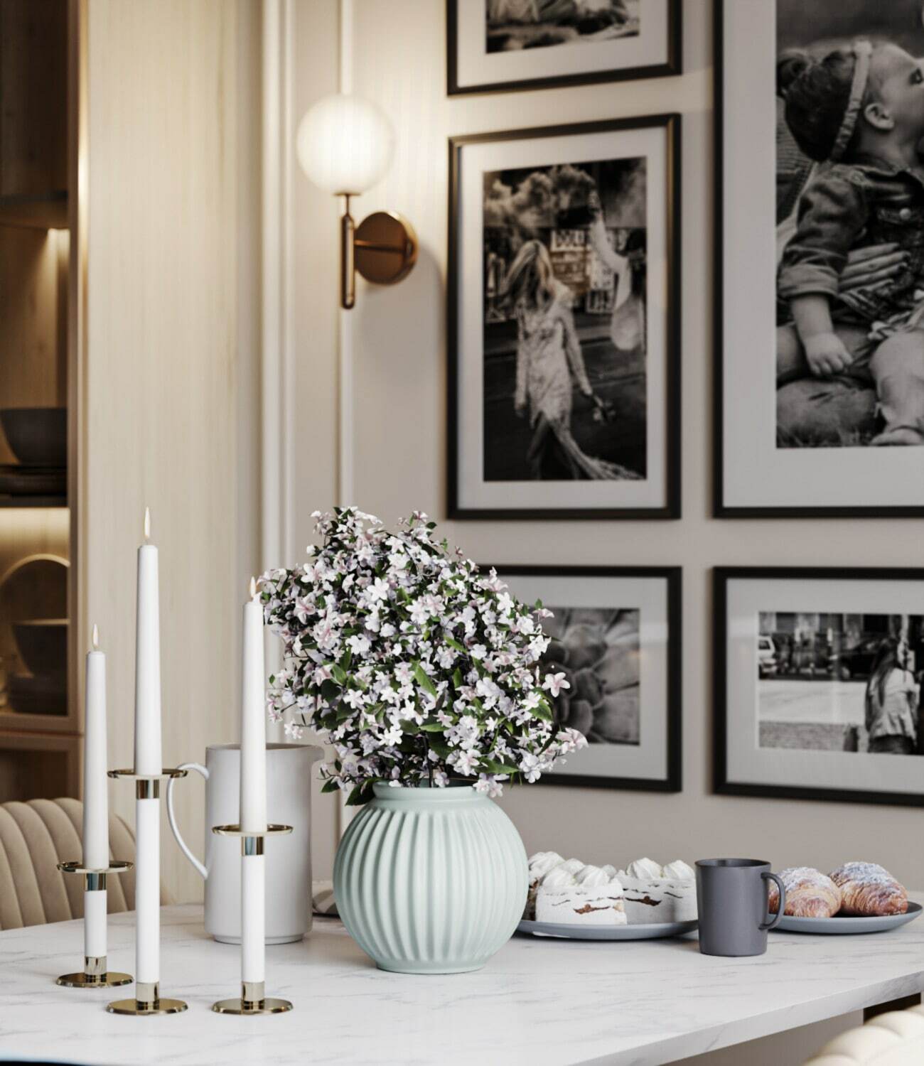 Мечта хозяйки сбылась — остров на кухне с нишей для памятного хрусталя и фарфора зонирует пространство отдыха и кухню. Декоративный стеллаж, консоль с цветами, стена со свадебными фотографиями создают тепло семейного очага. Приятно возвращаться в дом, преисполненный вниманием к каждой детали и любовью.