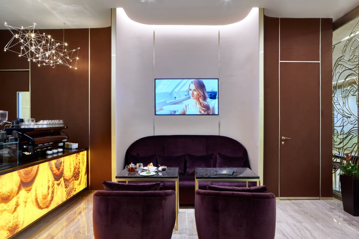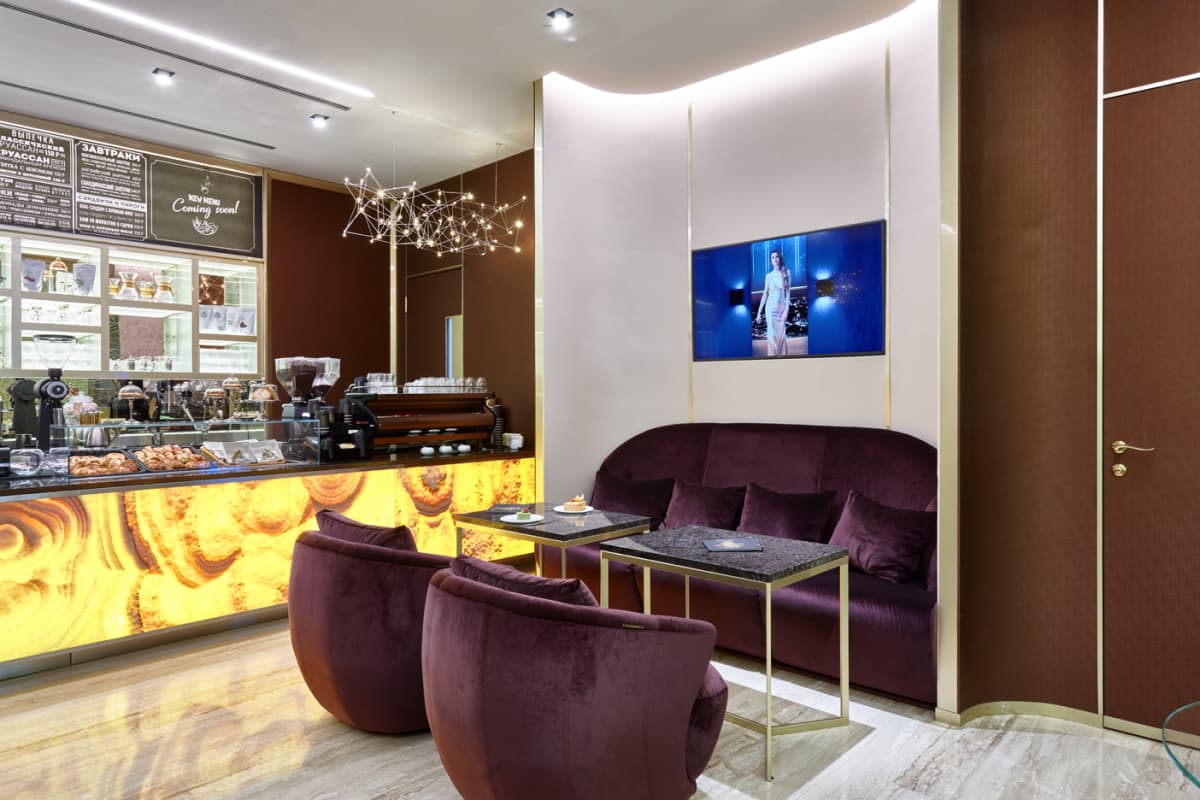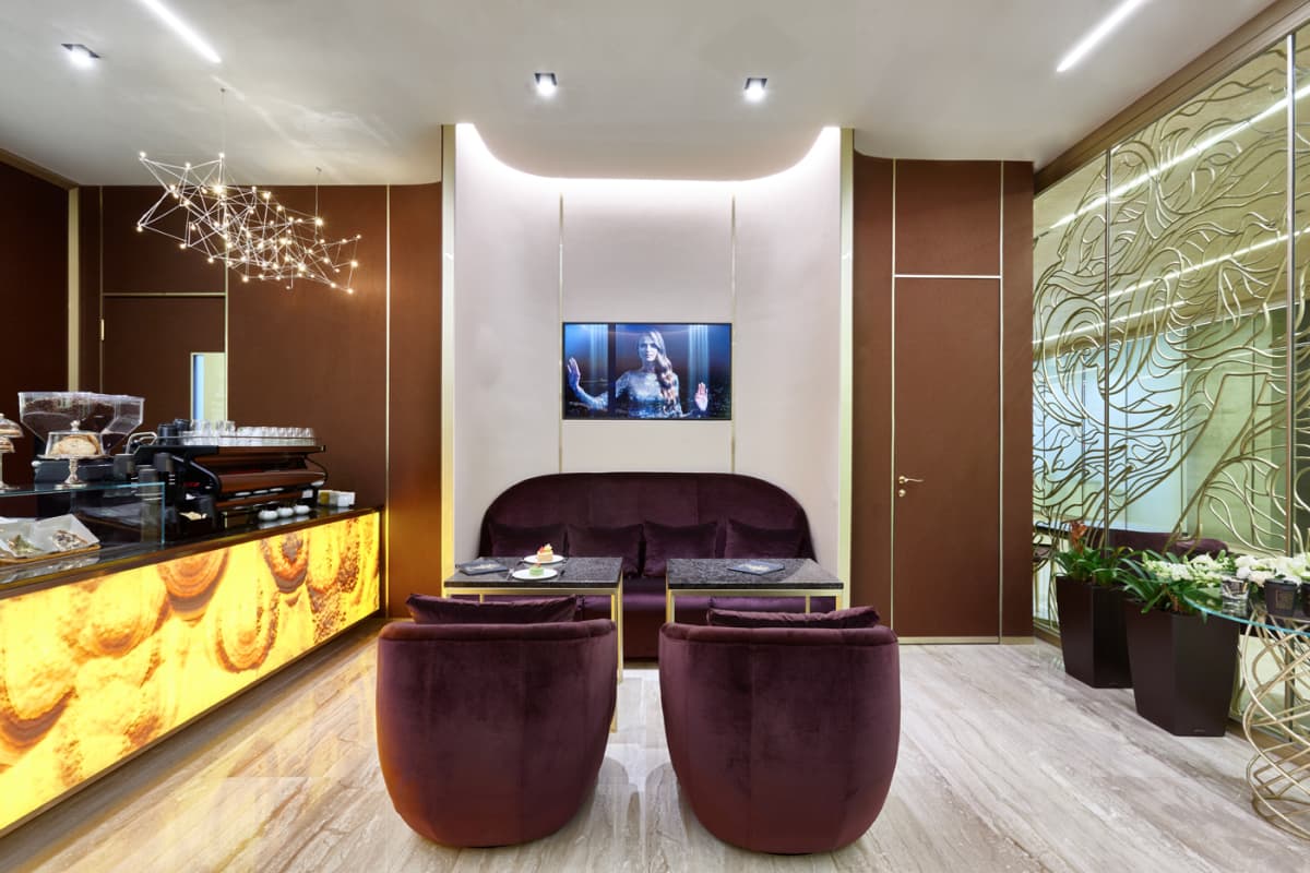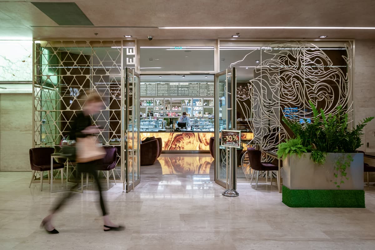 Уже на входе — кованое панно с летящим ввысь золотистым женским профилем в стиле «Ар Нуво». Внутри — приковывают взгляд стильные радиусные панели, оригинальная витрина из редкого оникса с броскими, светящимися разводами шоколадного оттенка.