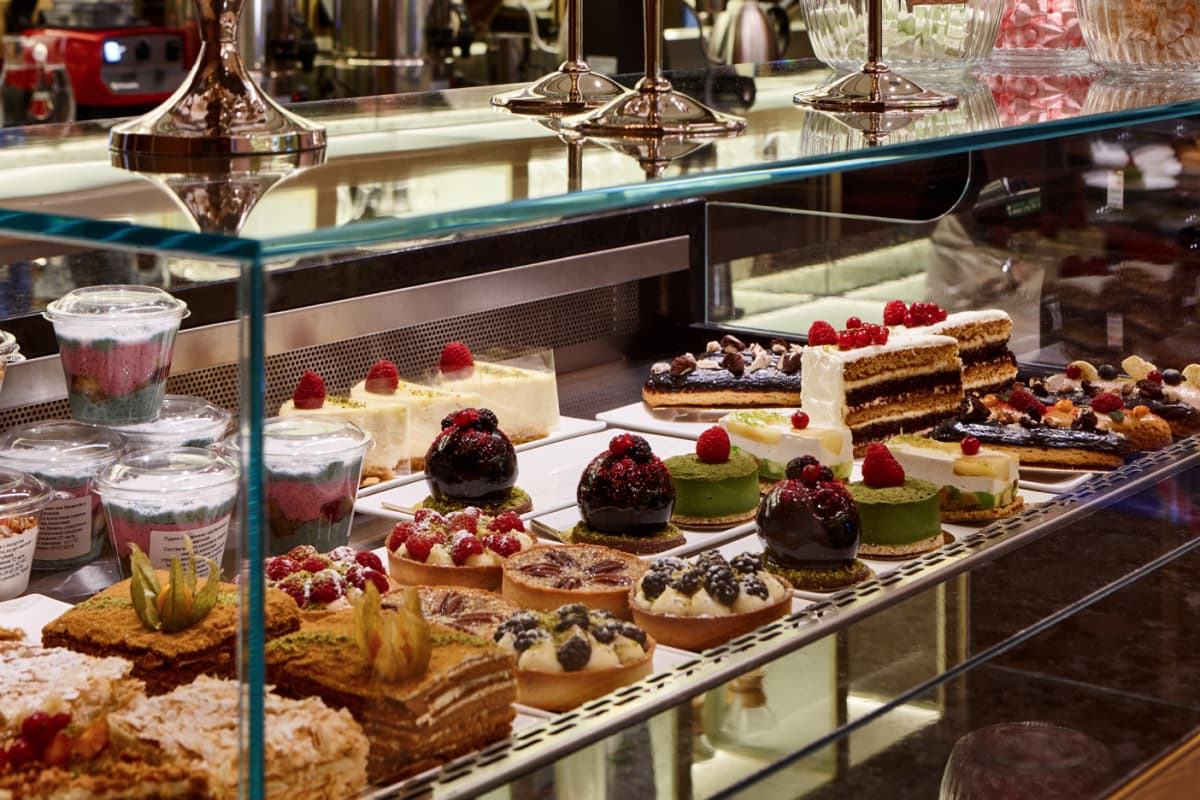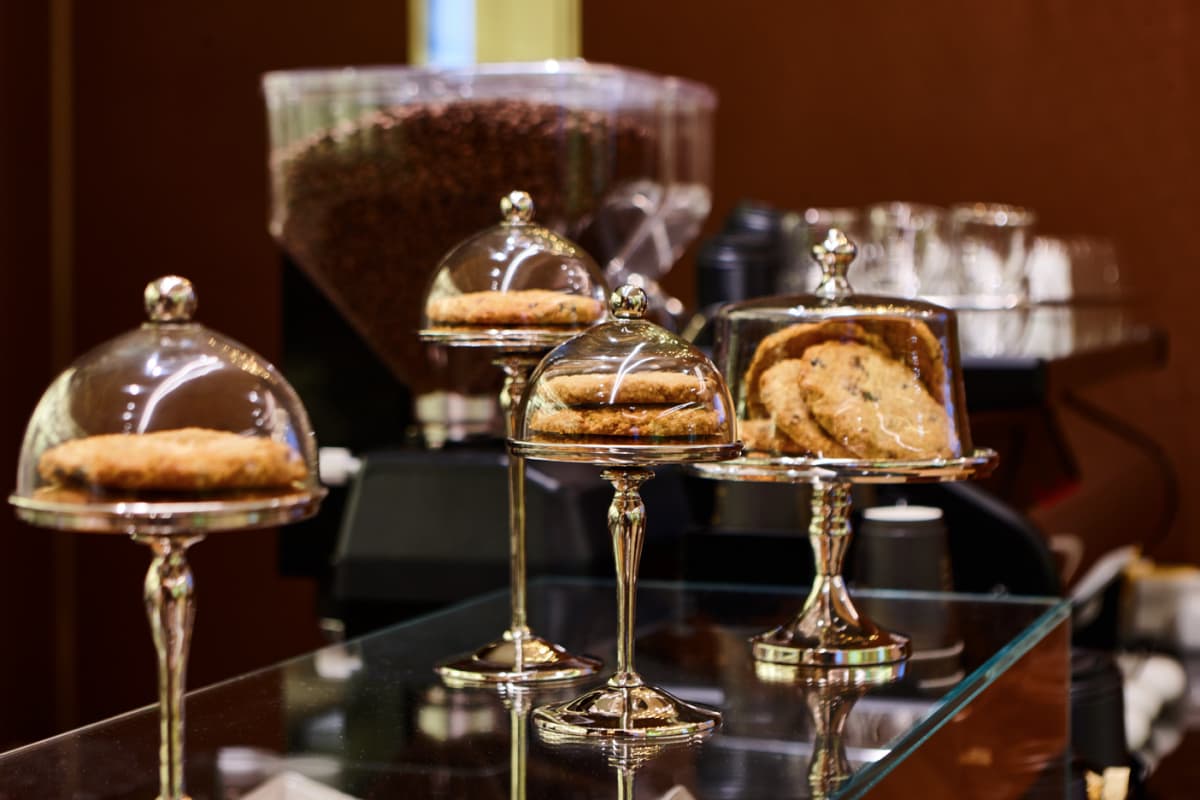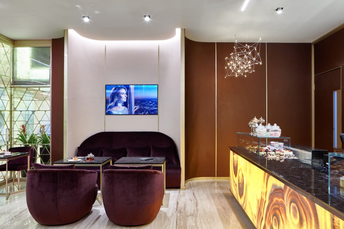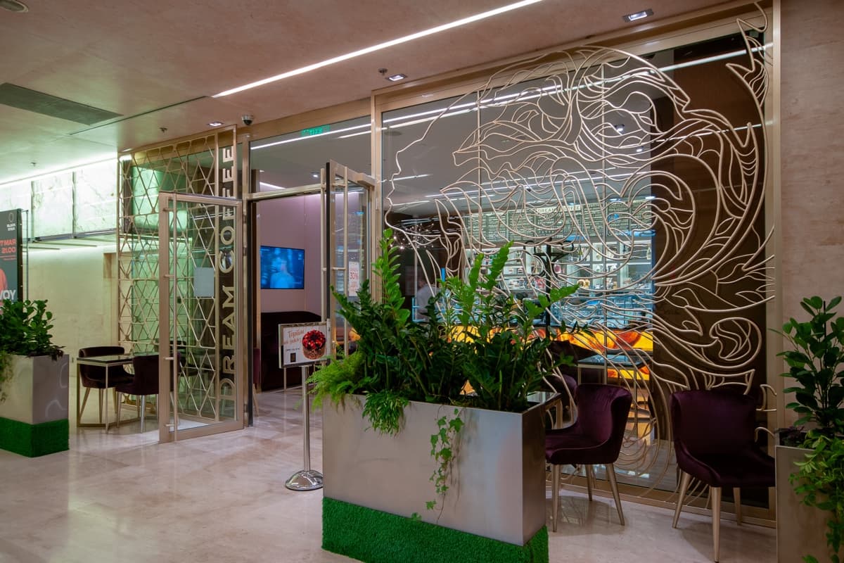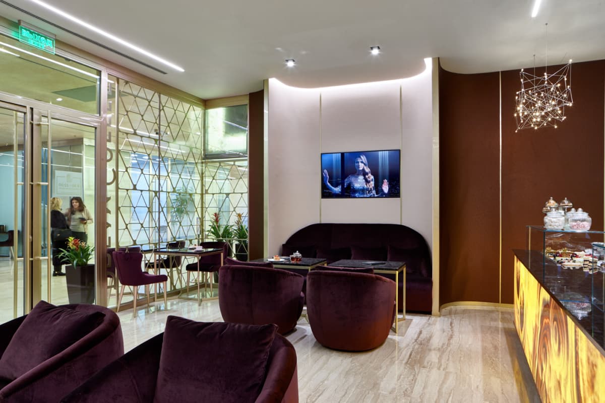 Уже на входе — кованое панно с летящим ввысь золотистым женским профилем в стиле «Ар Нуво». Внутри — приковывают взгляд стильные радиусные панели, оригинальная витрина из редкого оникса с броскими, светящимися разводами шоколадного оттенка.