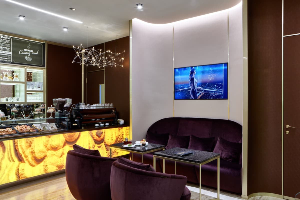 Вкупе с мягкой мебелью насыщенного винного цвета всё это создаёт ламповую атмосферу, в которую с первых секунд погружаются посетители. Прекрасным дополнением являются декоративные стильные светильники с множеством светодиодов, которые напоминают мерцающие звезды на ночном парижском небе.