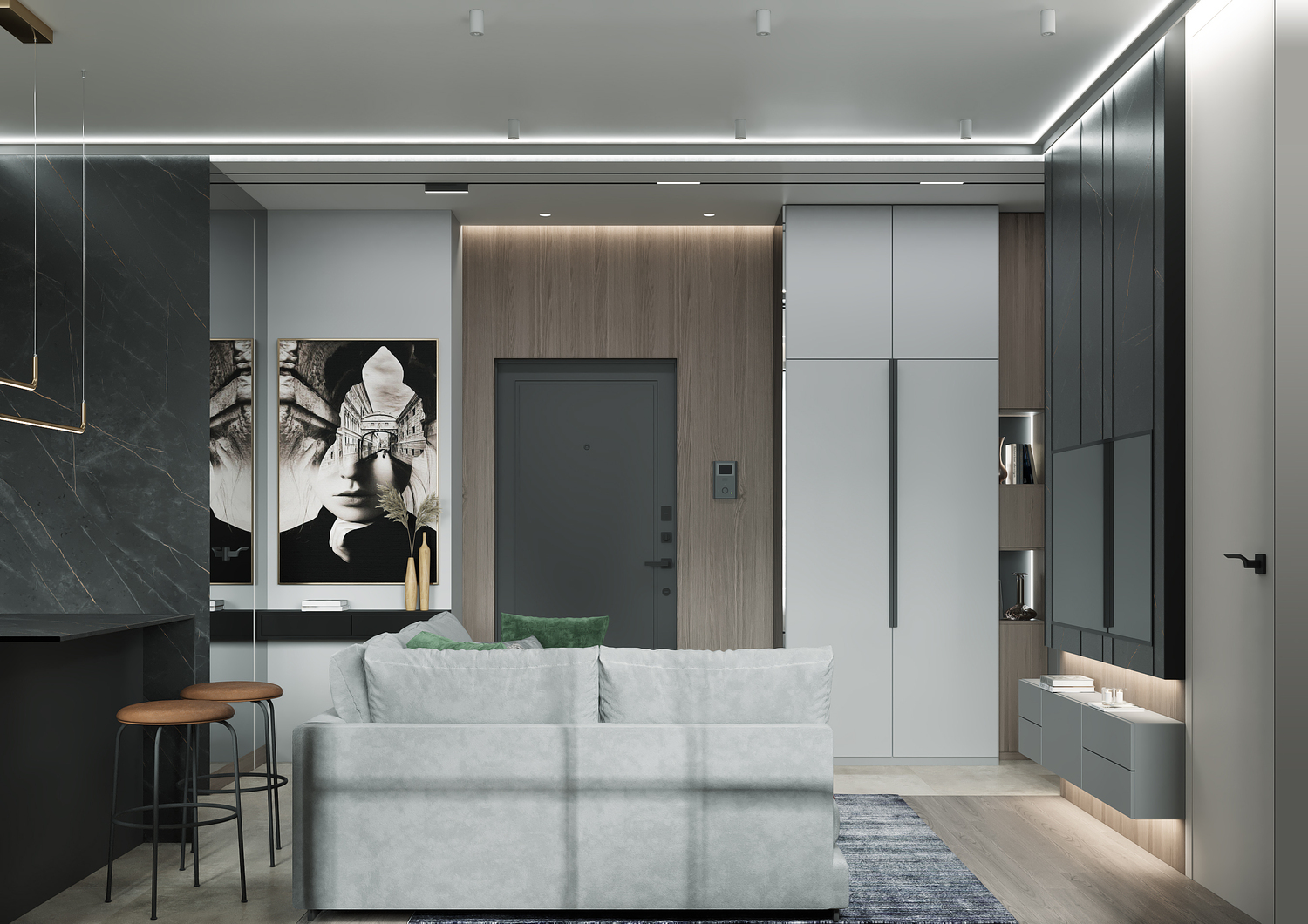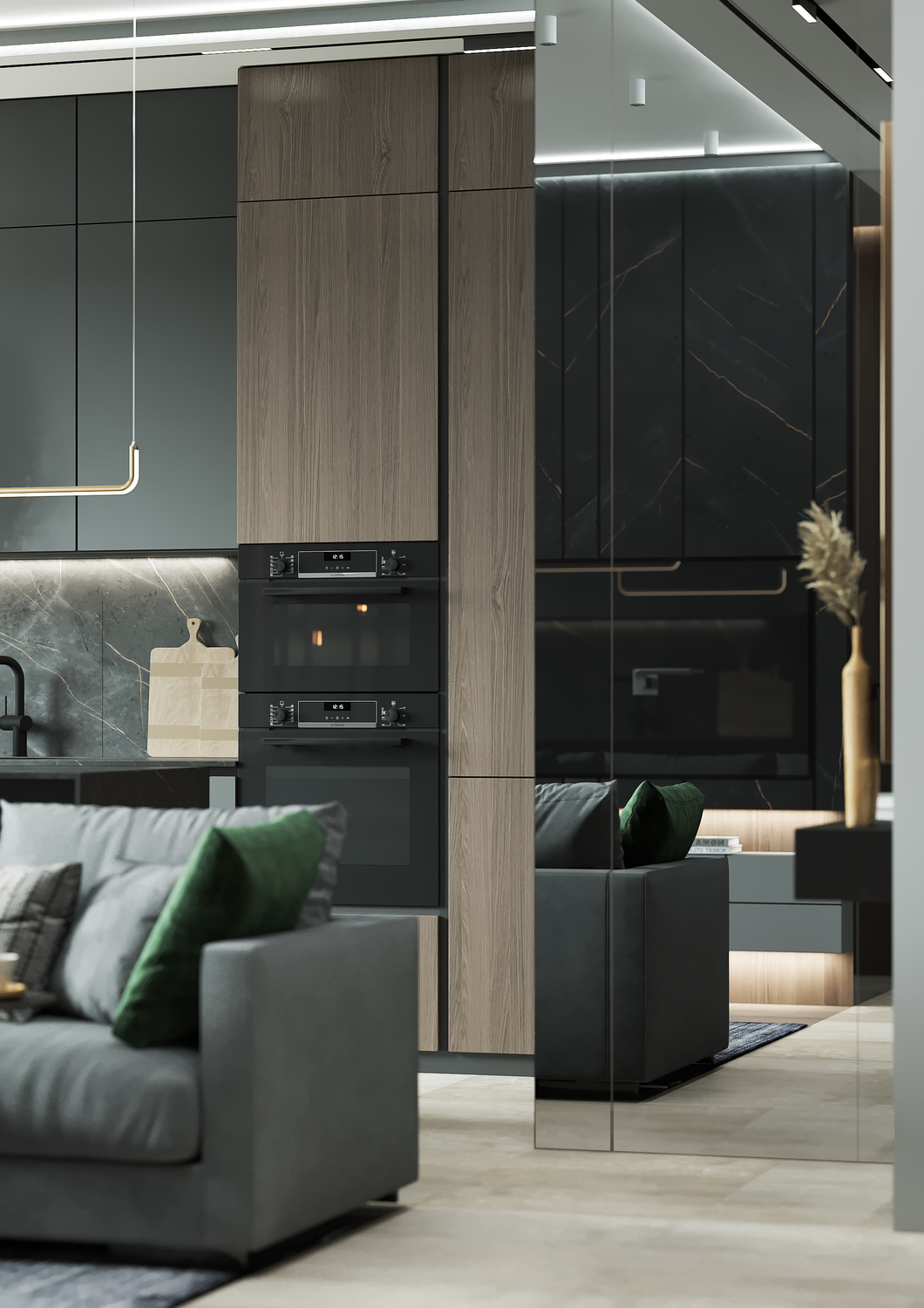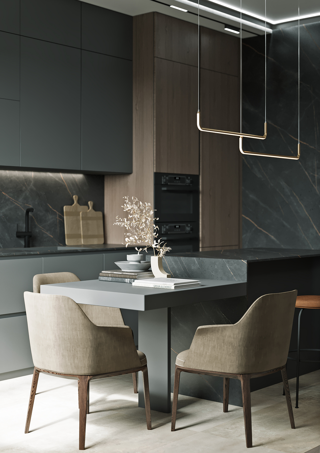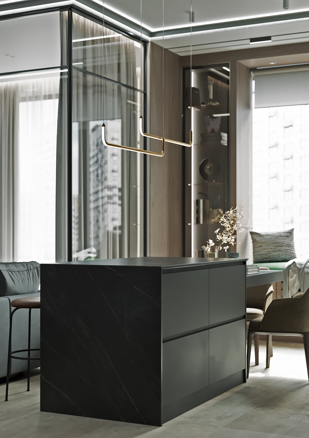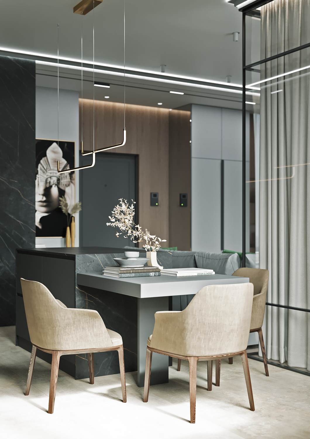 Кухня/ гостиная имеет свою удобную зону отдыха, для камерных чаепитий и вкусных обедов или завтраков. Эта зона грамотно совмещена с холлом, являясь её логичным продолжением. Необычные люстры, трековые светильники вдоль кухни, а также подвесные «скобообразные» светильники элегантно подчеркивают насыщенные графитовые, мраморные оттенки фасадов, стен.