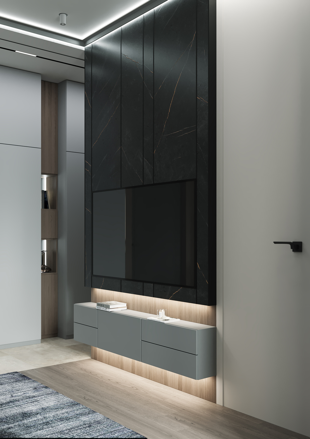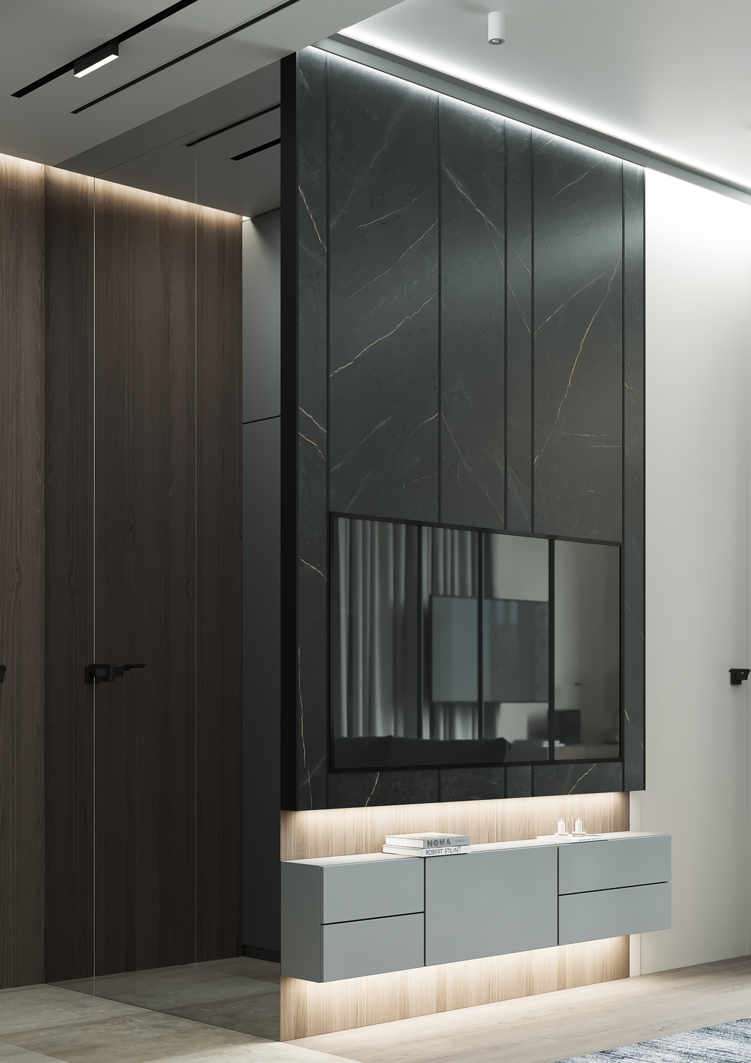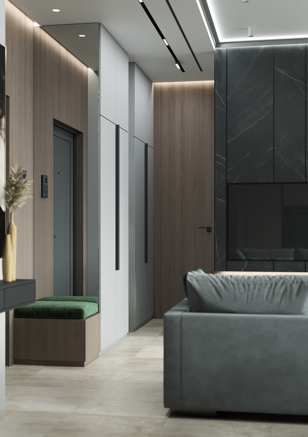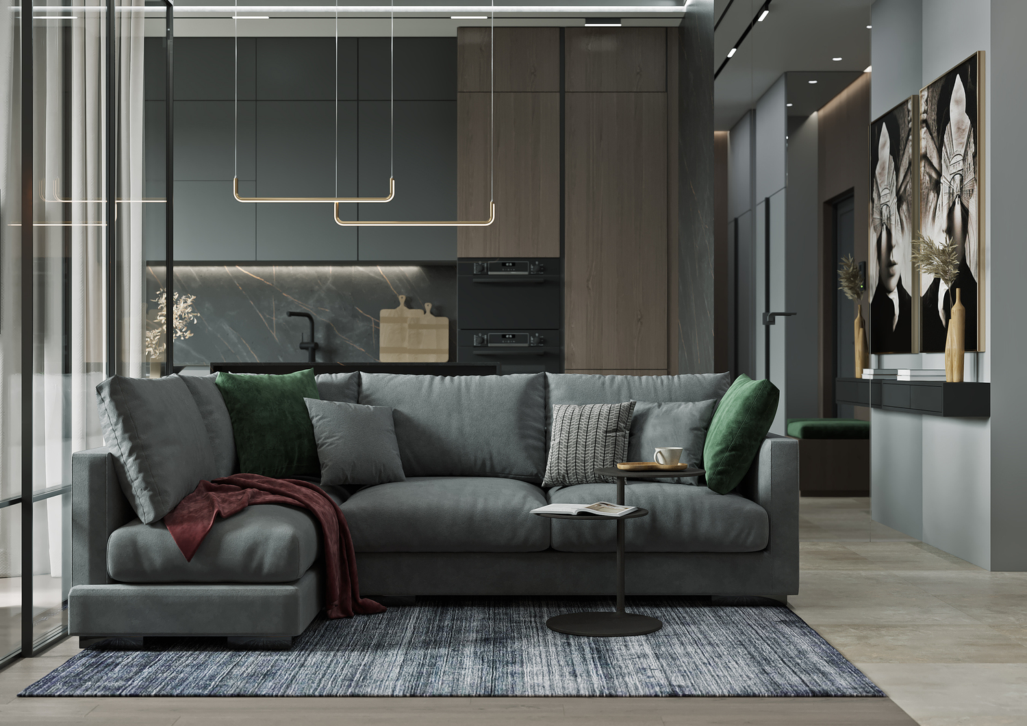 Кухня/ гостиная имеет свою удобную зону отдыха, для камерных чаепитий и вкусных обедов или завтраков. Эта зона грамотно совмещена с холлом, являясь её логичным продолжением. Необычные люстры, трековые светильники вдоль кухни, а также подвесные «скобообразные» светильники элегантно подчеркивают насыщенные графитовые, мраморные оттенки фасадов, стен.