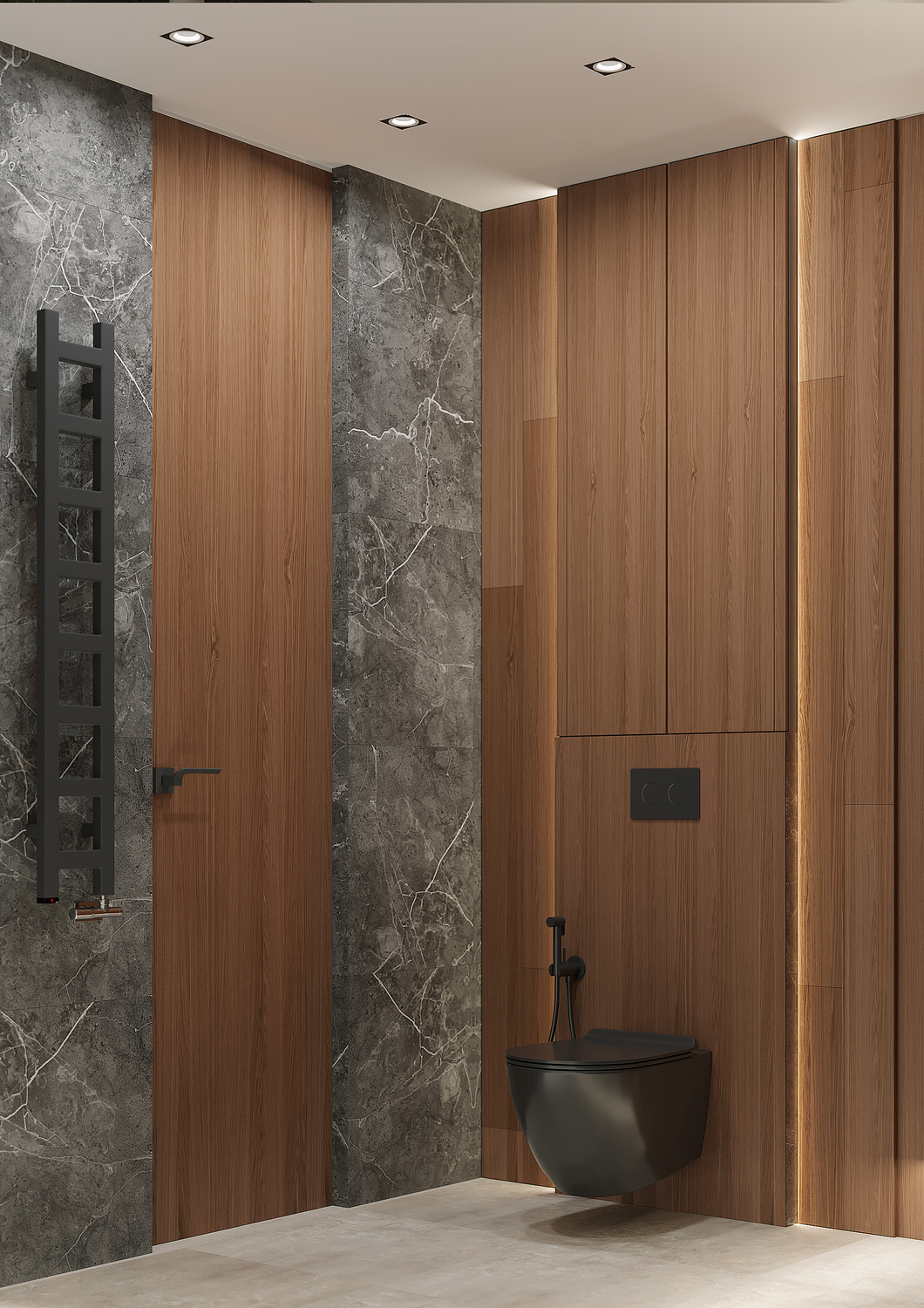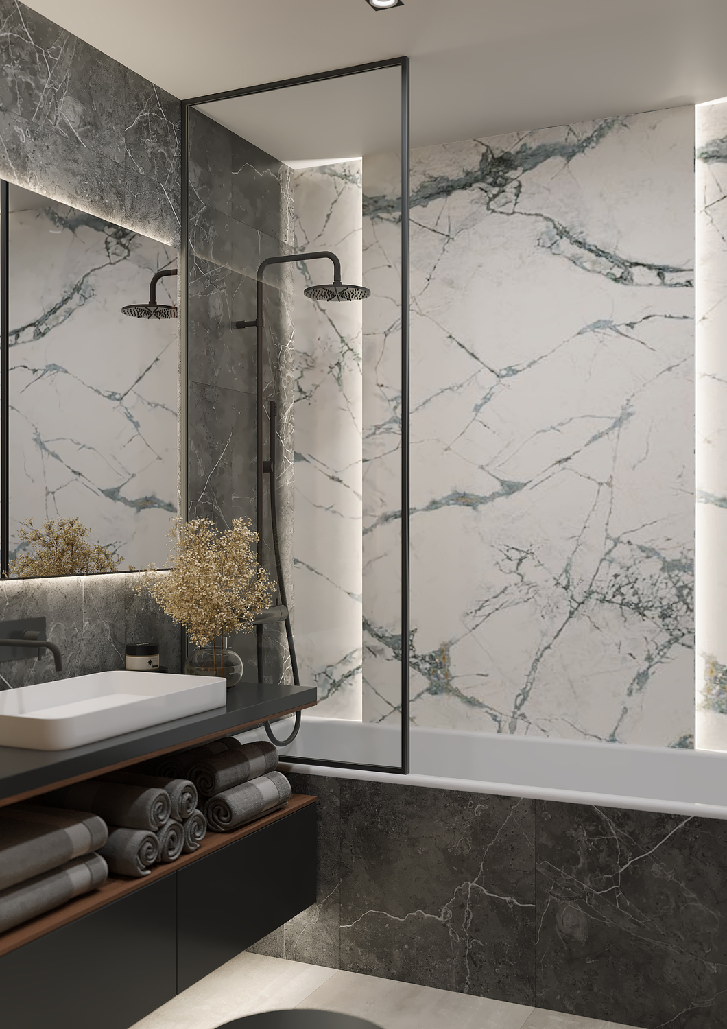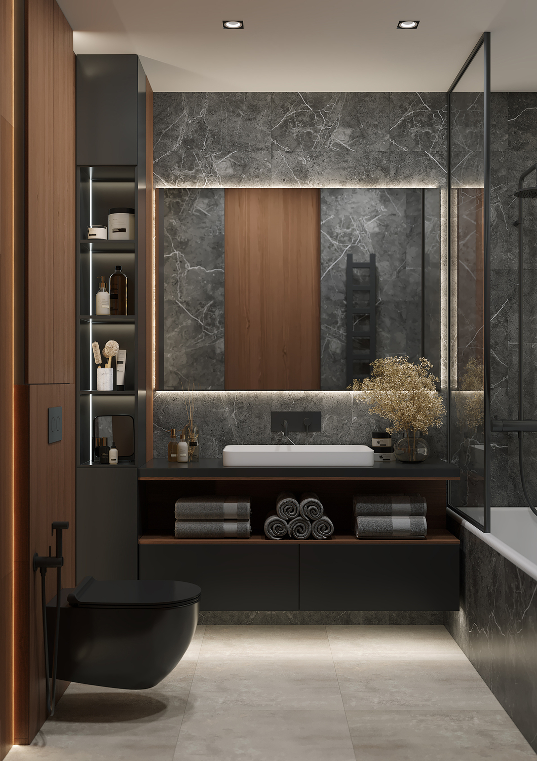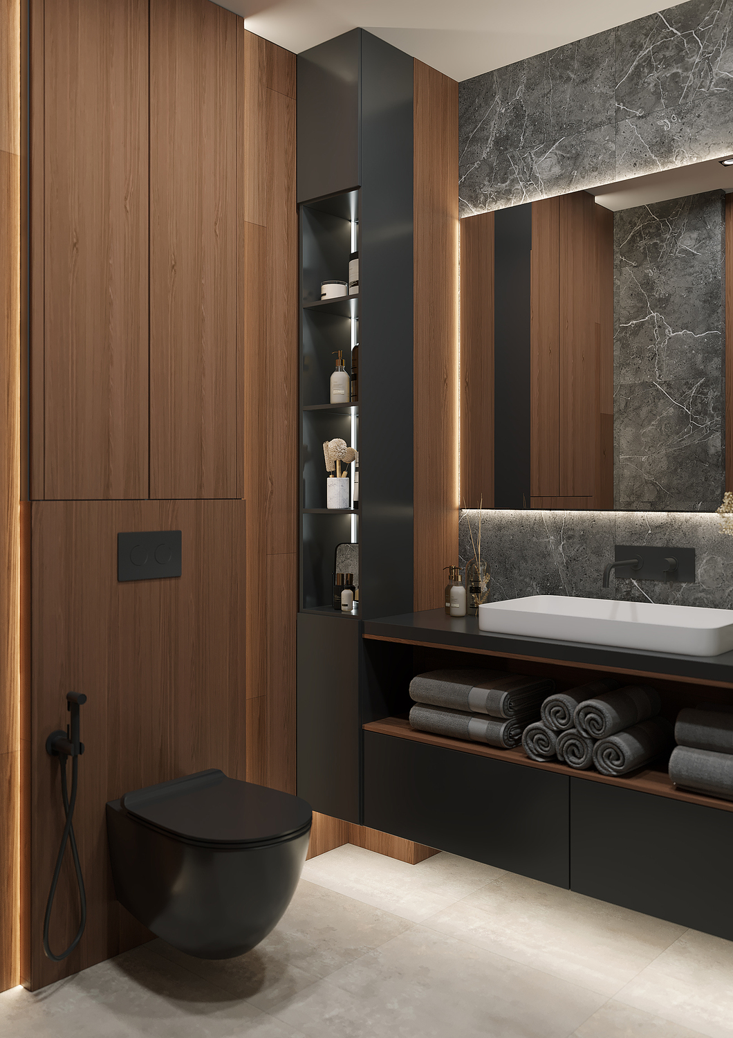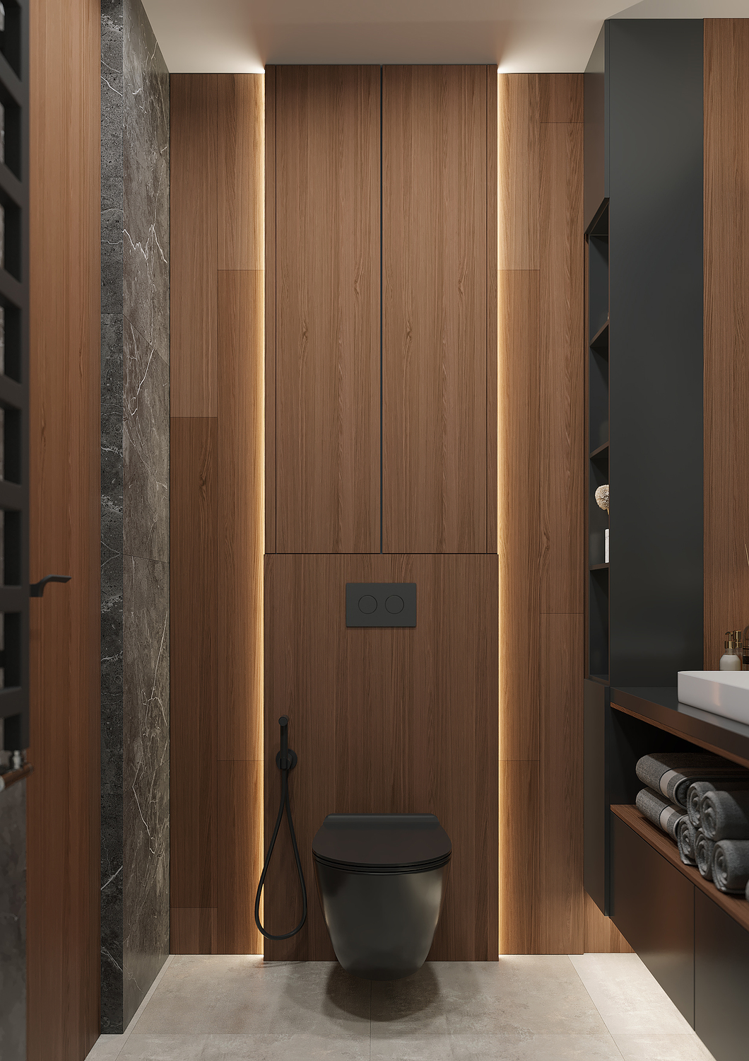 Кухня/ гостиная имеет свою удобную зону отдыха, для камерных чаепитий и вкусных обедов или завтраков. Эта зона грамотно совмещена с холлом, являясь её логичным продолжением. Необычные люстры, трековые светильники вдоль кухни, а также подвесные «скобообразные» светильники элегантно подчеркивают насыщенные графитовые, мраморные оттенки фасадов, стен.