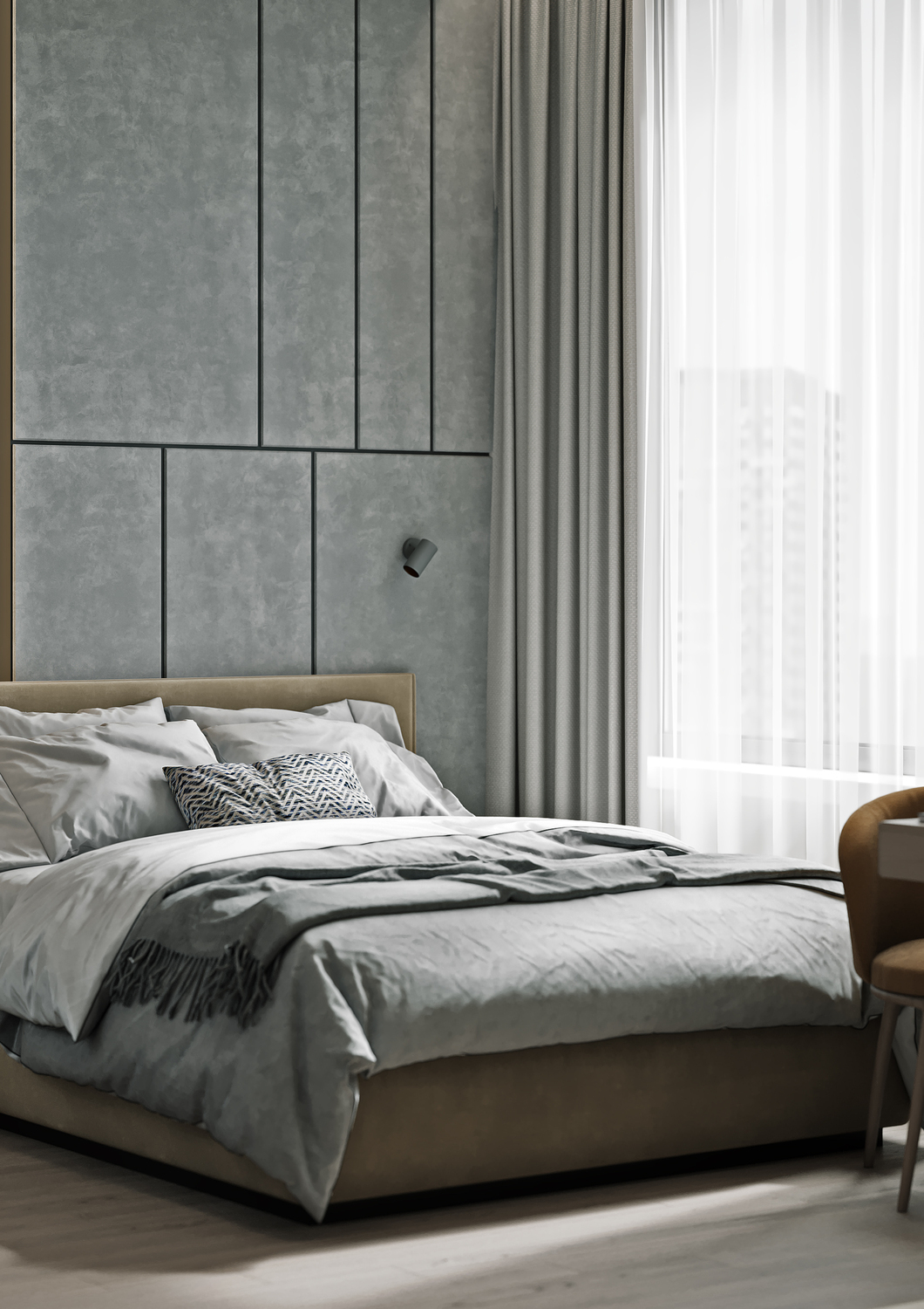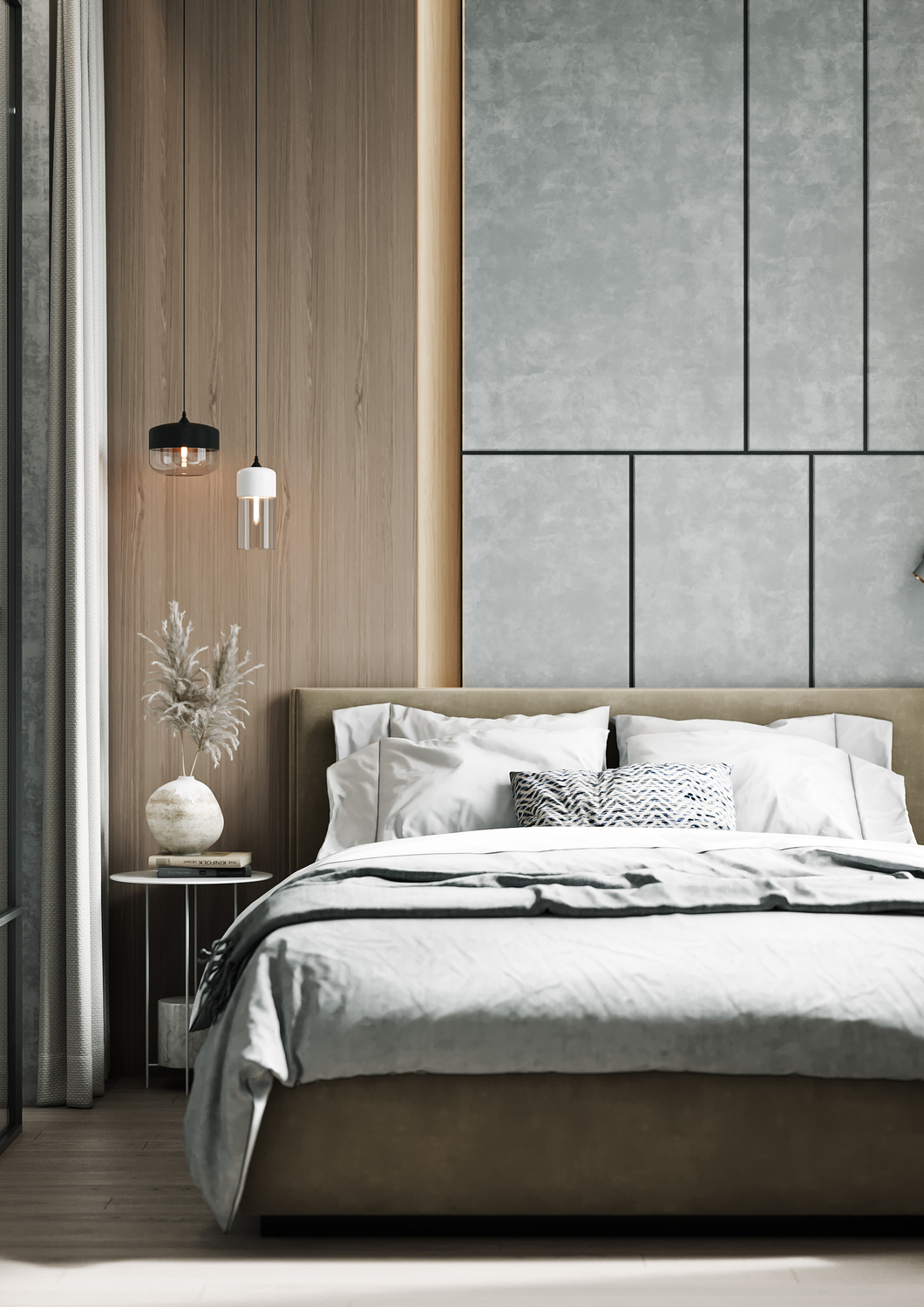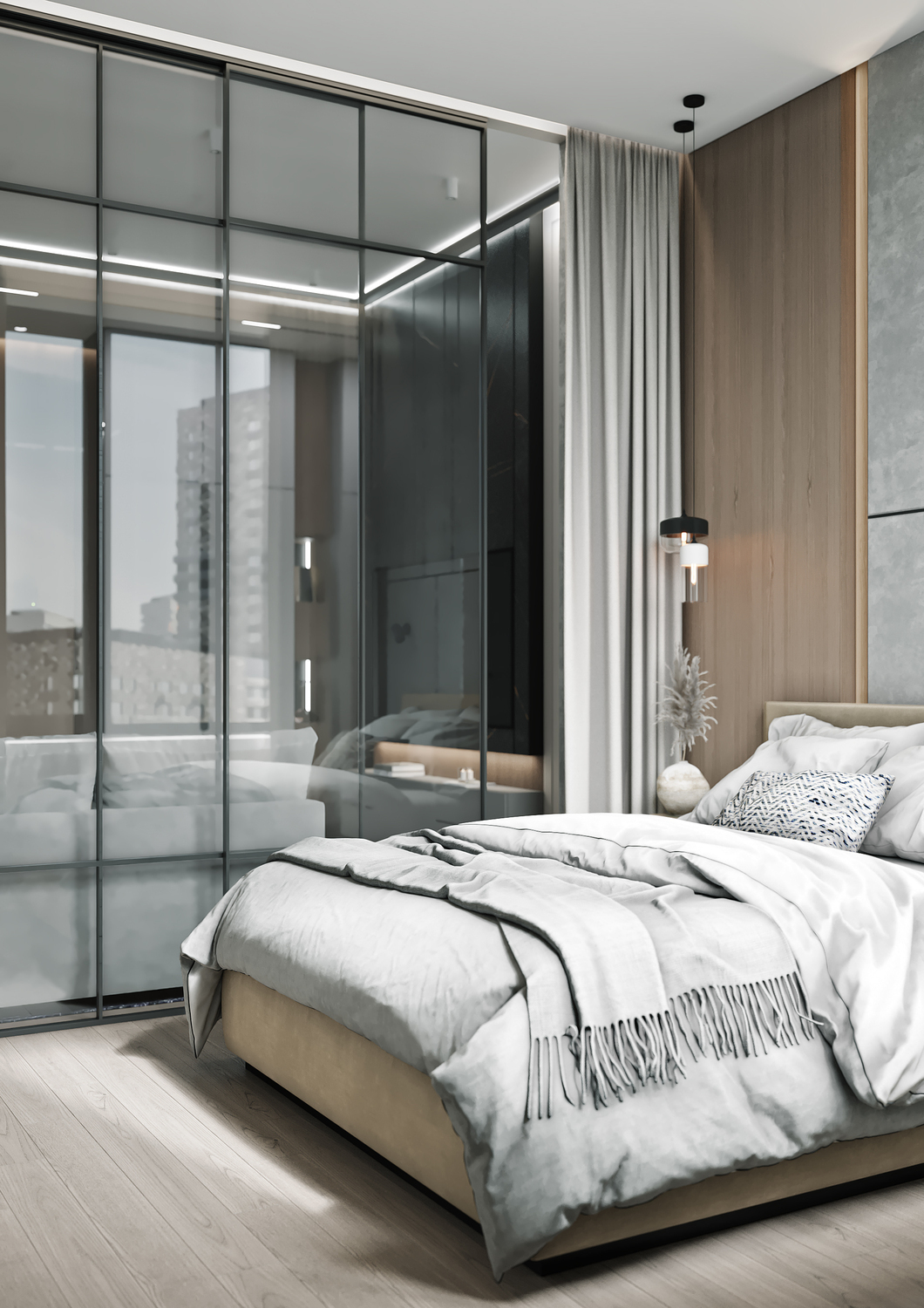При этом стеклянные поверхности значительно расширяют общее пространство и функционально отделяют спальню от гостиной. К слову, приватность в спальне можно без труда создать шторами вдоль тех самых стеклянных перегородок.