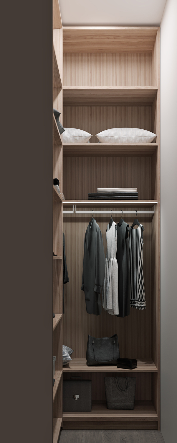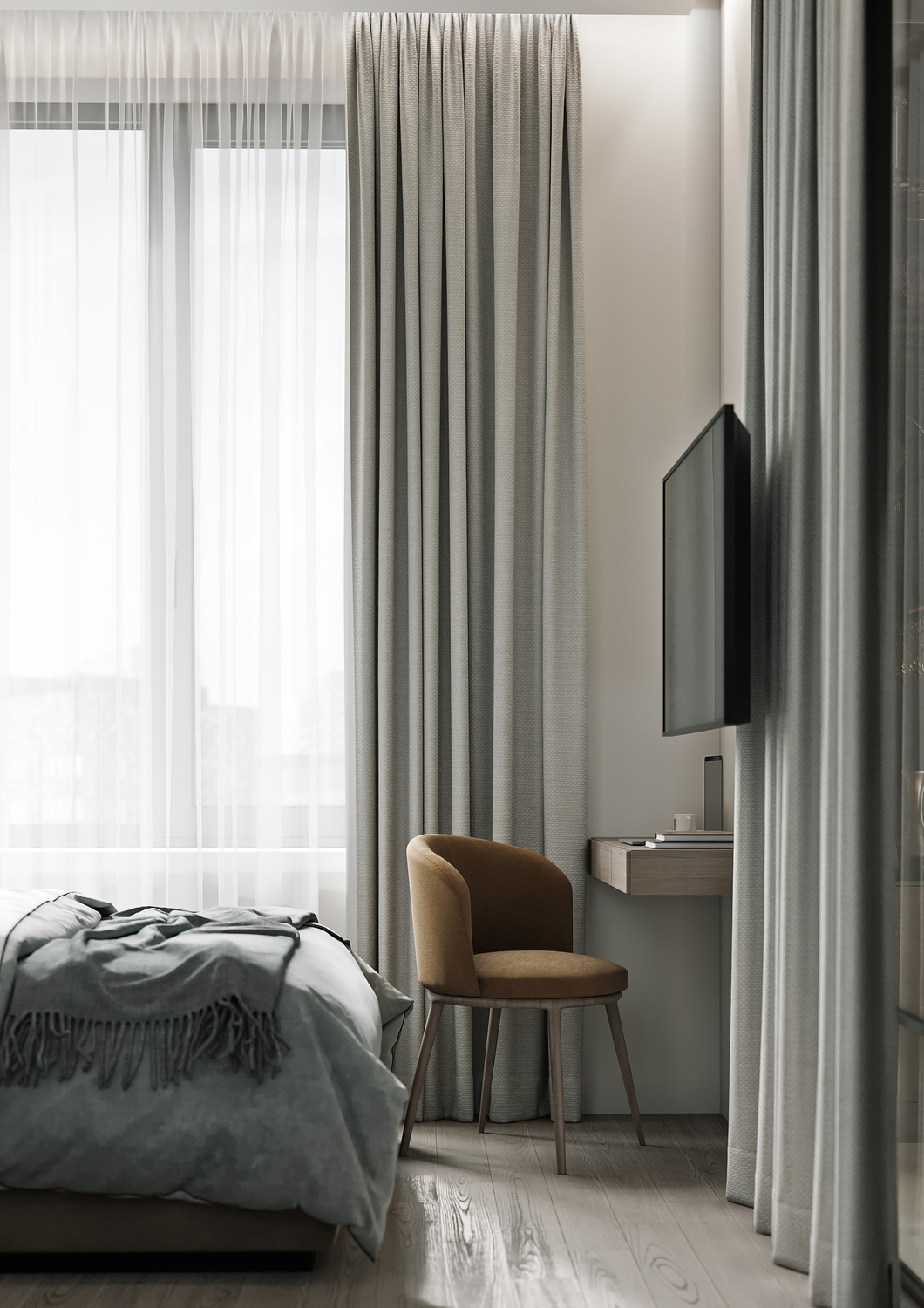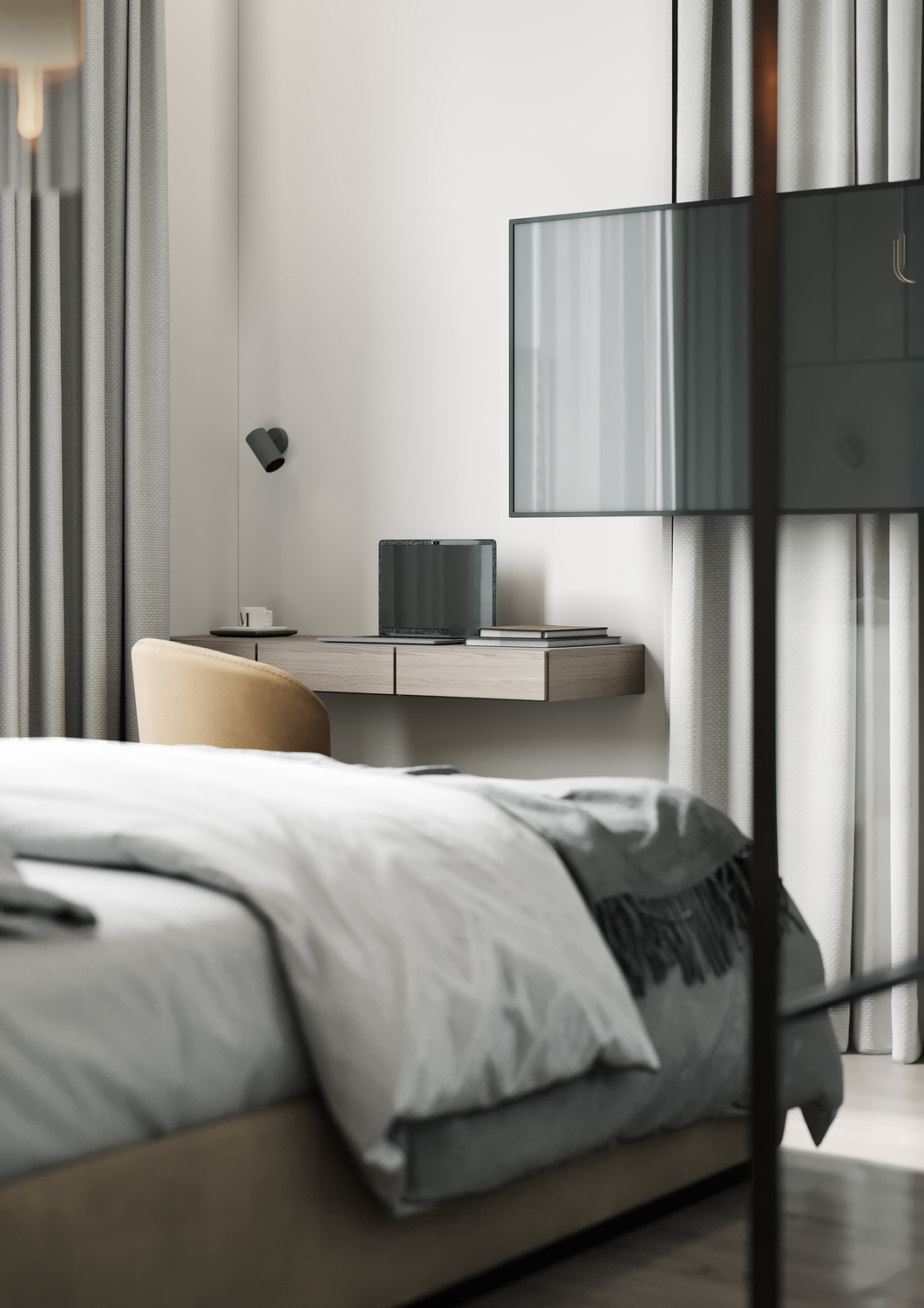 При этом стеклянные поверхности значительно расширяют общее пространство и функционально отделяют спальню от гостиной. К слову, приватность в спальне можно без труда создать шторами вдоль тех самых стеклянных перегородок.